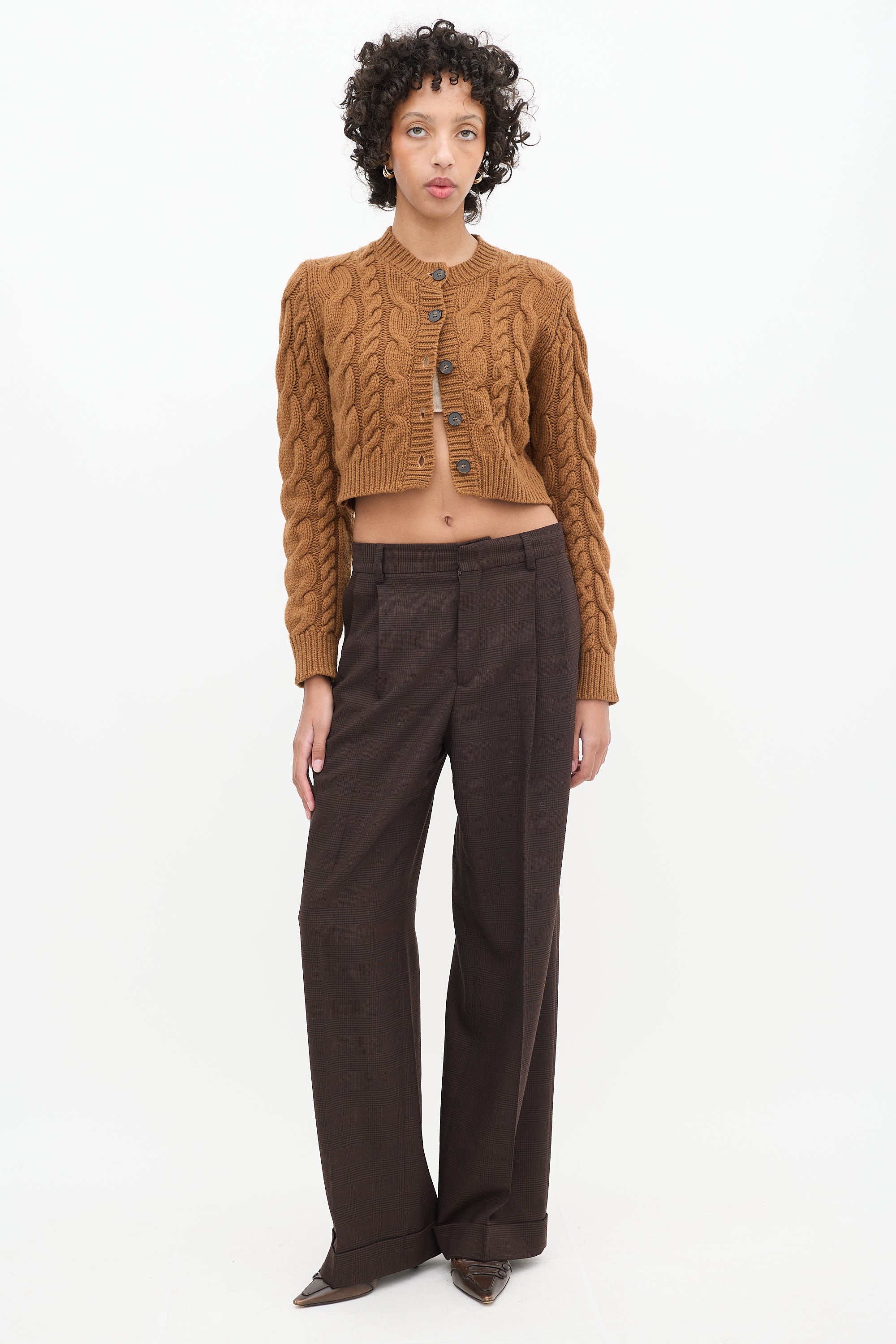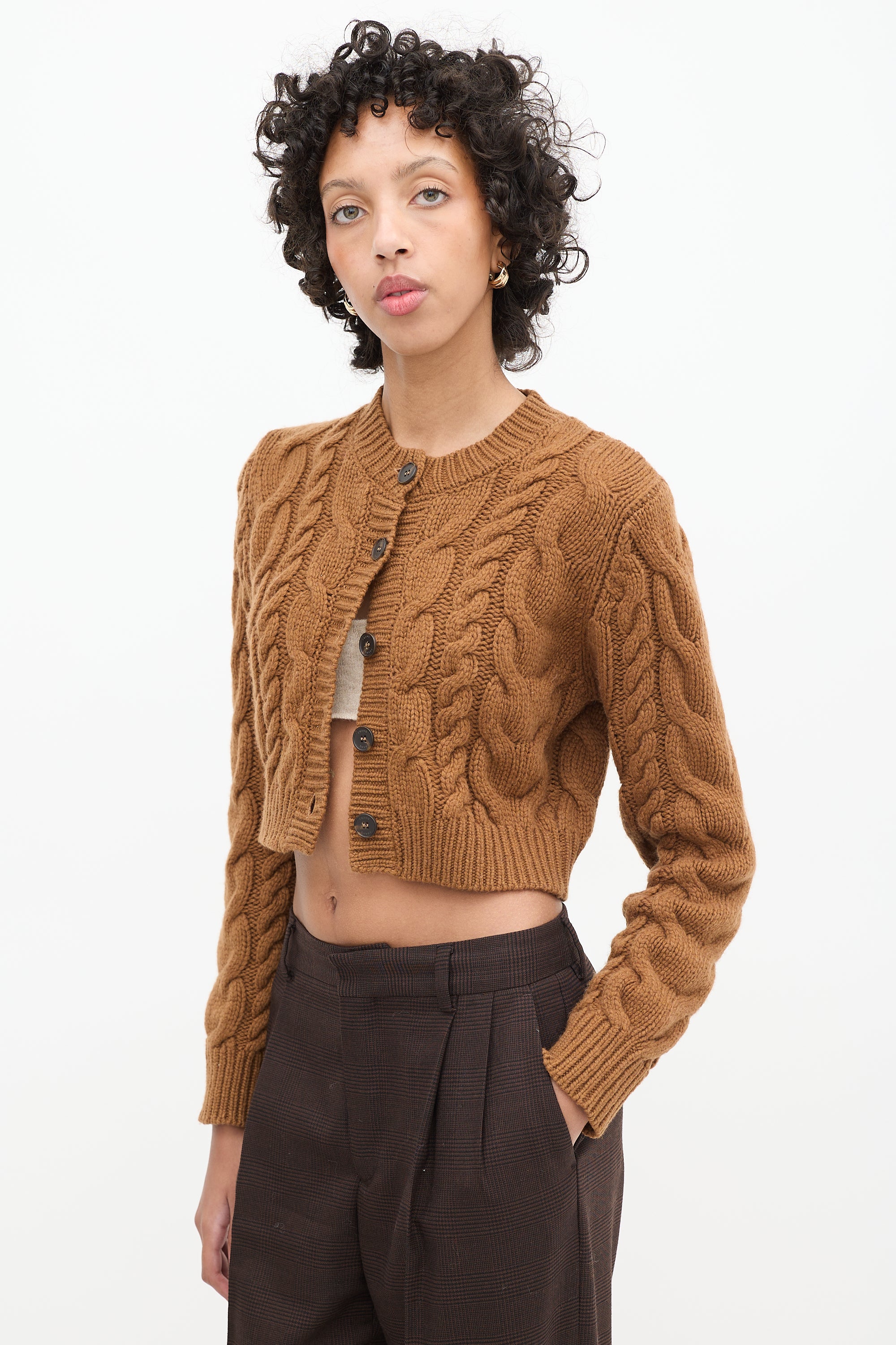 Pre-owned Frame brown wool cable knit cropped cardigan featuring a round neckline, button up front, long sleeves, and ribbing at neck, placket, hem, and cuffs.