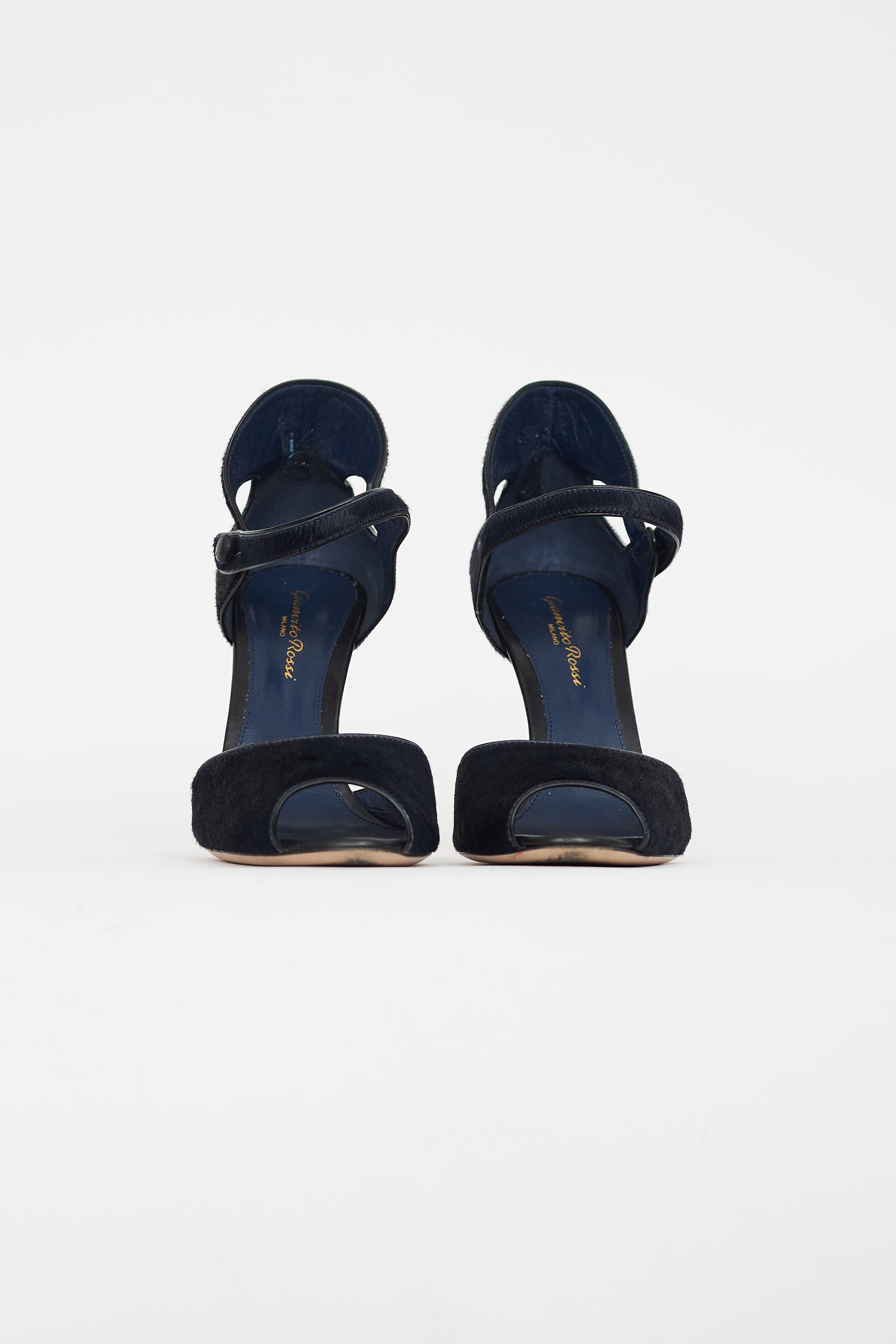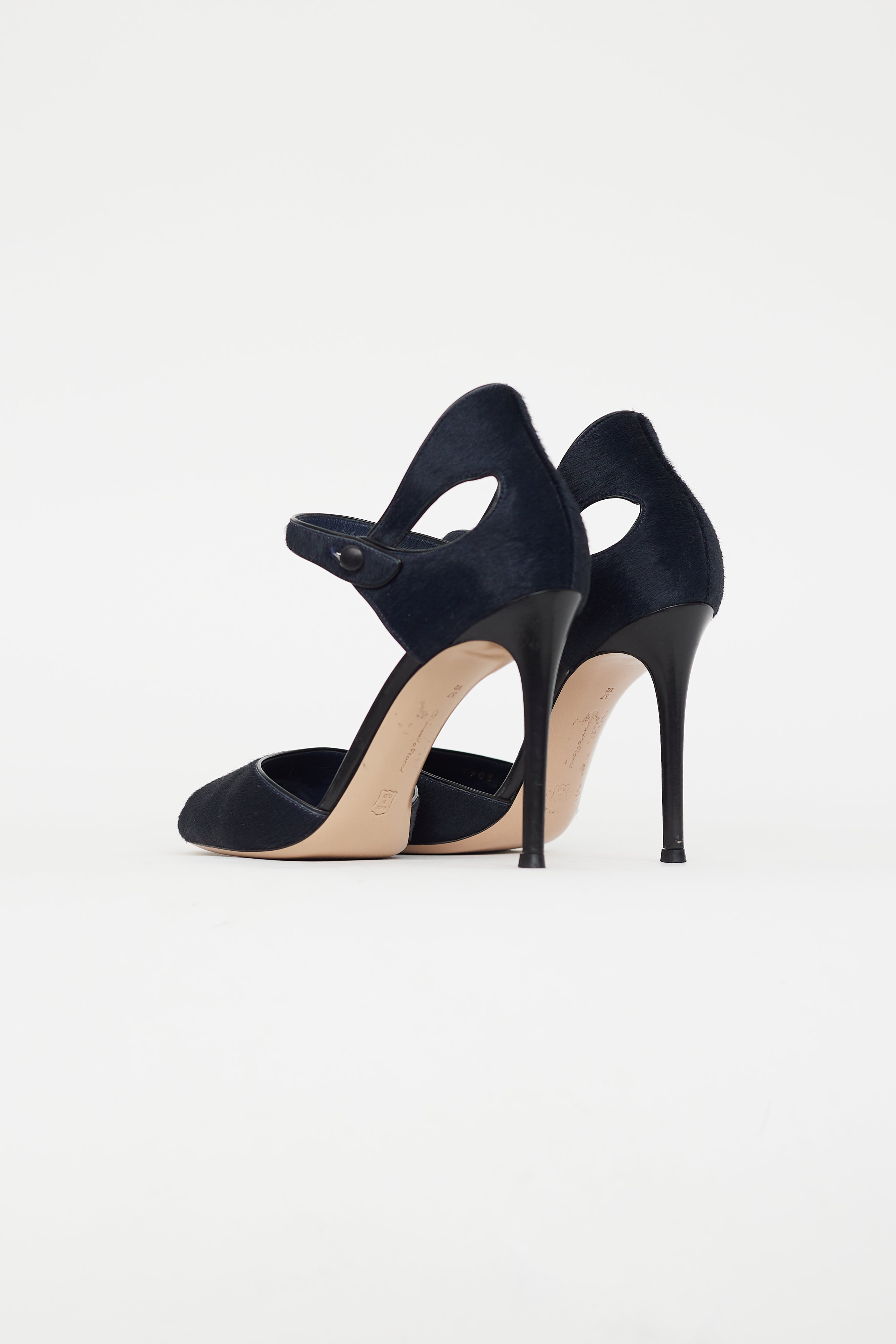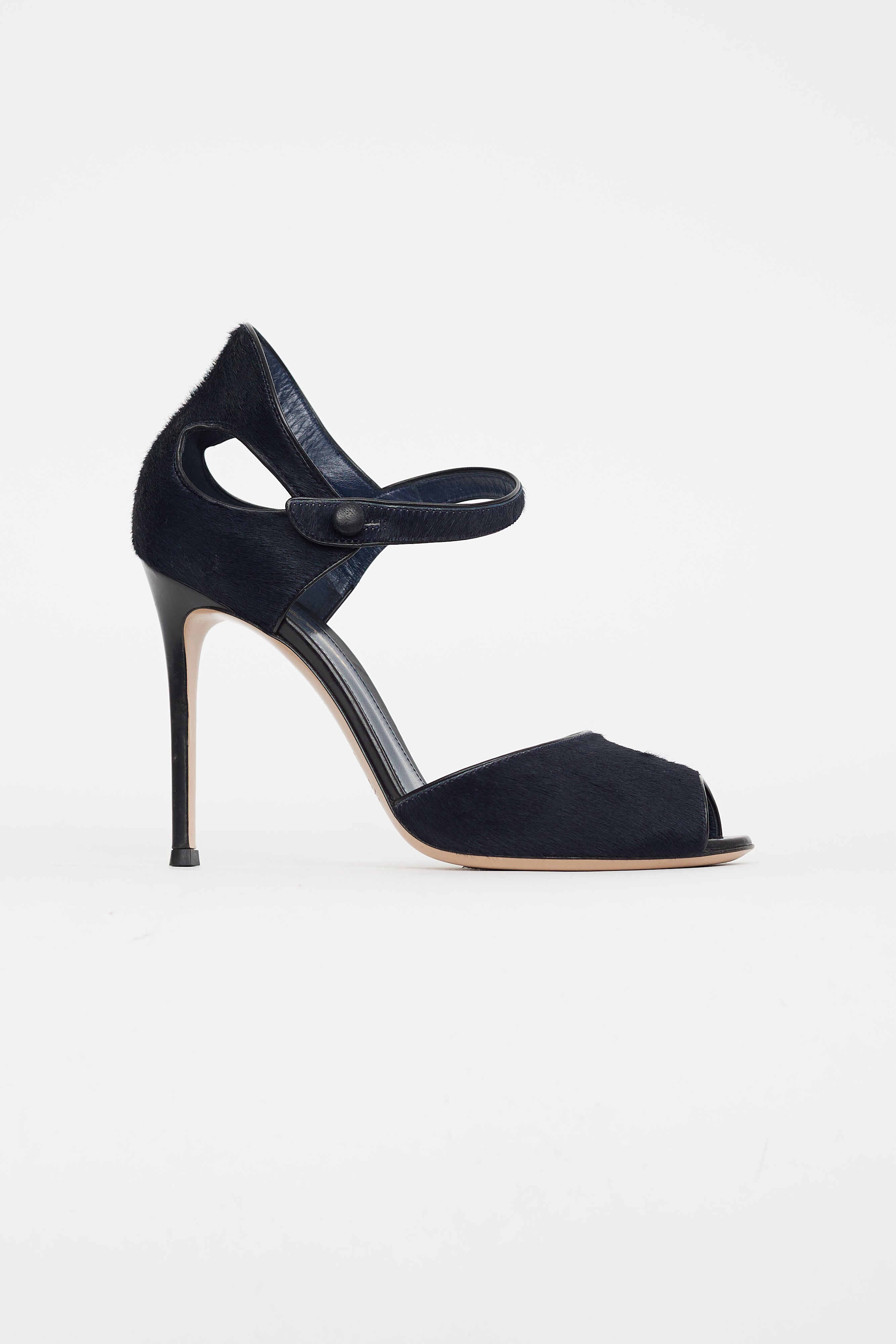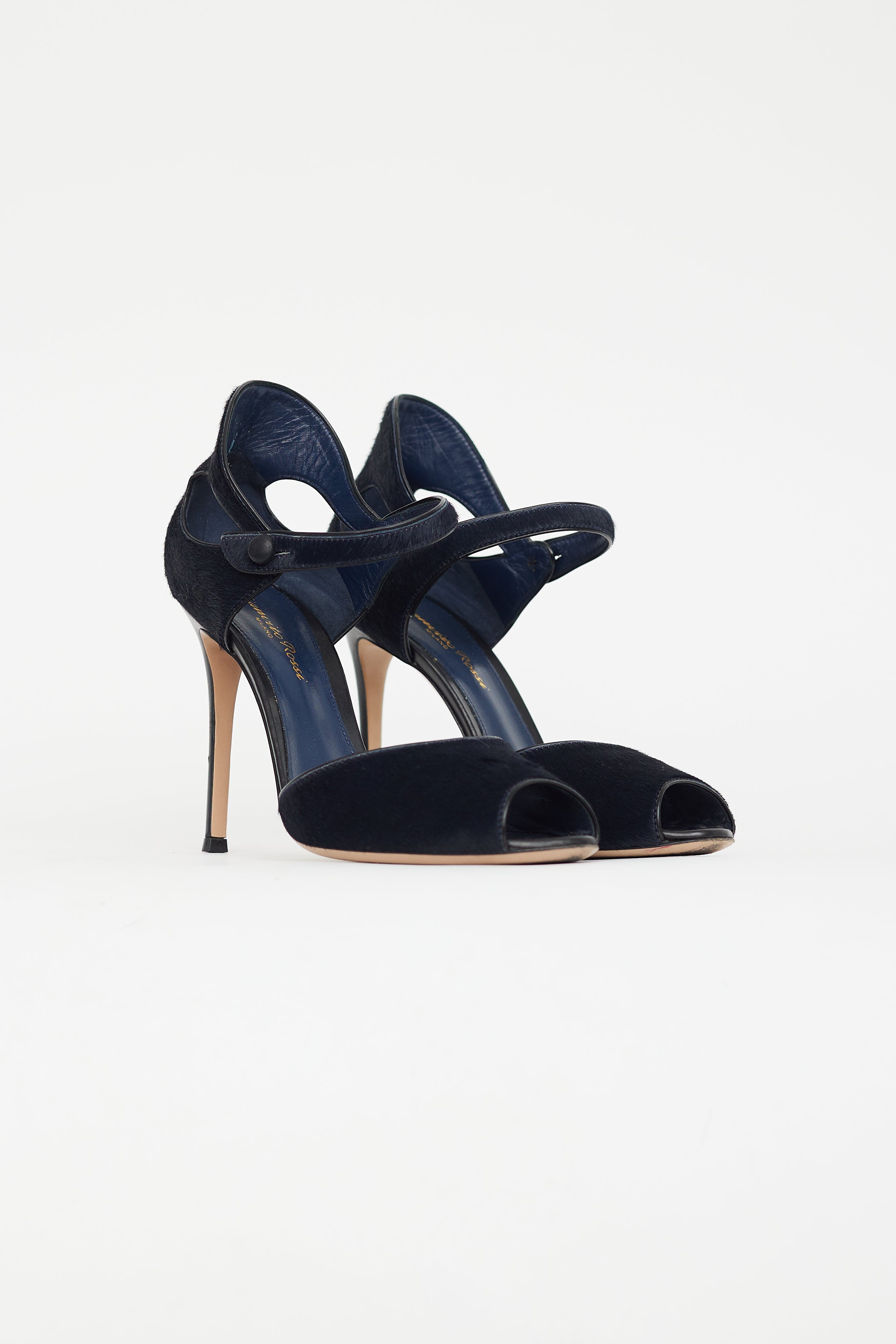 Pre-owned Gianvito Rossi navy ponyhair heel featuring a round peep toe, black wrapped stiletto heel, and button closure at ankle.