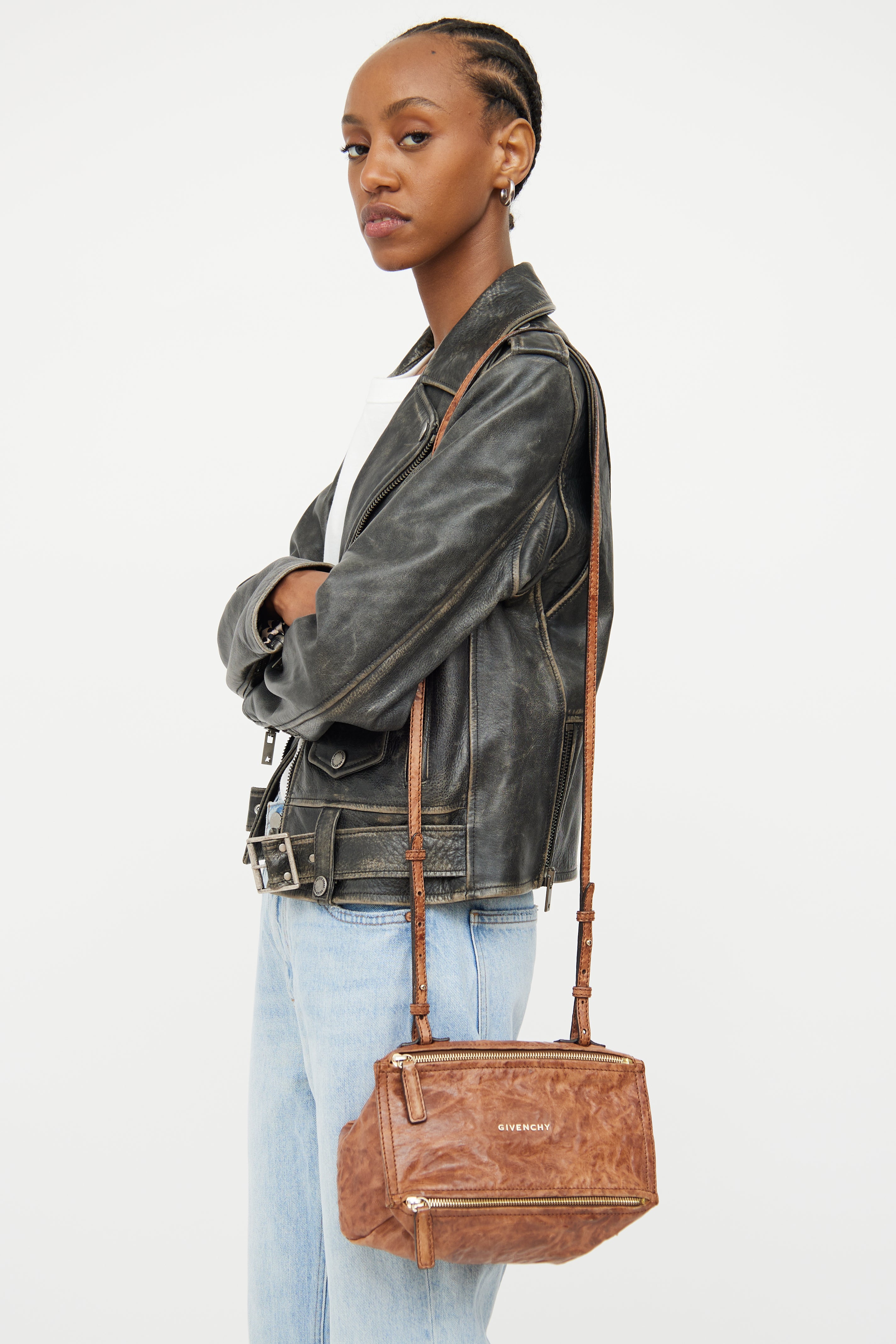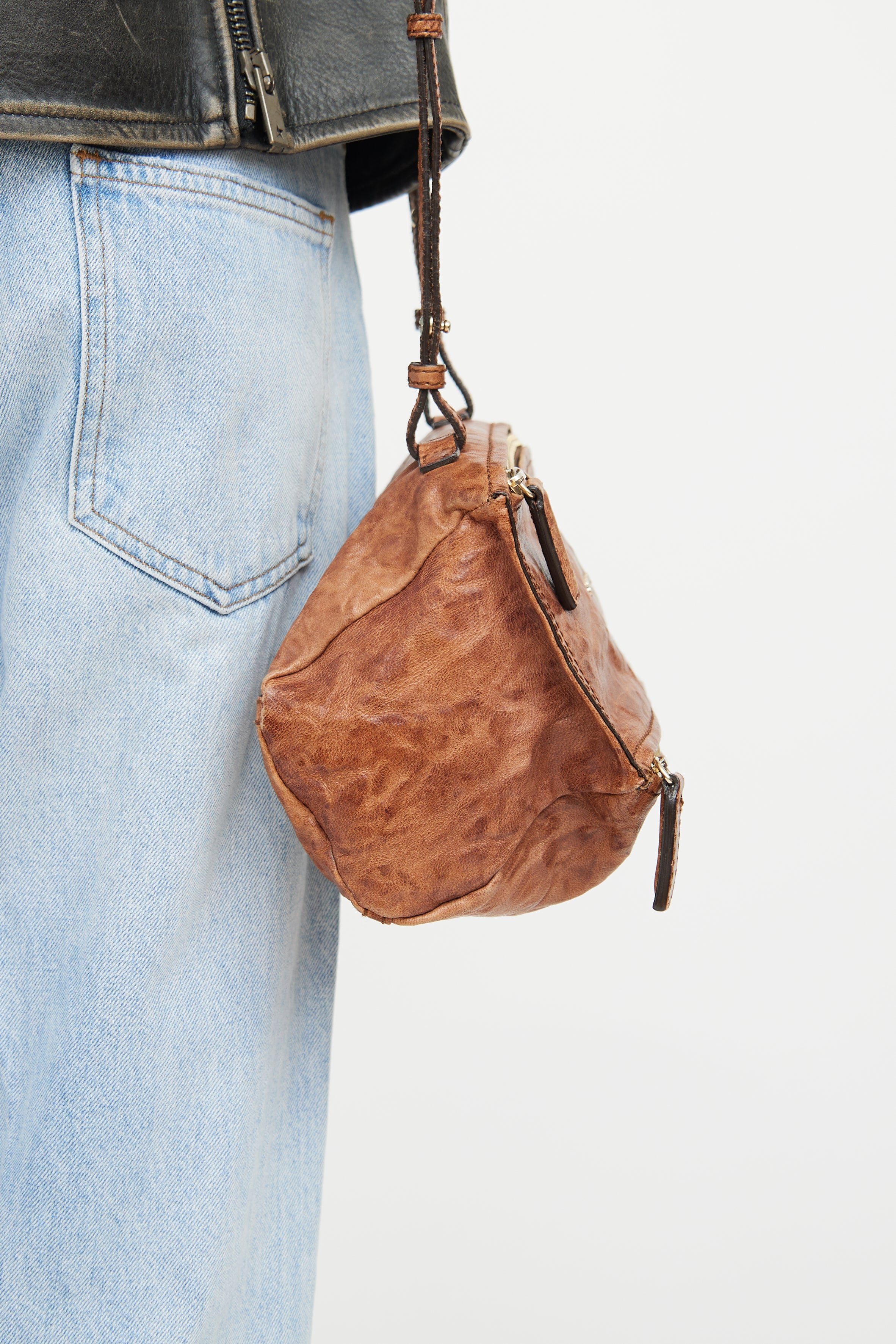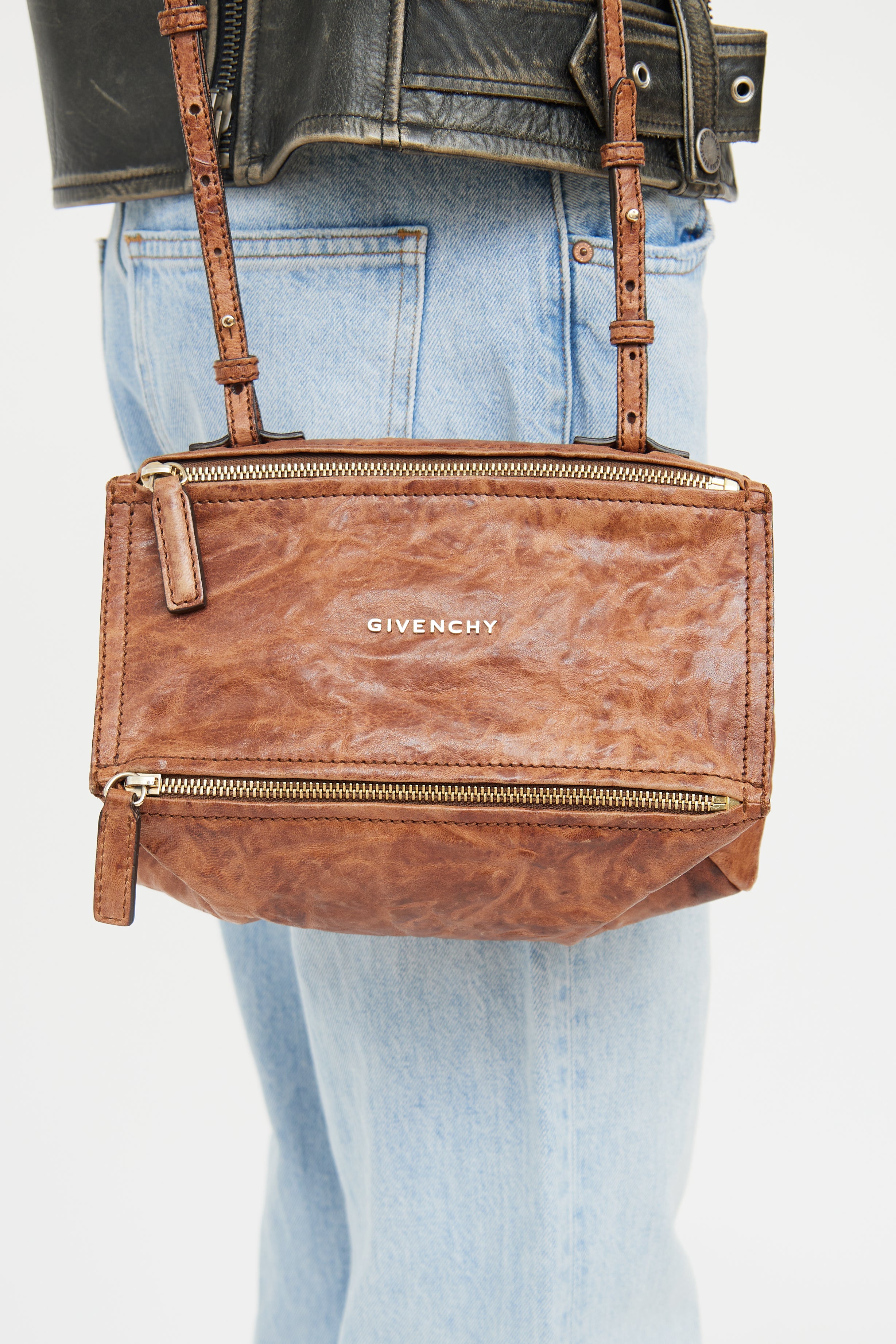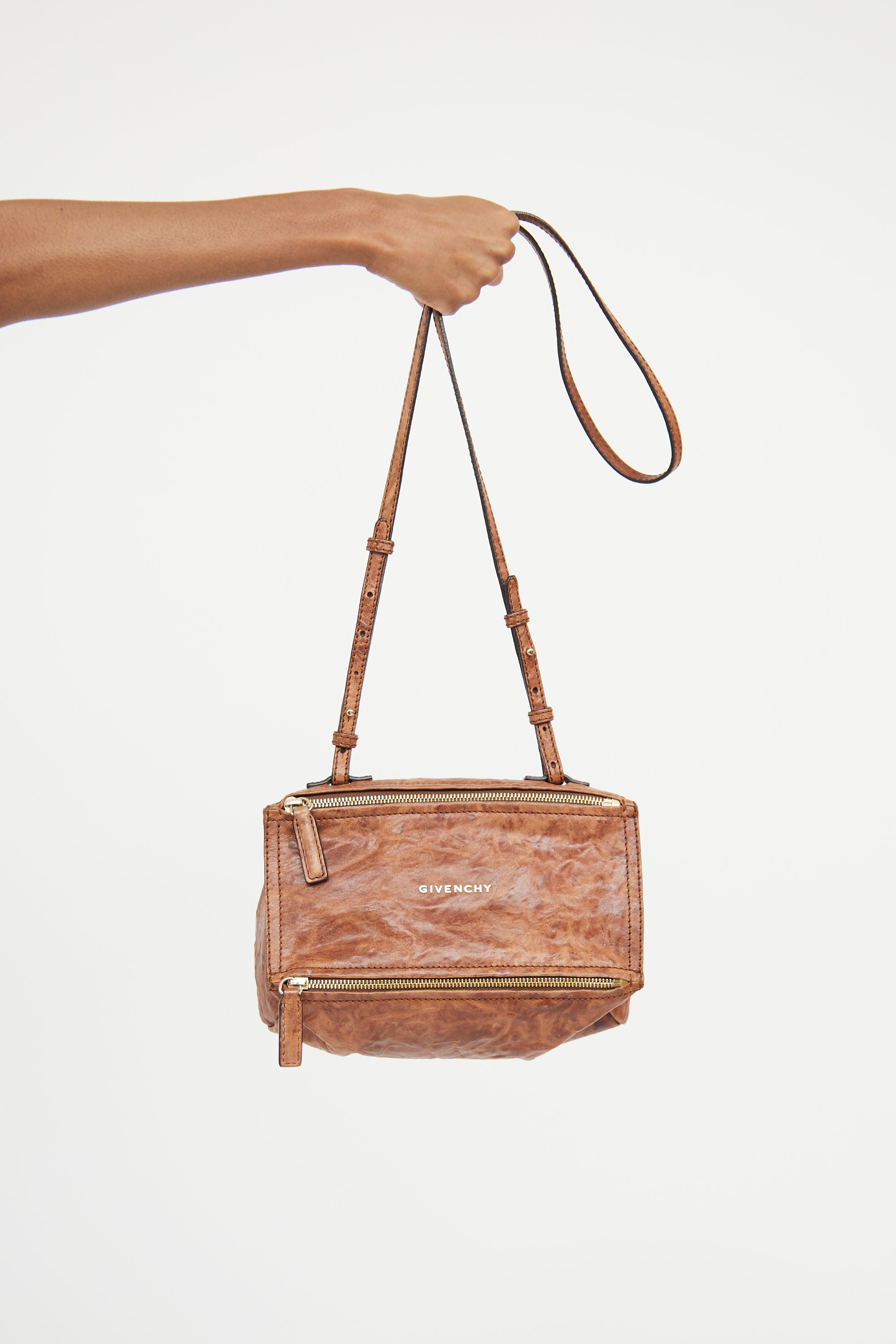 Pre-owned Givenchy brown mini Pandora bag featuring single flat adjustable shoulder strap, gold tone hardware, distressed mottled leather with sheen finish, Givenchy logo text hardware across front, zip with pull tab on bottom opening to compartment and main zip closure on bag top. Main compartment with single zip pocket.