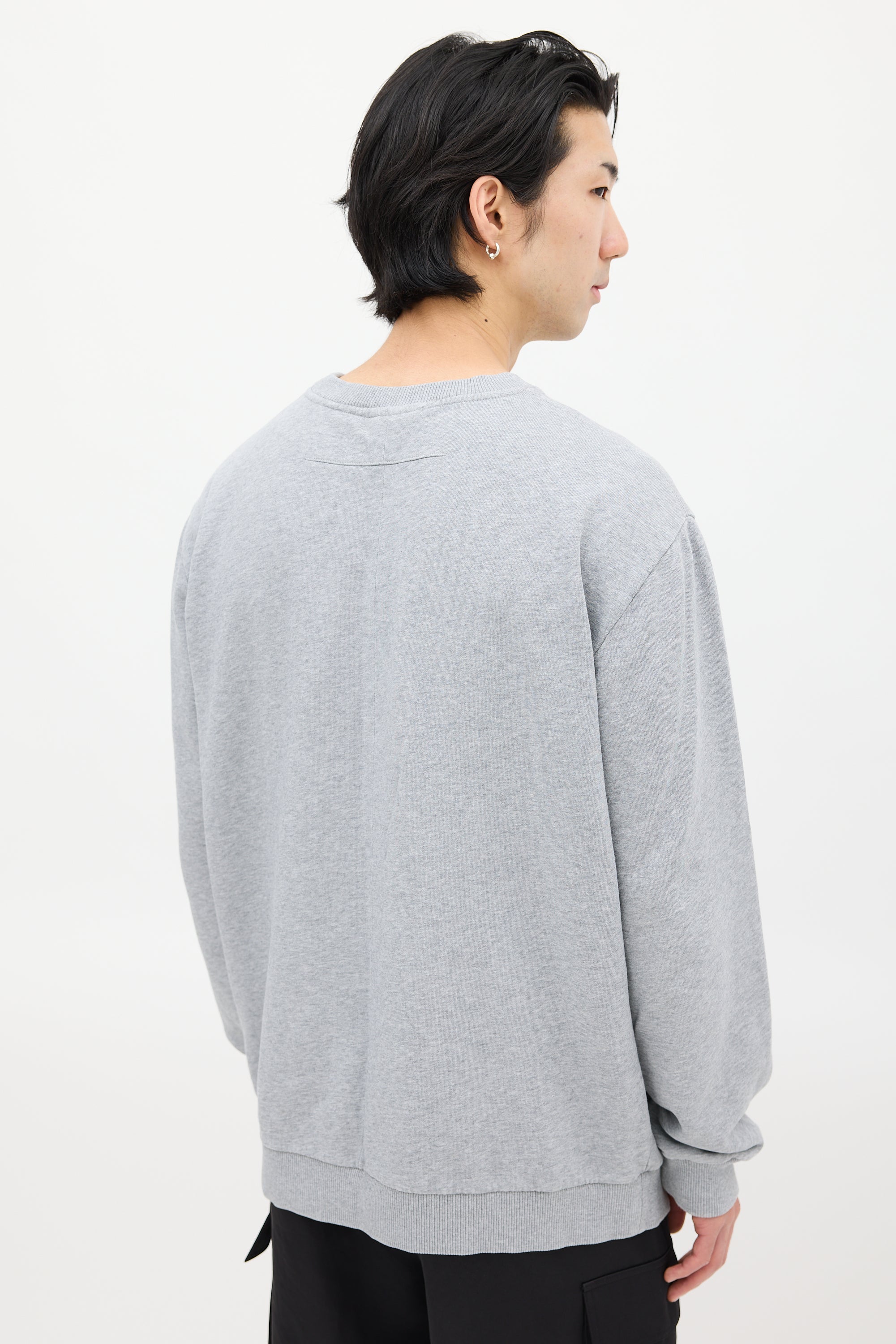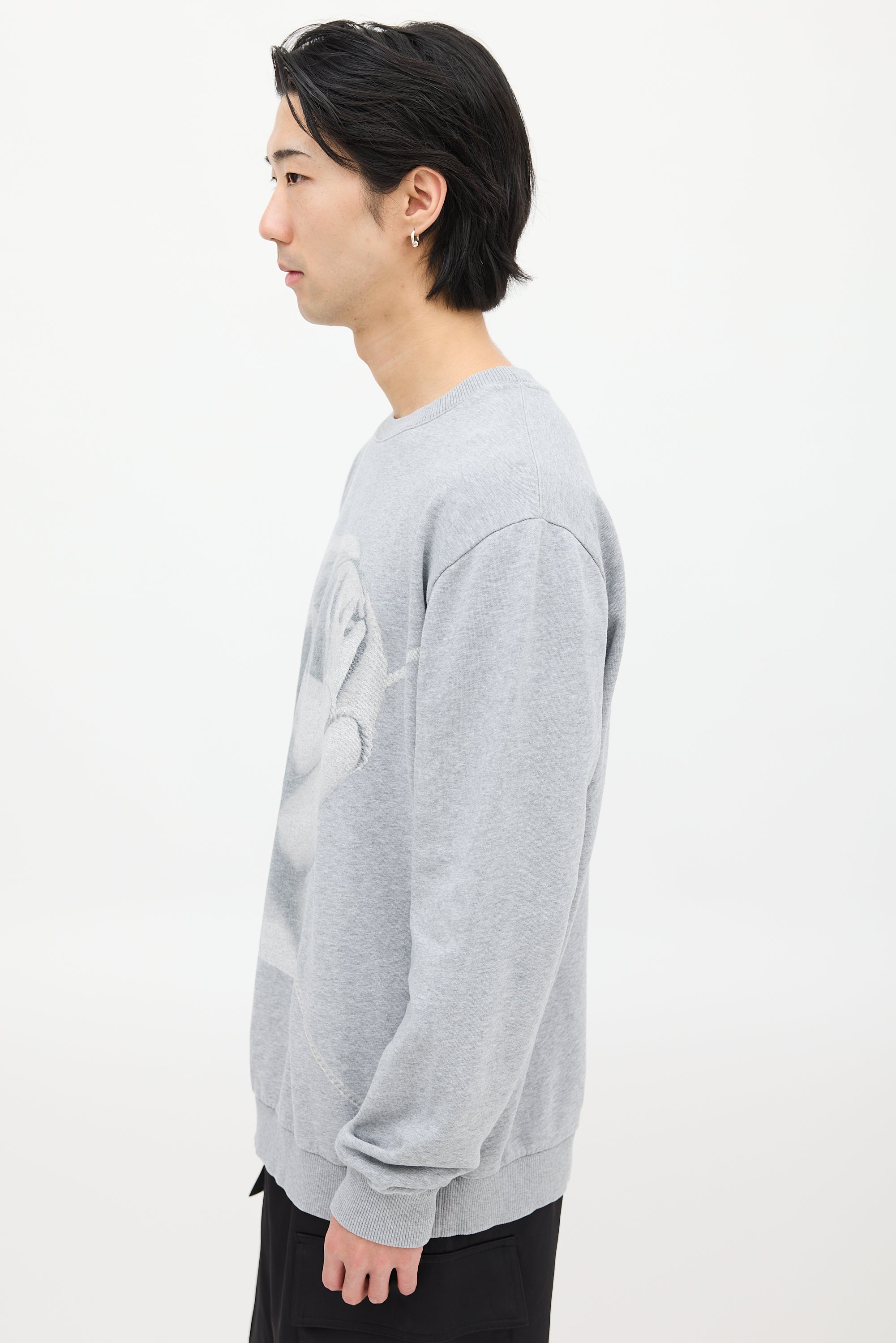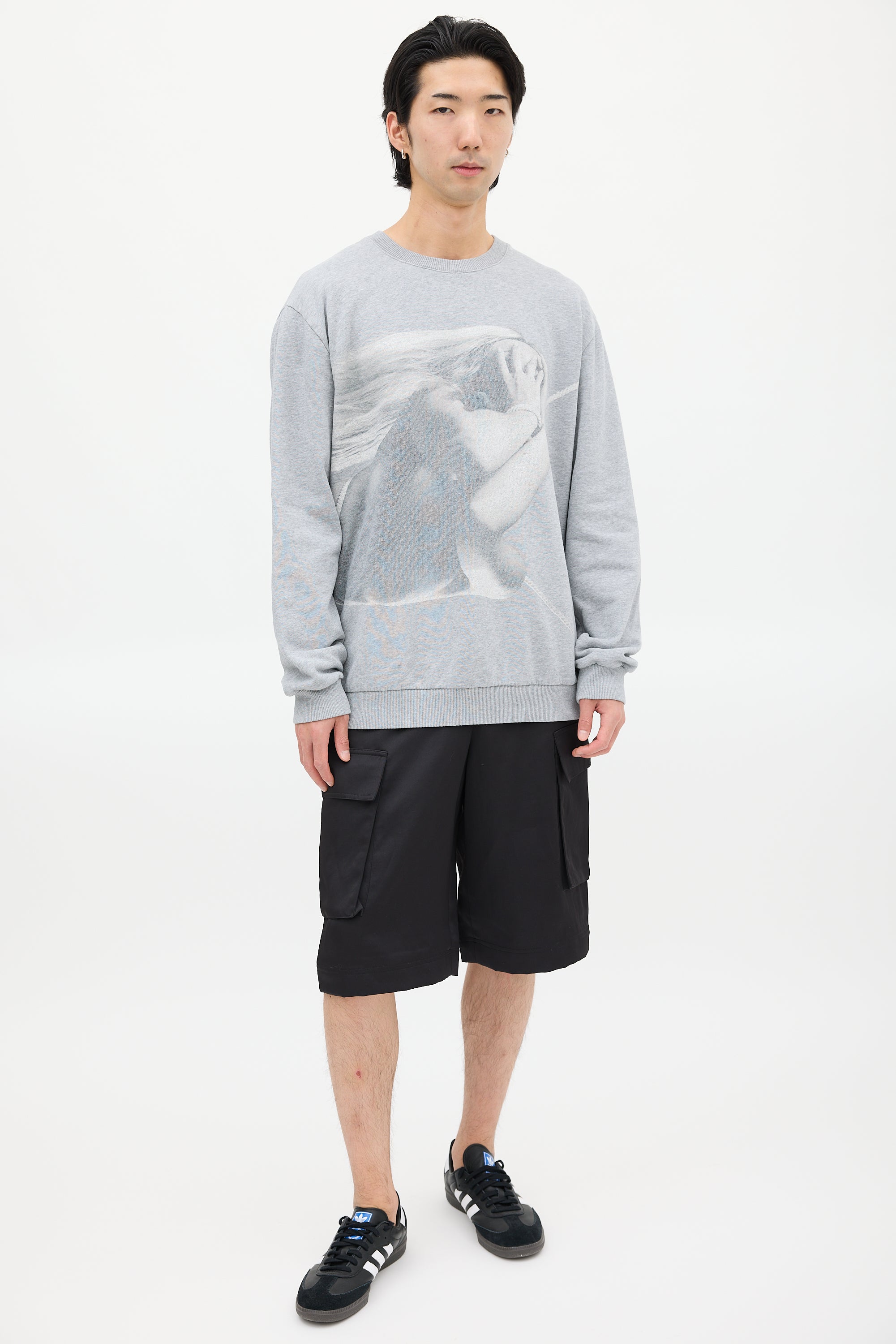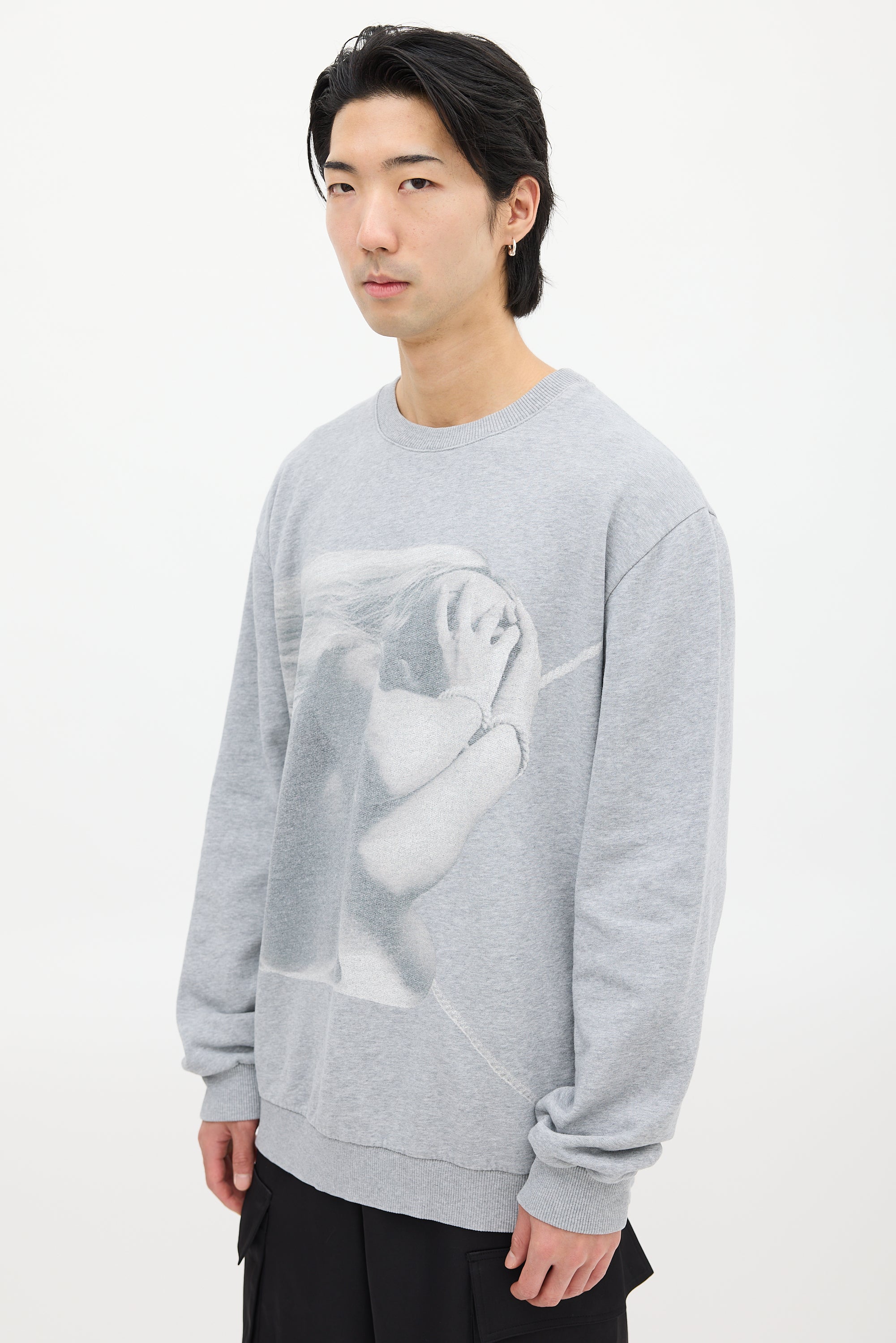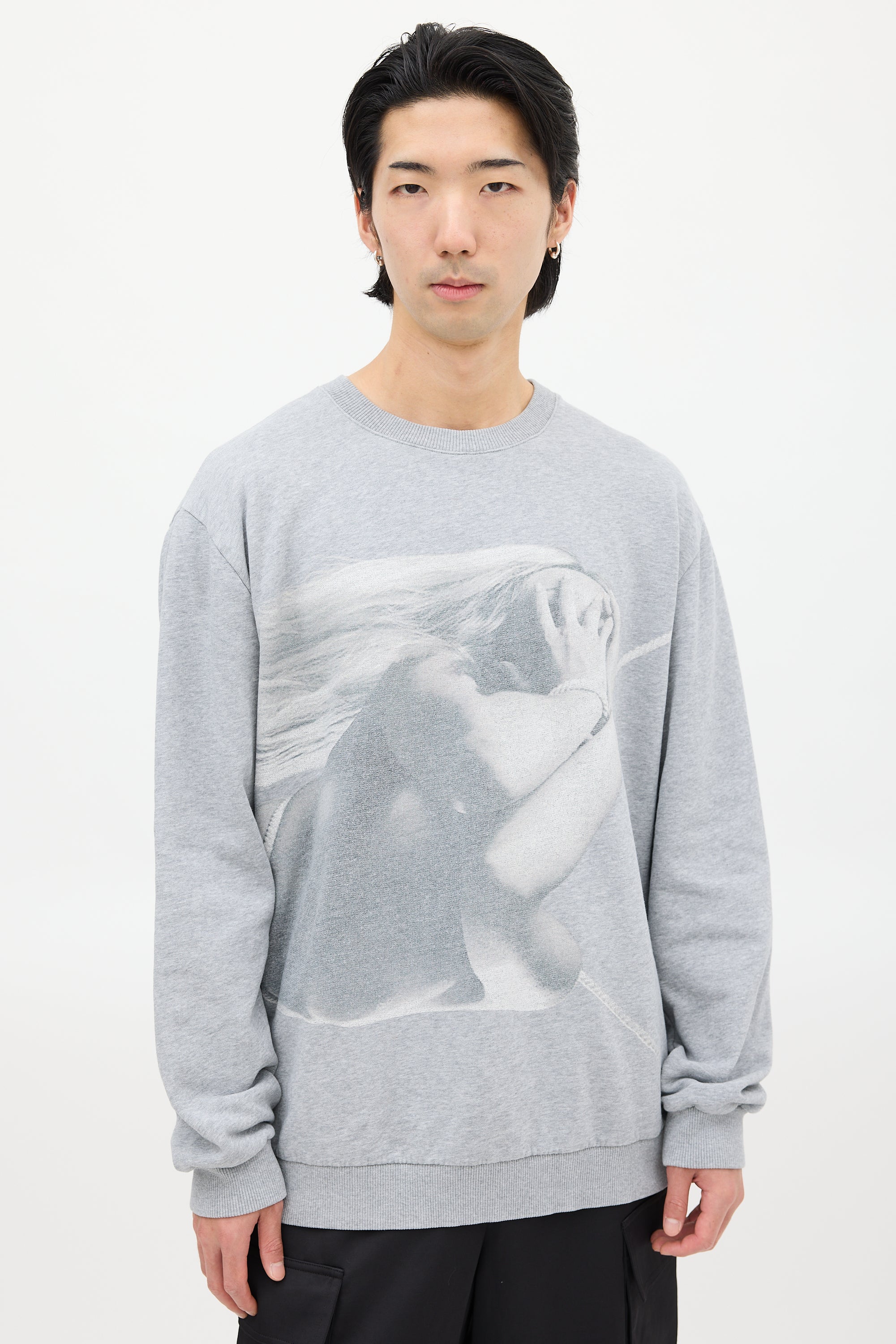Pre-owned Givenchy grey sweatshirt featuring a white graphic woman print at chest, round neckline, long sleeves, and ribbed hem.