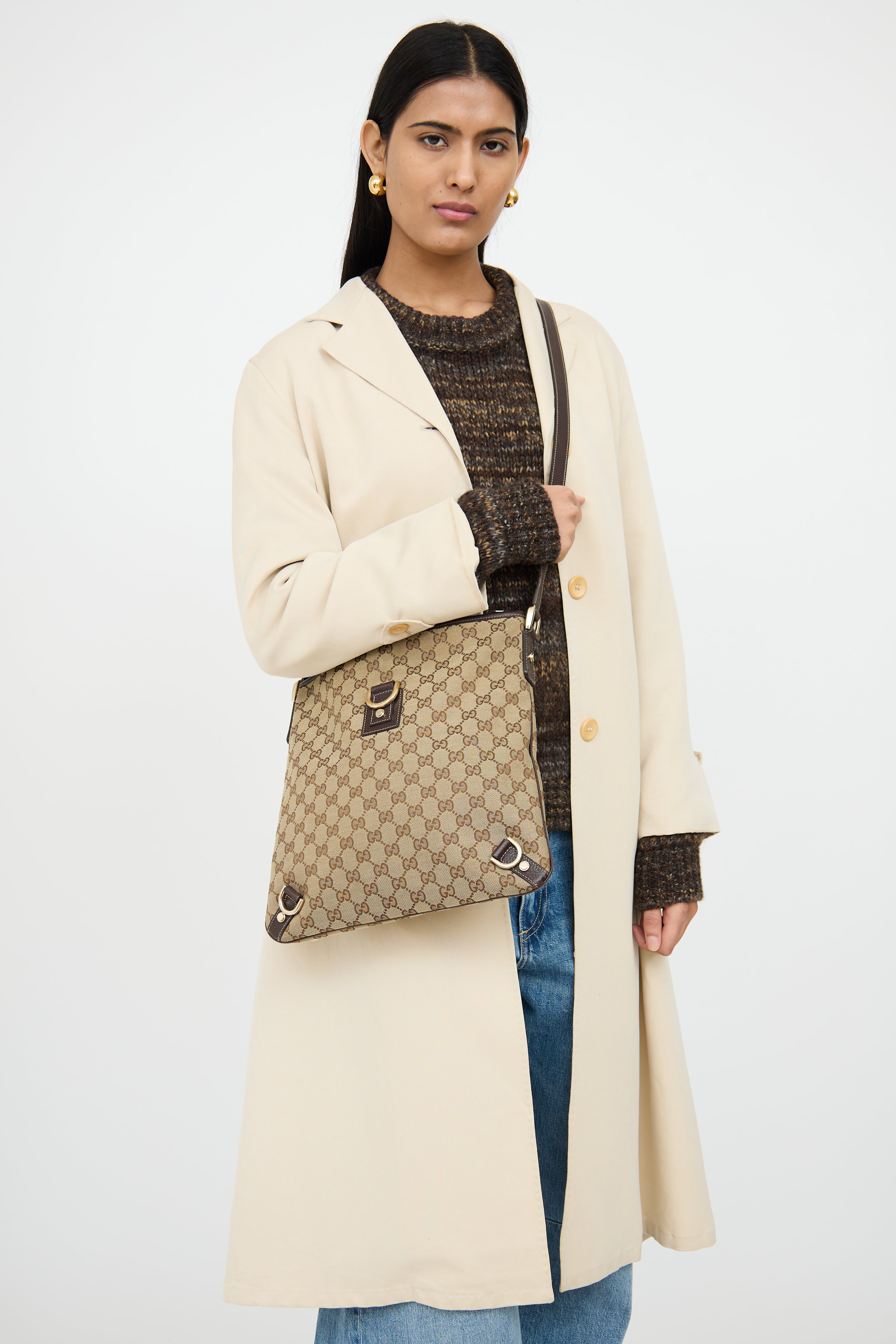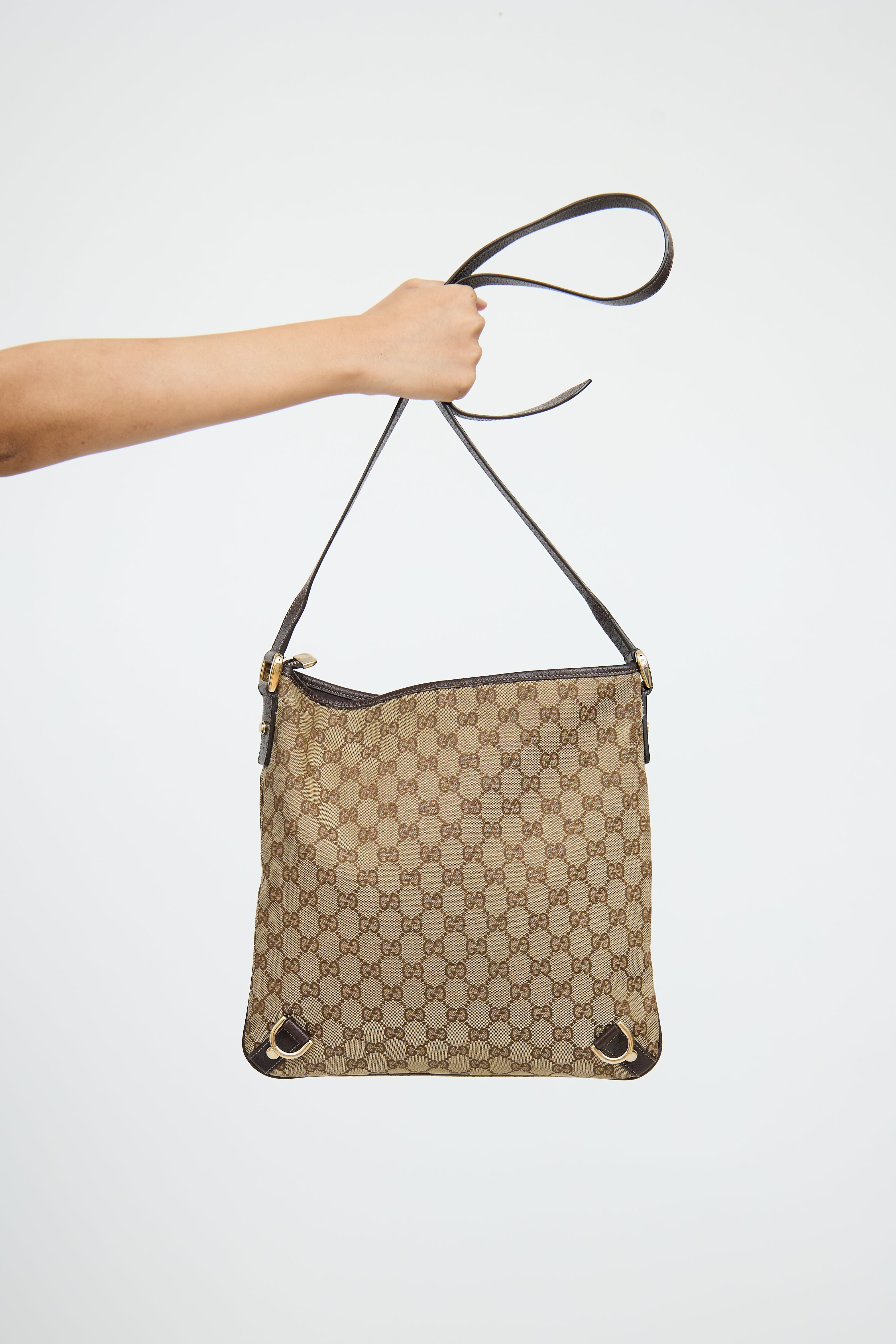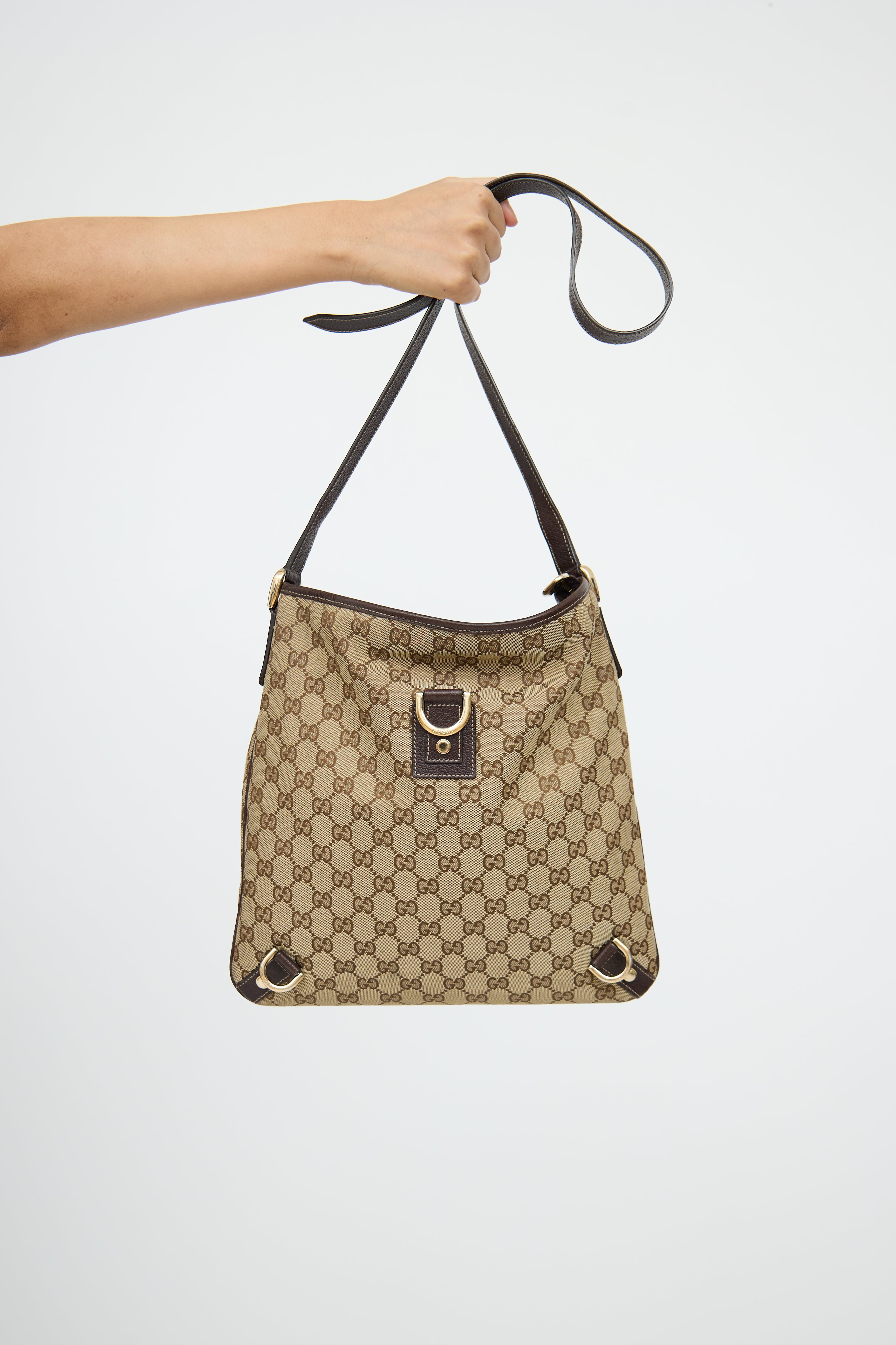 Pre-owned Gucci beige & brown canvas Abbey crossbody bag featuring single flat shoulder strap, contrast stitching, canvas monogram, leather patch with d ring on front, rolled edge trim, strap detail along bottom and zip closure top with pull tab. Canvas lined interior with single slip pocket and single zip pocket.