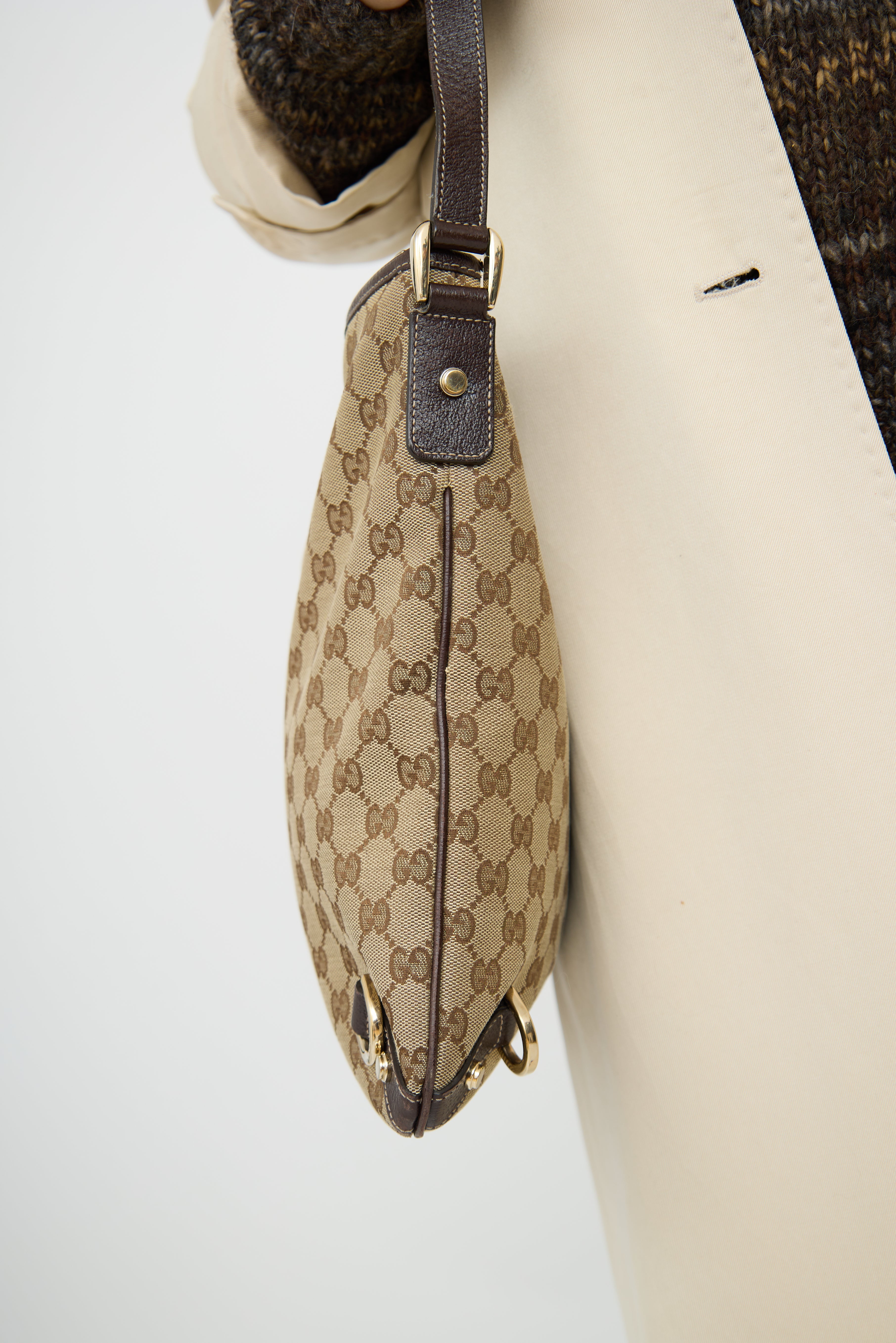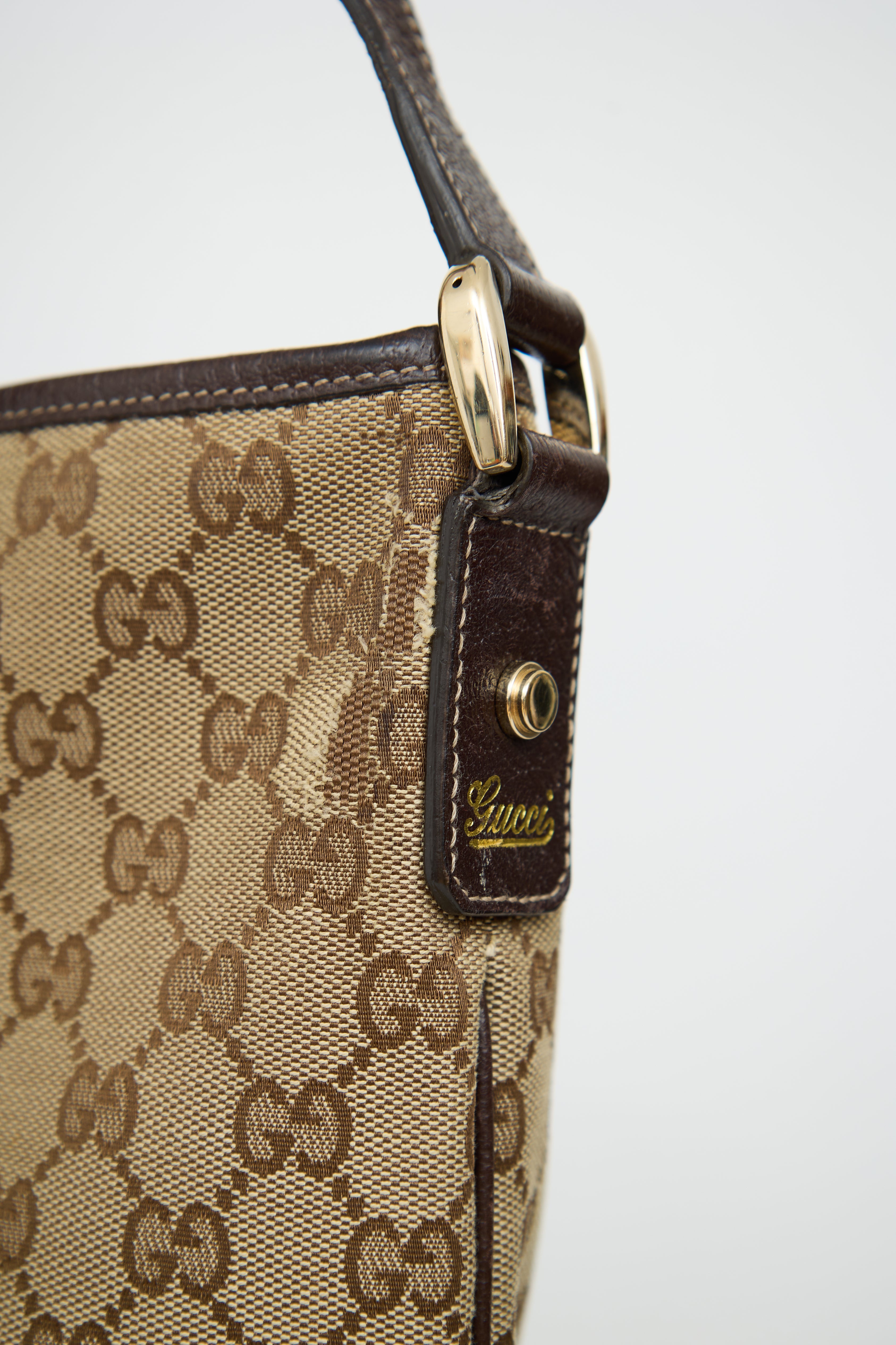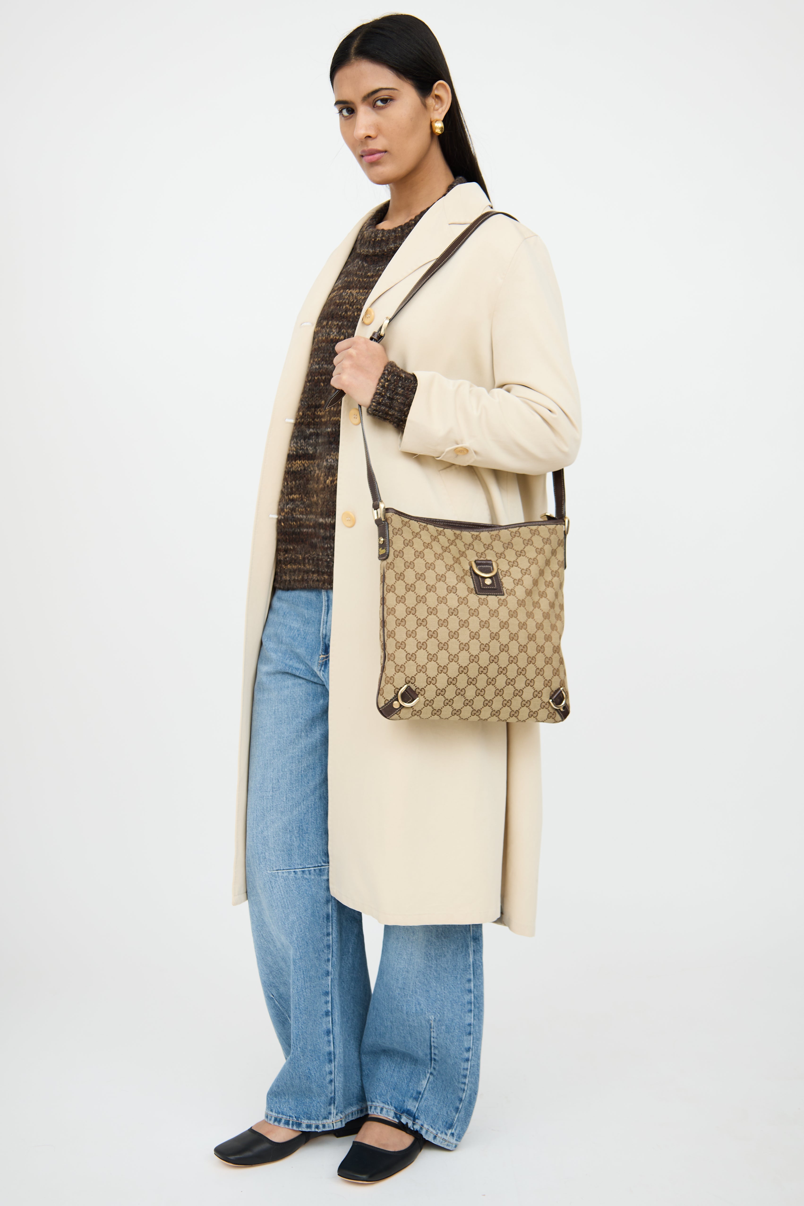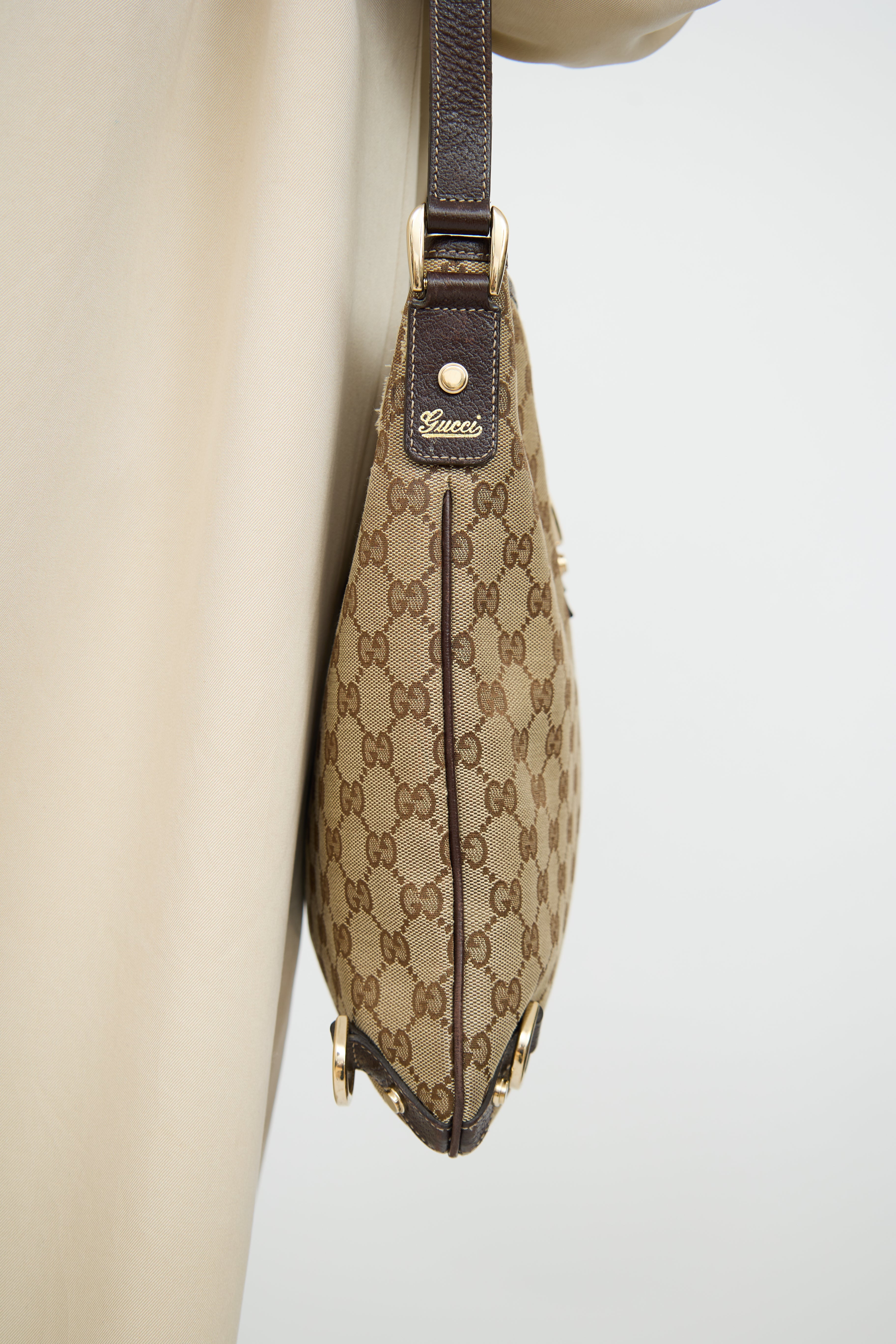 Pre-owned Gucci beige & brown canvas Abbey crossbody bag featuring single flat shoulder strap, contrast stitching, canvas monogram, leather patch with d ring on front, rolled edge trim, strap detail along bottom and zip closure top with pull tab. Canvas lined interior with single slip pocket and single zip pocket.