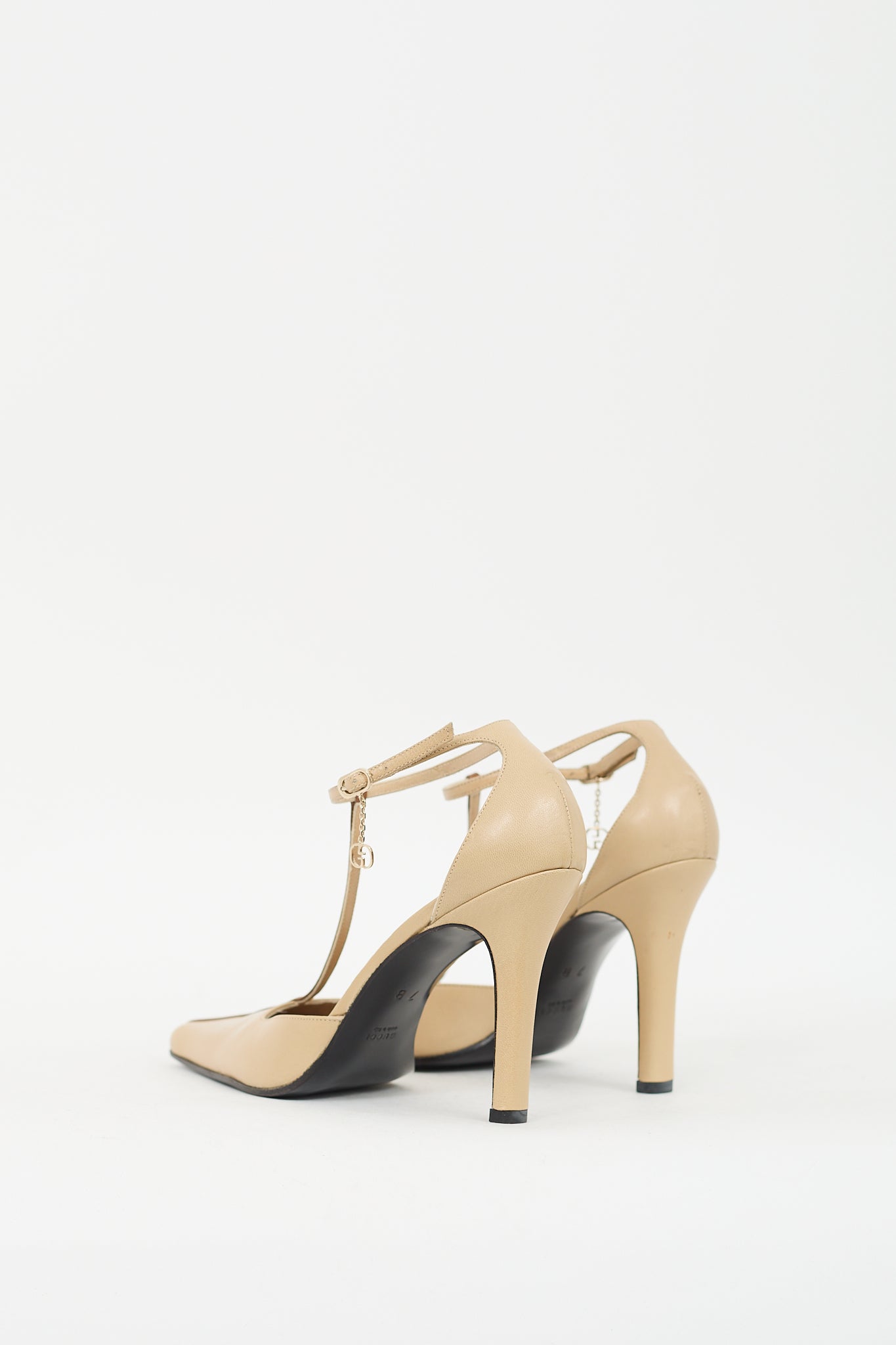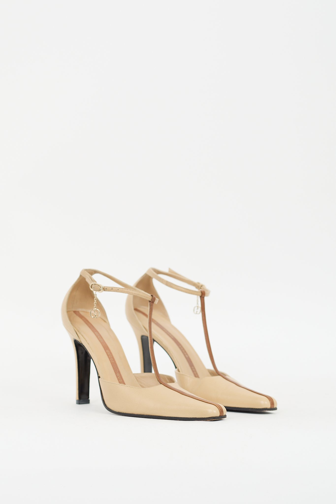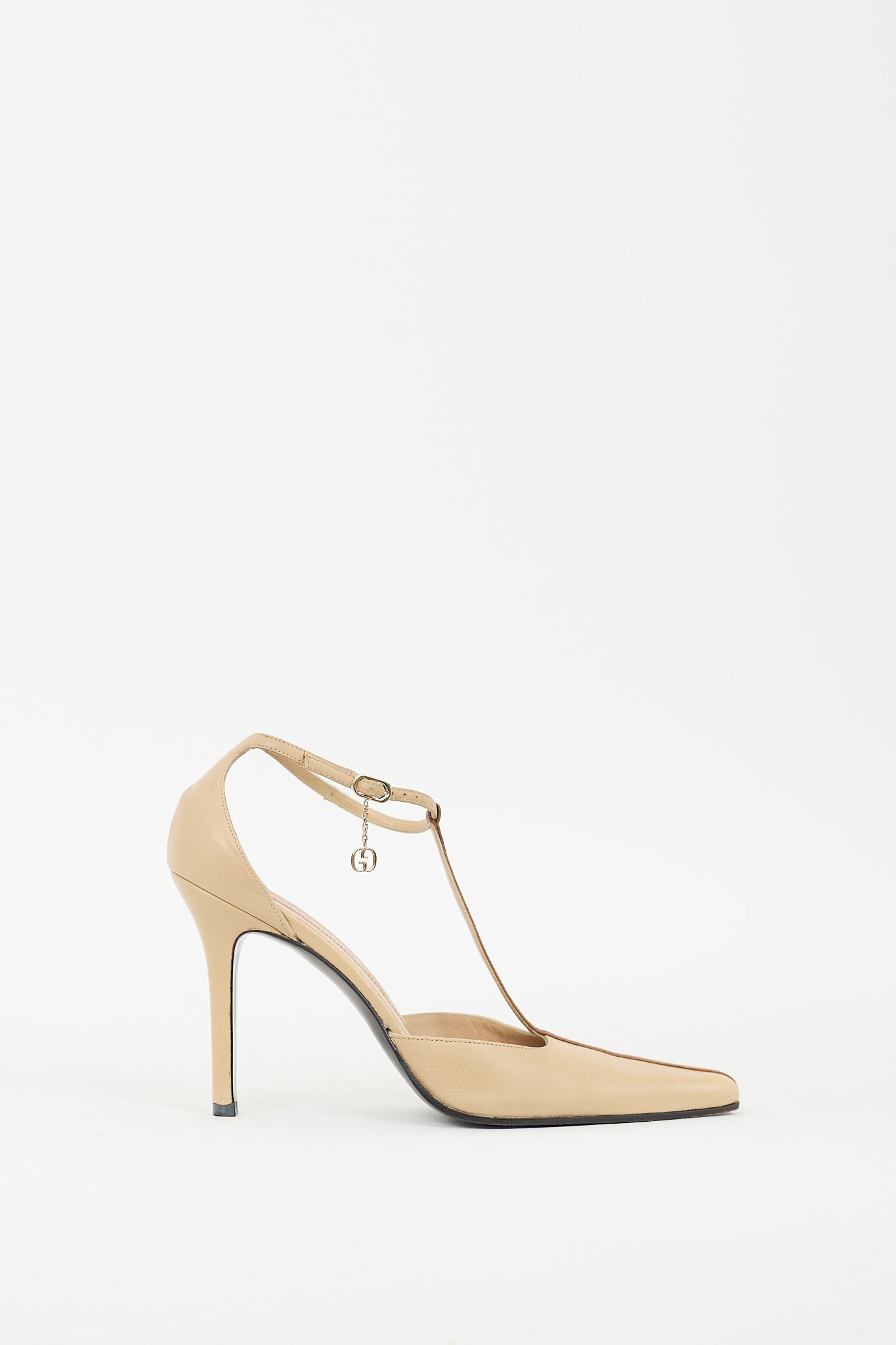 Pre-owned Gucci beige leather D'orsay pumps featuring pointed square toe, contrast brown T-strap, adjustable ankle strap with buckle closure and gold tone GG logo charm.