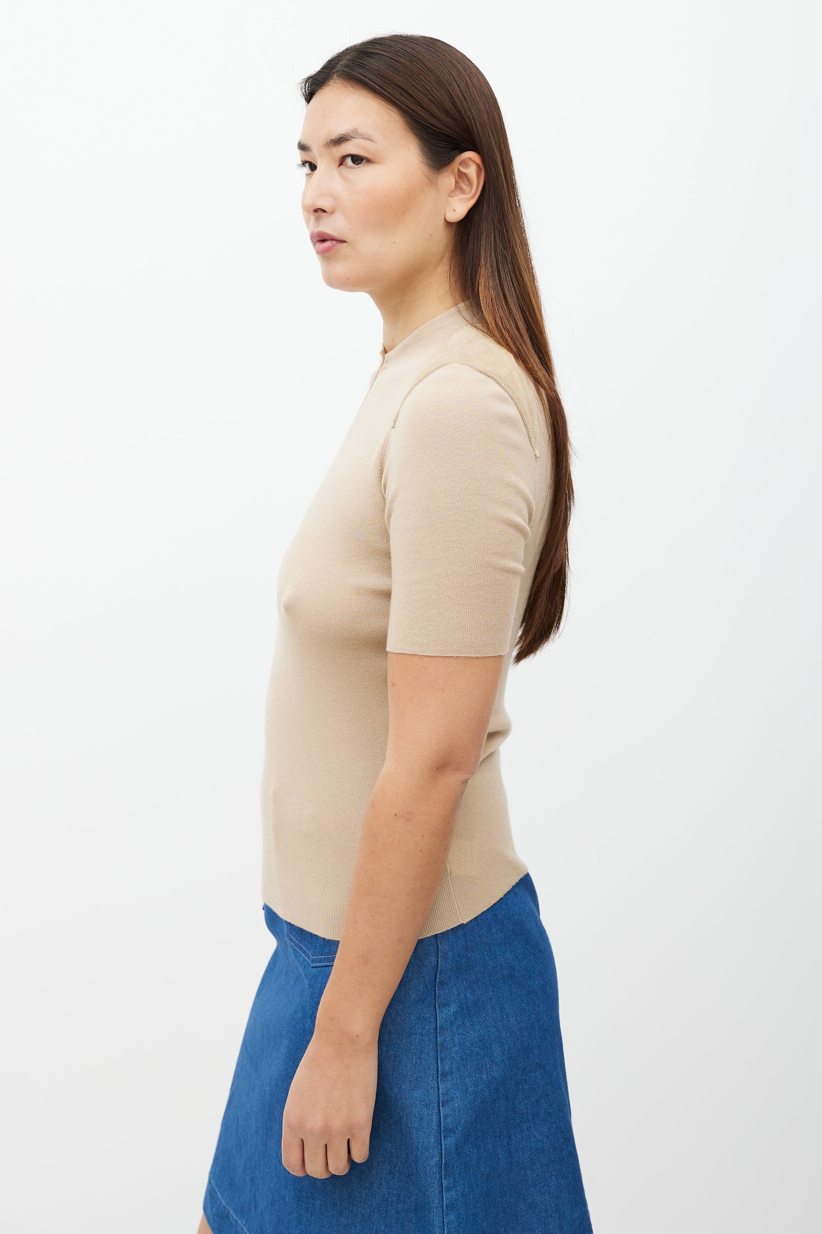 Pre-owned Gucci beige cashmere knit top featuring a round neckline, short sleeves, tonal suede trim at shoulders, and keyhole neckline.