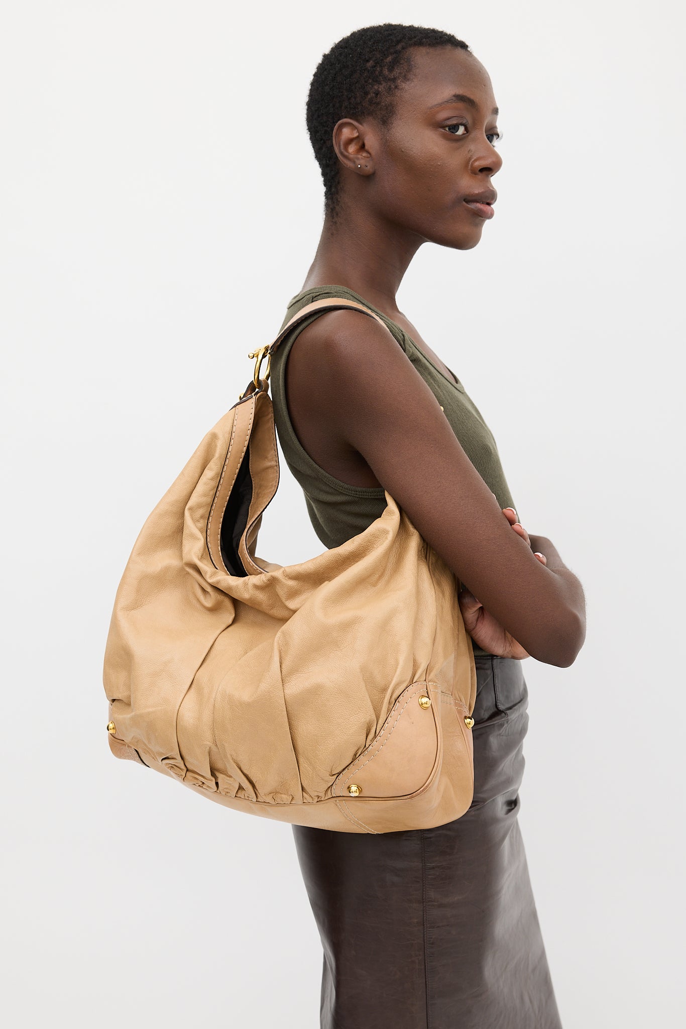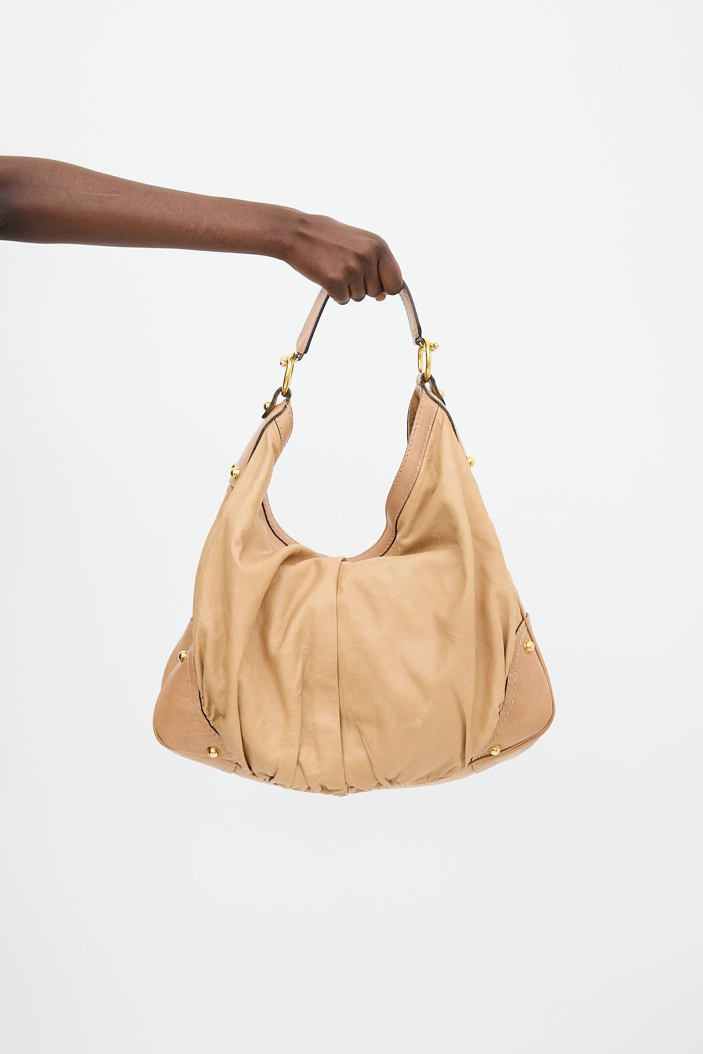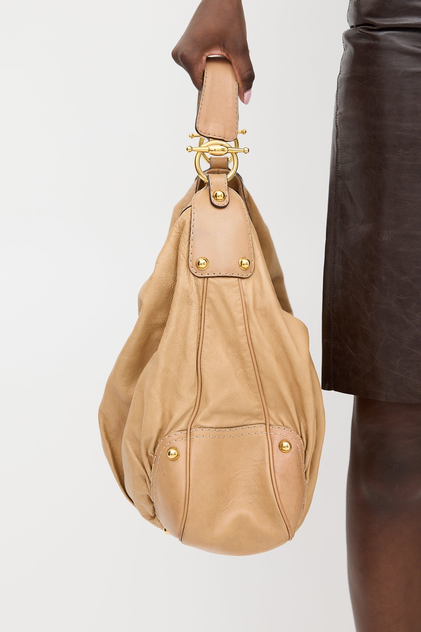Pre-owned Gucci beige Jockey leather bag featuring gathered detailing throughout, top handle with gold tone horsebit hardware, one main compartment with one zip pocket, and studded hardware at sides.