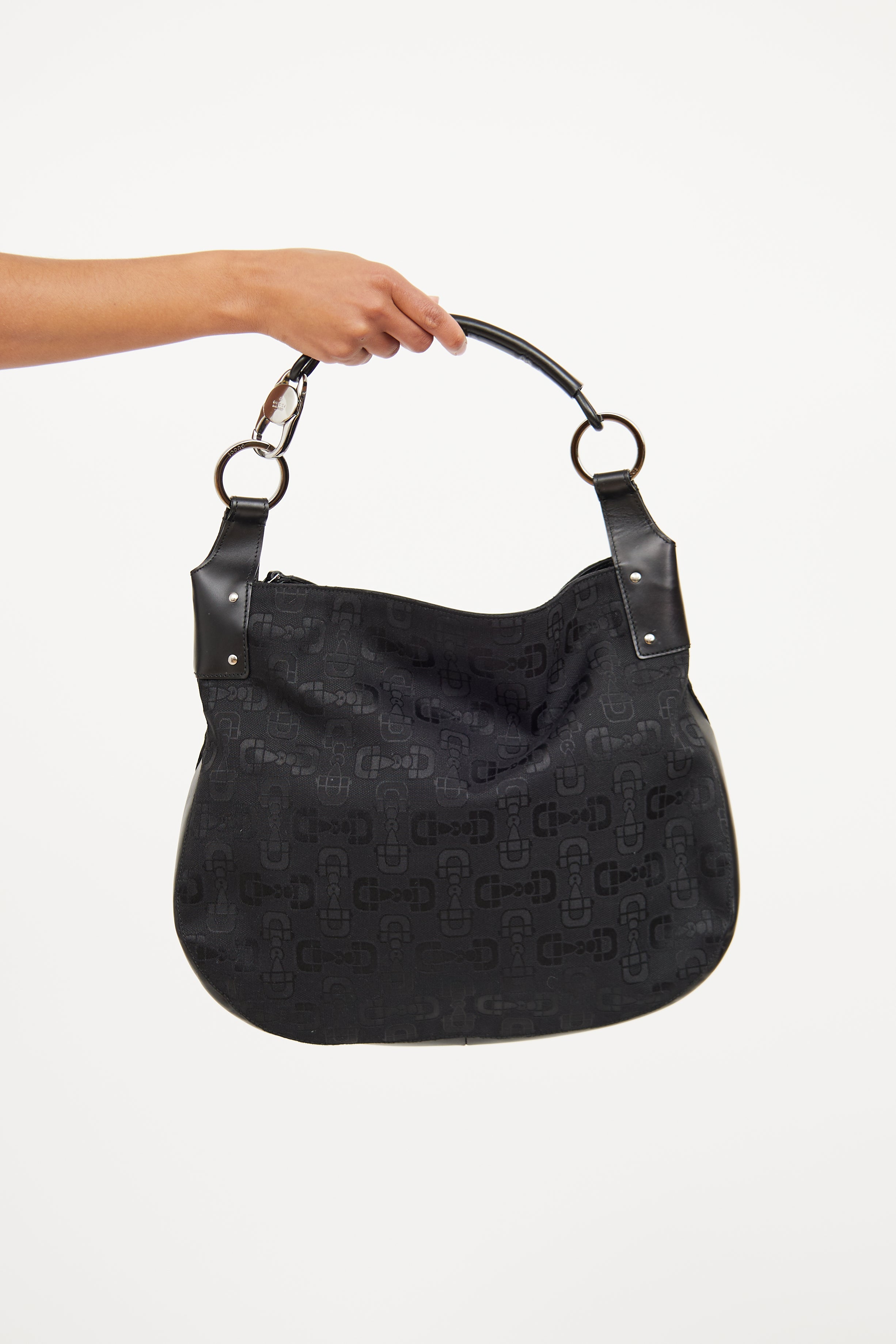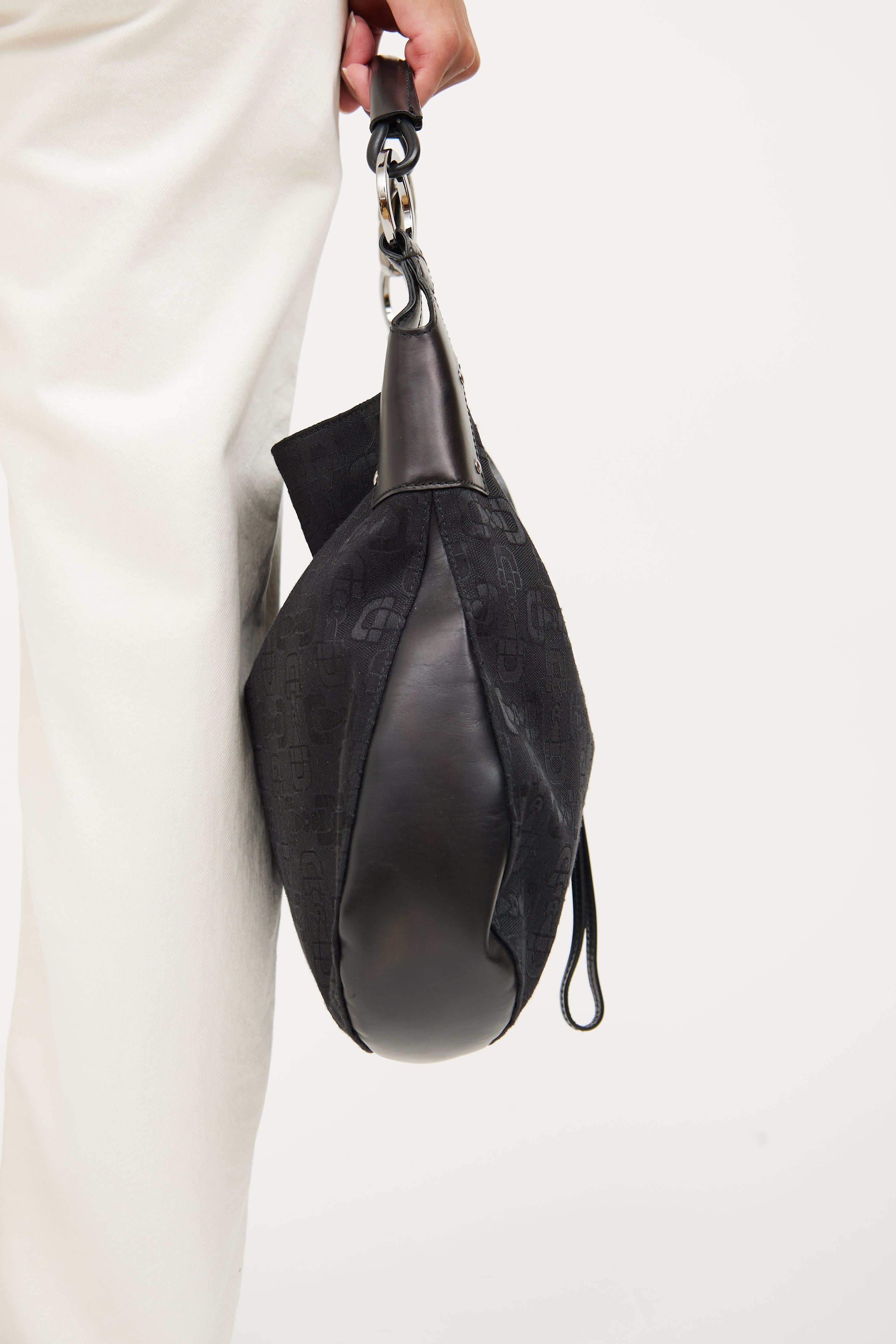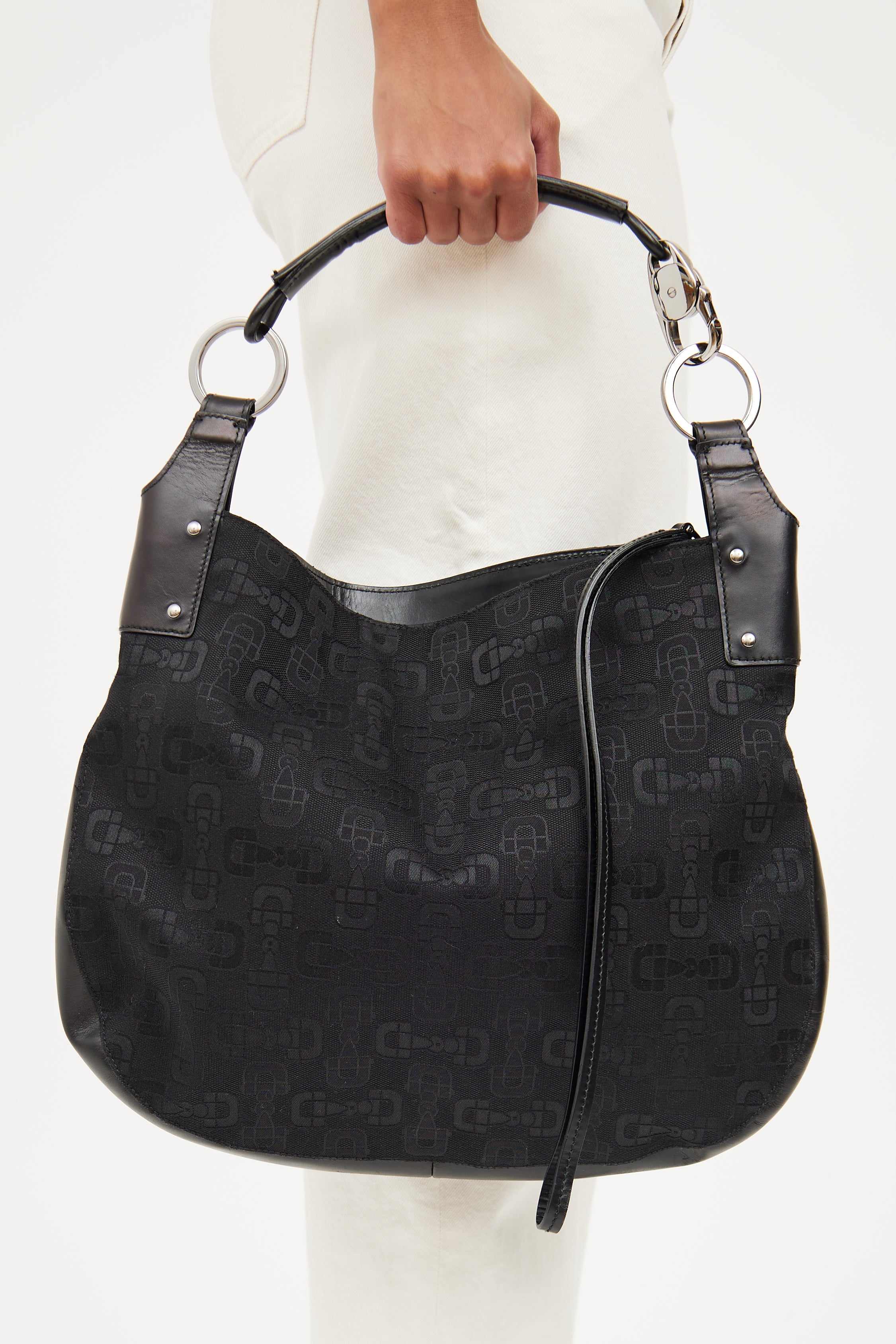 Pre-owned Gucci black canvas Horsebit shoulder bag featuring woven horsebit canvas, black leather trim, gunmetal hardware, rolled single strap with clasp hook, two separate interior compartments, one zipper divider pocket with long leather pull and one zip pocket.