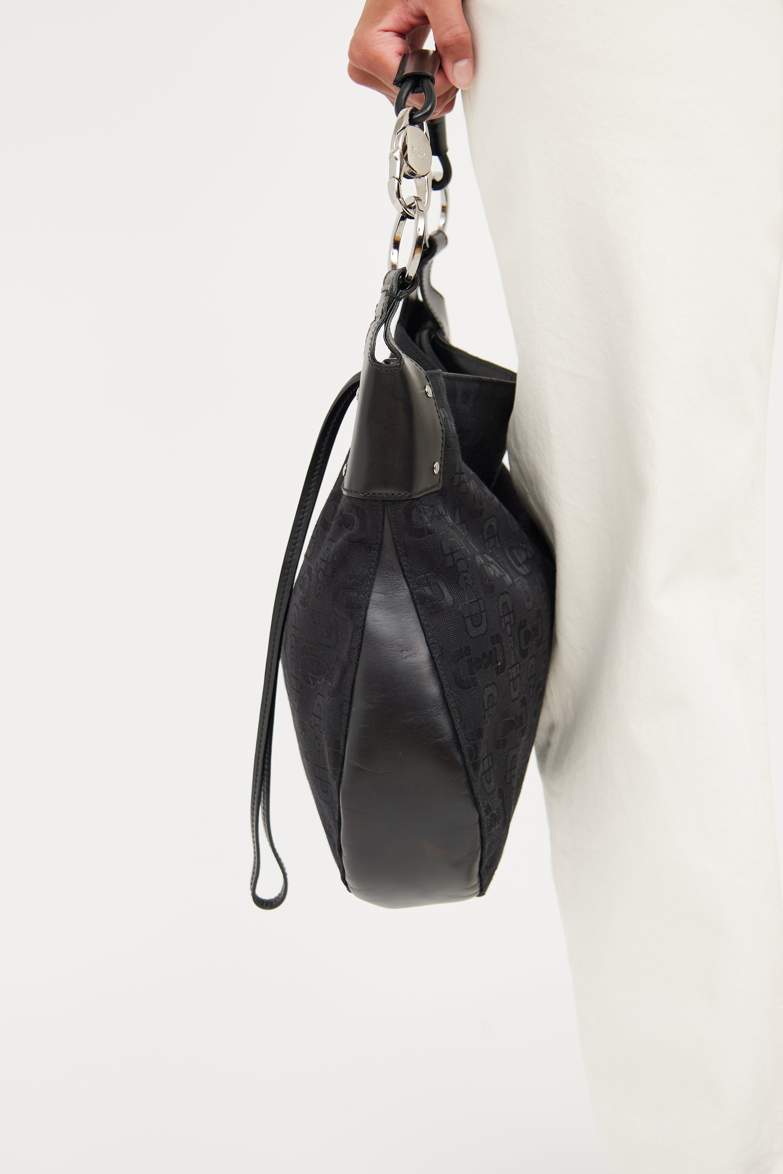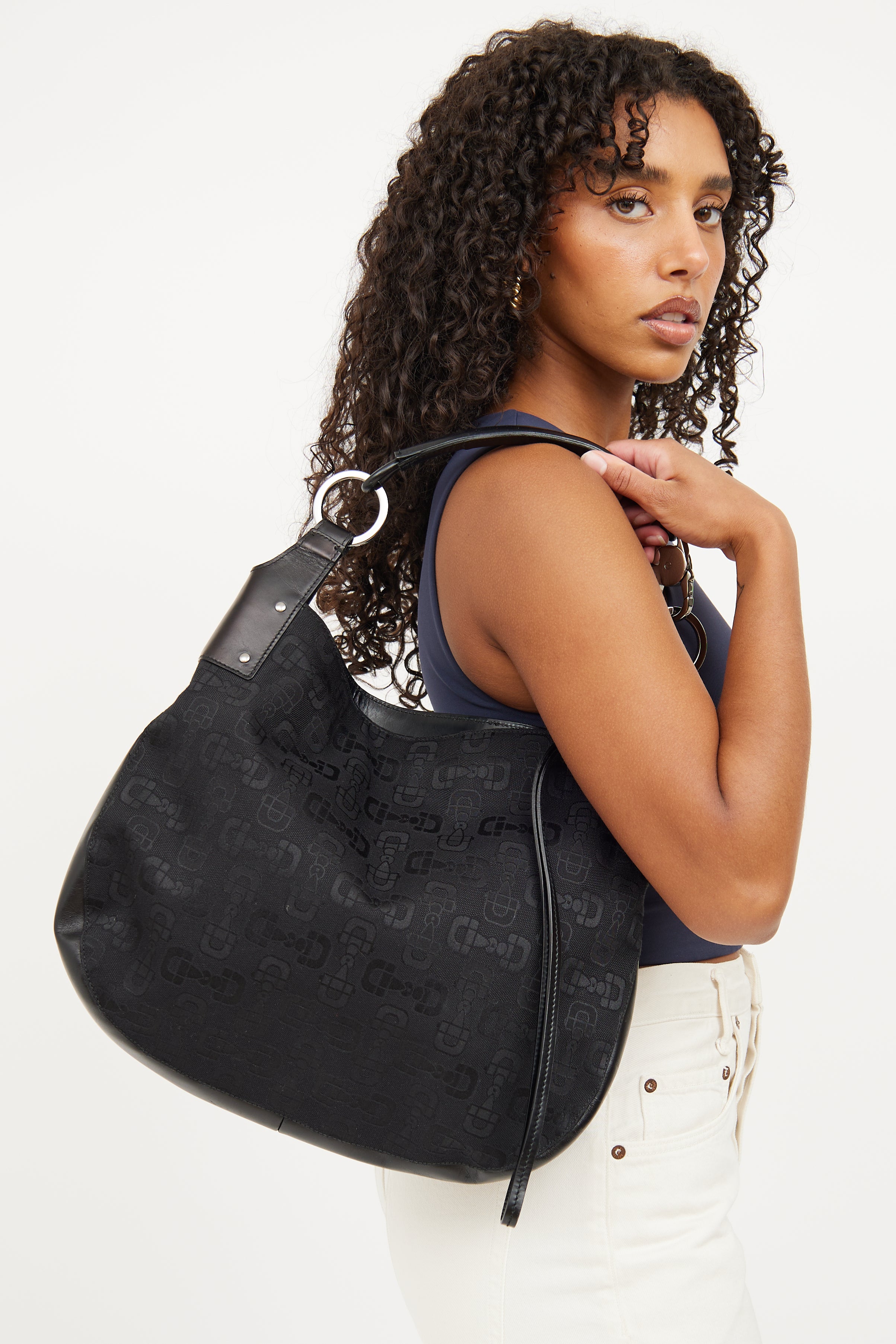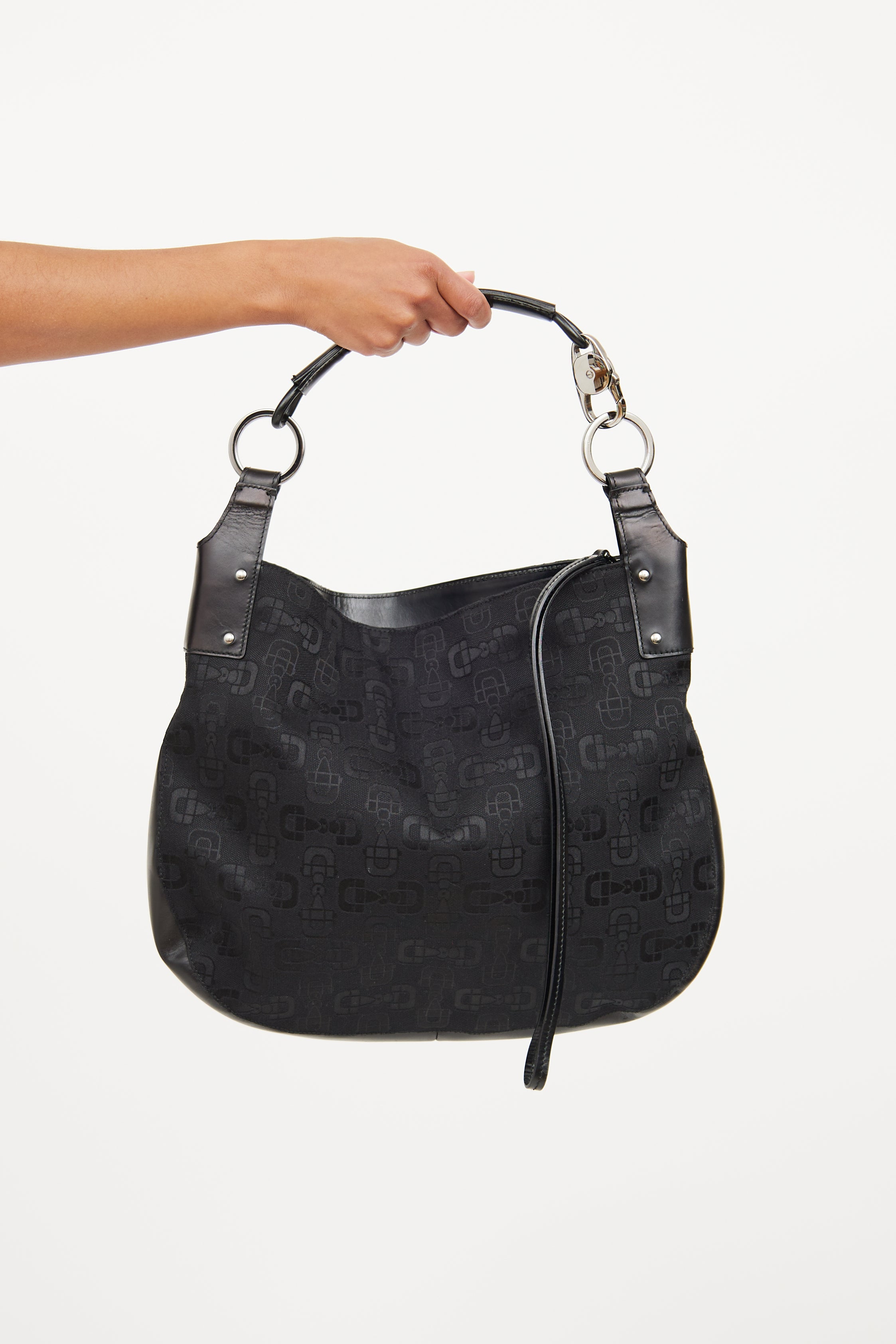 Pre-owned Gucci black canvas Horsebit shoulder bag featuring woven horsebit canvas, black leather trim, gunmetal hardware, rolled single strap with clasp hook, two separate interior compartments, one zipper divider pocket with long leather pull and one zip pocket.