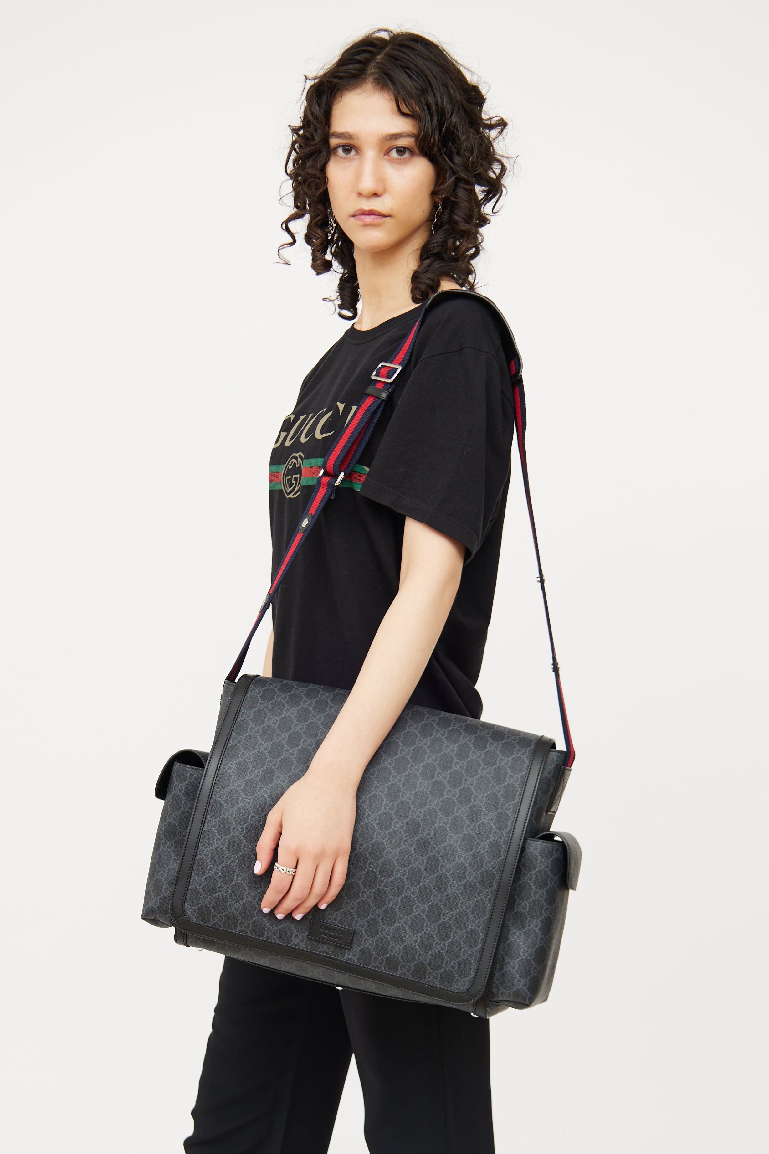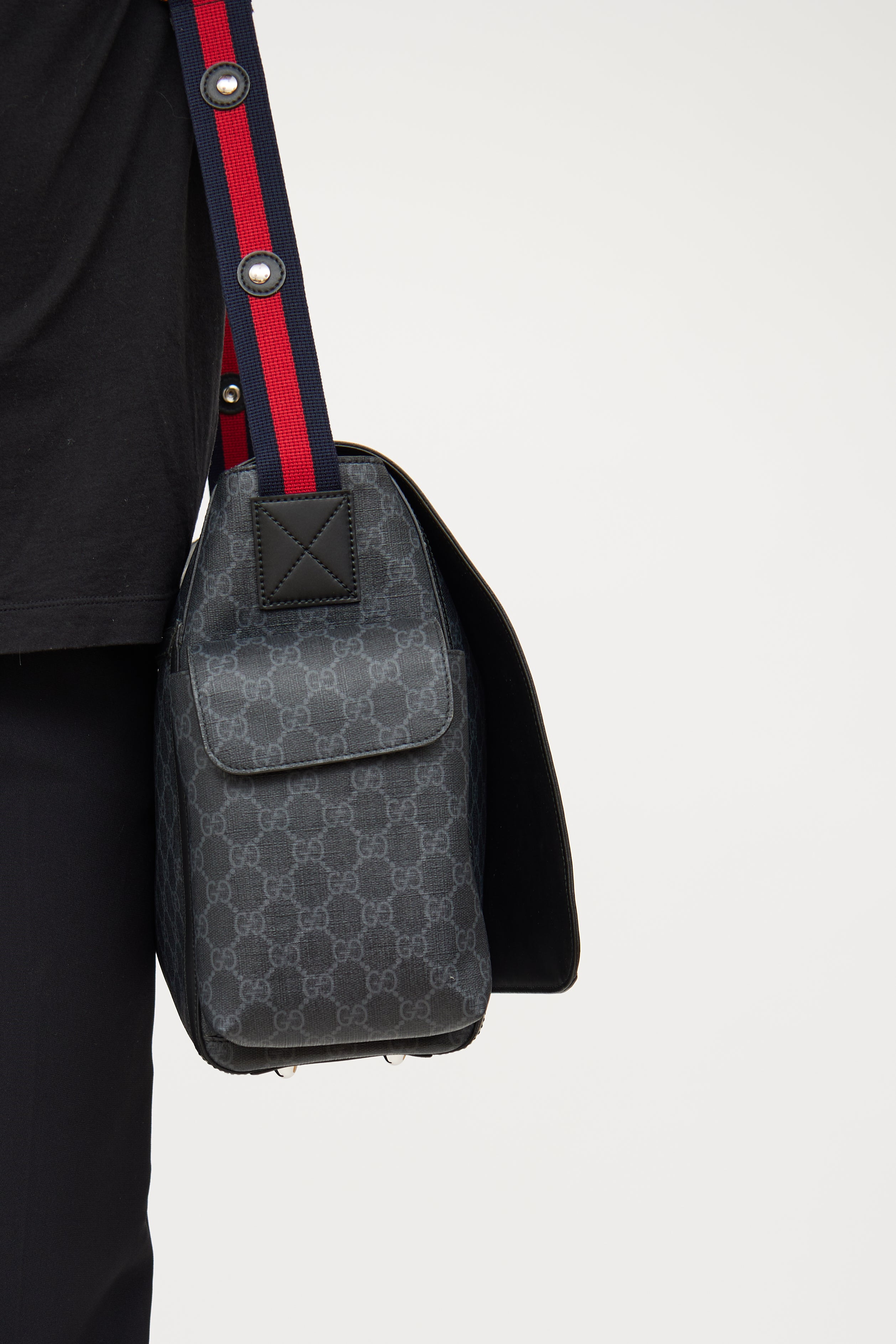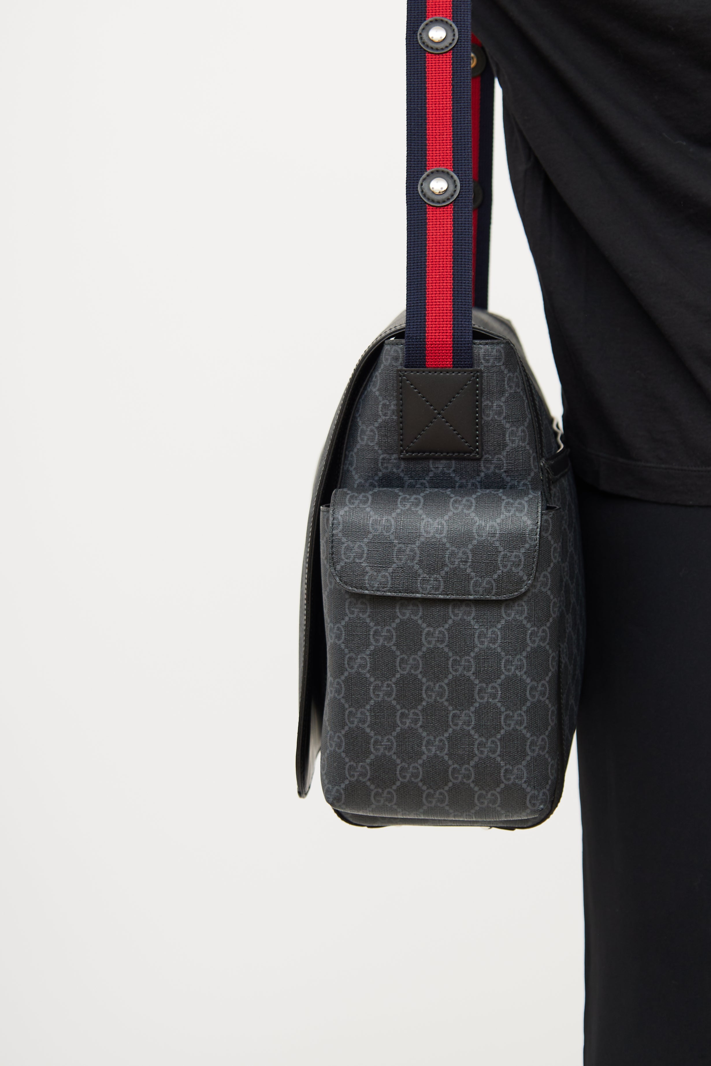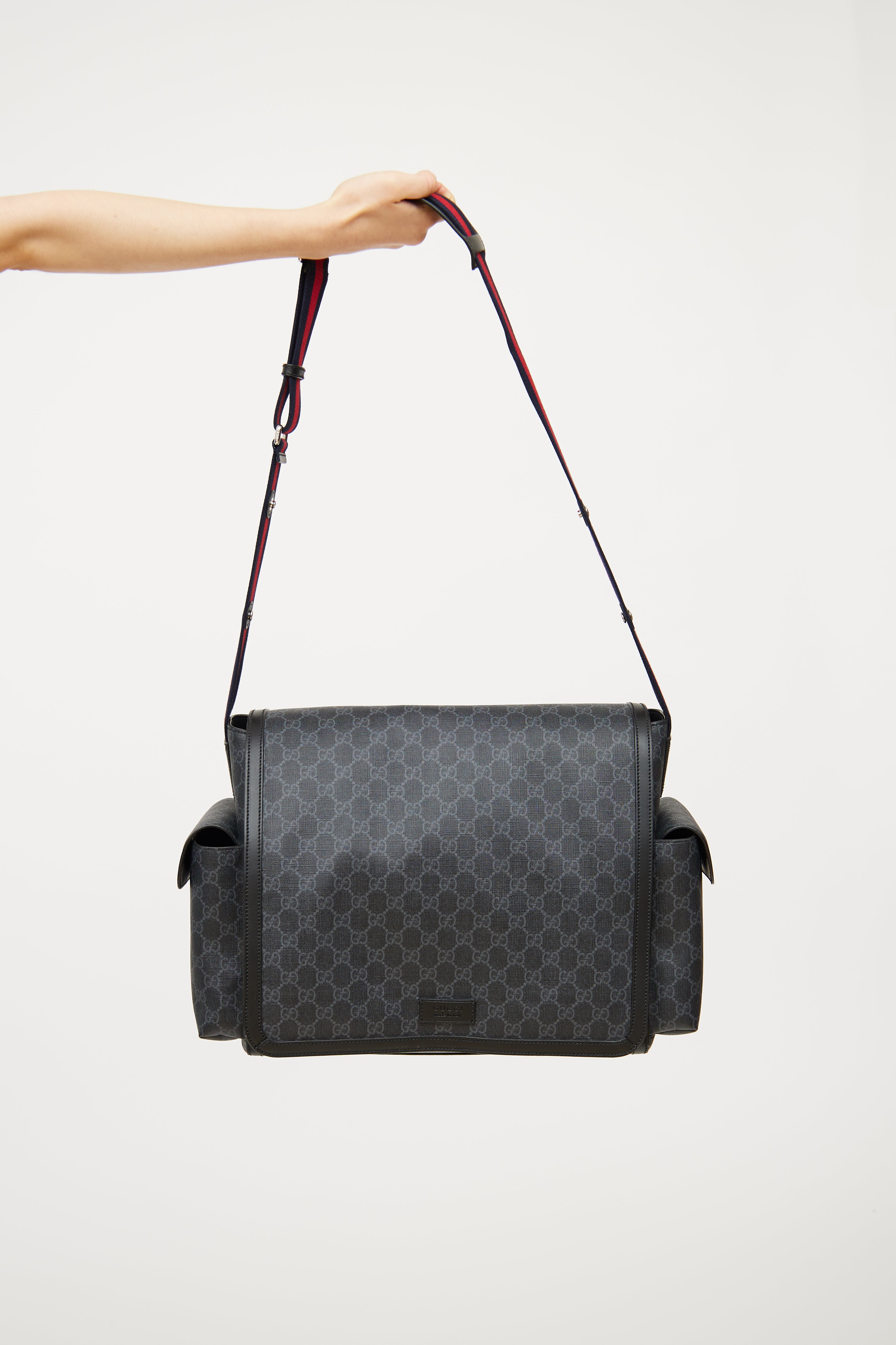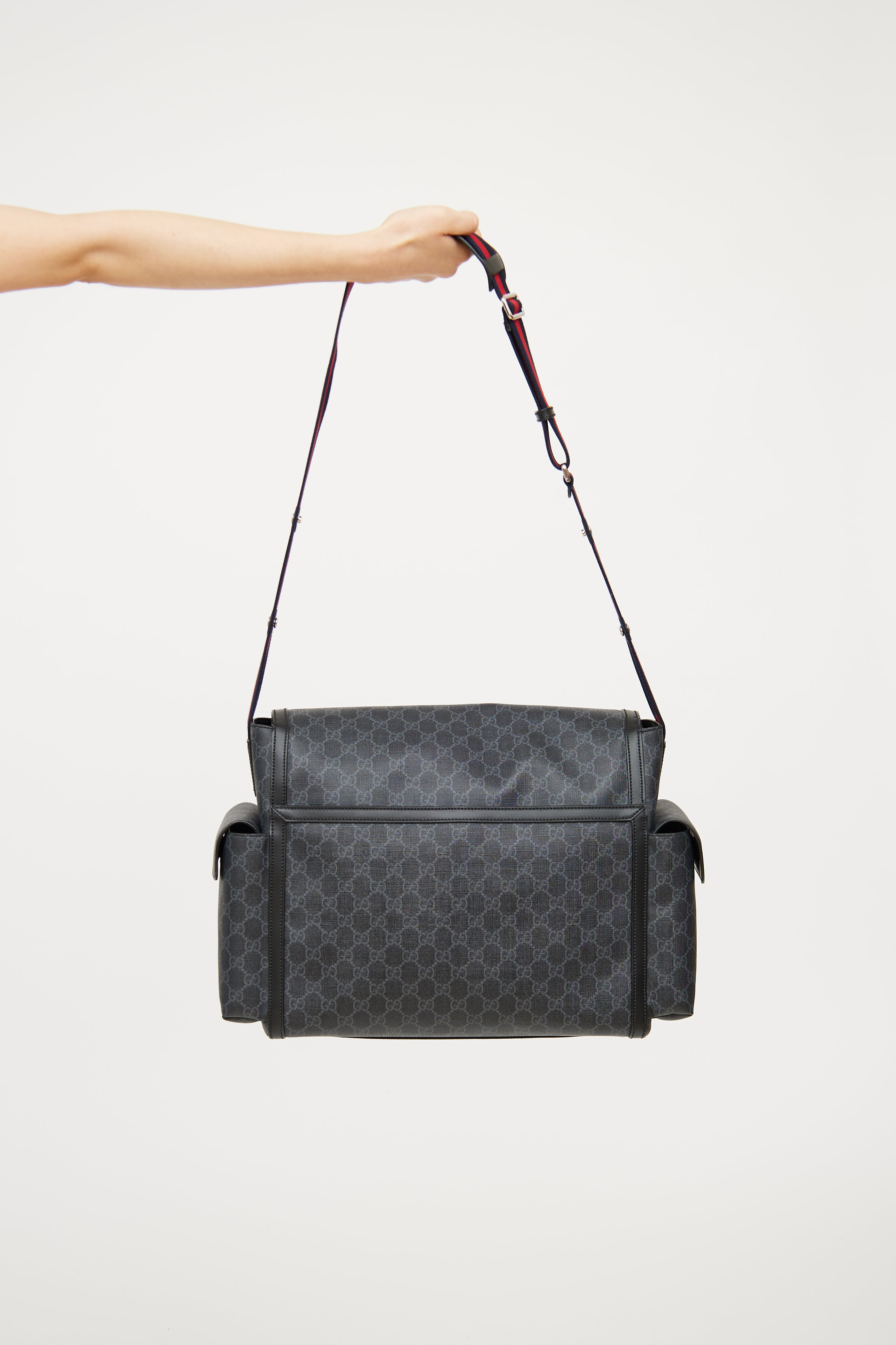 Pre-owned Gucci GG Supreme diaper bag featuring GG monogram motif, red and blue webbed adjustable strap with black leather comfort pad, two side pockets with magnetic closure, flap front with magnetic closure and embossed leather tag at front with Gucci logo, pocket at back, and silver tone hardware with protective feet at bottom. Textile lined interior featuring three slip pockets.