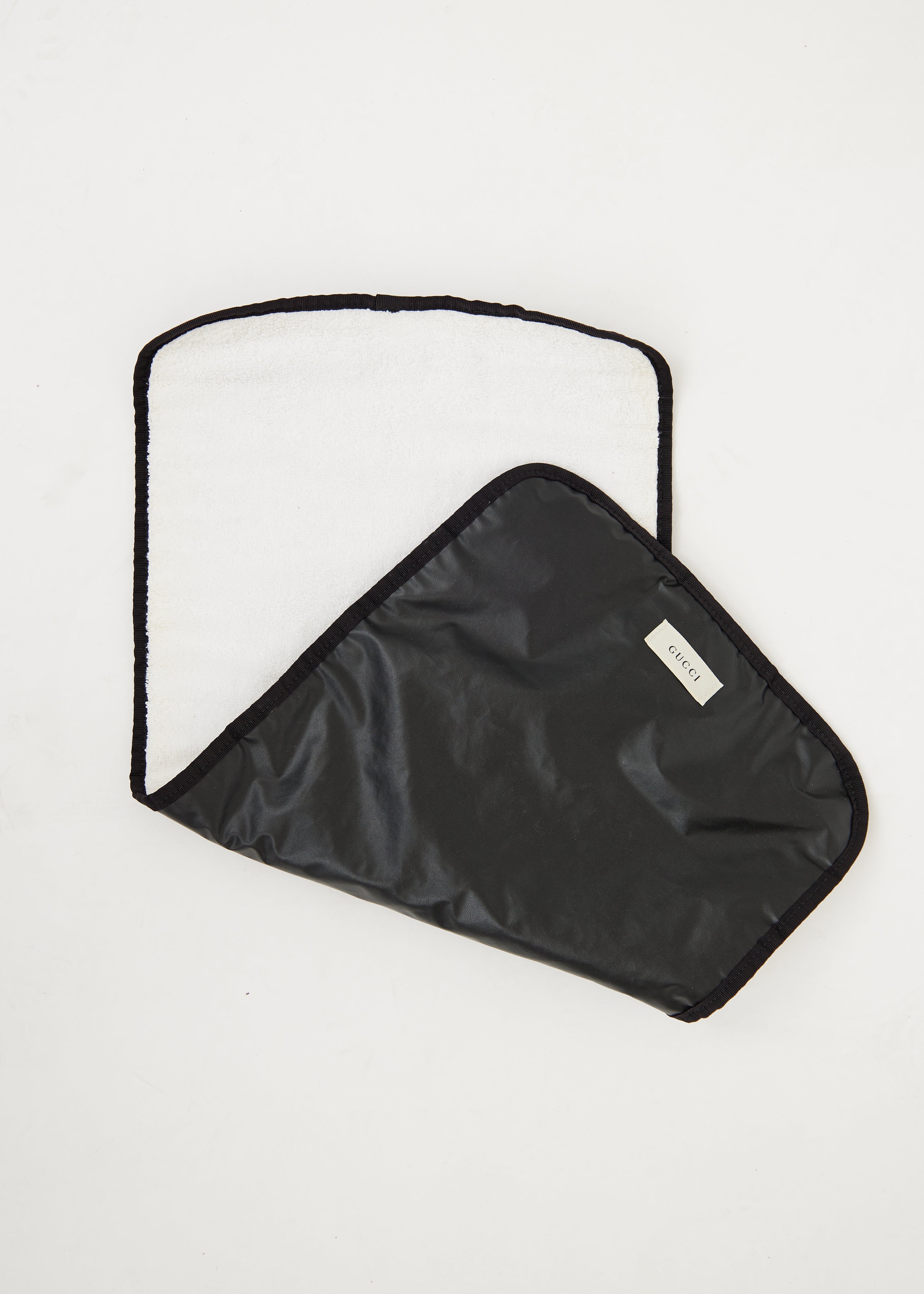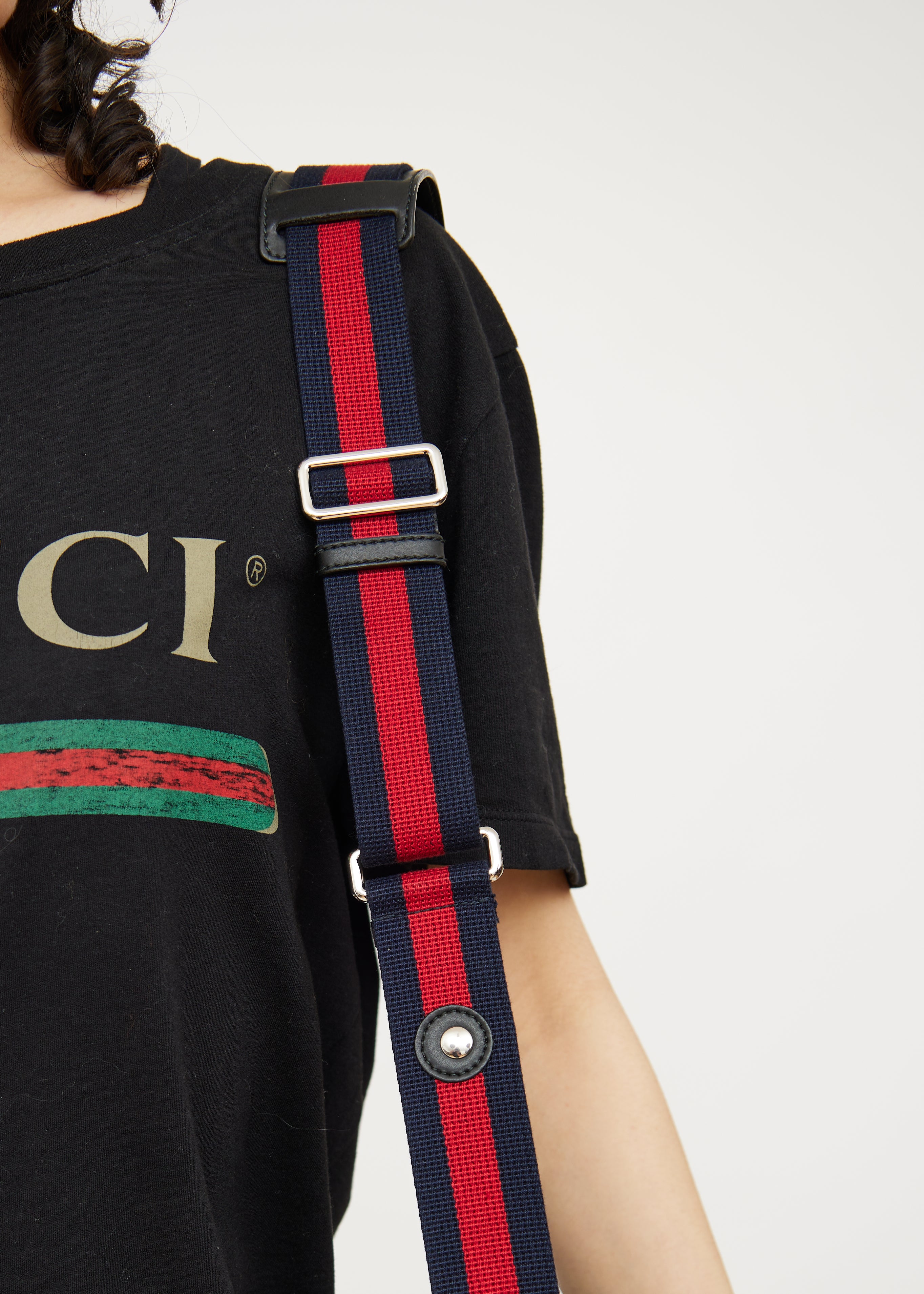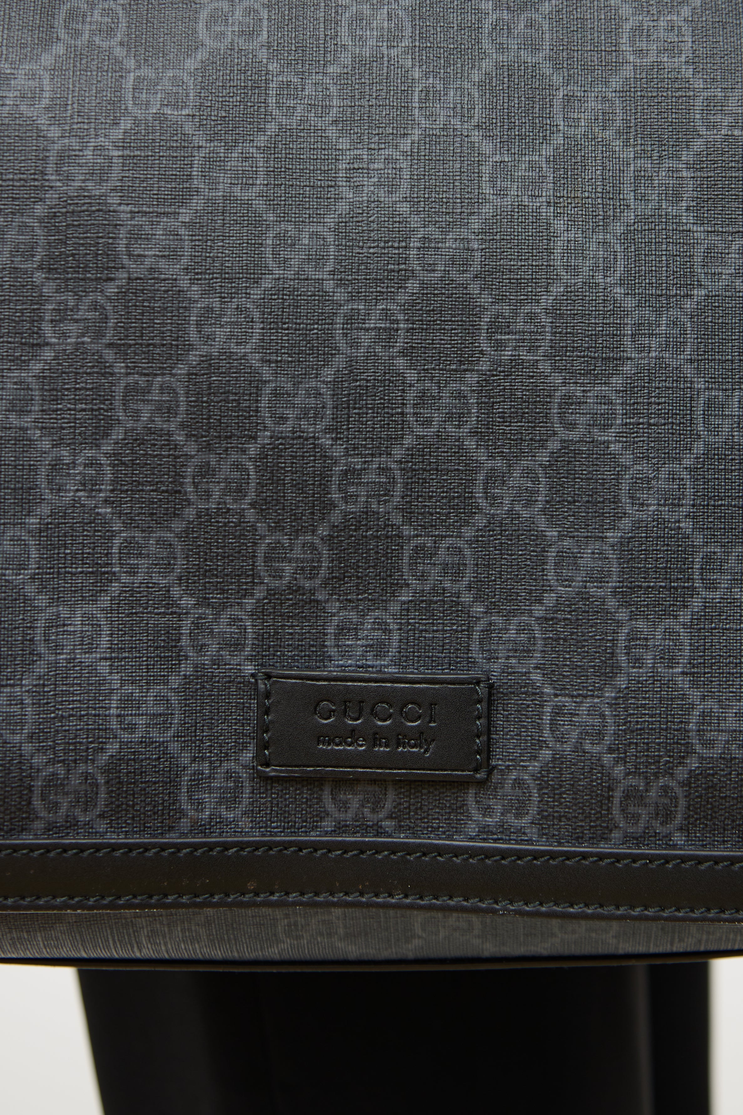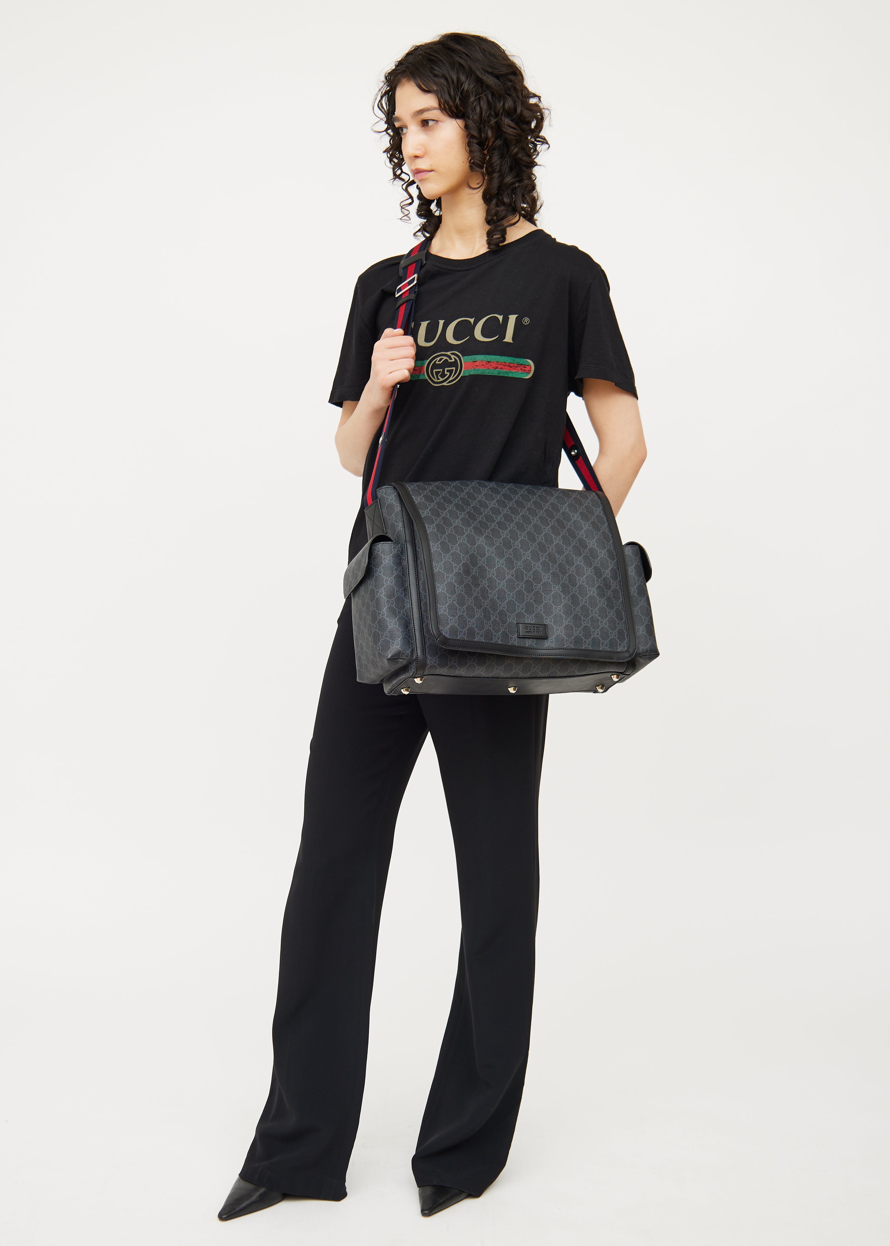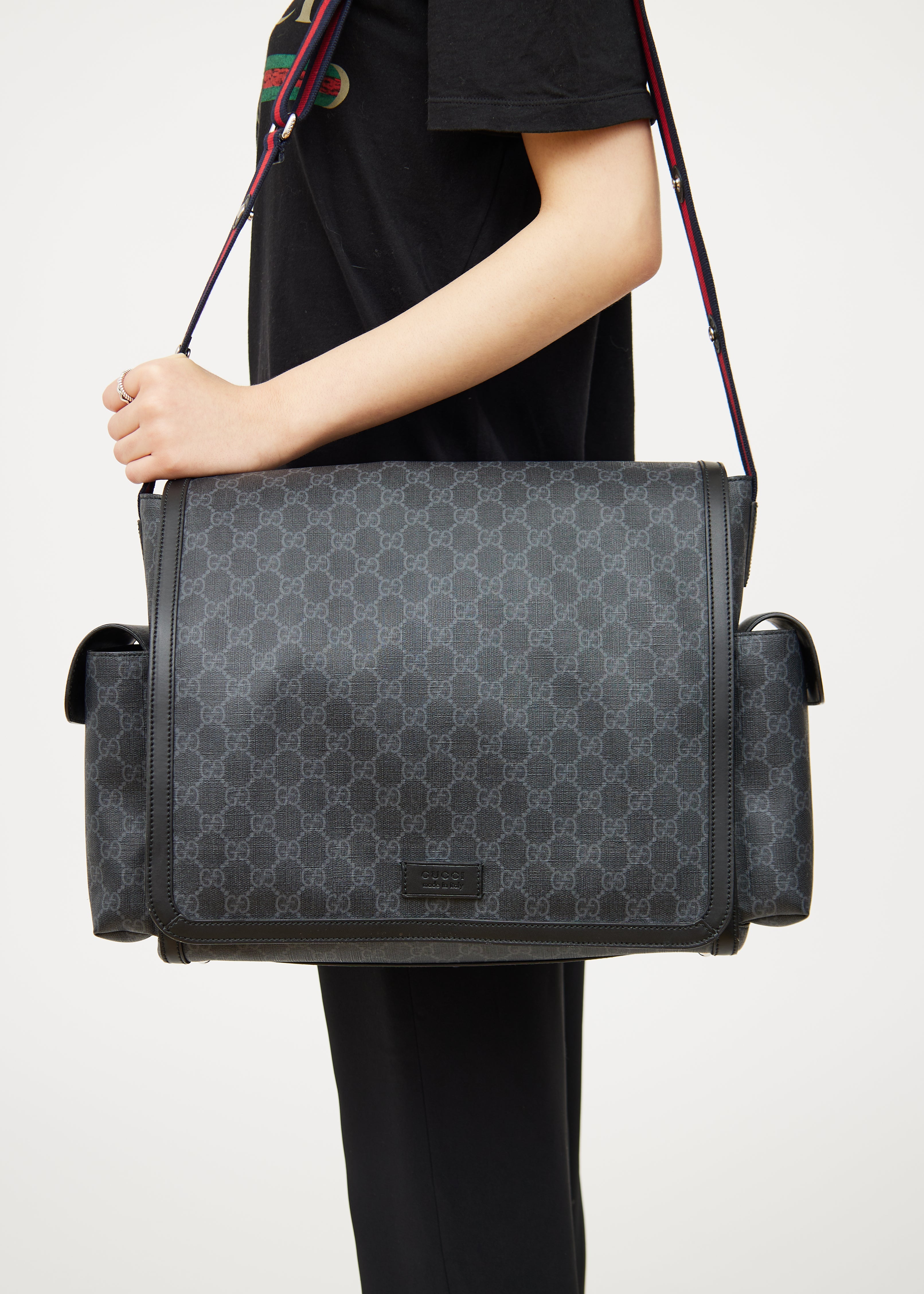 Pre-owned Gucci GG Supreme diaper bag featuring GG monogram motif, red and blue webbed adjustable strap with black leather comfort pad, two side pockets with magnetic closure, flap front with magnetic closure and embossed leather tag at front with Gucci logo, pocket at back, and silver tone hardware with protective feet at bottom. Textile lined interior featuring three slip pockets.