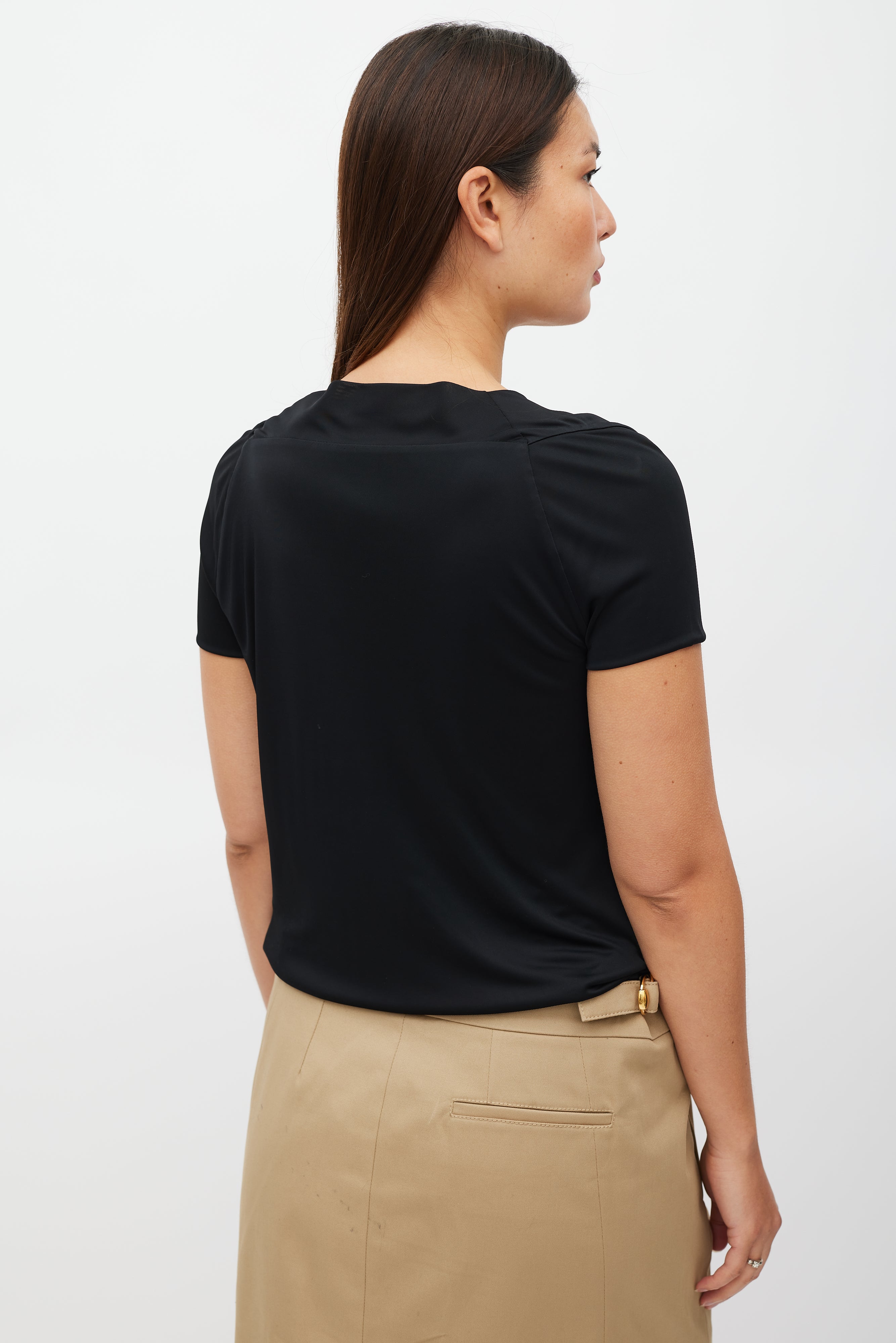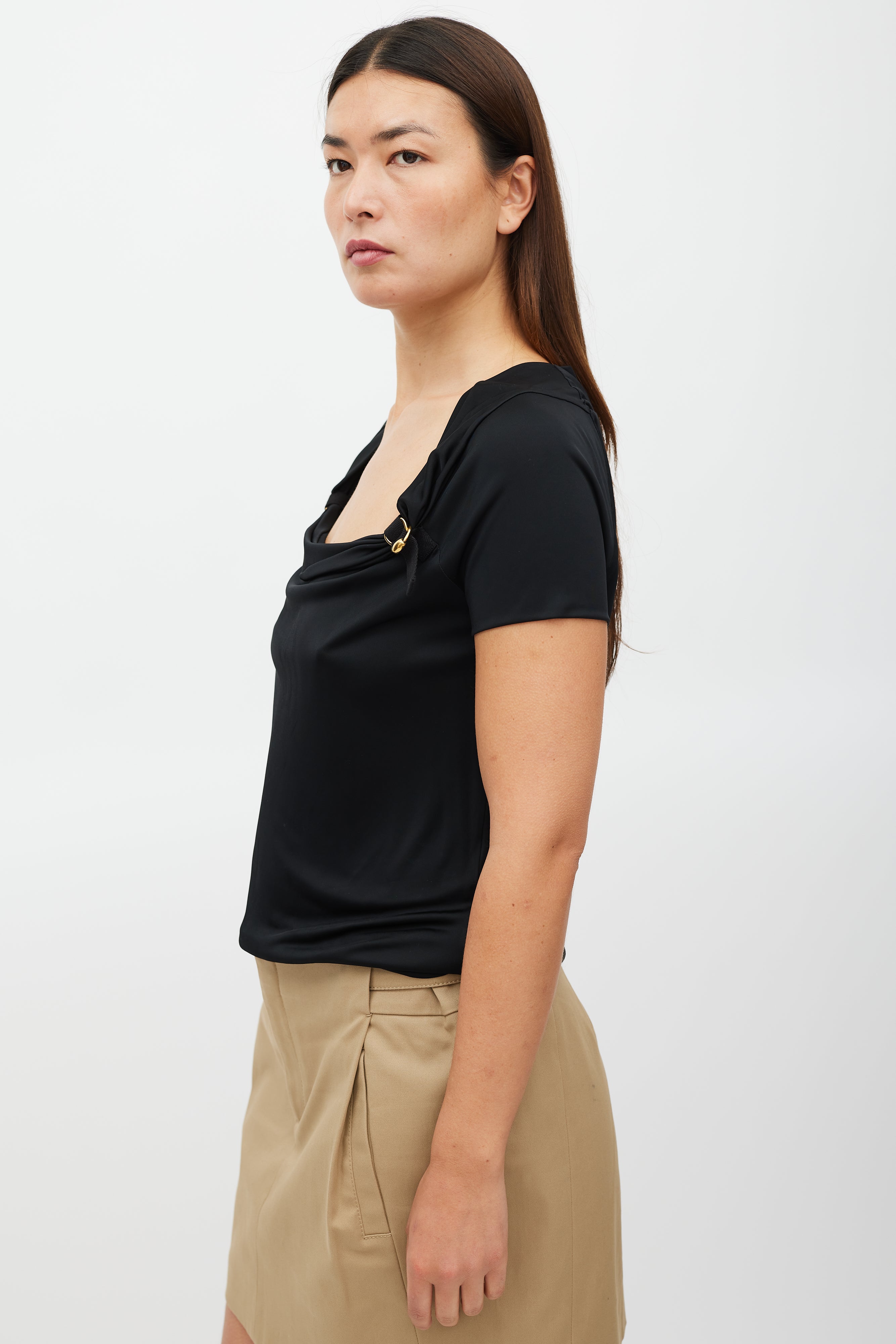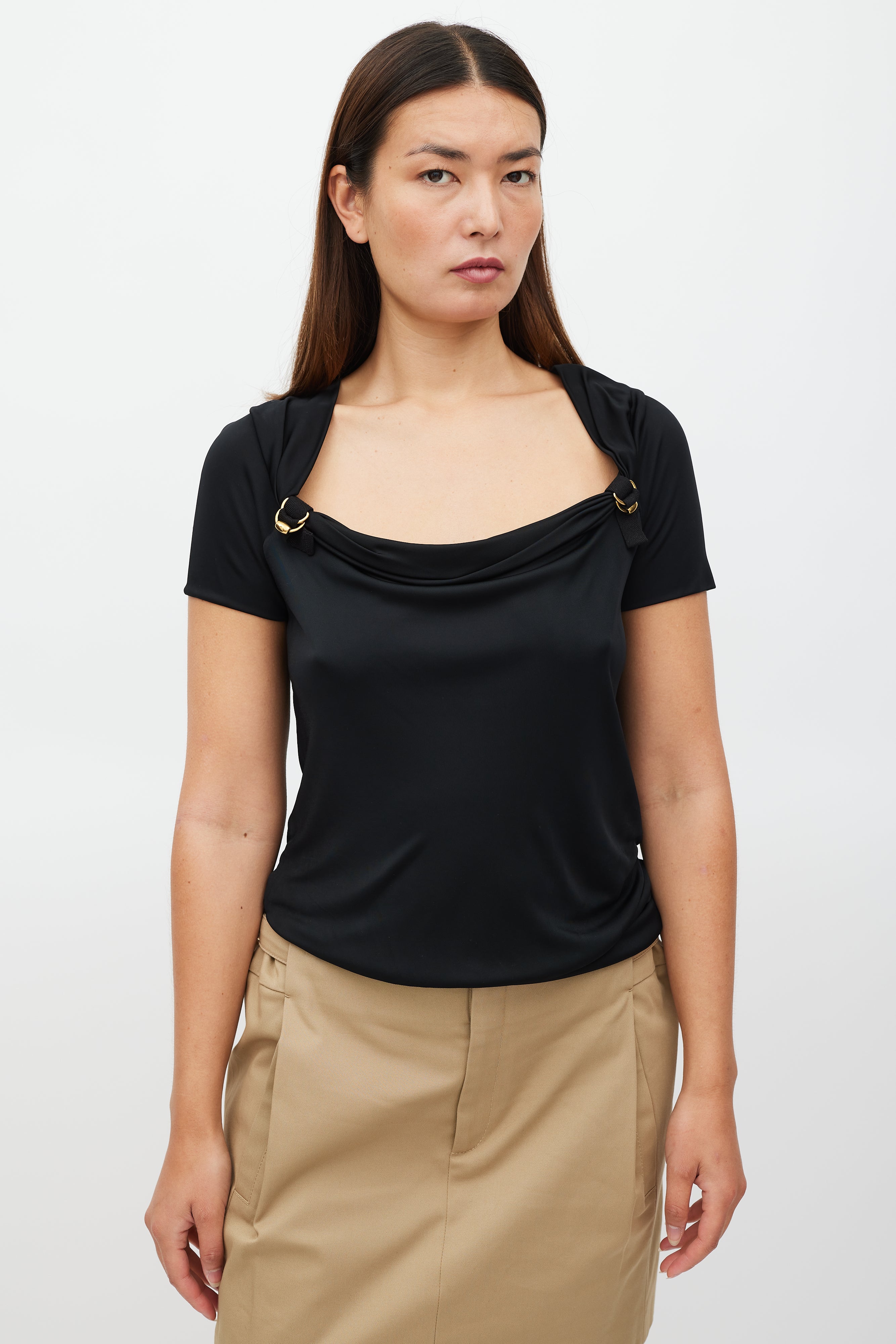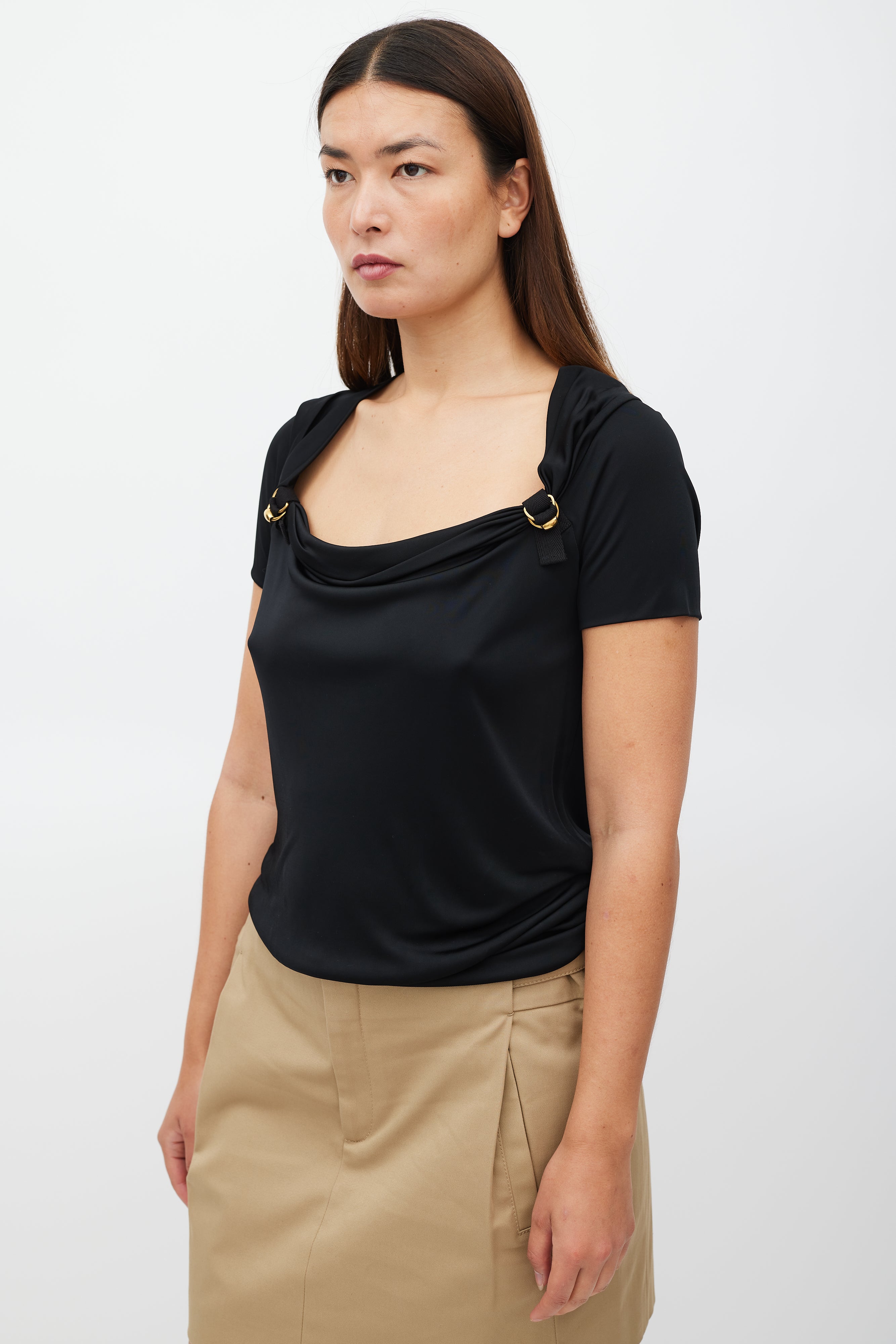 Pre-owned Gucci black top featuring a cowl neck with gold tone D-ring hardware side detailing, short sleeves, and band at waist. Tom Ford era design.