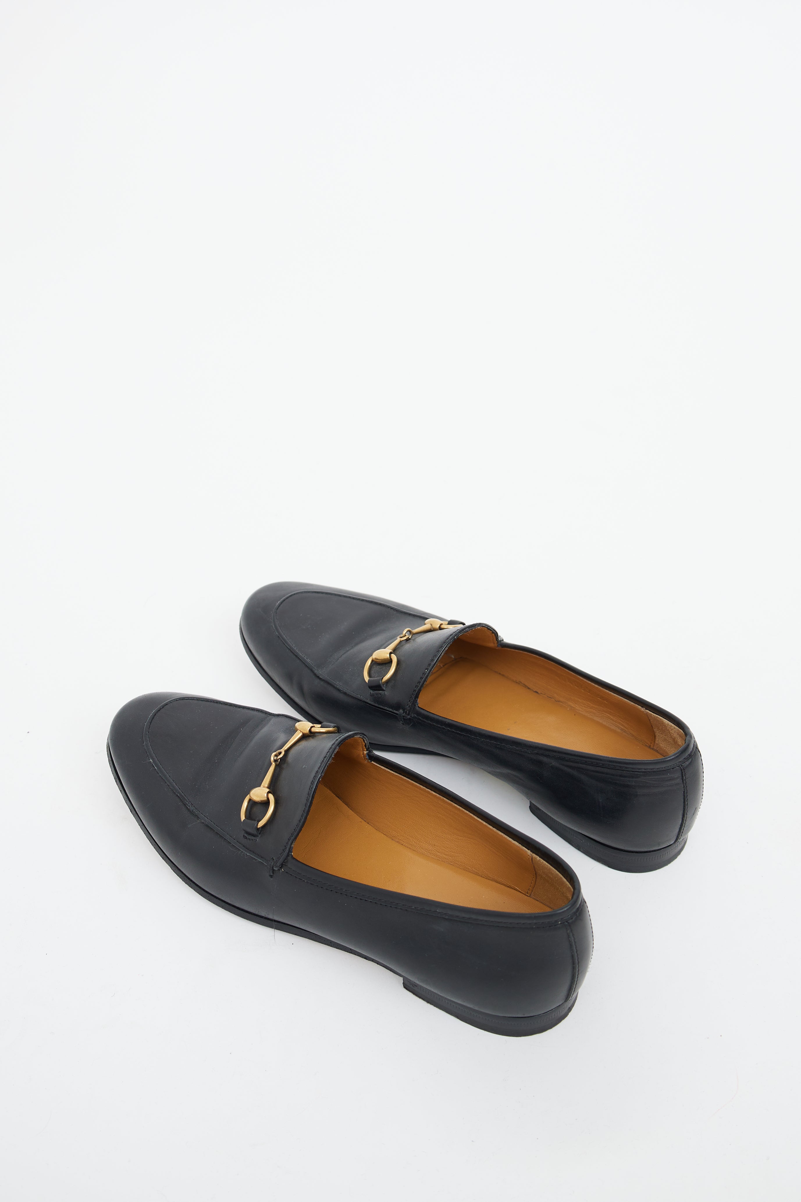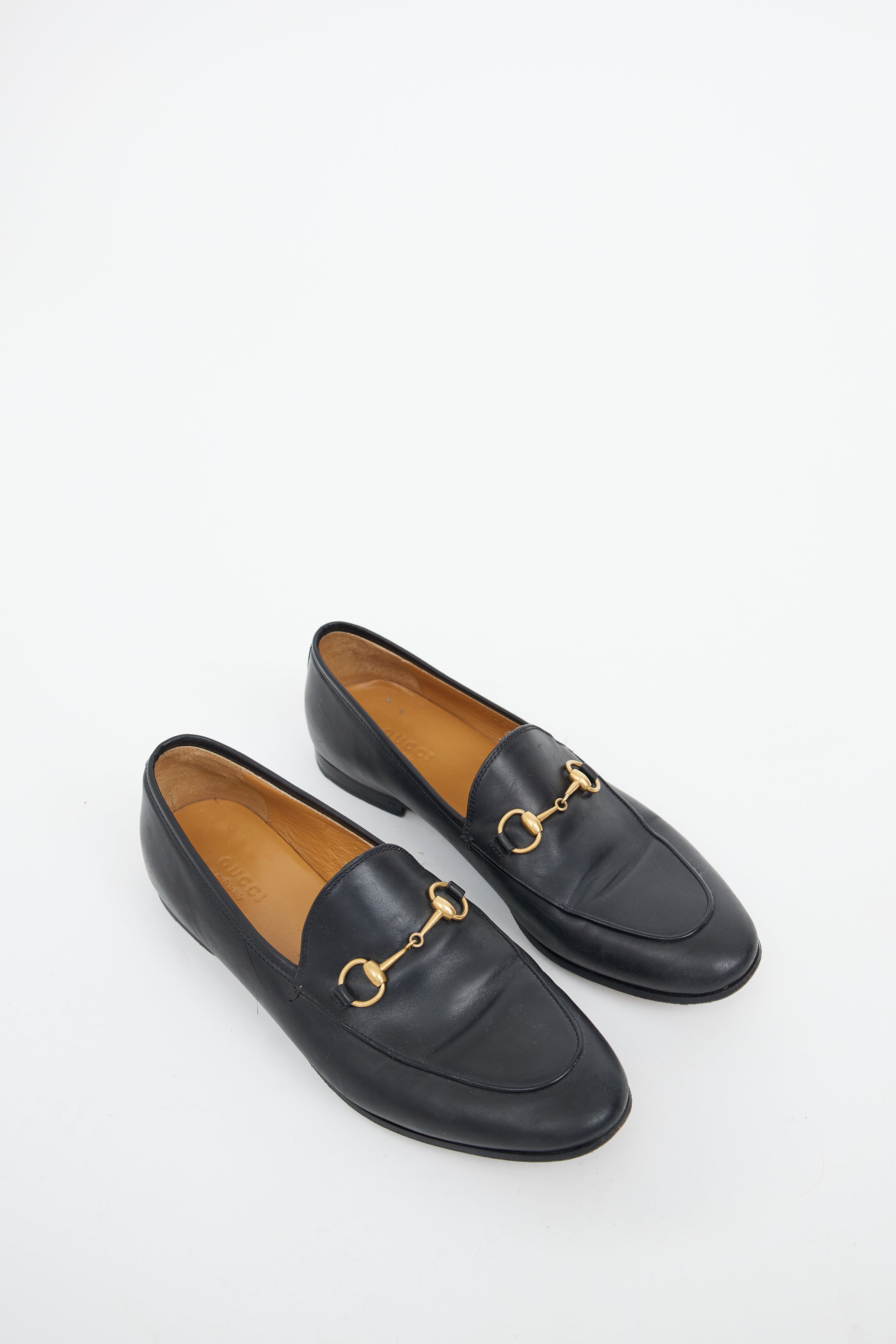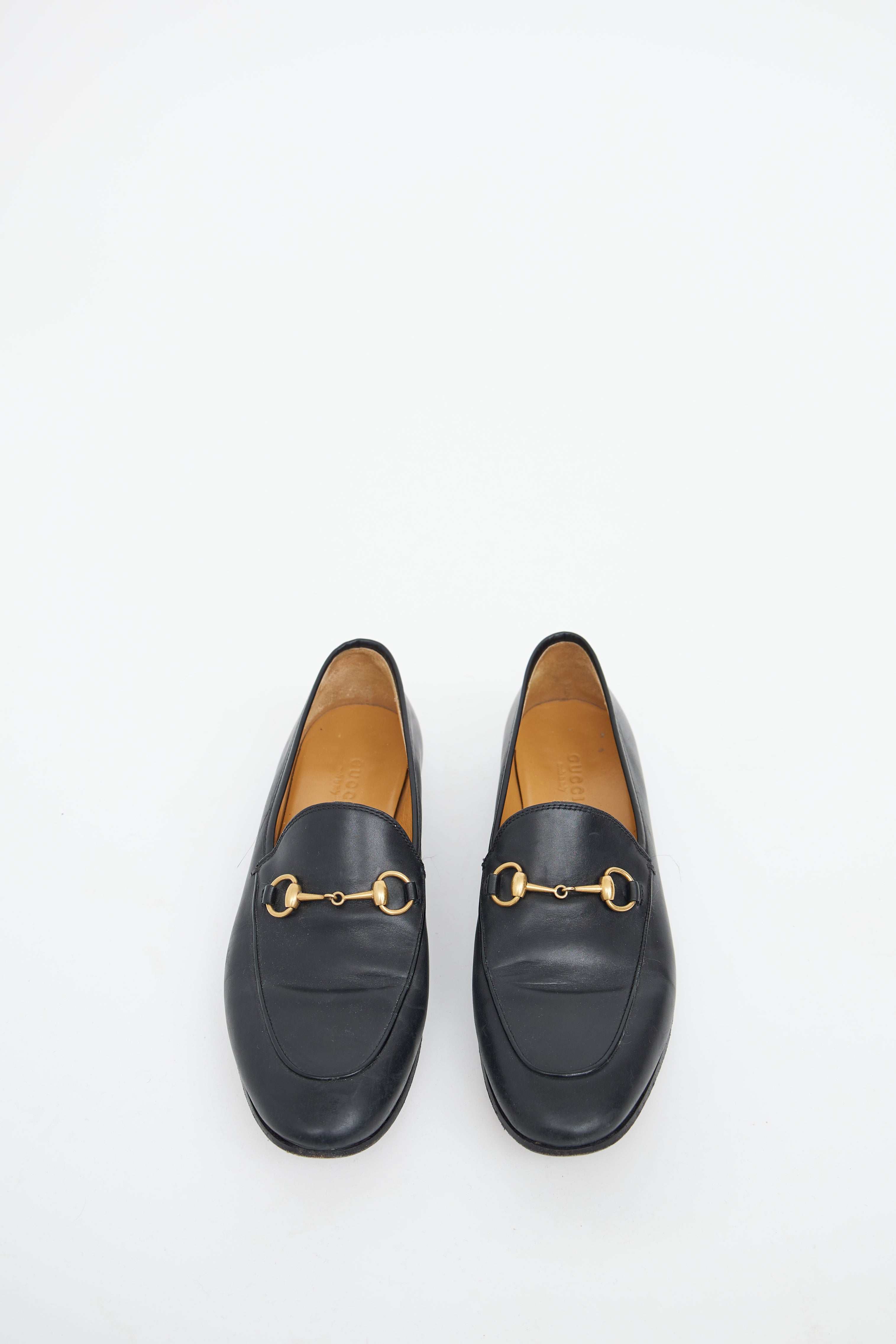 Pre-owned Gucci black leather Jordaan loafers featuring almond toe, gold tone horsebit detail on upper and covered block heel.