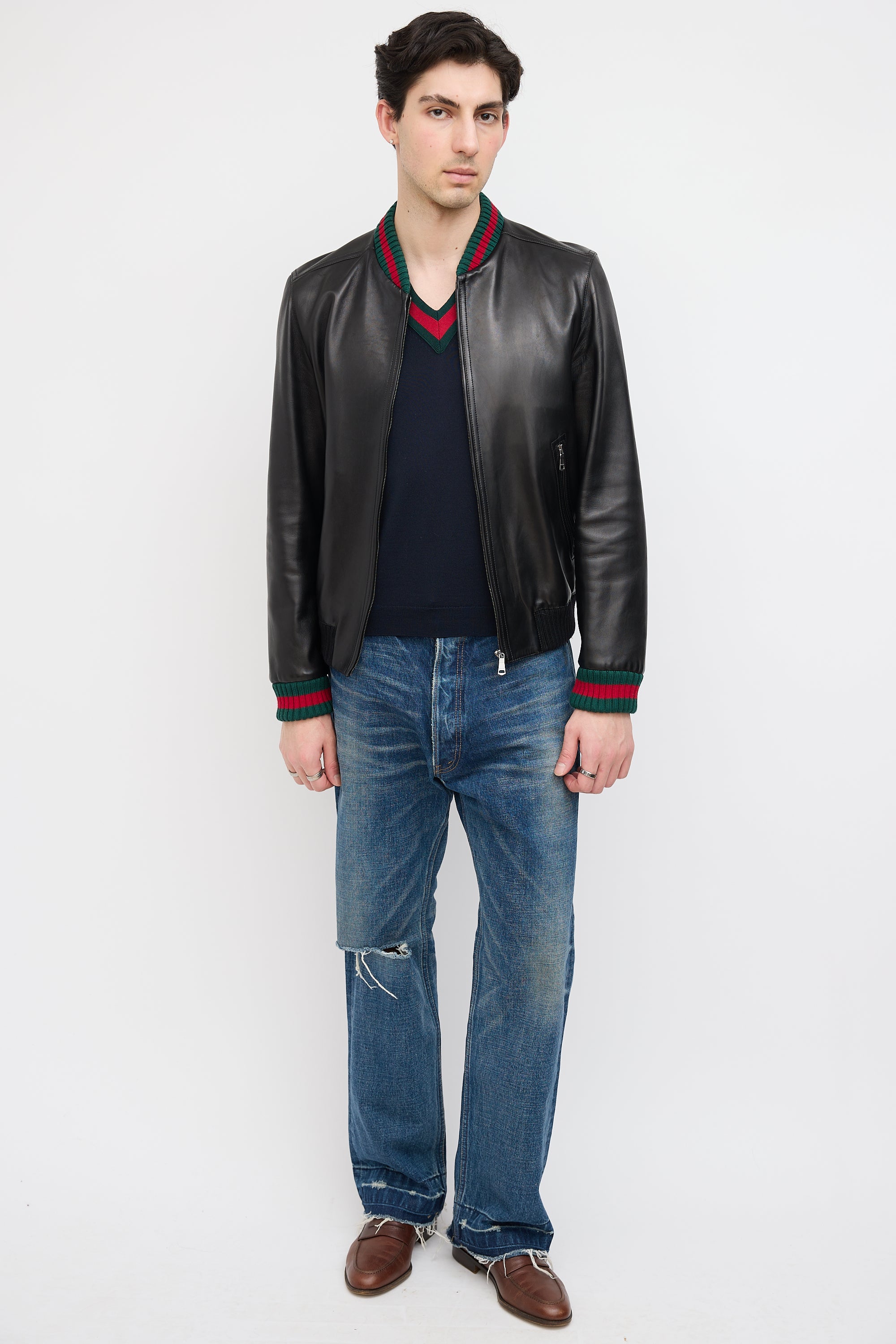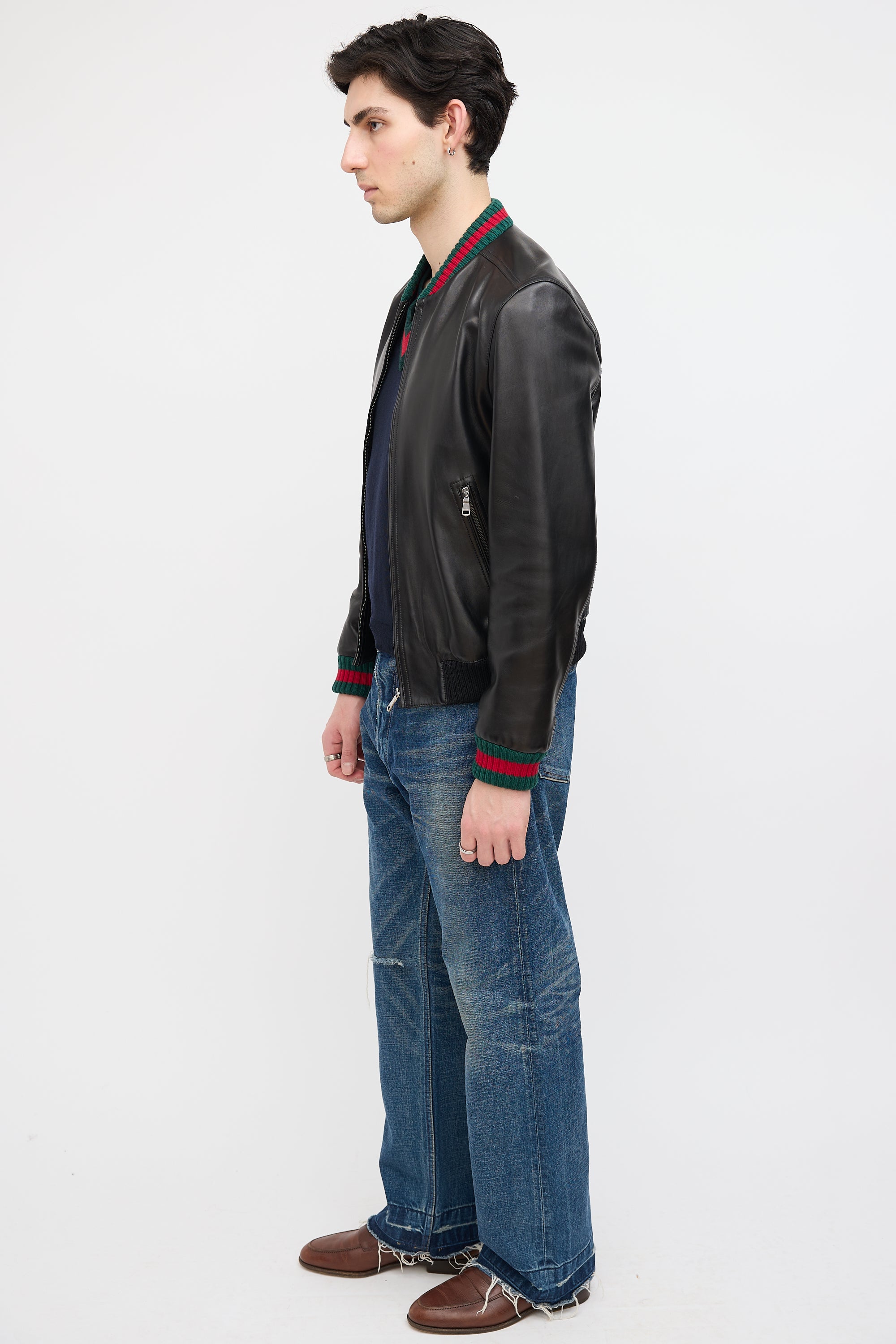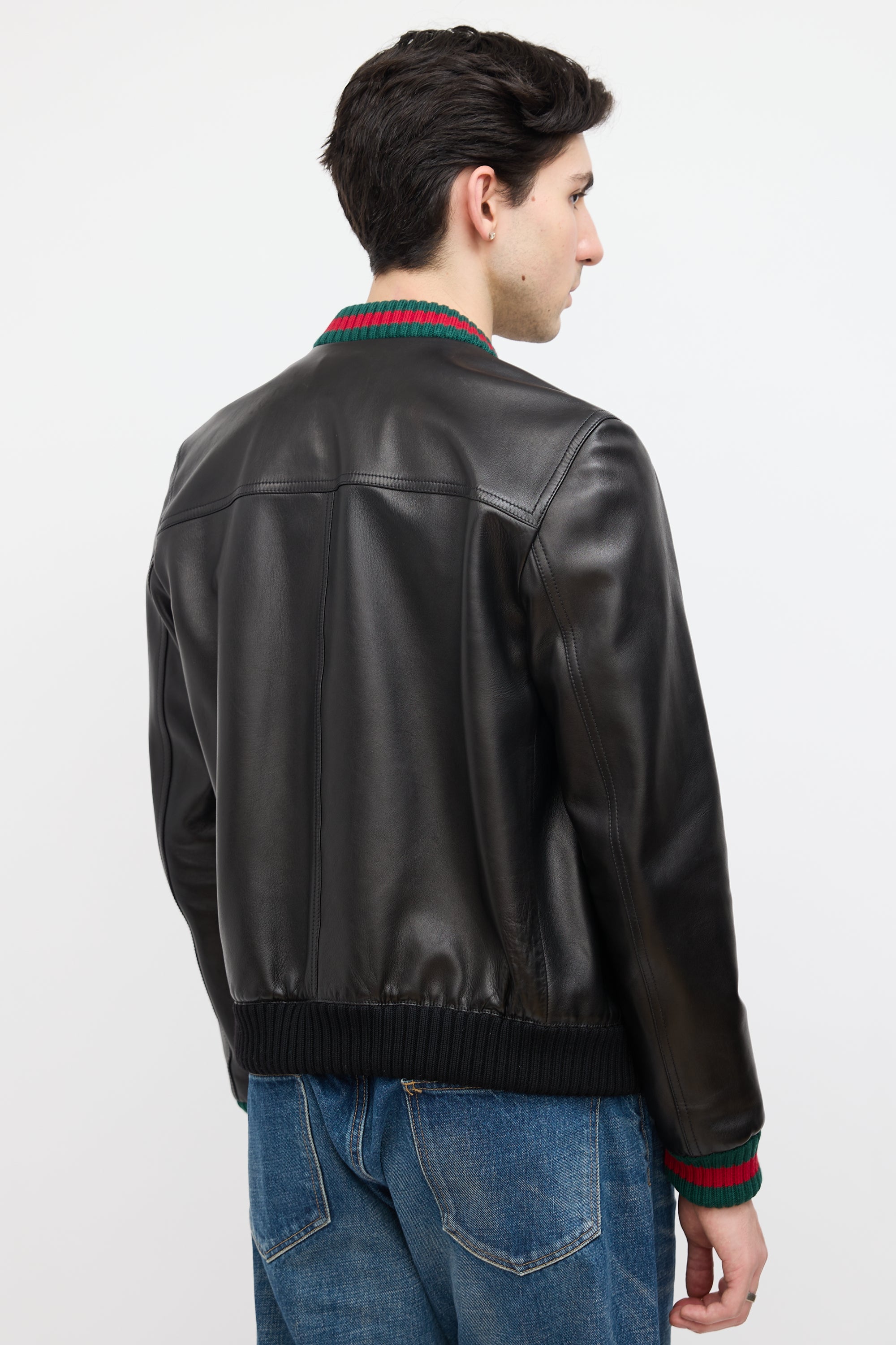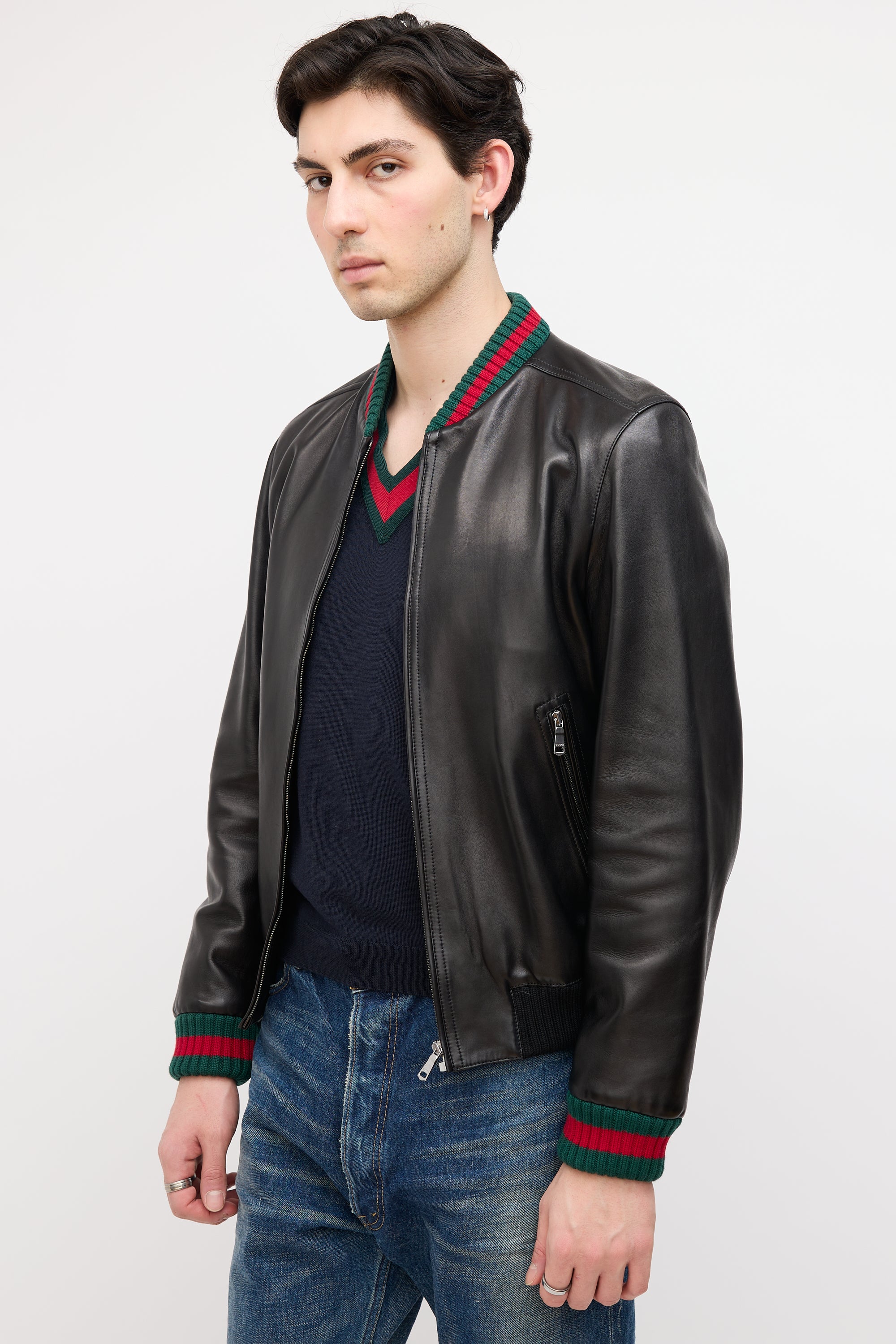 Pre-owned Gucci black leather bomber jacket featuring green and red web stand collar and cuffs, zip up front, two zip pockets at waist, one interior welt pocket, and tonal ribbed hem.