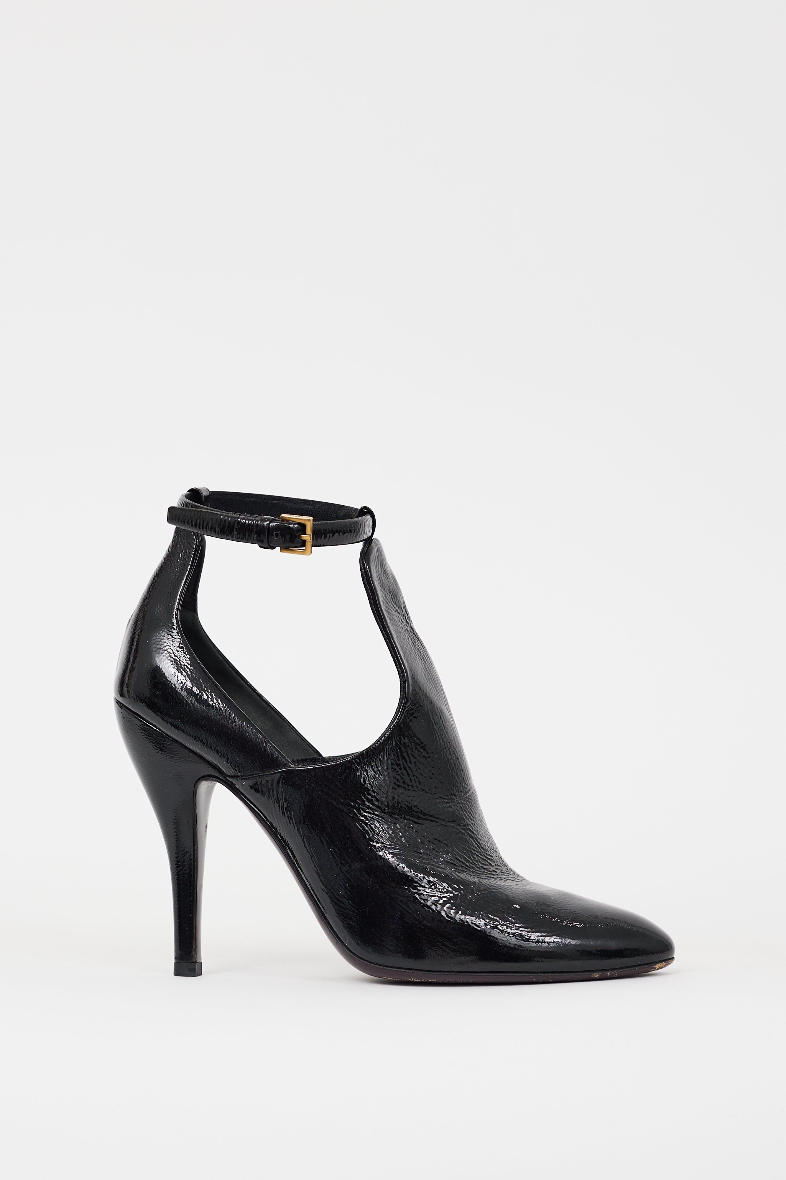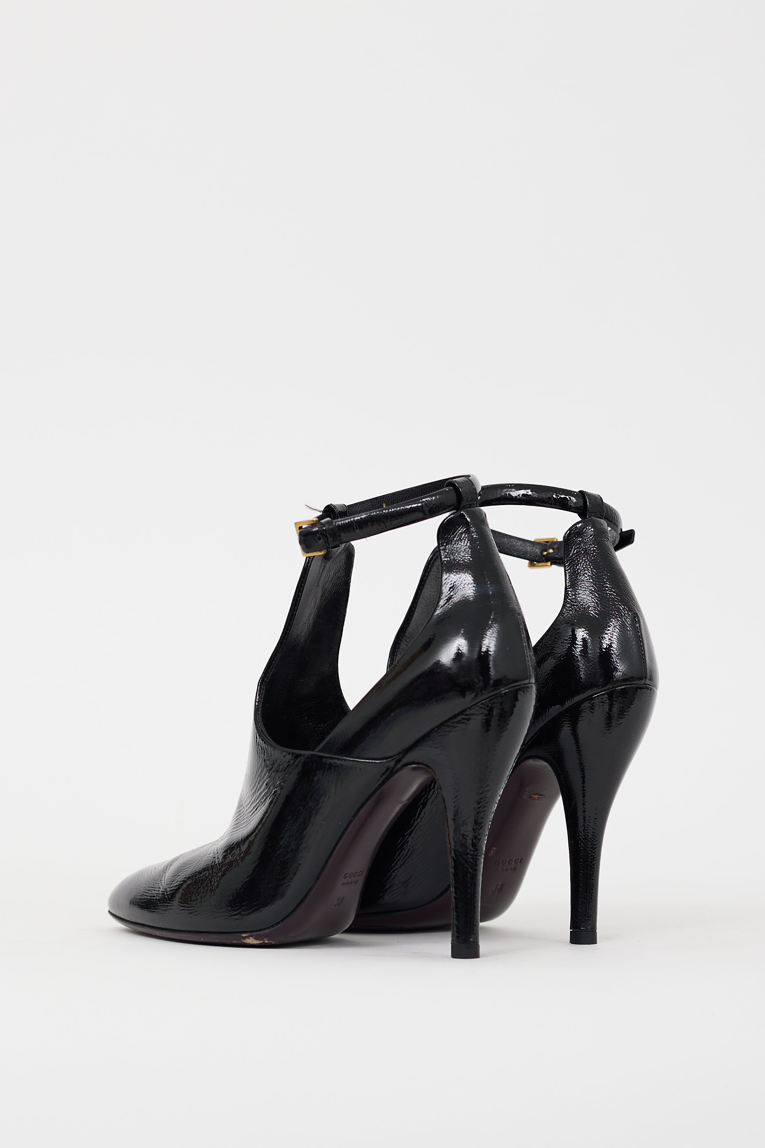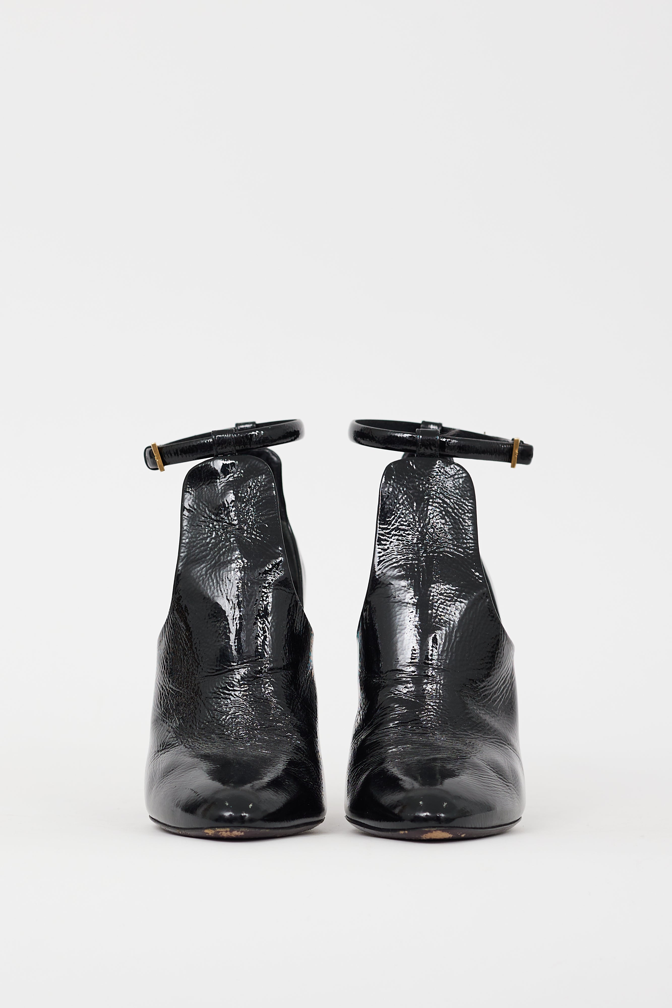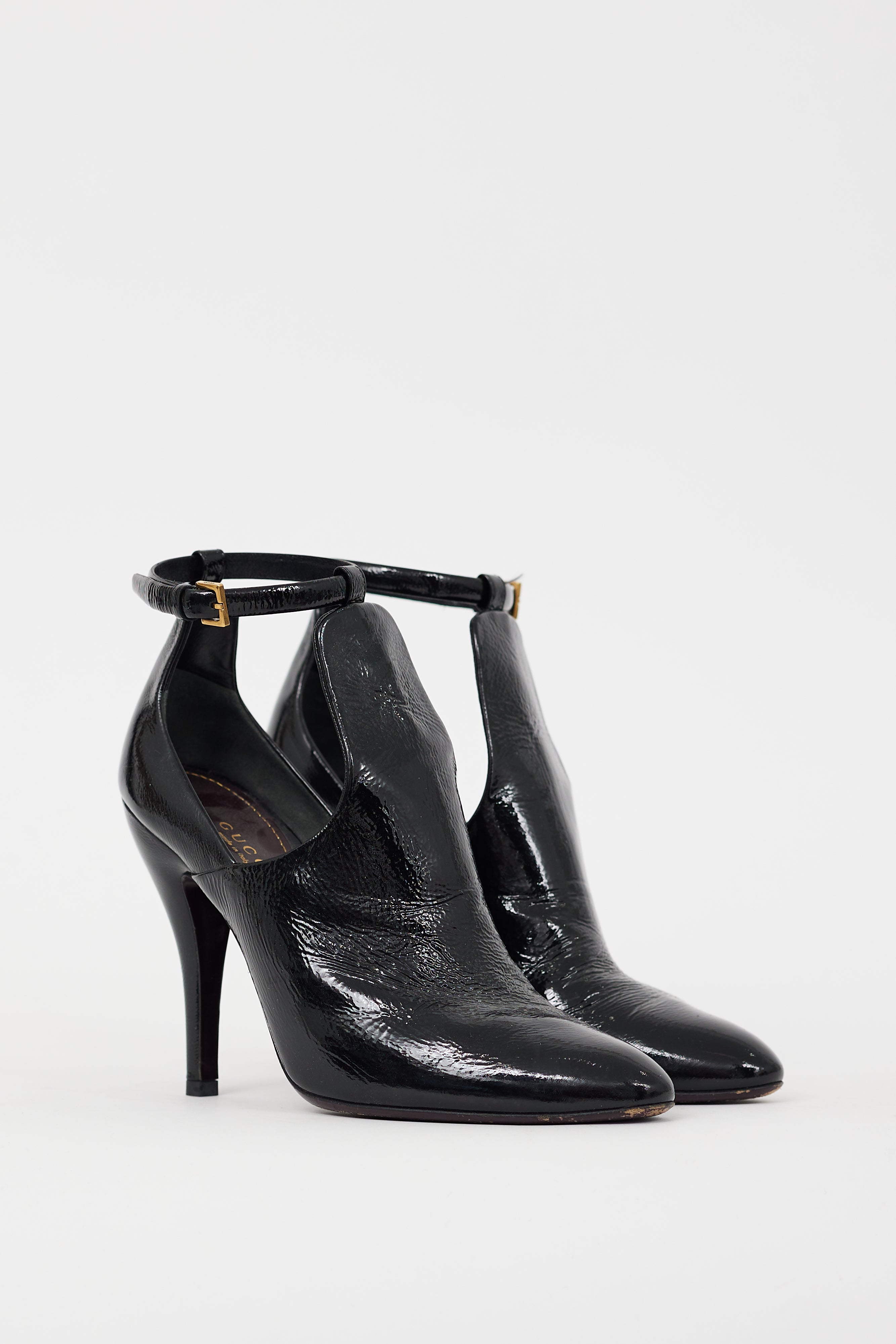 Pre-owned Gucci black patent leather boots featuring a pointed toe, wrapped stiletto heel, cut outs at side, and adjustable strap at ankle.