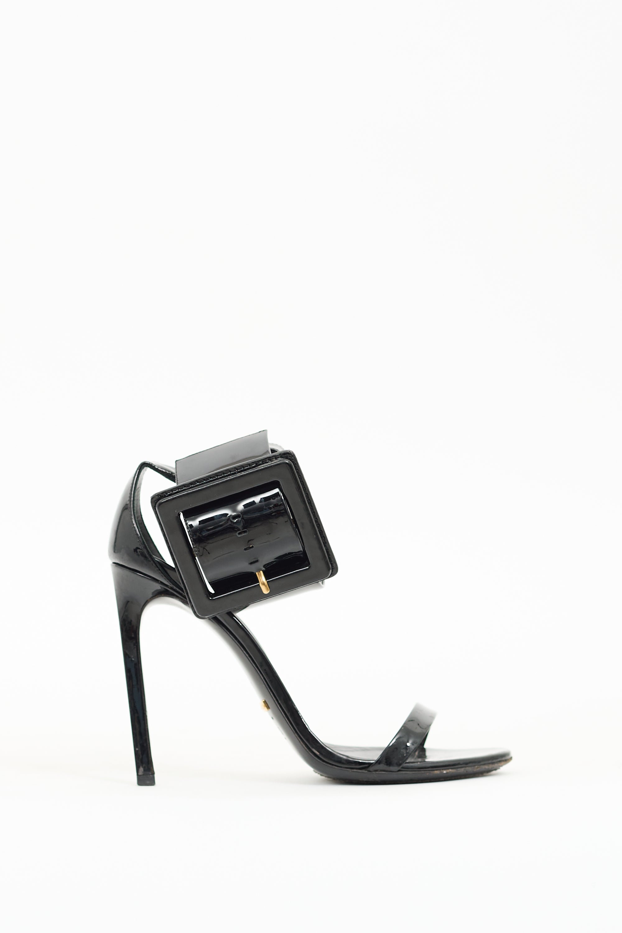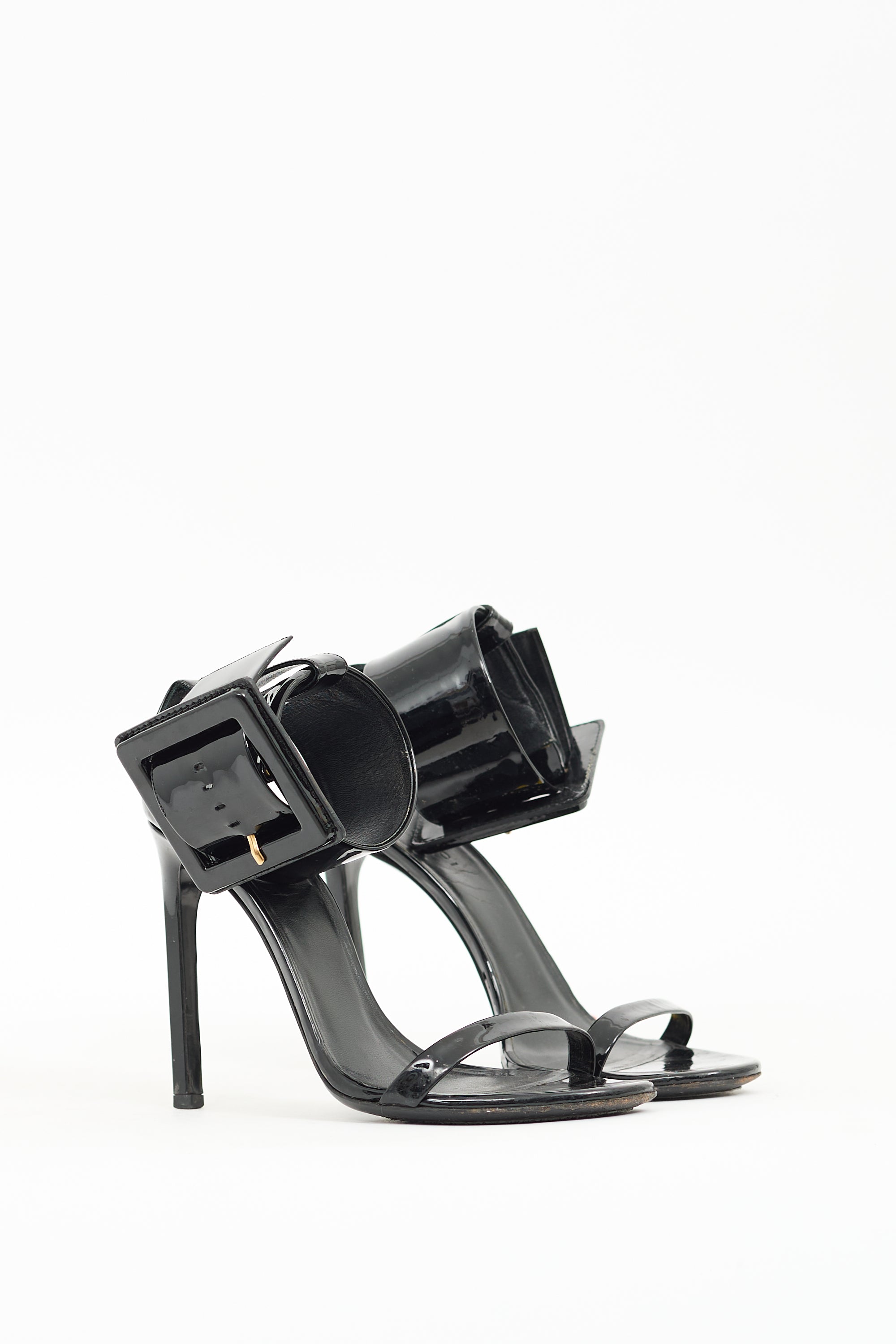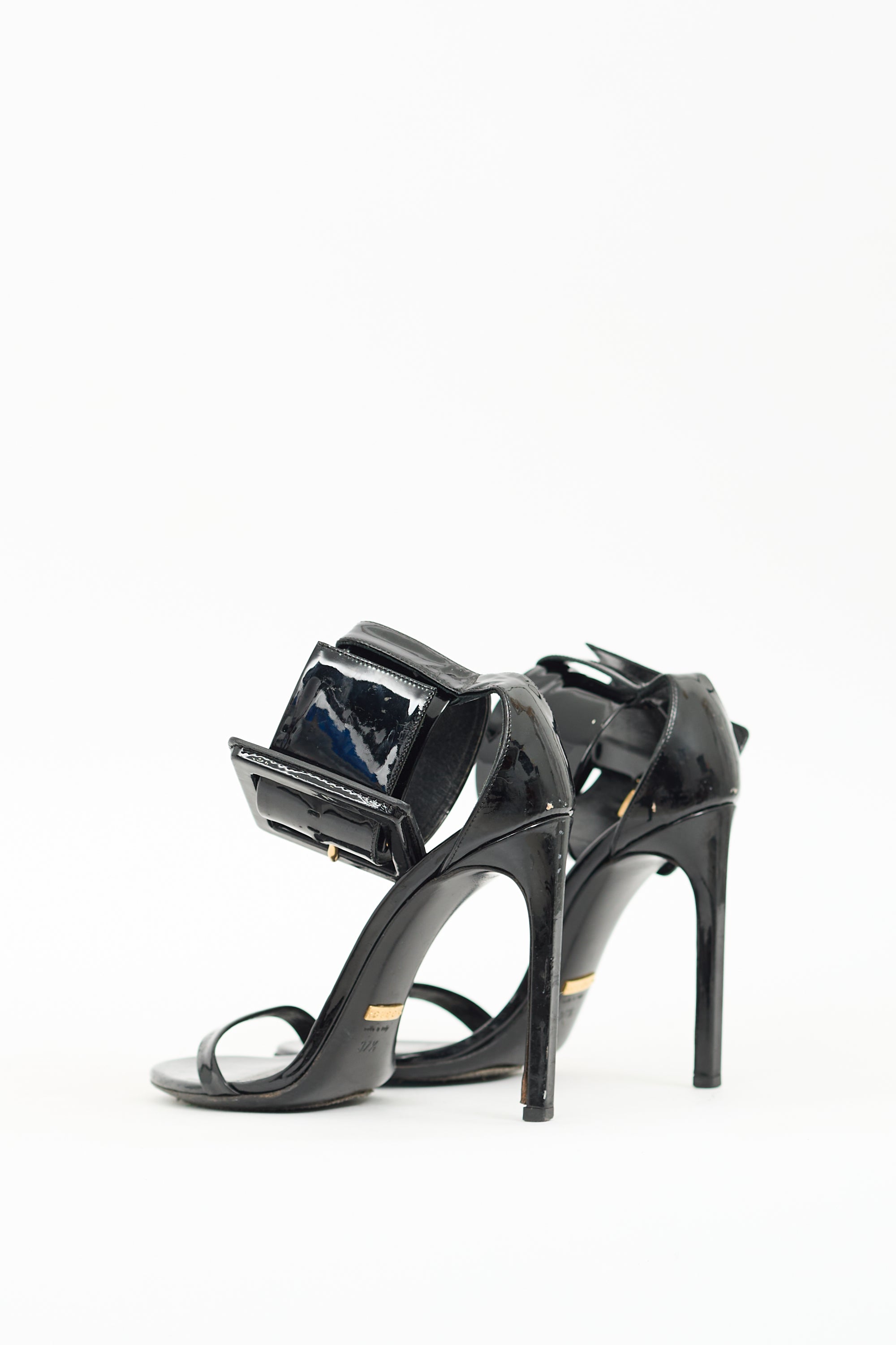 Pre-owned Gucci black patent leather Victoire sandals featuring open rounded toe, thin strap across vamp, wide adjustable ankle strap, and covered stiletto heel.