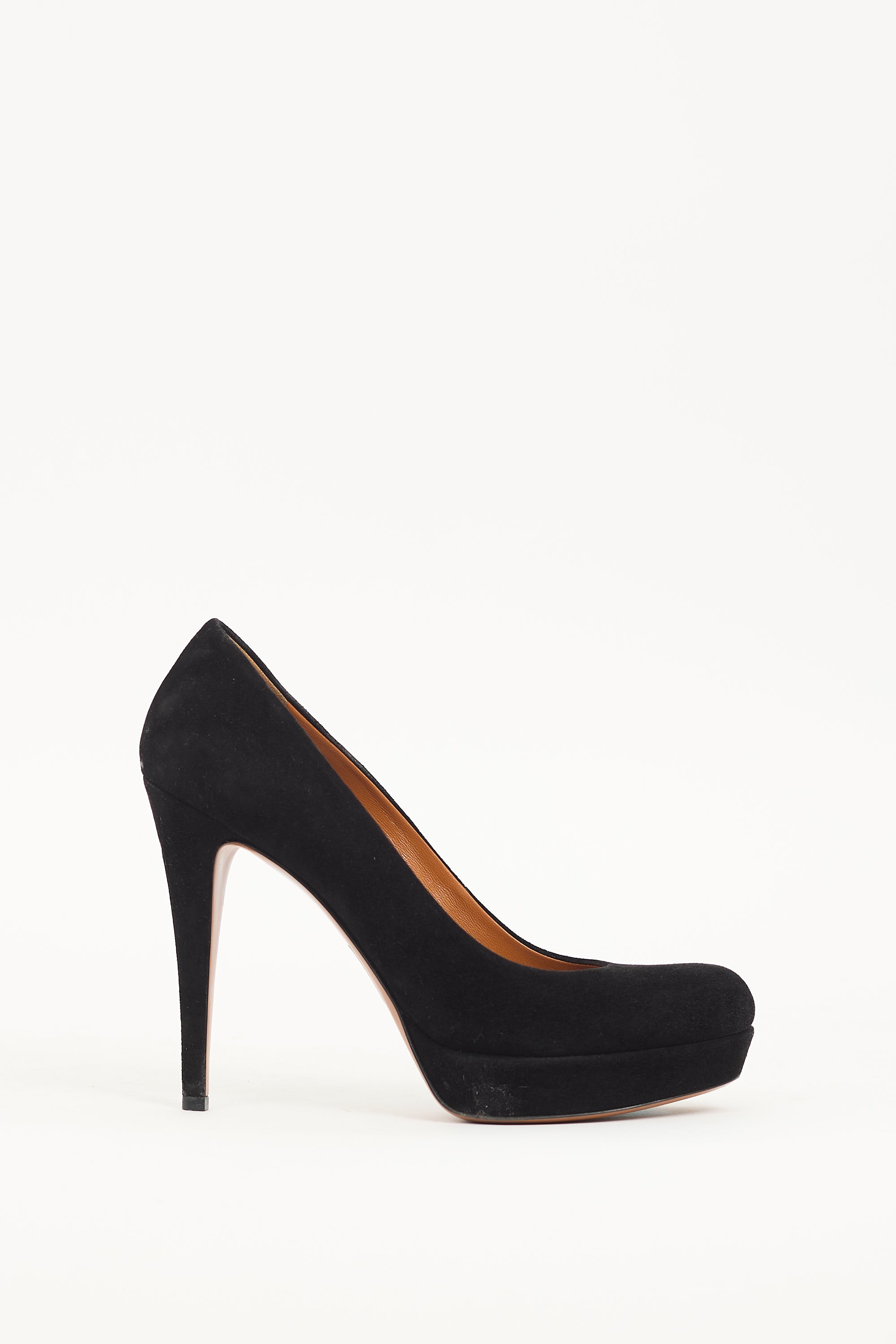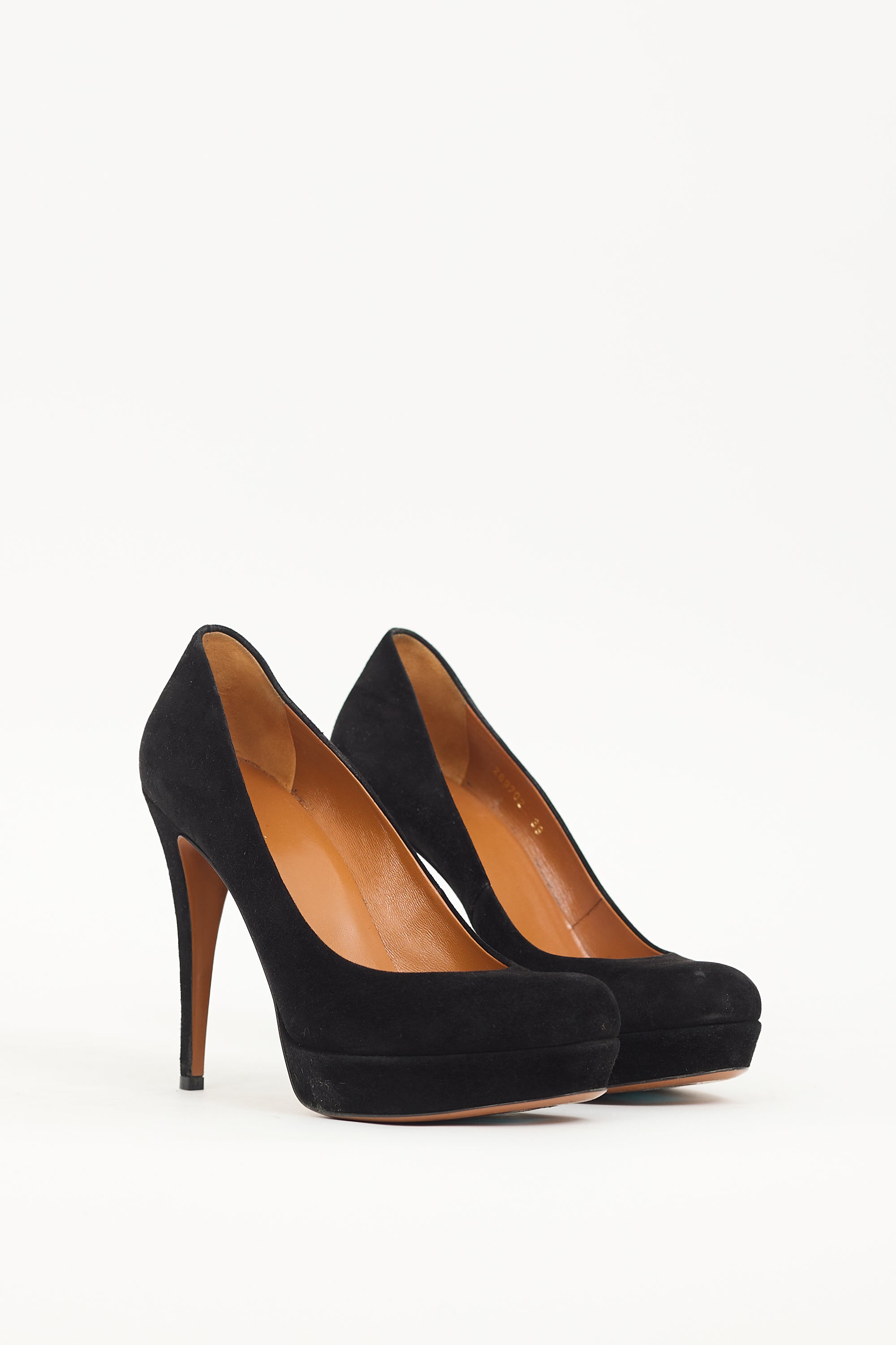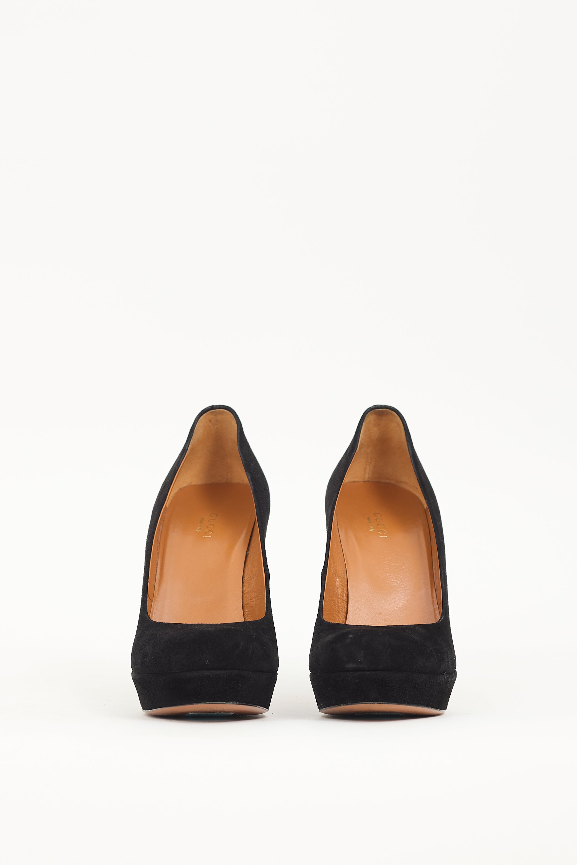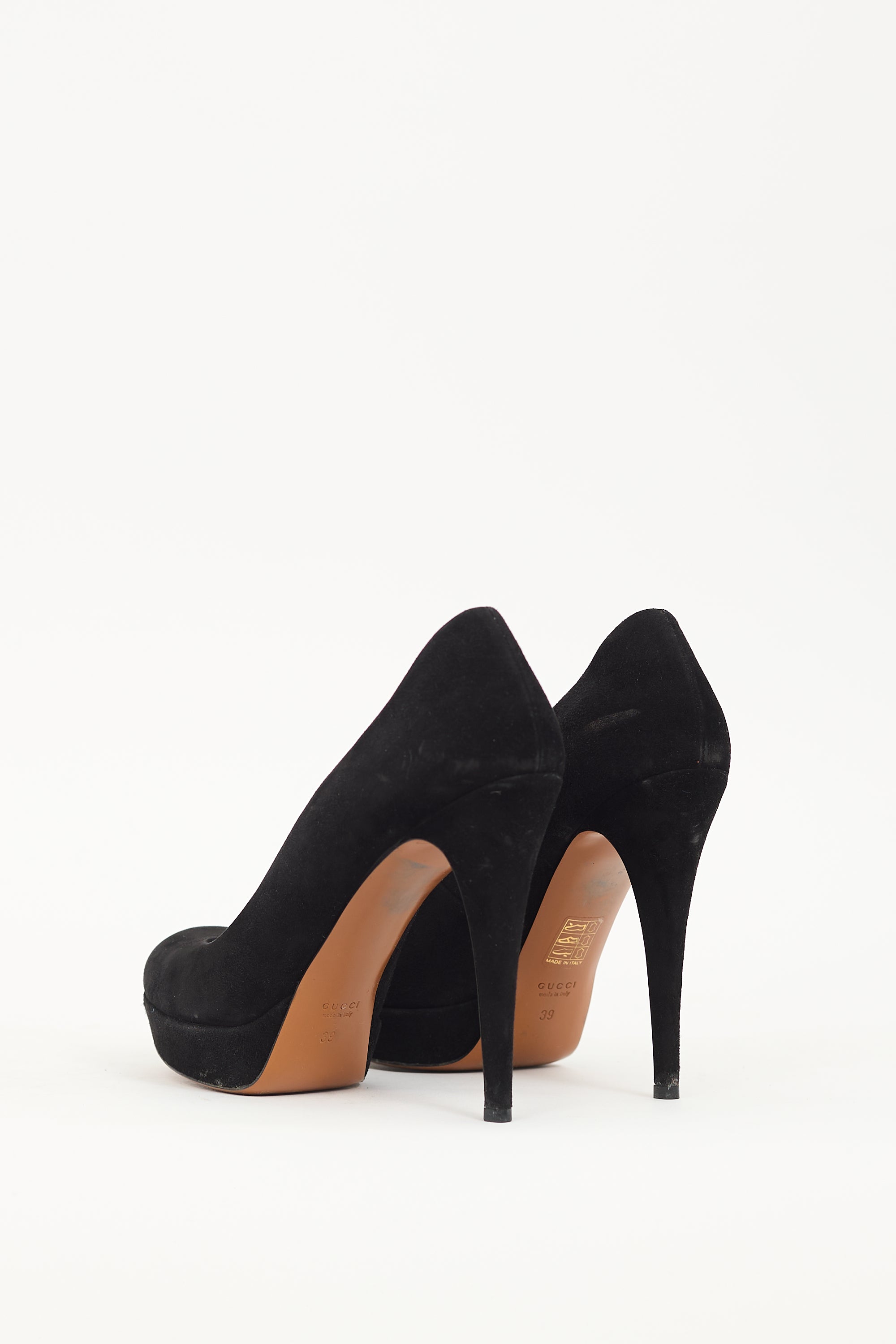 Pre-owned Gucci black suede platform pumps featuring rounded toe, slip on entry, leather insole, and covered stiletto heel.