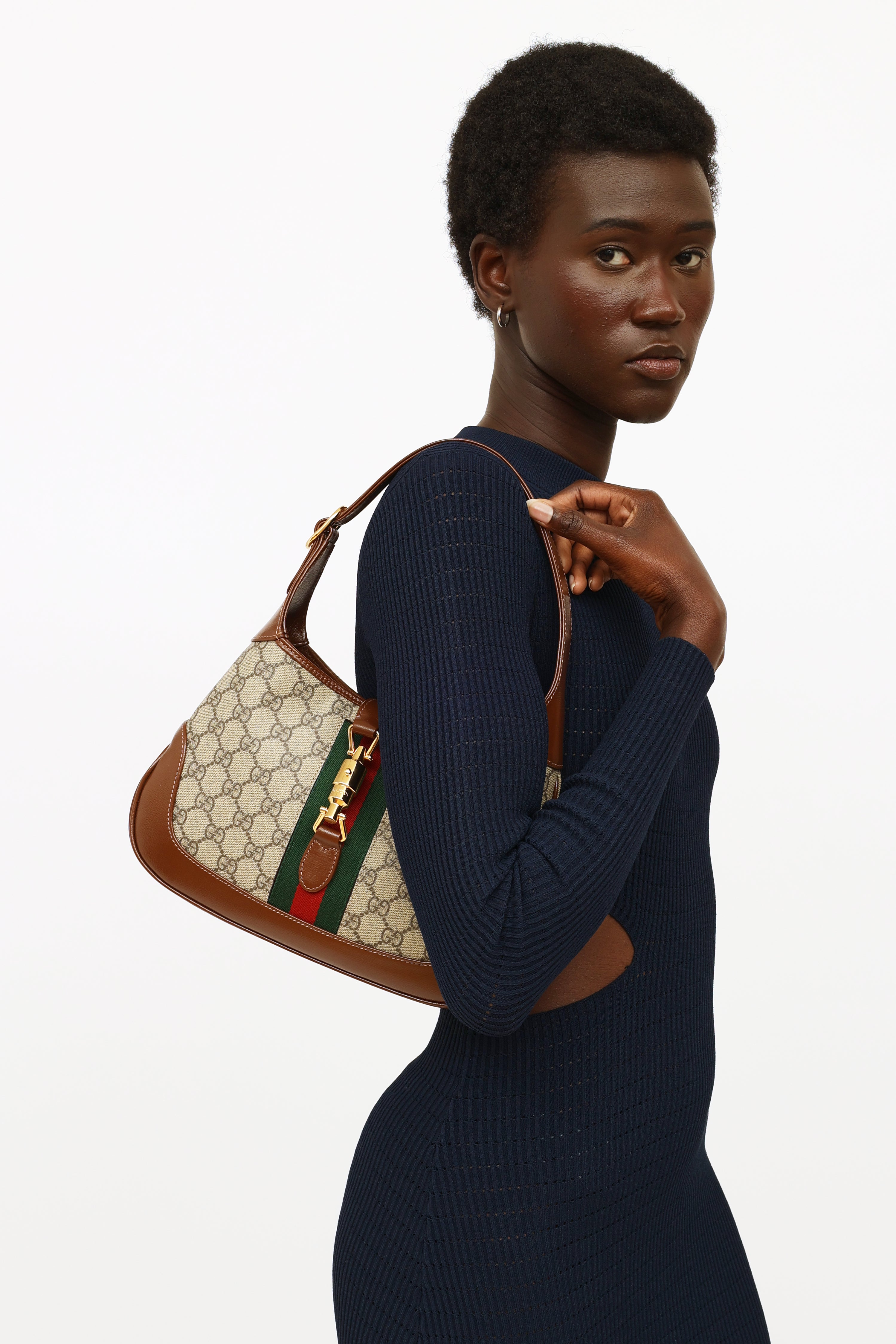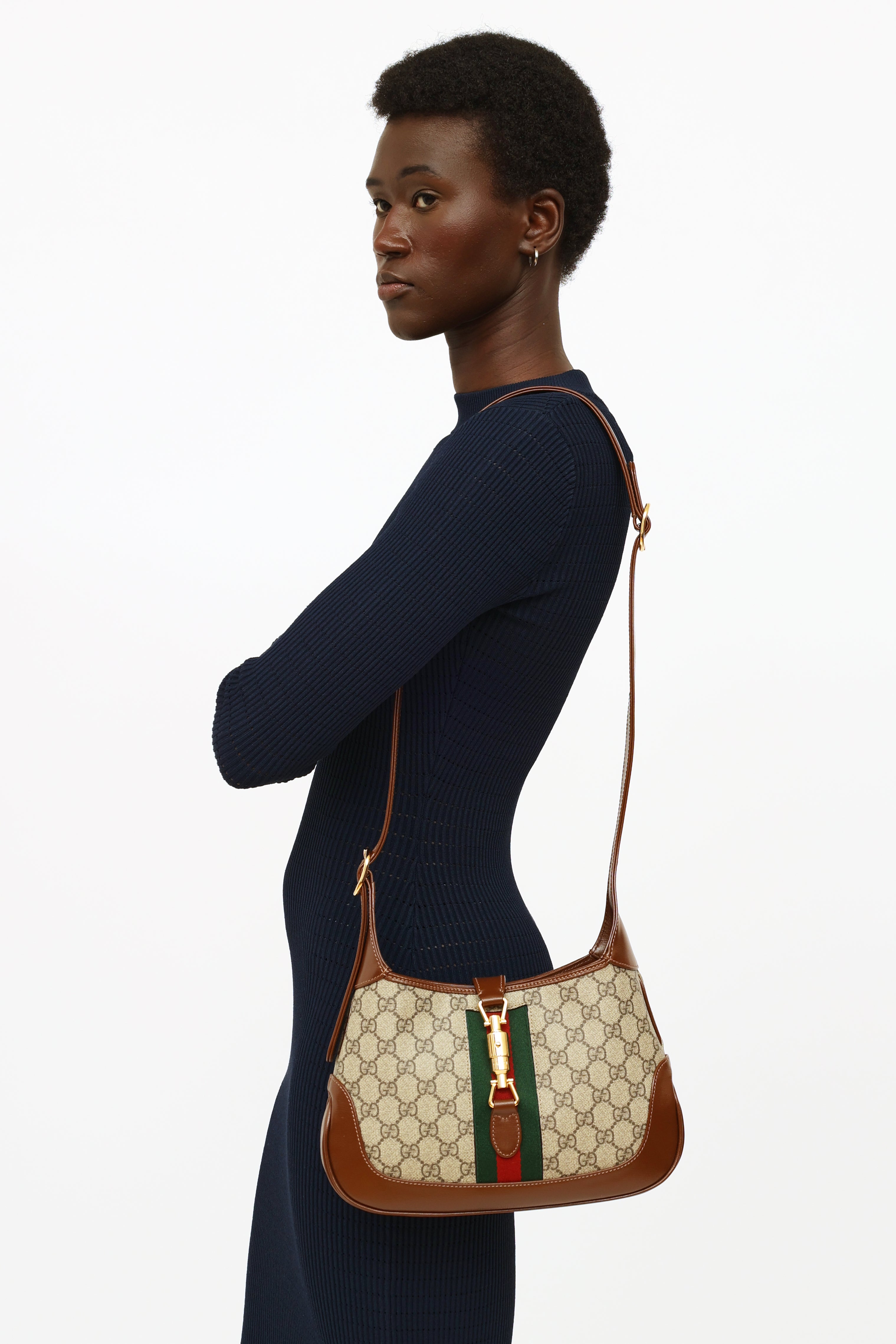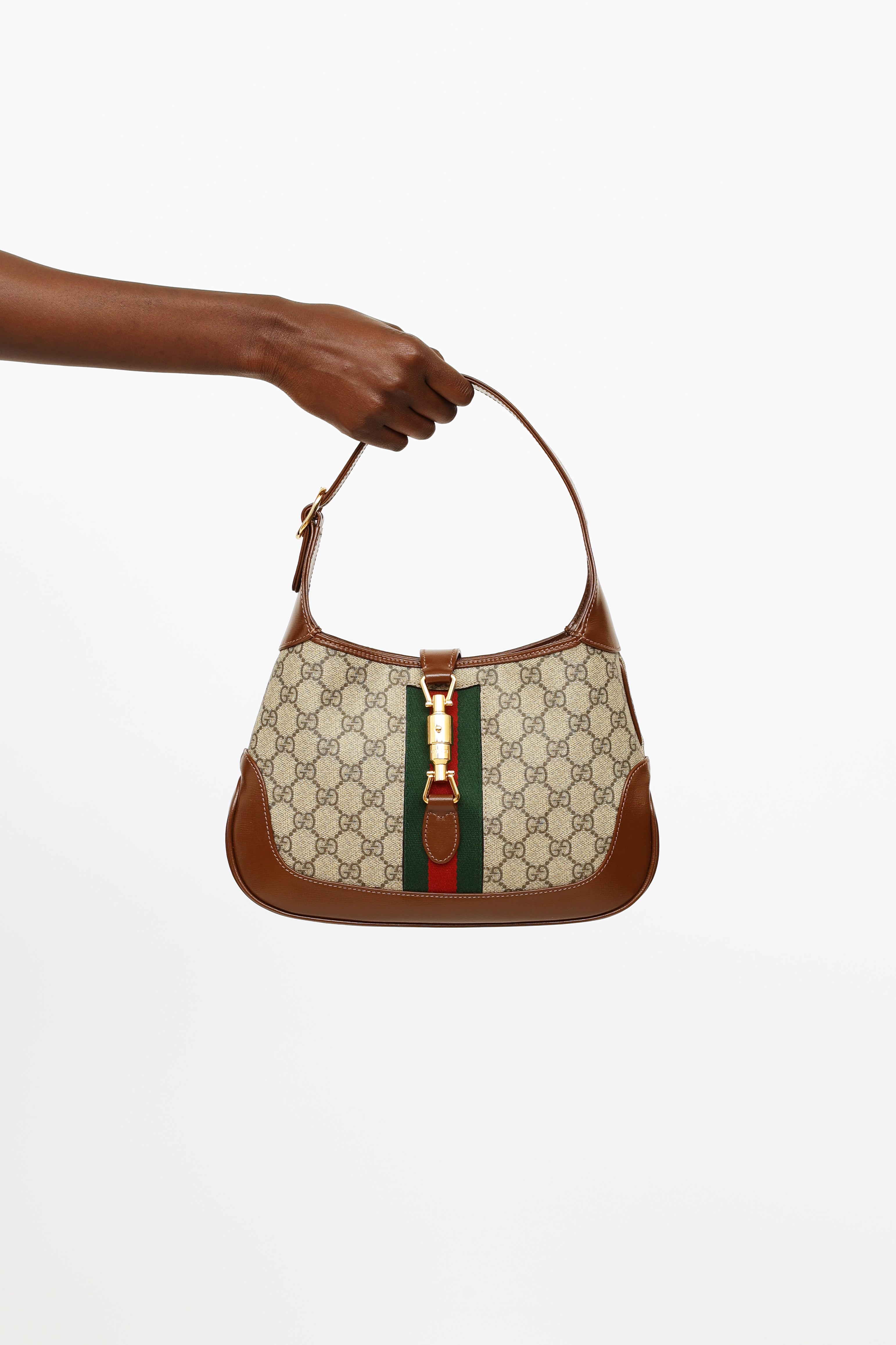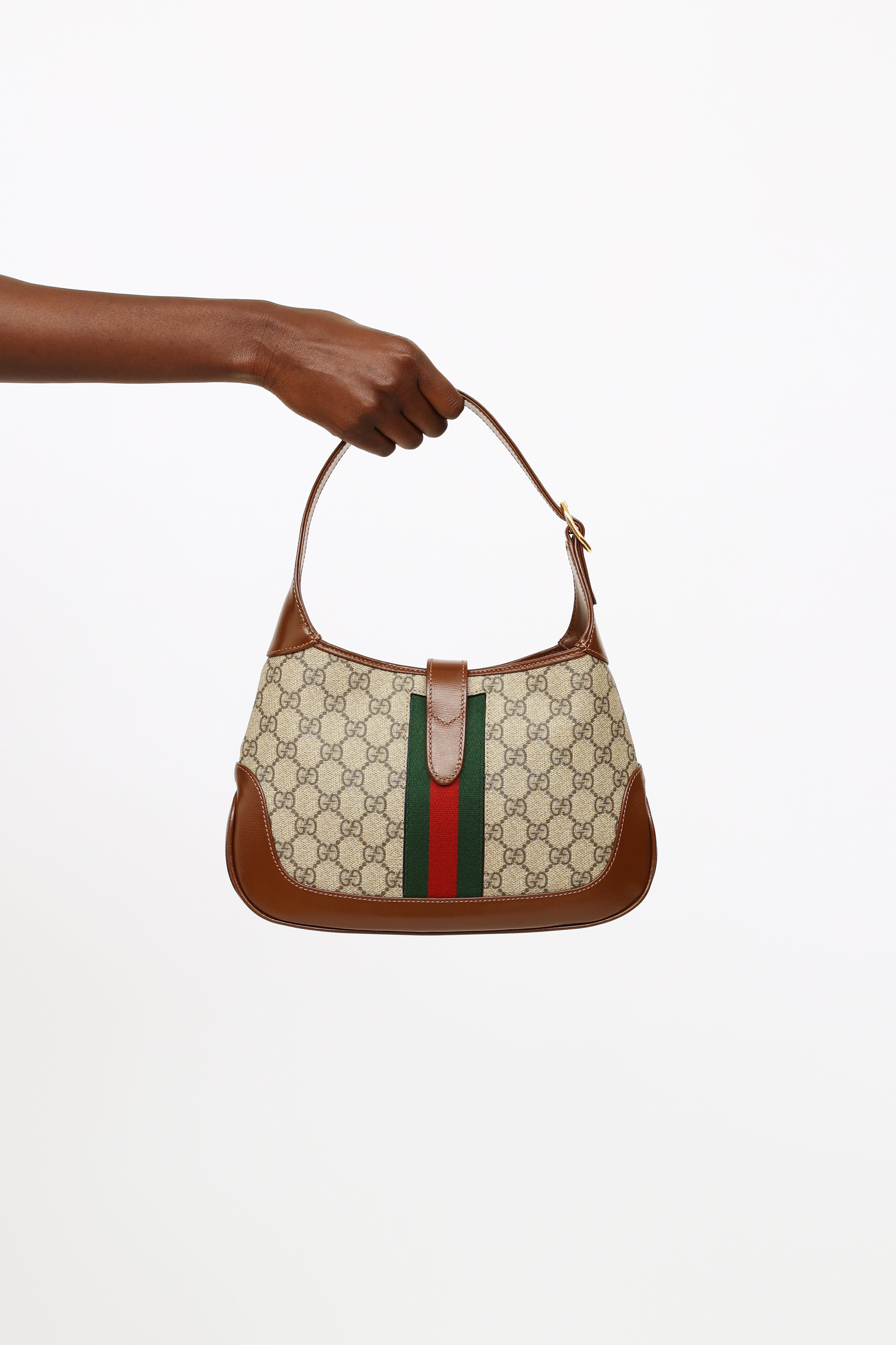 Pre-owned Gucci Jackie 1961 small shoulder bag in GG monogram coated canvas featuring brown leather adjustable shoulder strap, base, and top closure strap, signature green and red jacquard stripe on front and back, gold-tone hardware, gold-tone piston push lock closure, suede lined interior with one zip pocket, and one flat pocket.