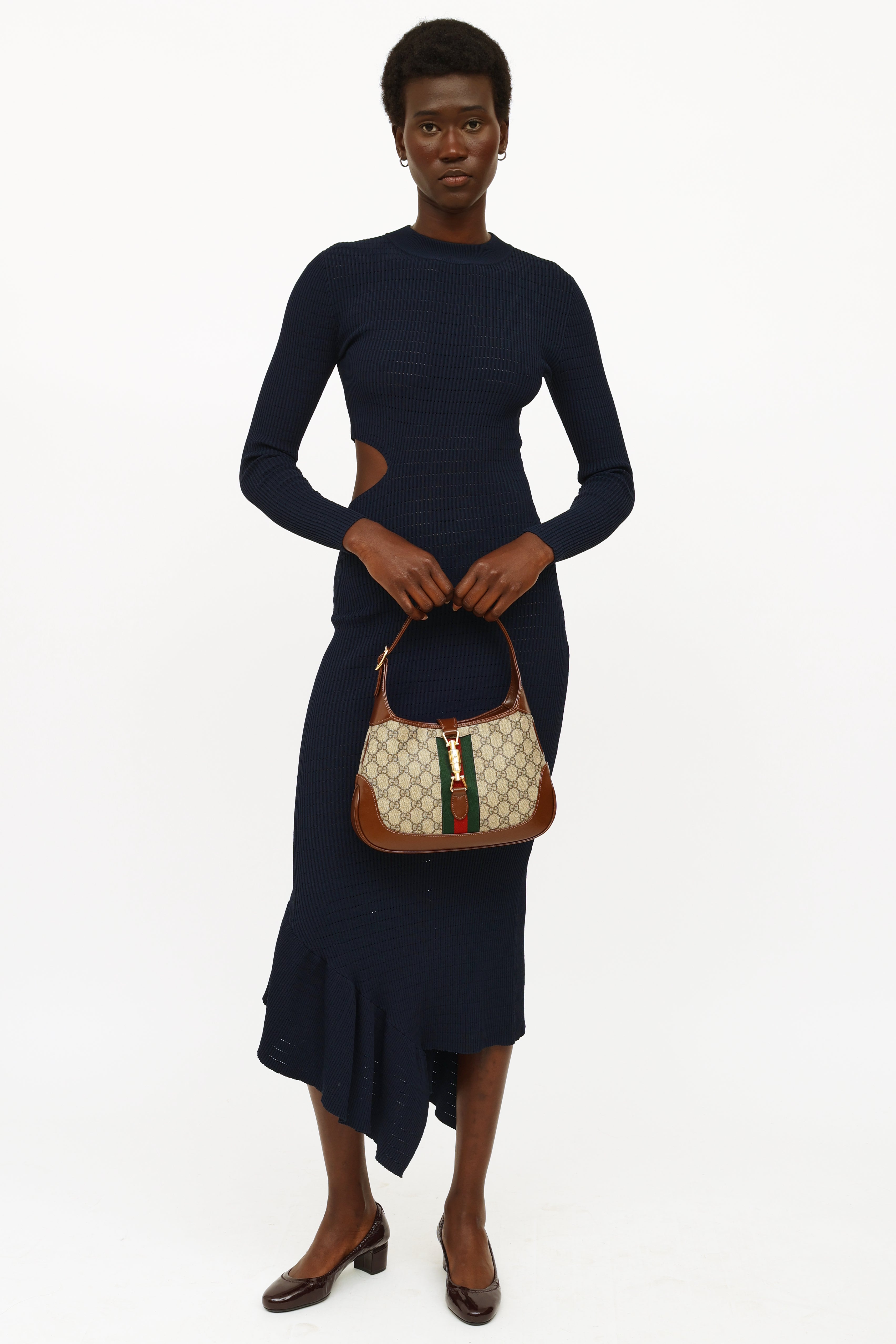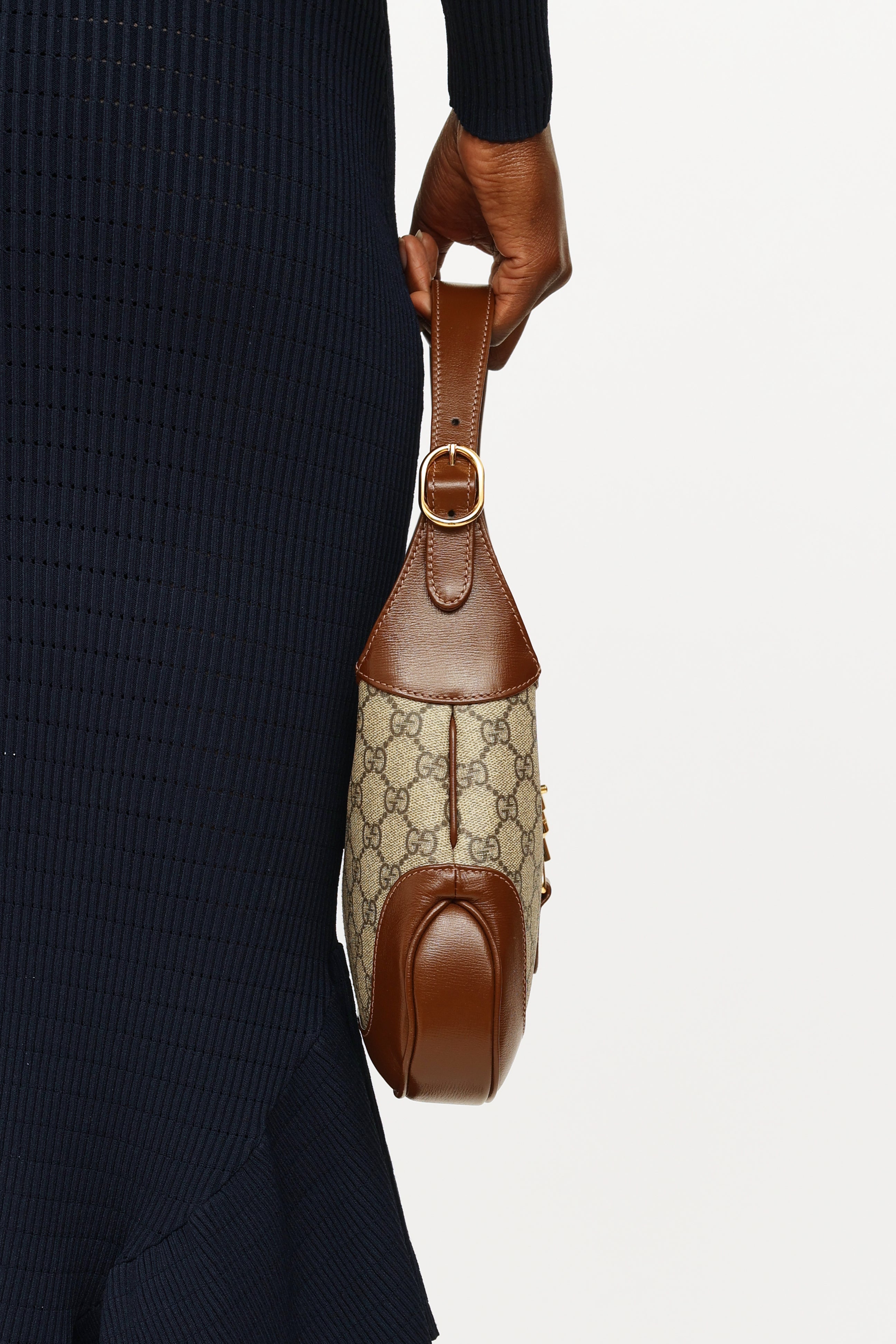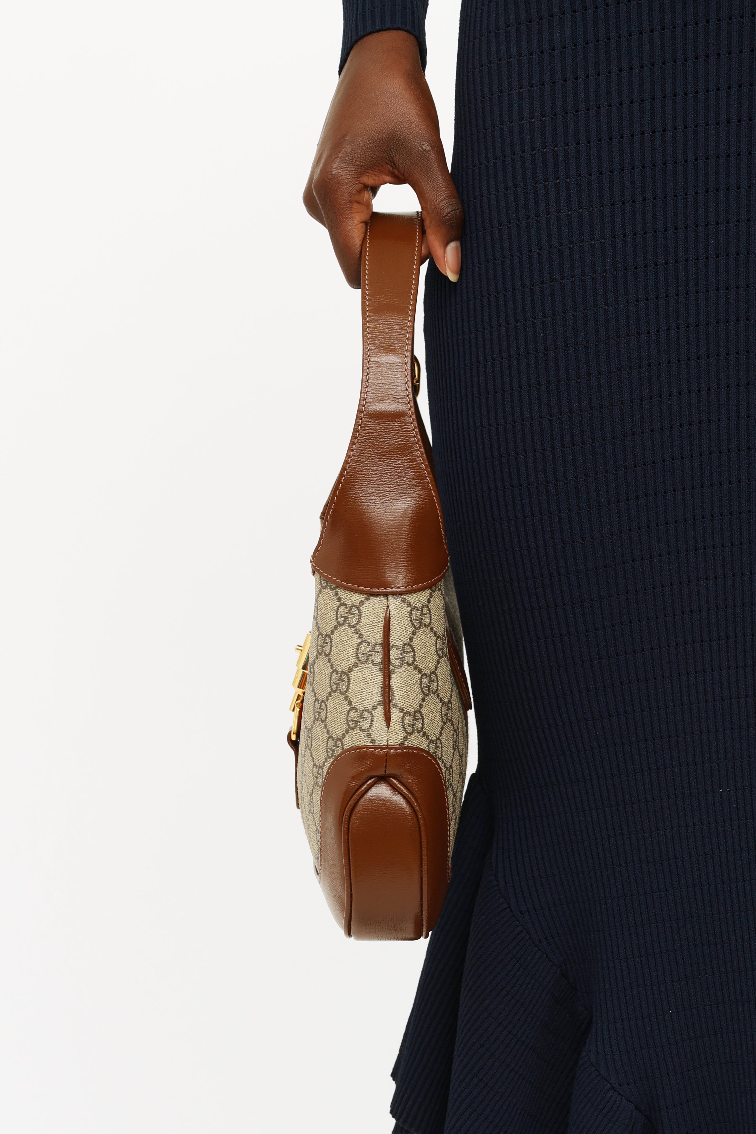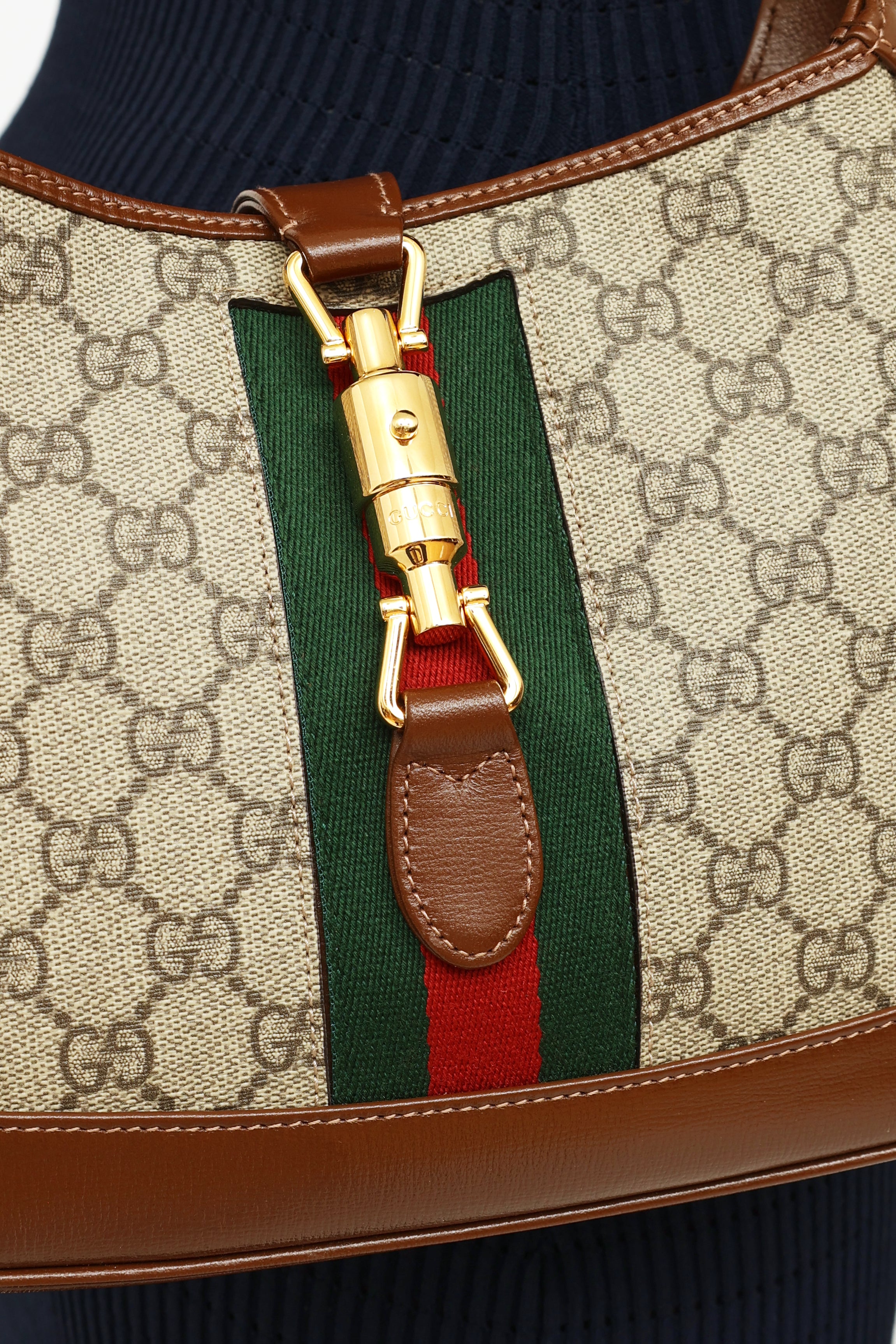 Pre-owned Gucci Jackie 1961 small shoulder bag in GG monogram coated canvas featuring brown leather adjustable shoulder strap, base, and top closure strap, signature green and red jacquard stripe on front and back, gold-tone hardware, gold-tone piston push lock closure, suede lined interior with one zip pocket, and one flat pocket.