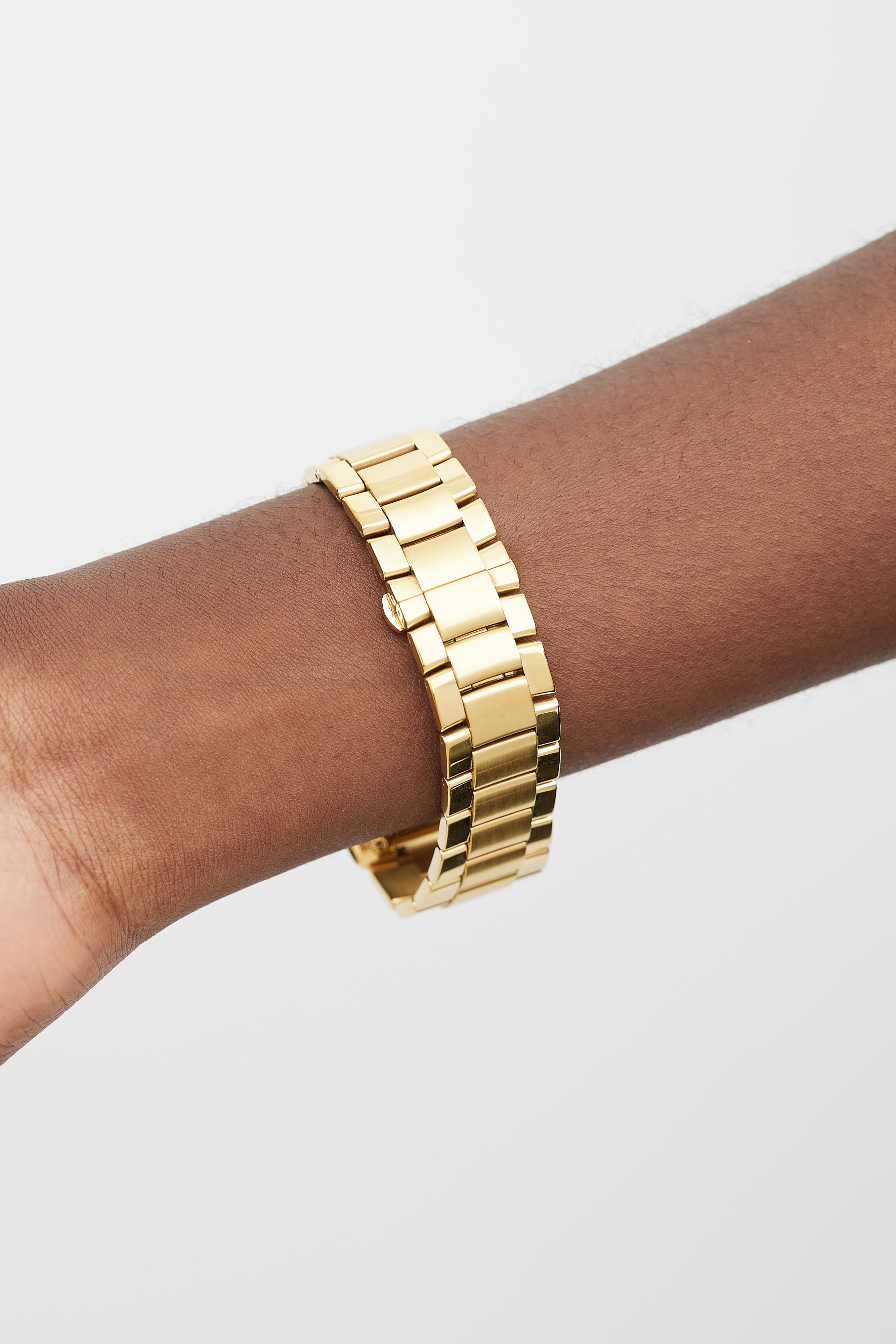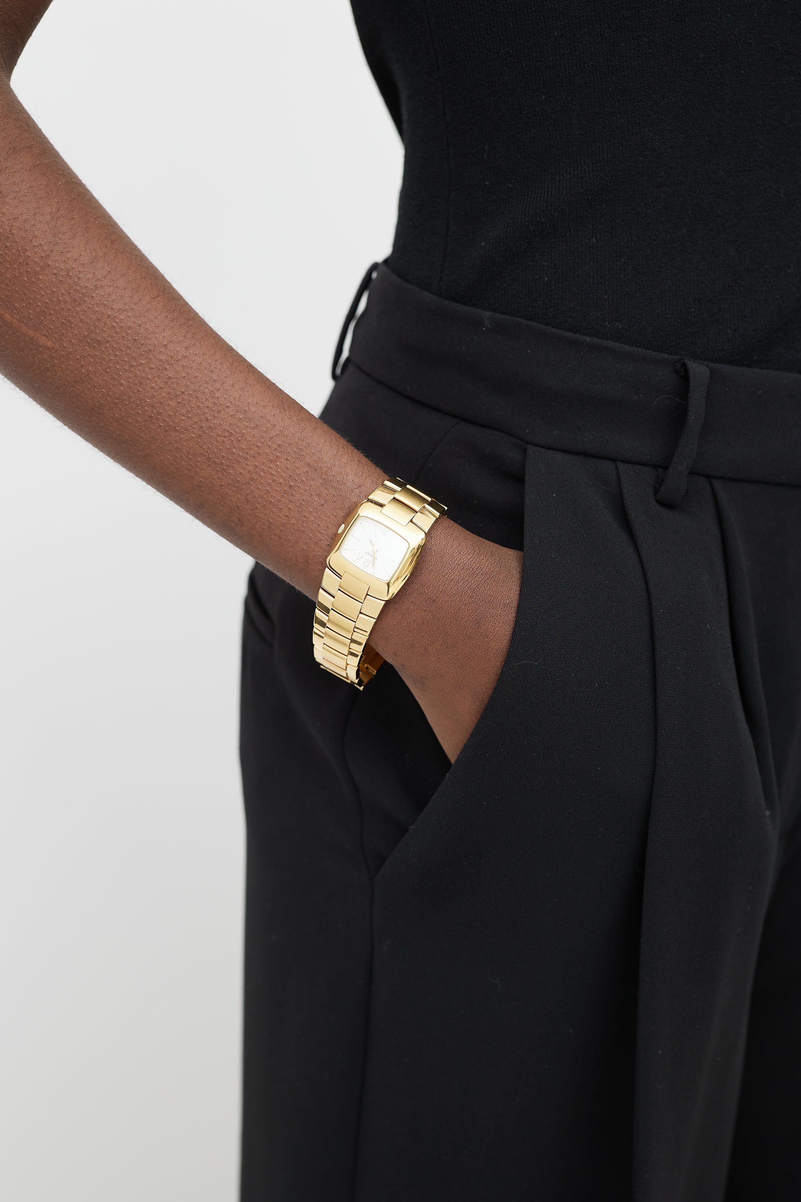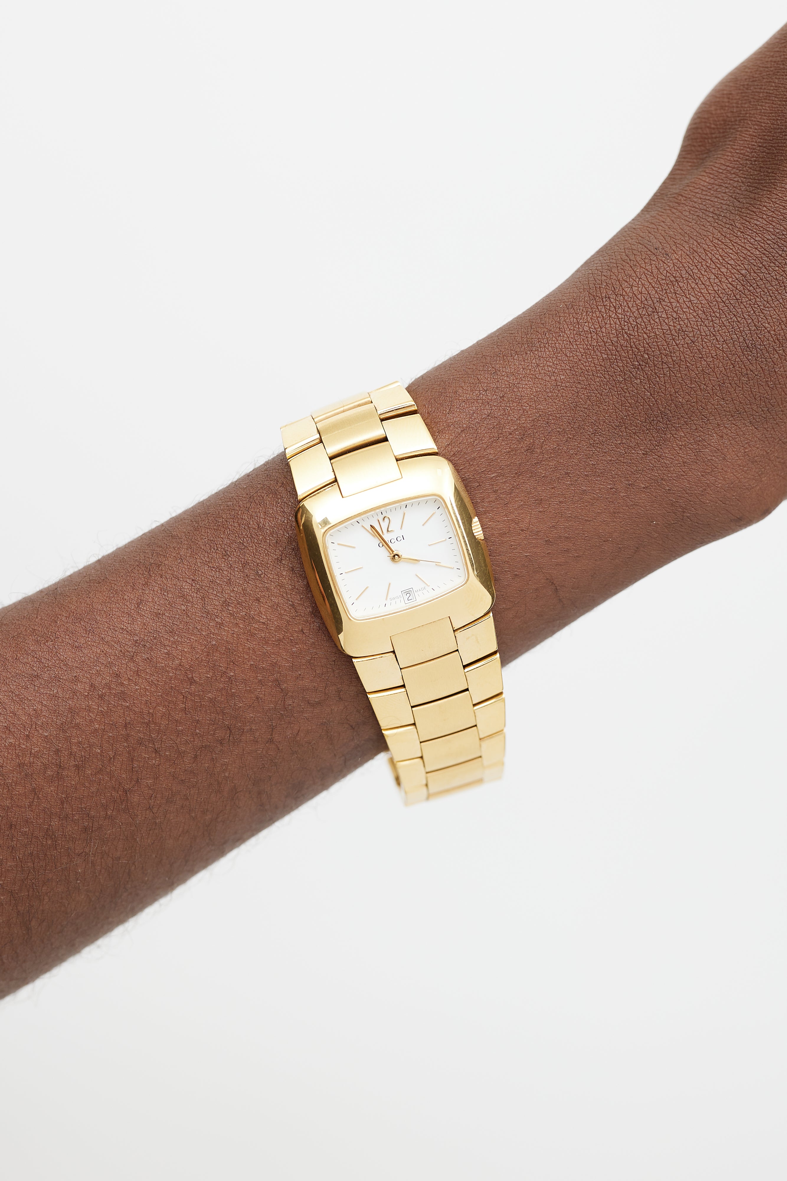 Pre-owned Gucci gold 8500L watch featuring deployant clasp closure, white bezel, gold numeral mark, gold dial, window date, and engraved logo at back. Comes with original box.