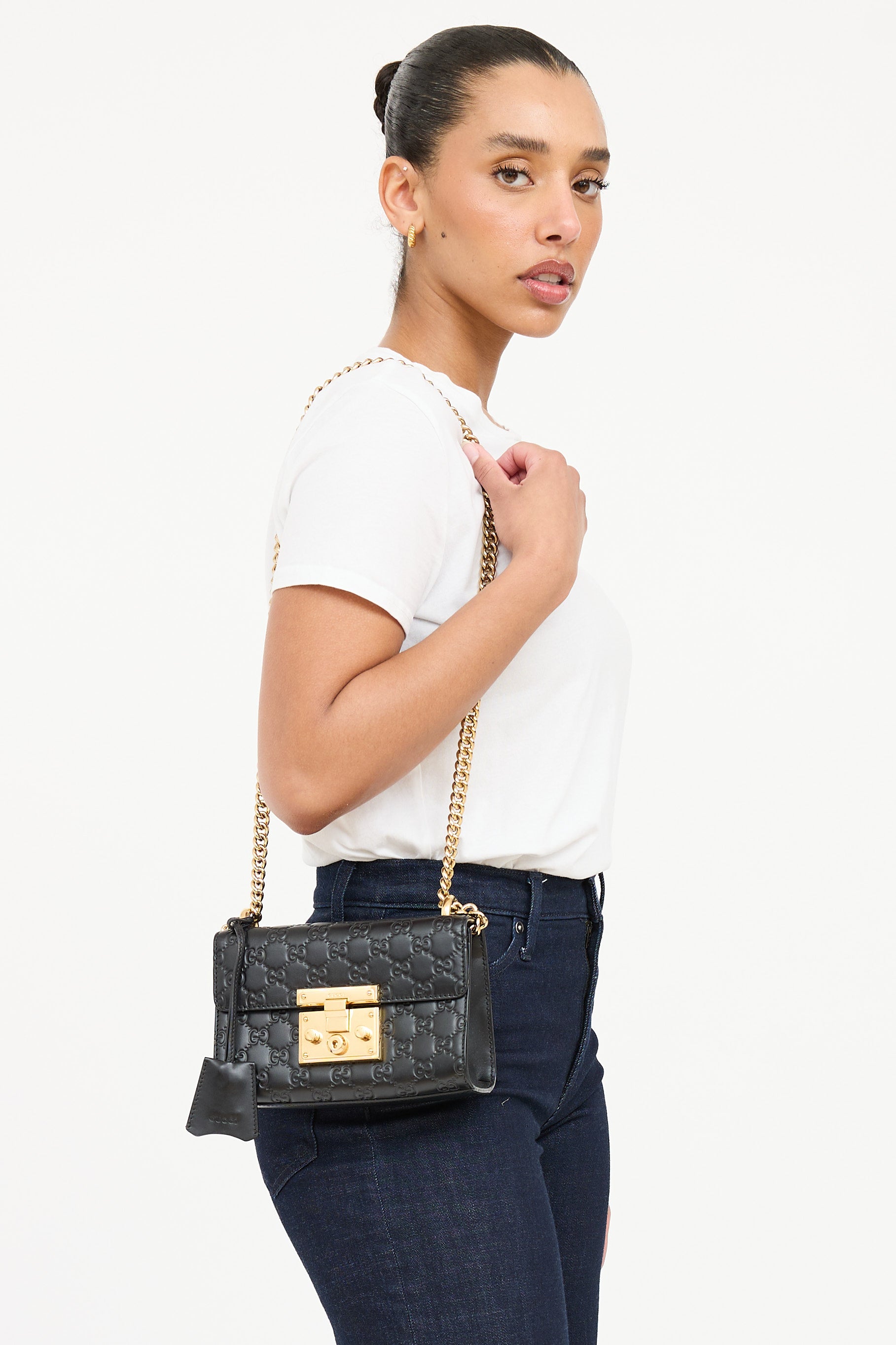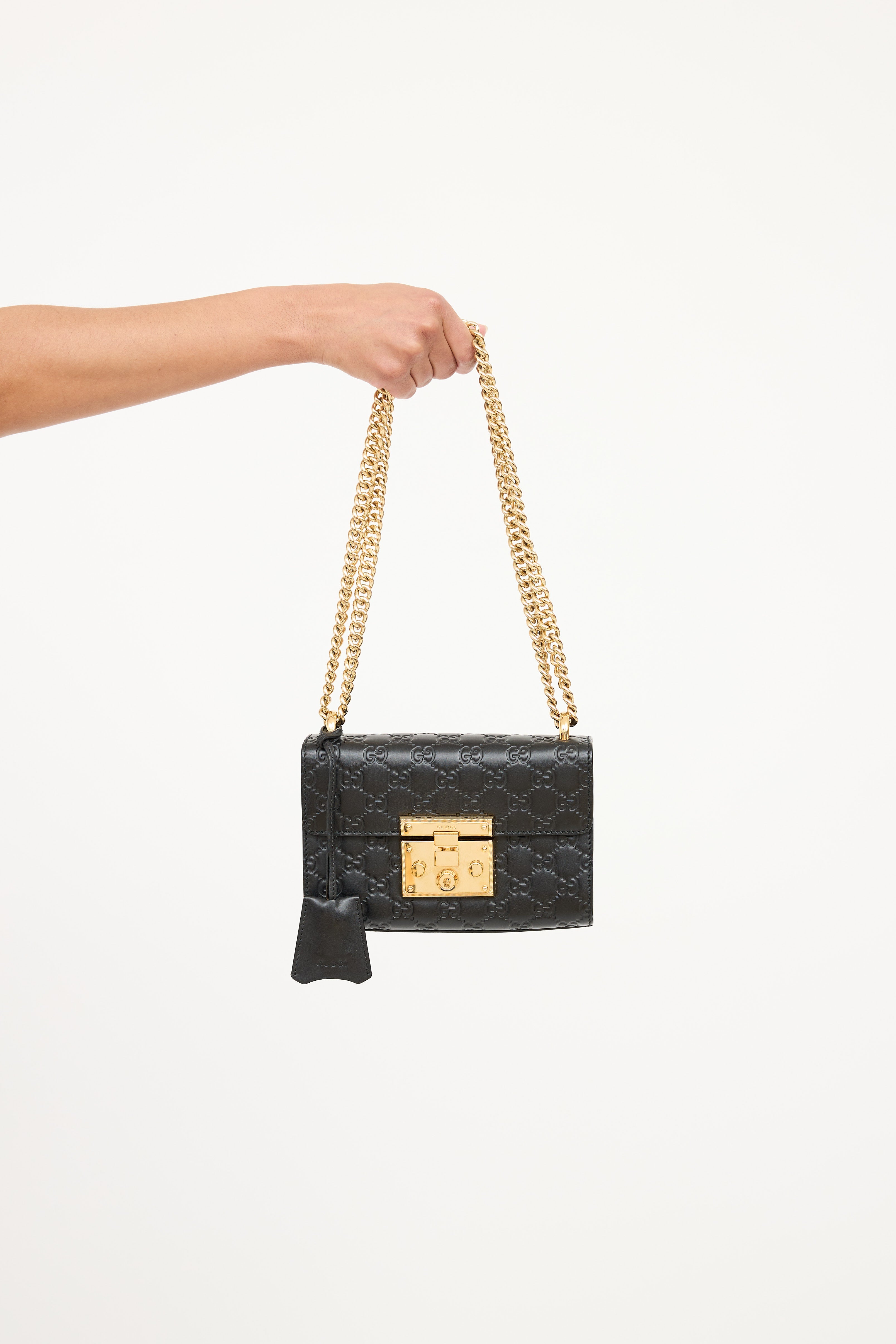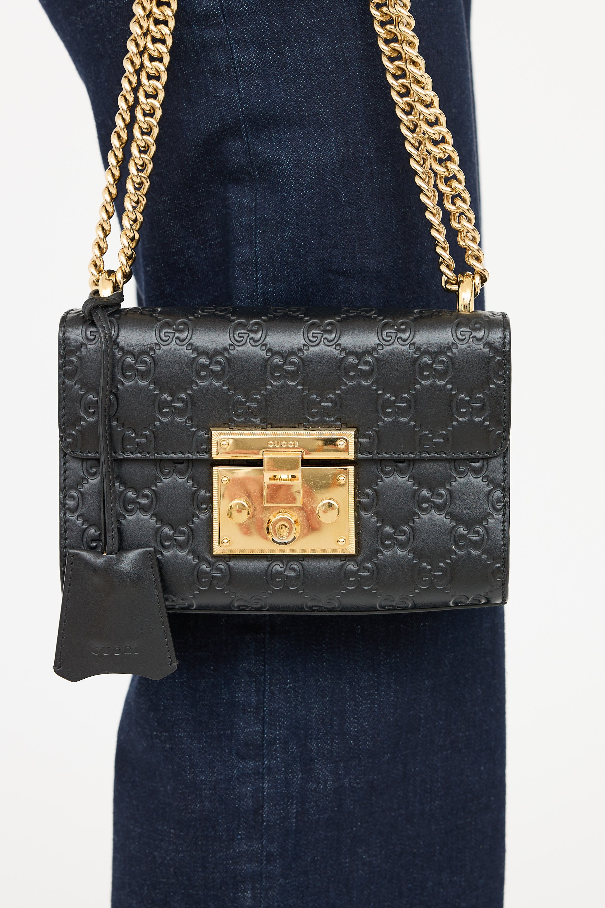 Pre-owned Gucci black Guccissima Padlock bag featuring embossed monogram throughout, removeable clochette with keys, gold tone chain link strap that can be worn two ways, one slip pocket at back and push lock closure. Suede lined interior featuring one slip pocket.