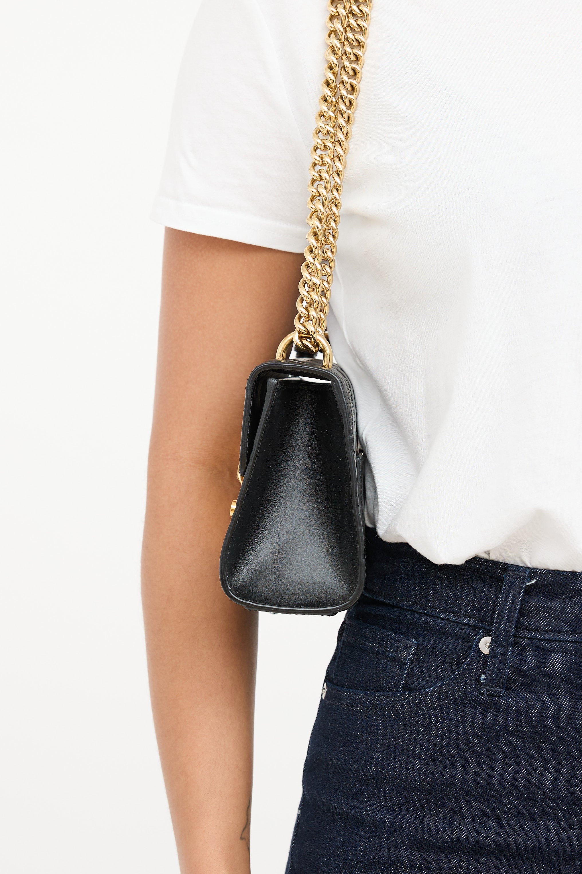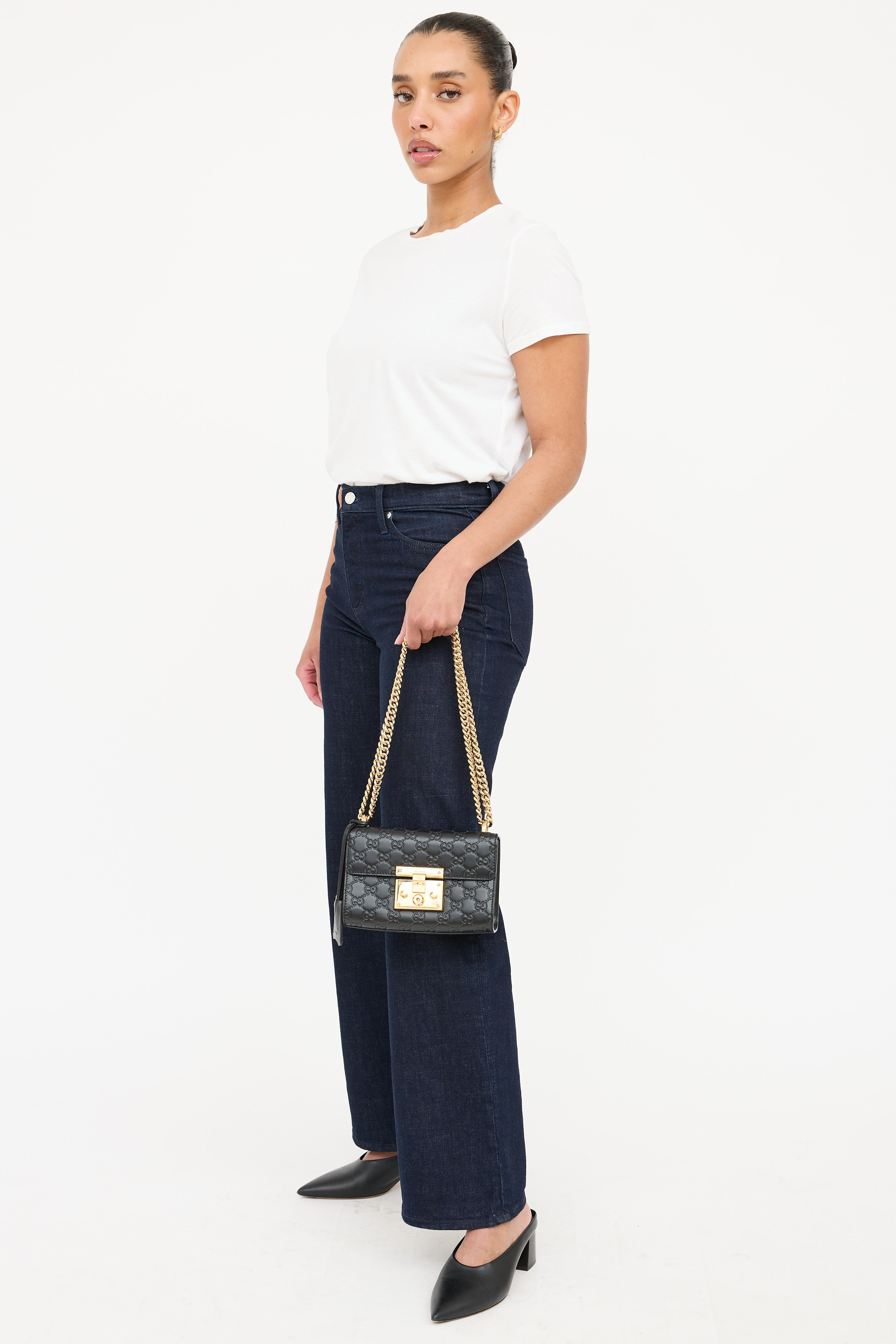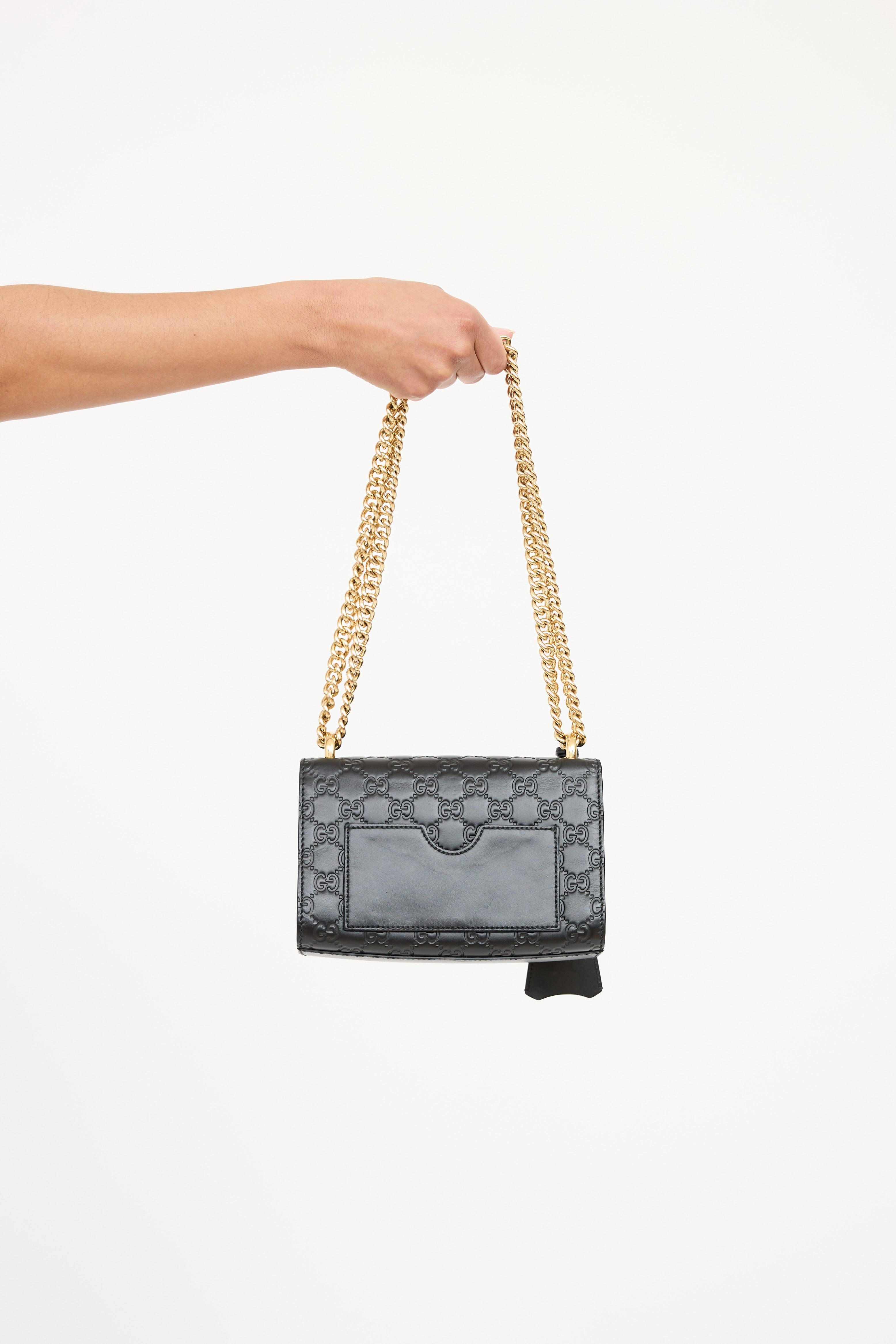 Pre-owned Gucci black Guccissima Padlock bag featuring embossed monogram throughout, removeable clochette with keys, gold tone chain link strap that can be worn two ways, one slip pocket at back and push lock closure. Suede lined interior featuring one slip pocket.