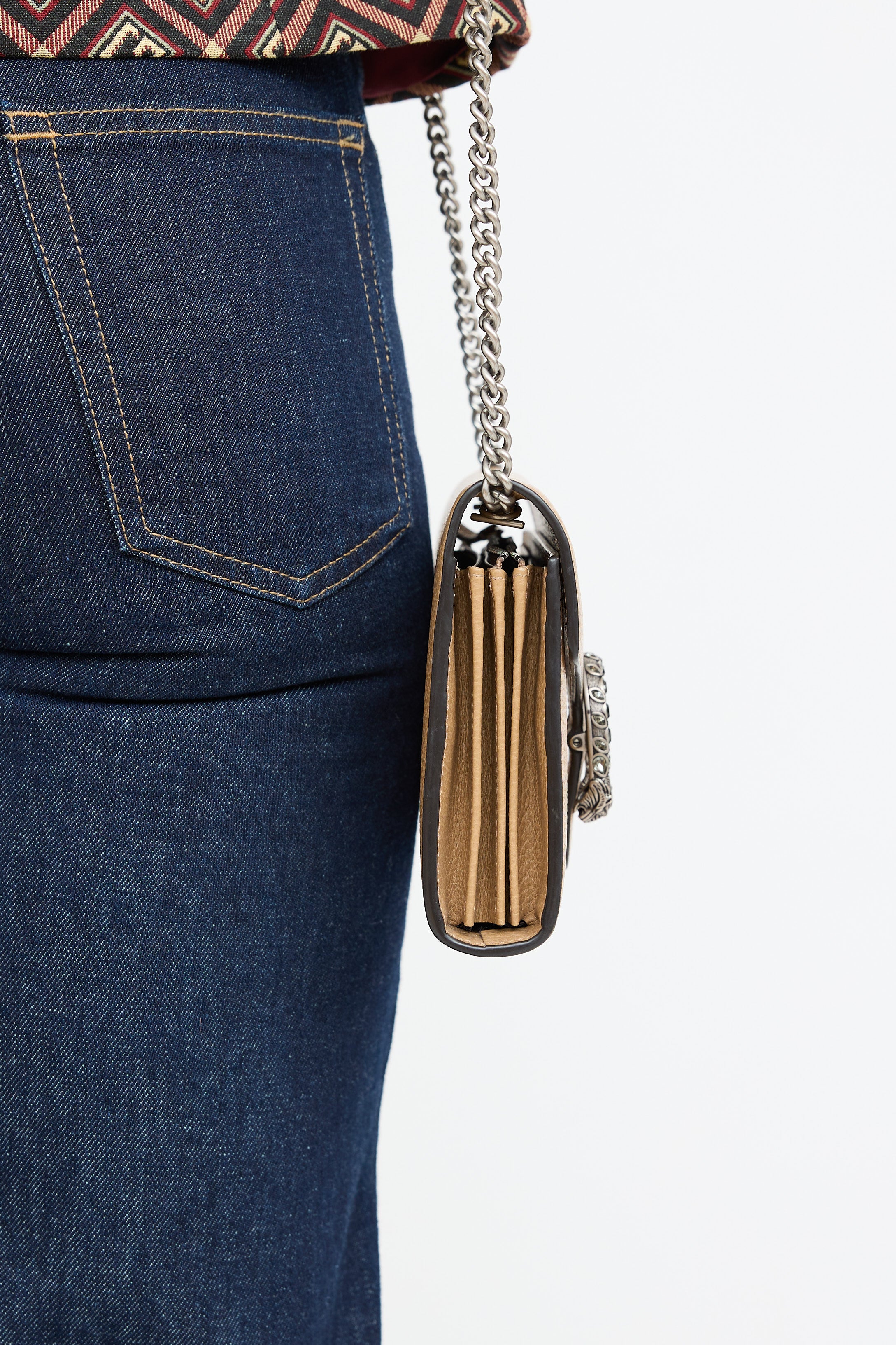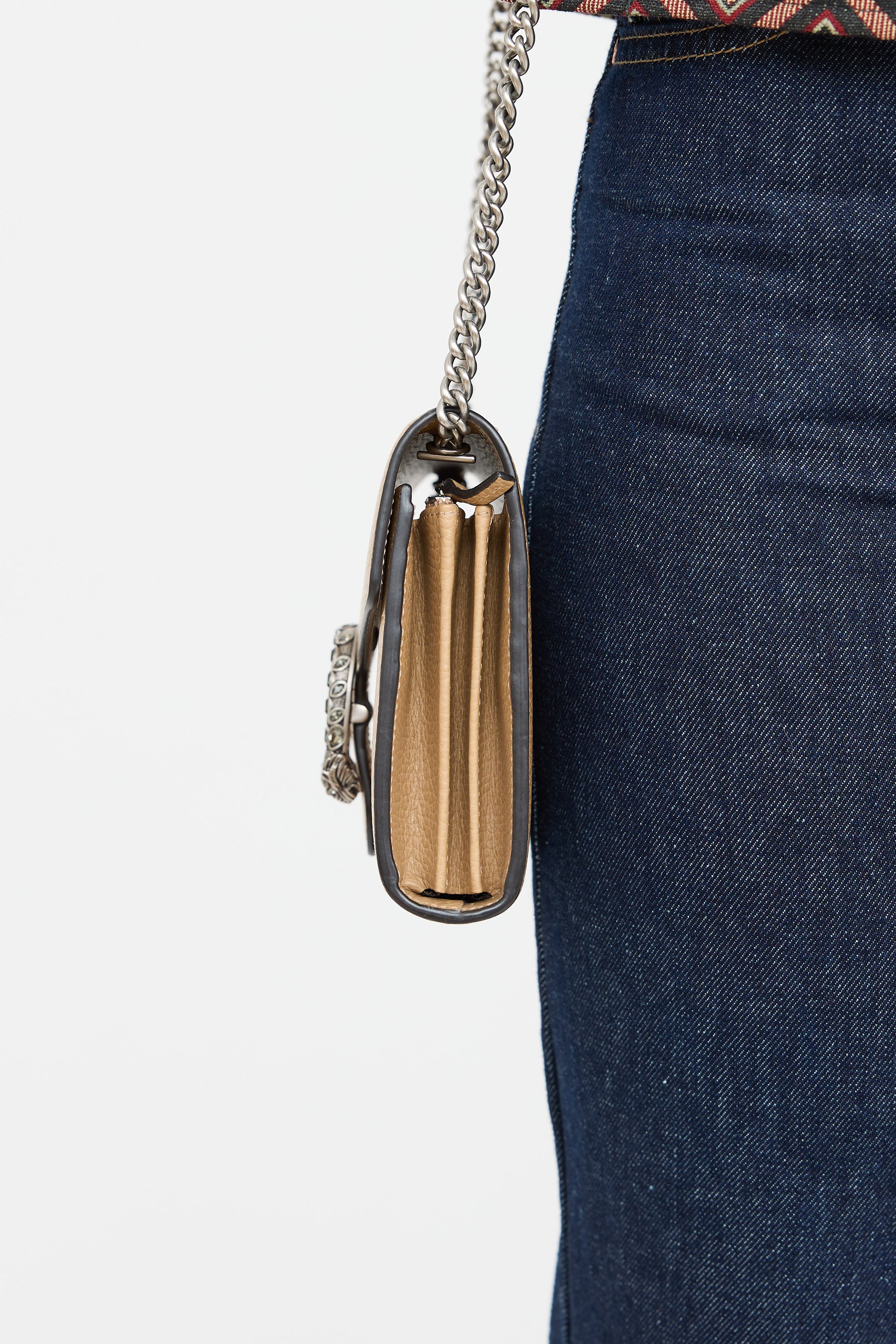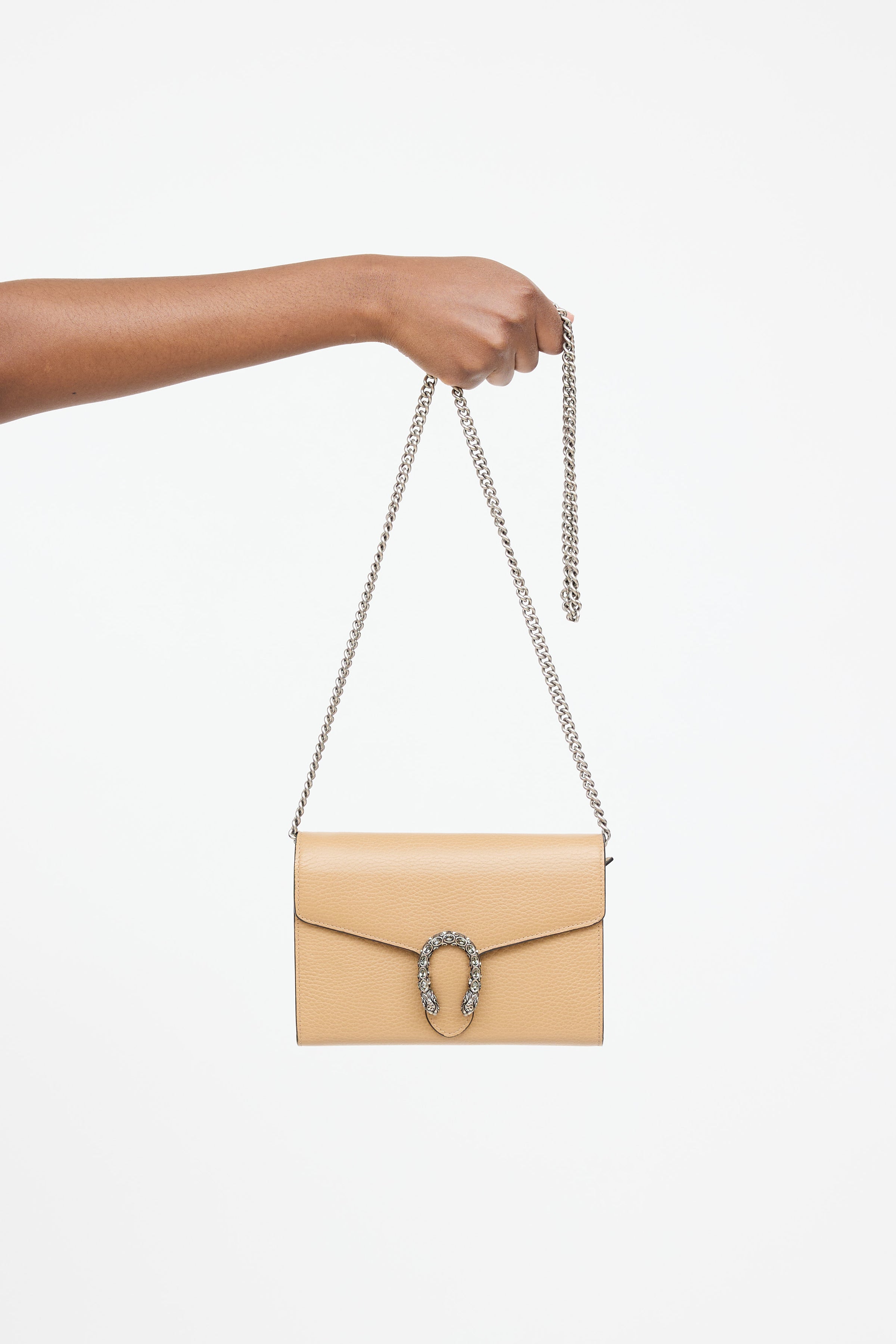 Pre-owned Gucci brown Dionysus leather wallet on chain featuring a top flap, three main compartments with 16 card slots and two slip pockets, internal zip pocket, removable chain link shoulder strap, silver tone crystal embellished tiger head charm at front, and snap closure.