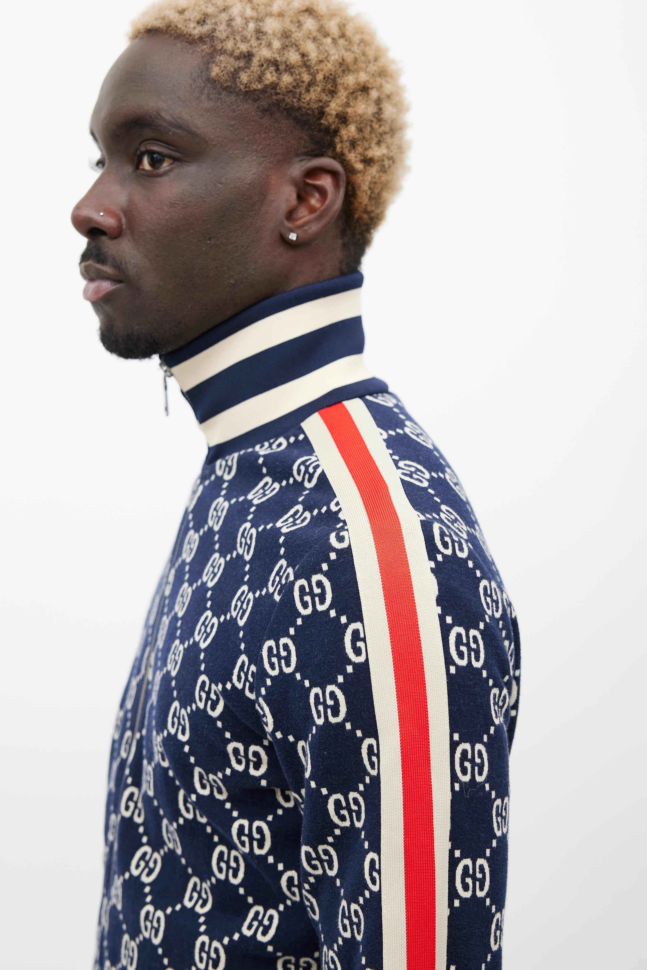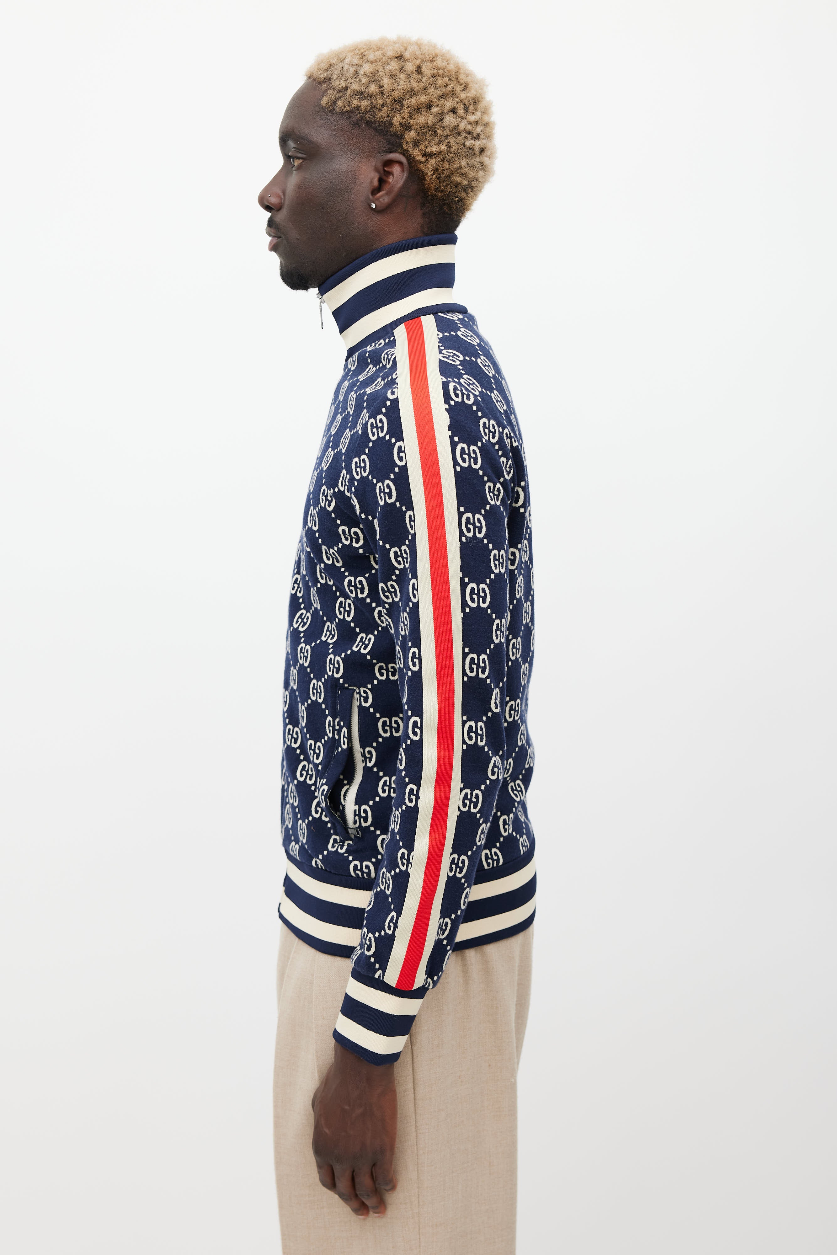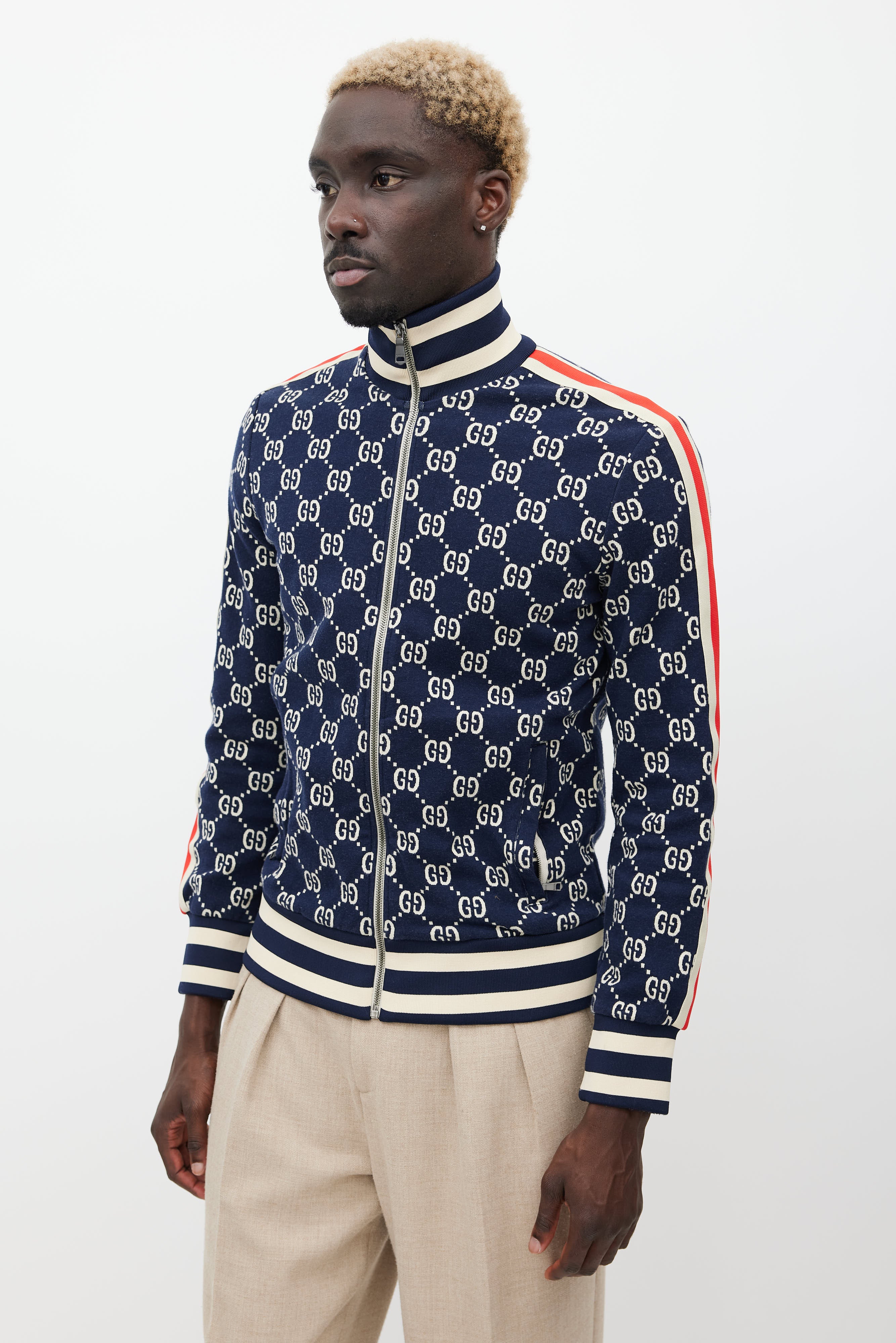 Pre-owned Gucci navy jacket featuring a mock neck collar, monogram pattern throughout, striped detailing at sides, two zip pockets at hip, ribbed hem, and zip closure.