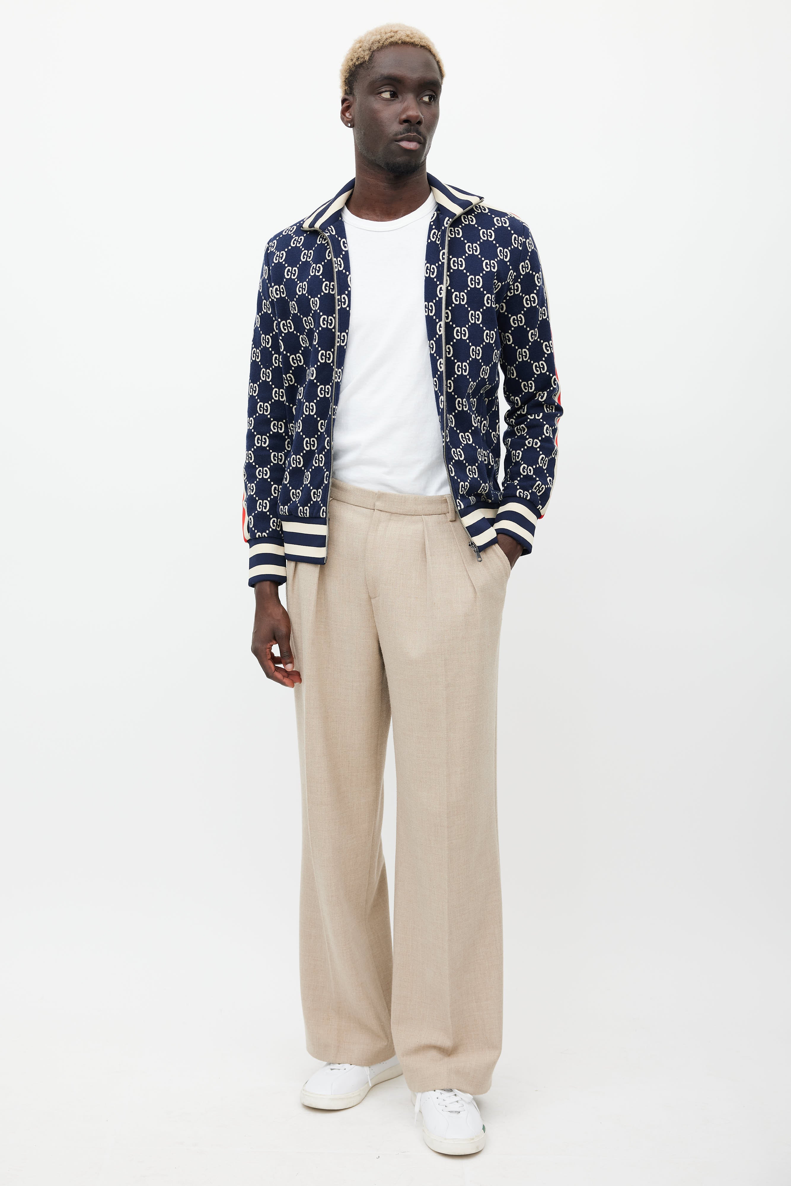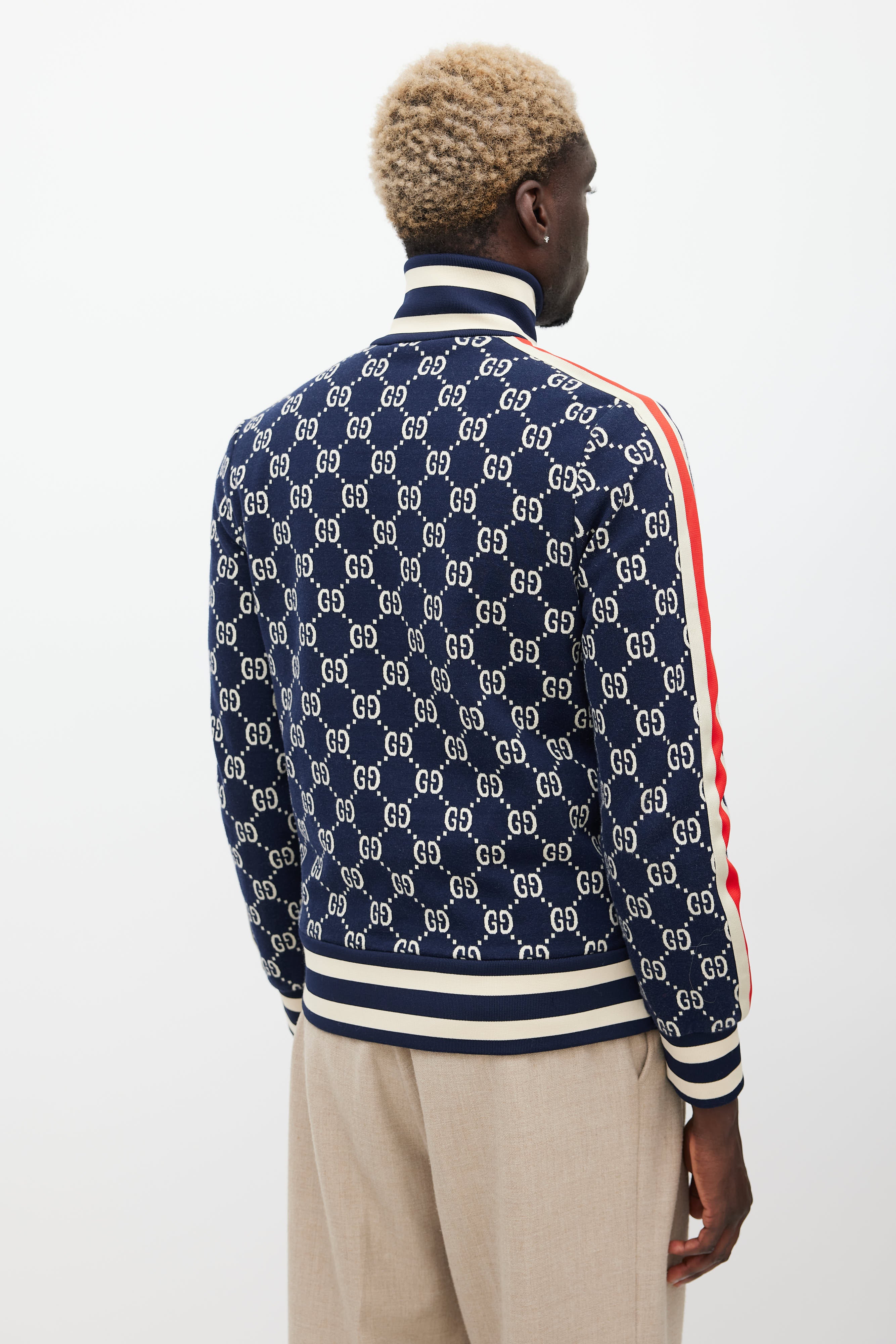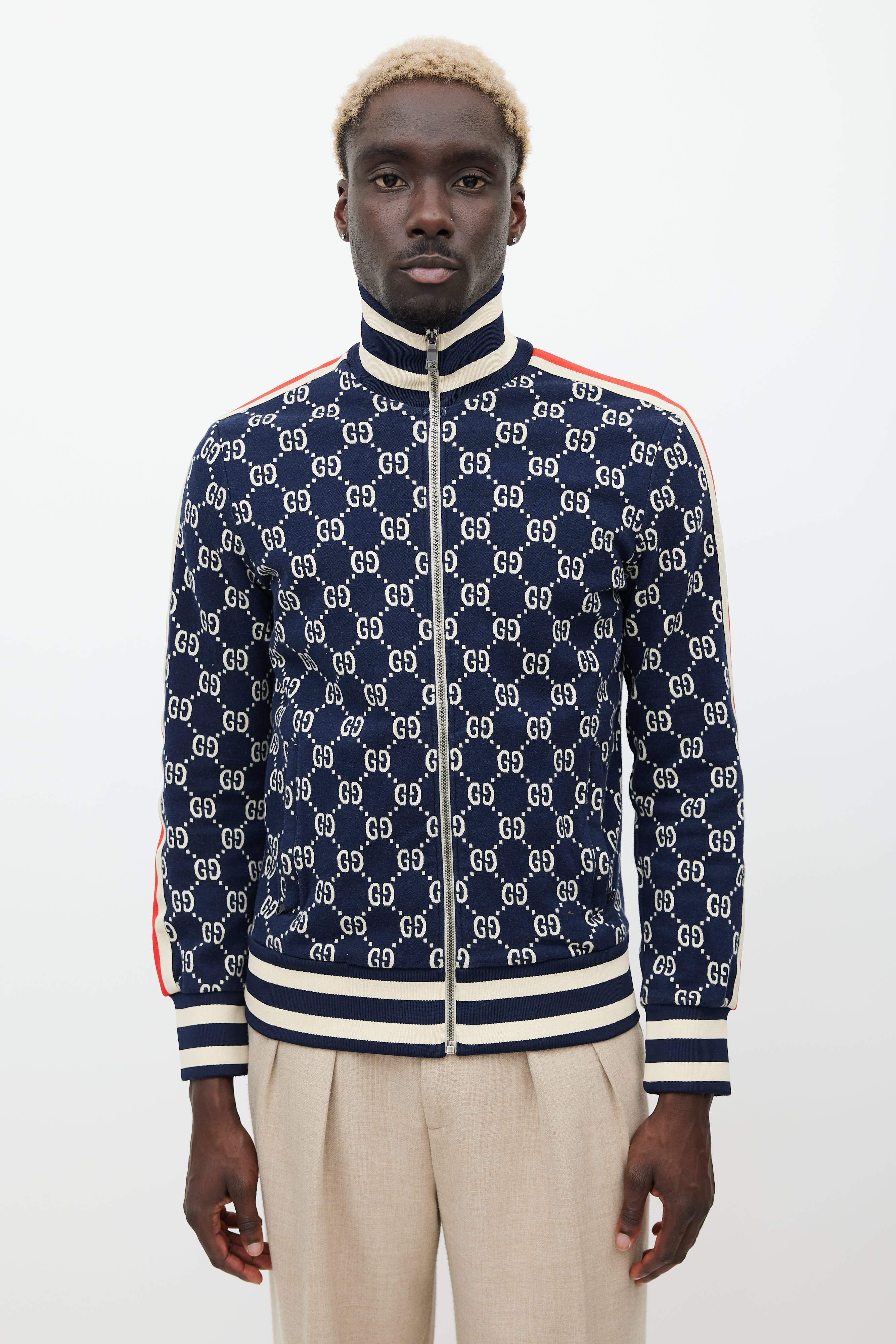 Pre-owned Gucci navy jacket featuring a mock neck collar, monogram pattern throughout, striped detailing at sides, two zip pockets at hip, ribbed hem, and zip closure.