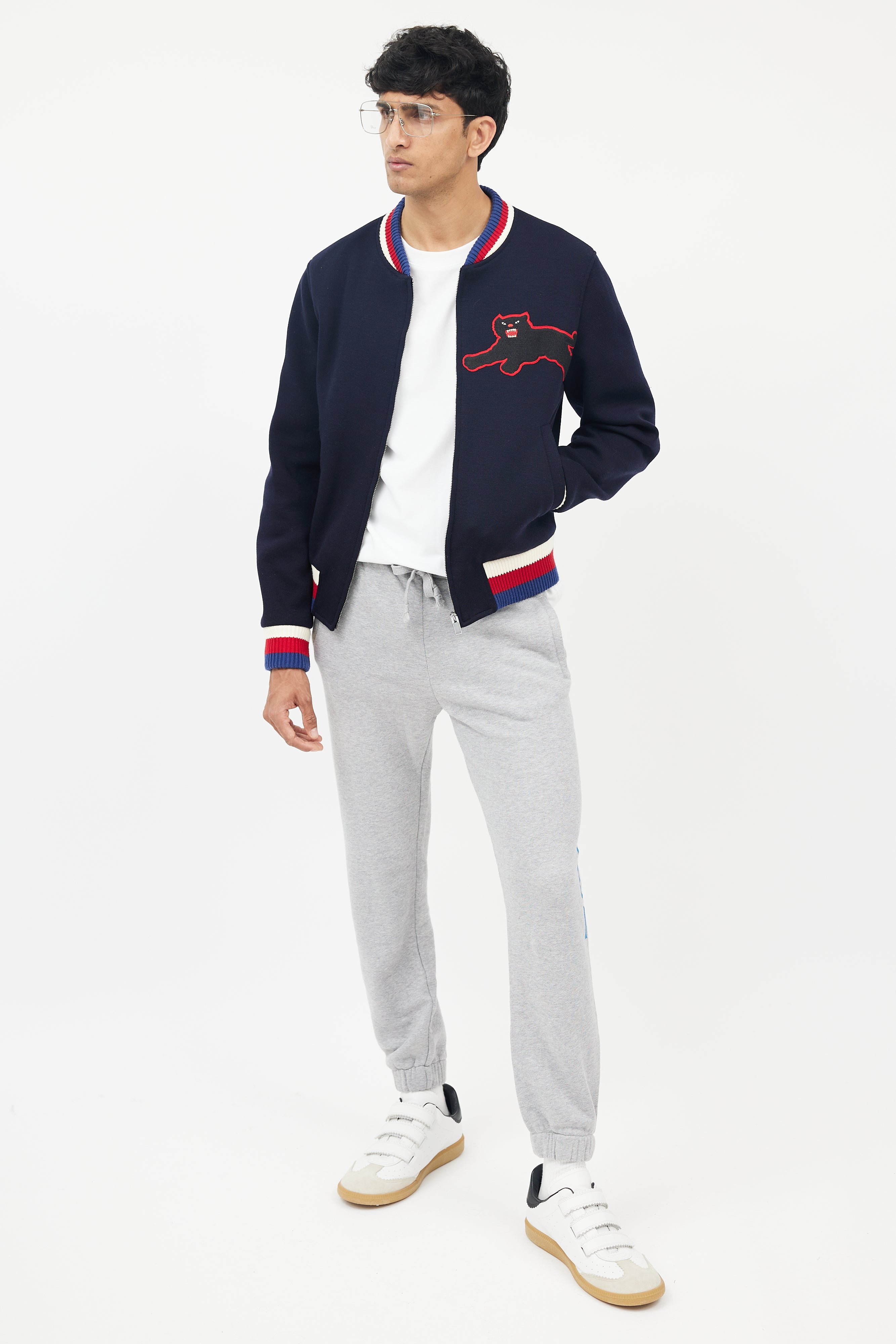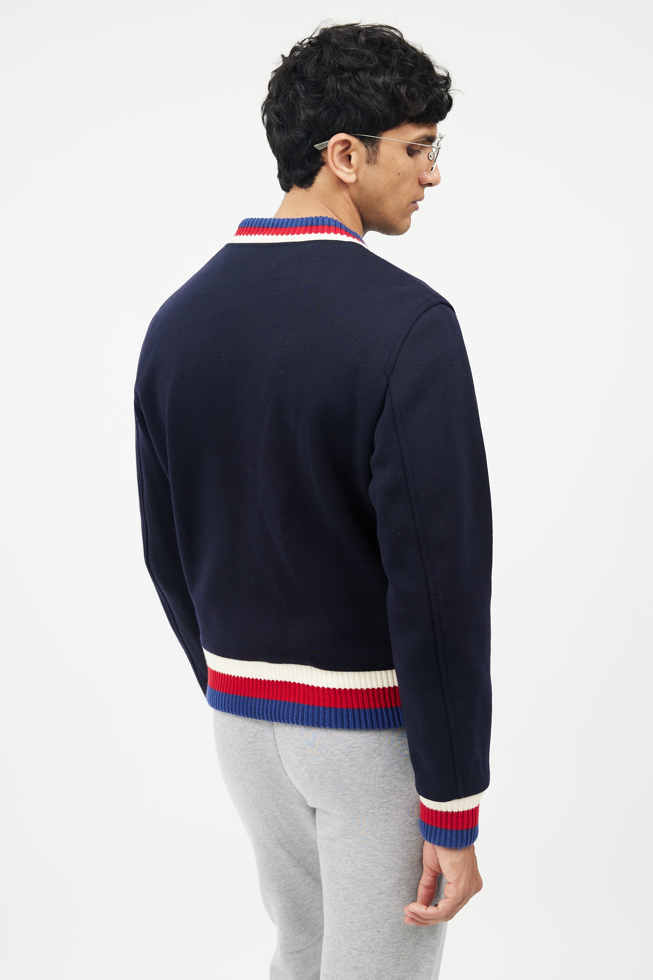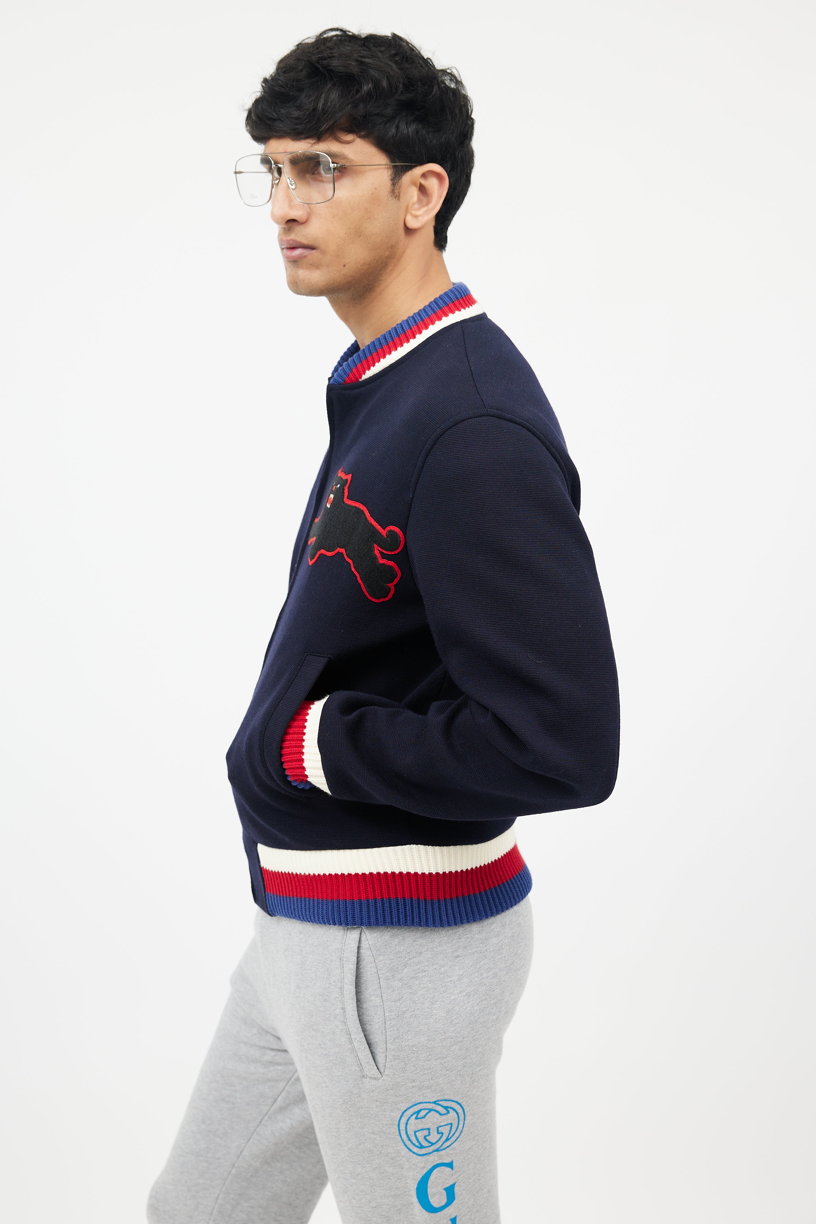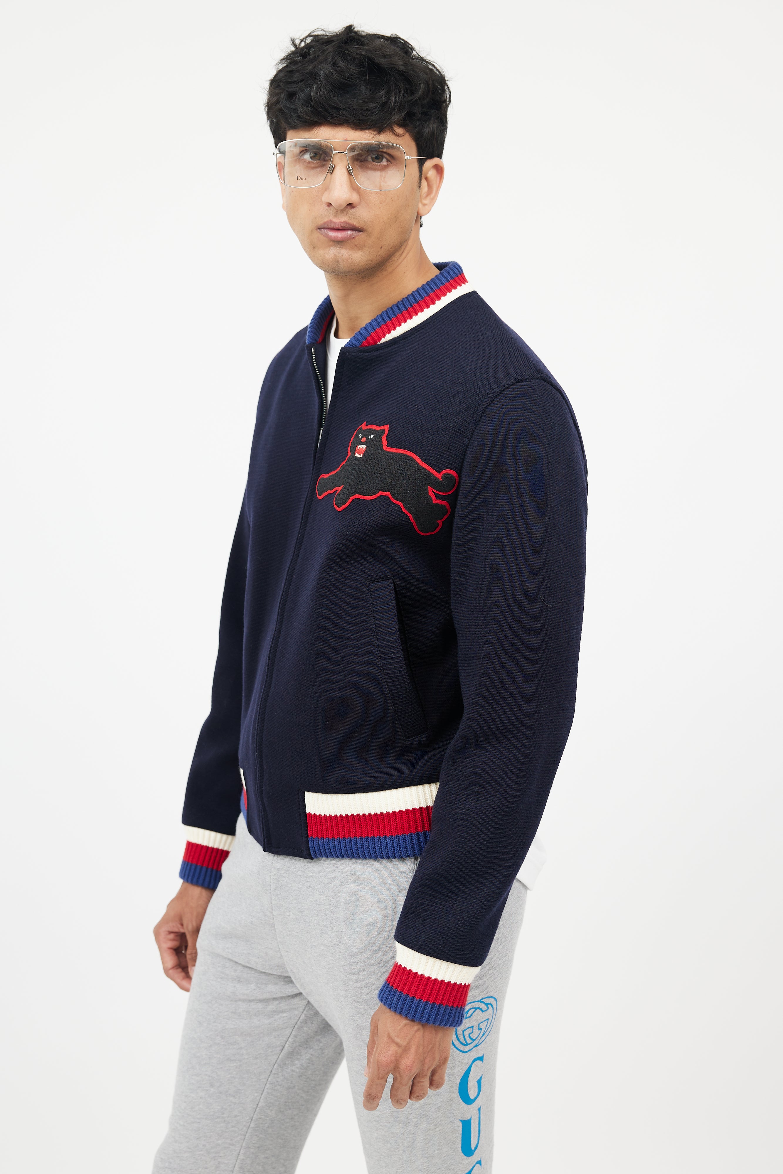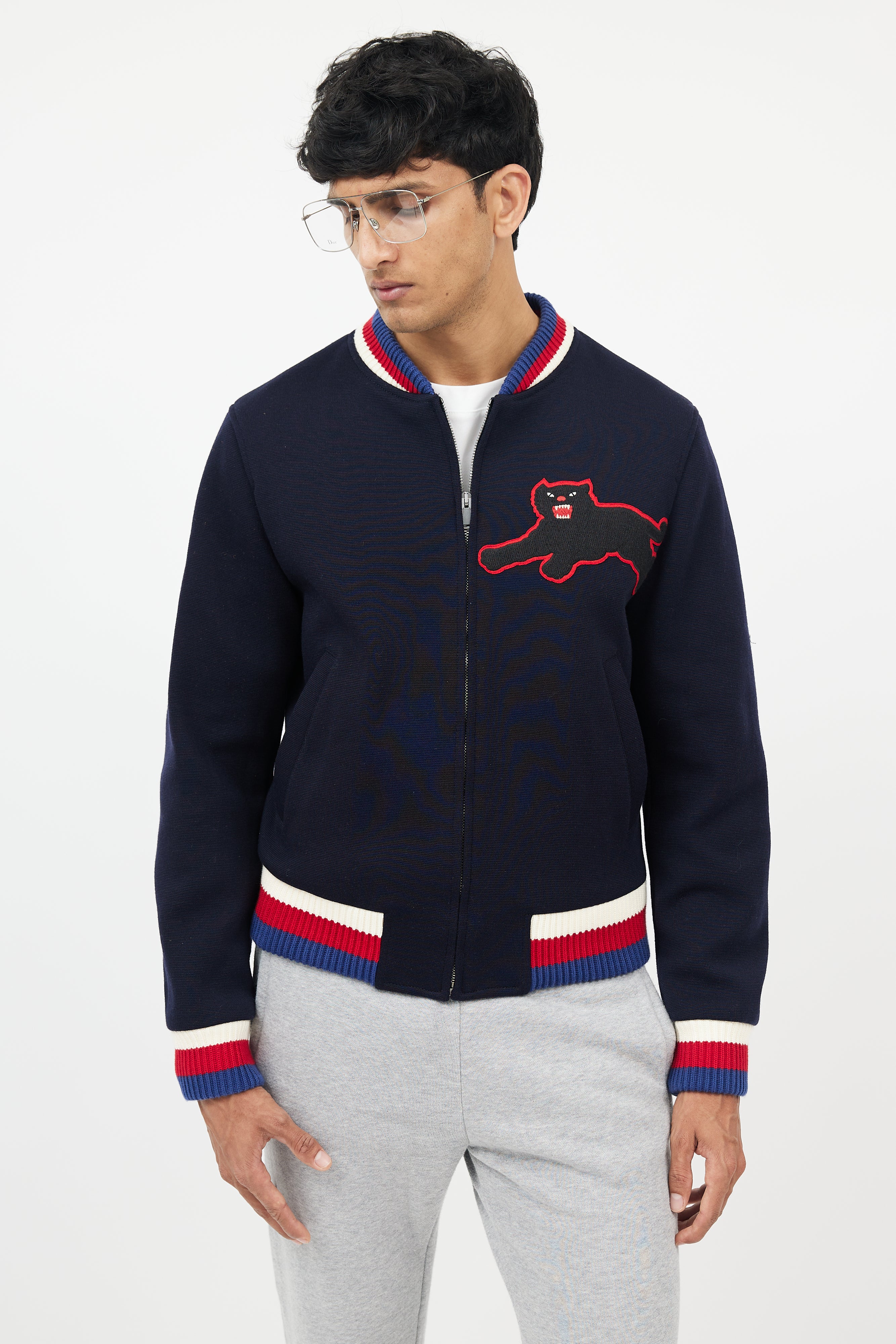 Pre-owned Gucci navy wool bomber jacket featuring a ribbed striped shawl collar, embroidered Cat logo patch at chest, two slip pockets at hip, ribbed hem, and zip closure. Lined.