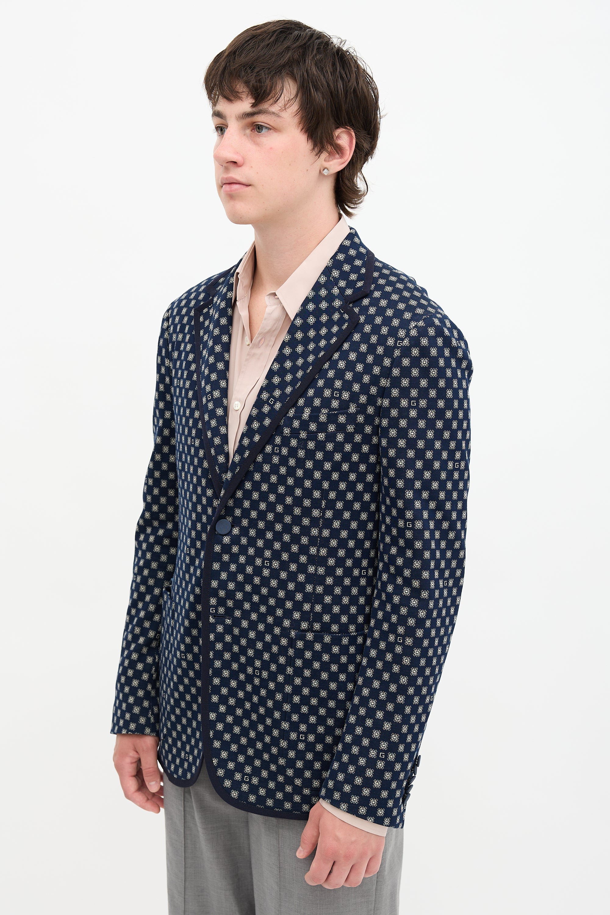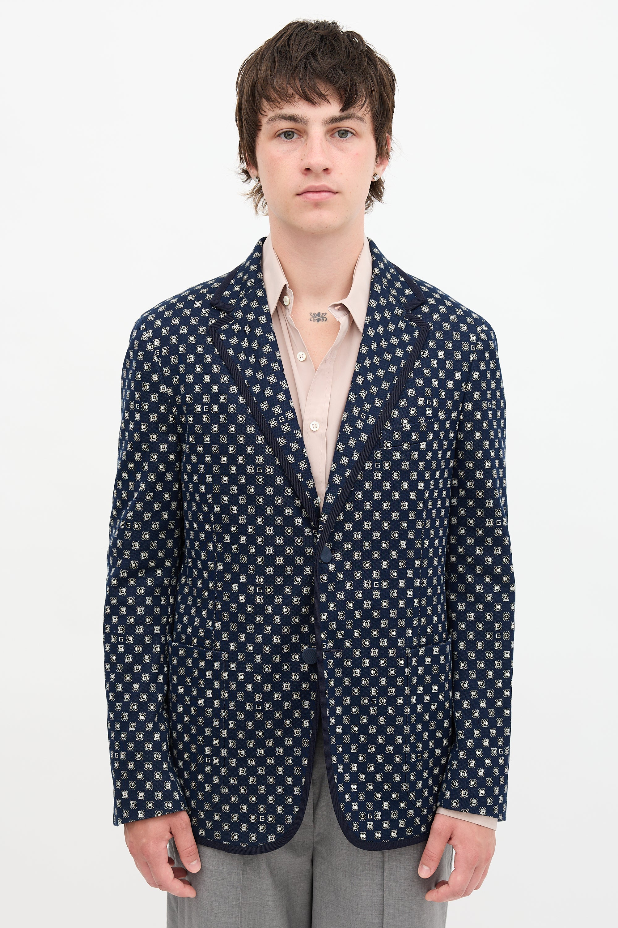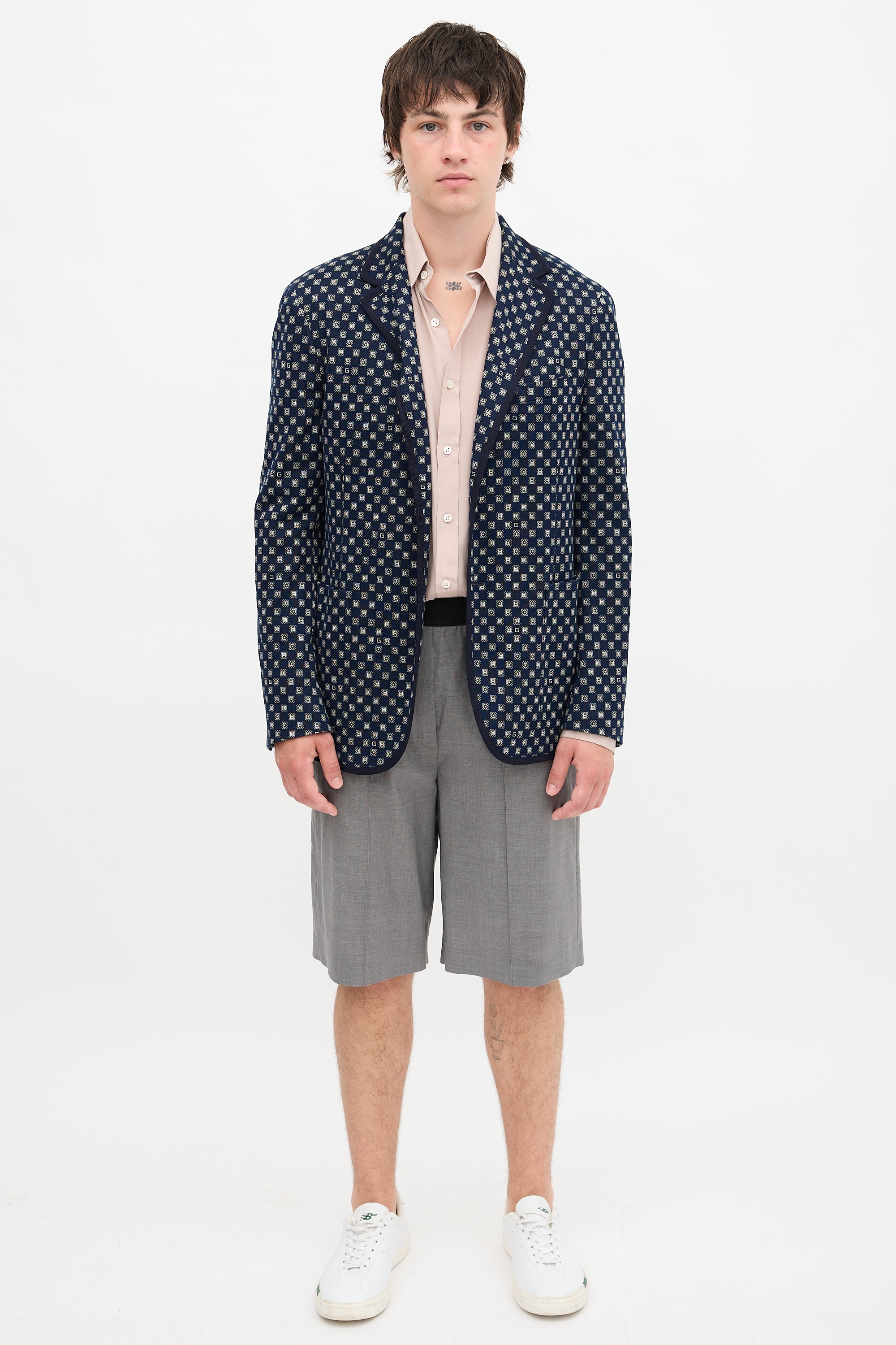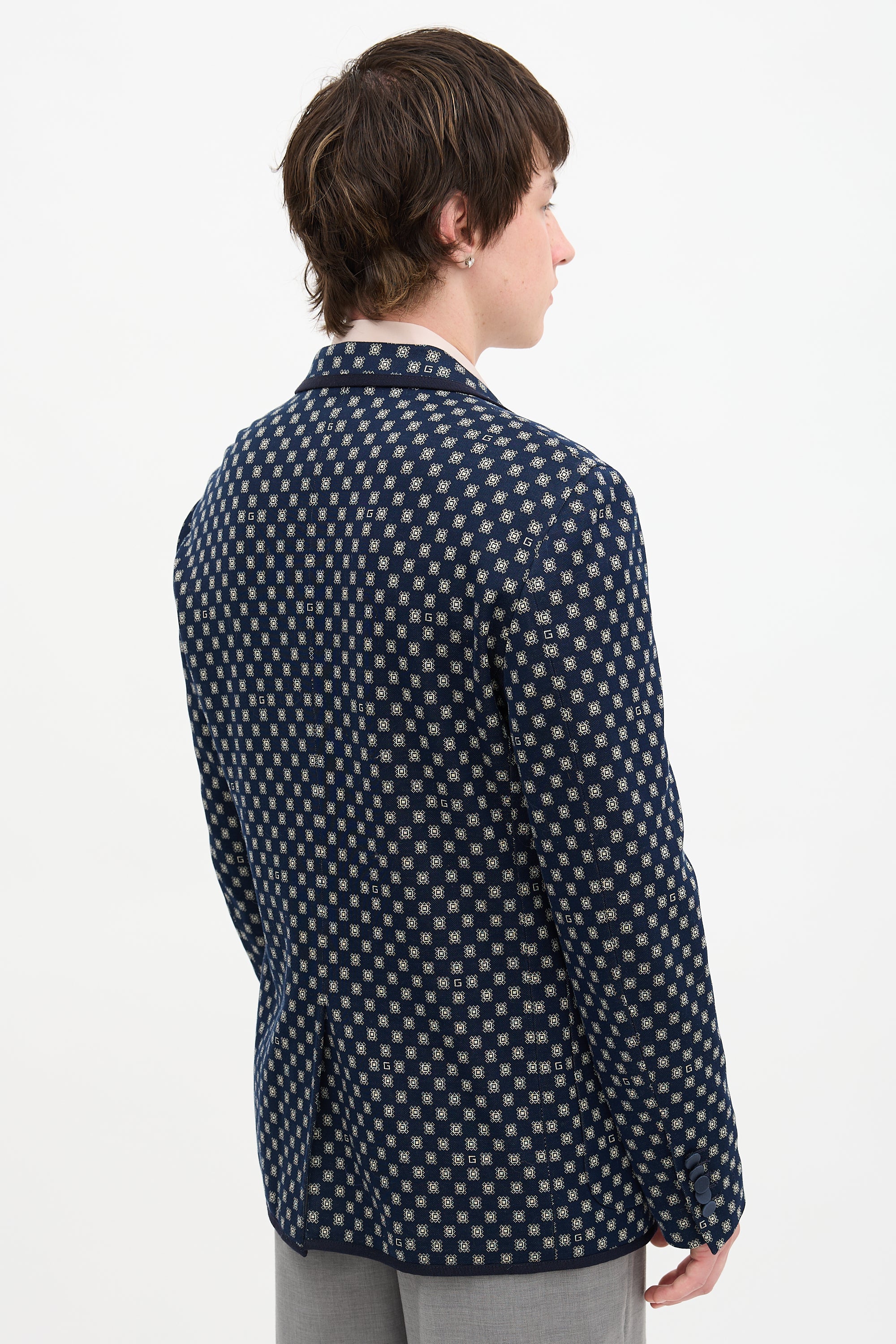 Pre-owned Gucci navy knit blazer featuring a notched lapel with grosgrain trims, cream square pattern with logo, one welt pocket at chest, two patch pockets, back vent, and buttoned cuffs. Lined.
