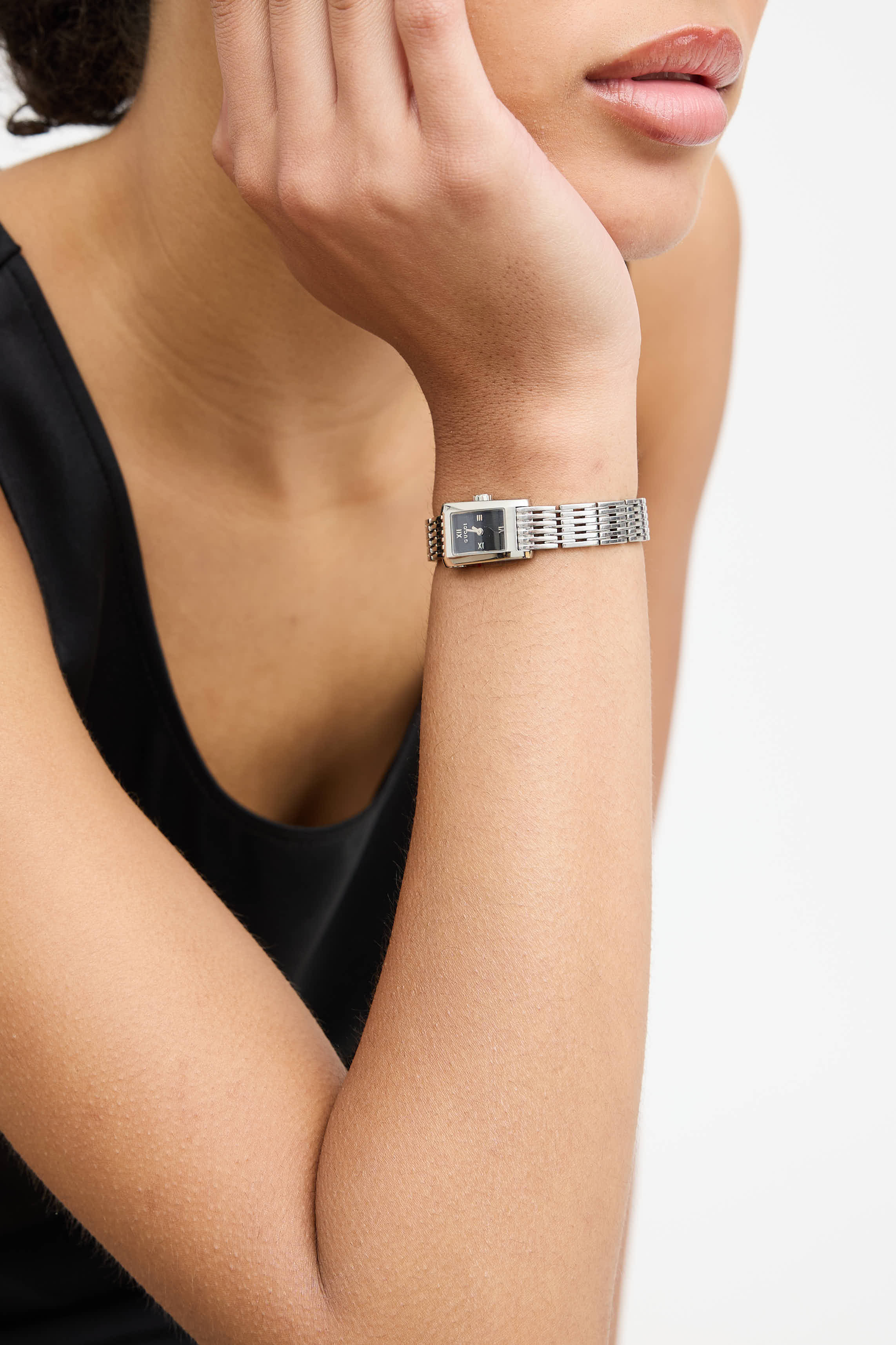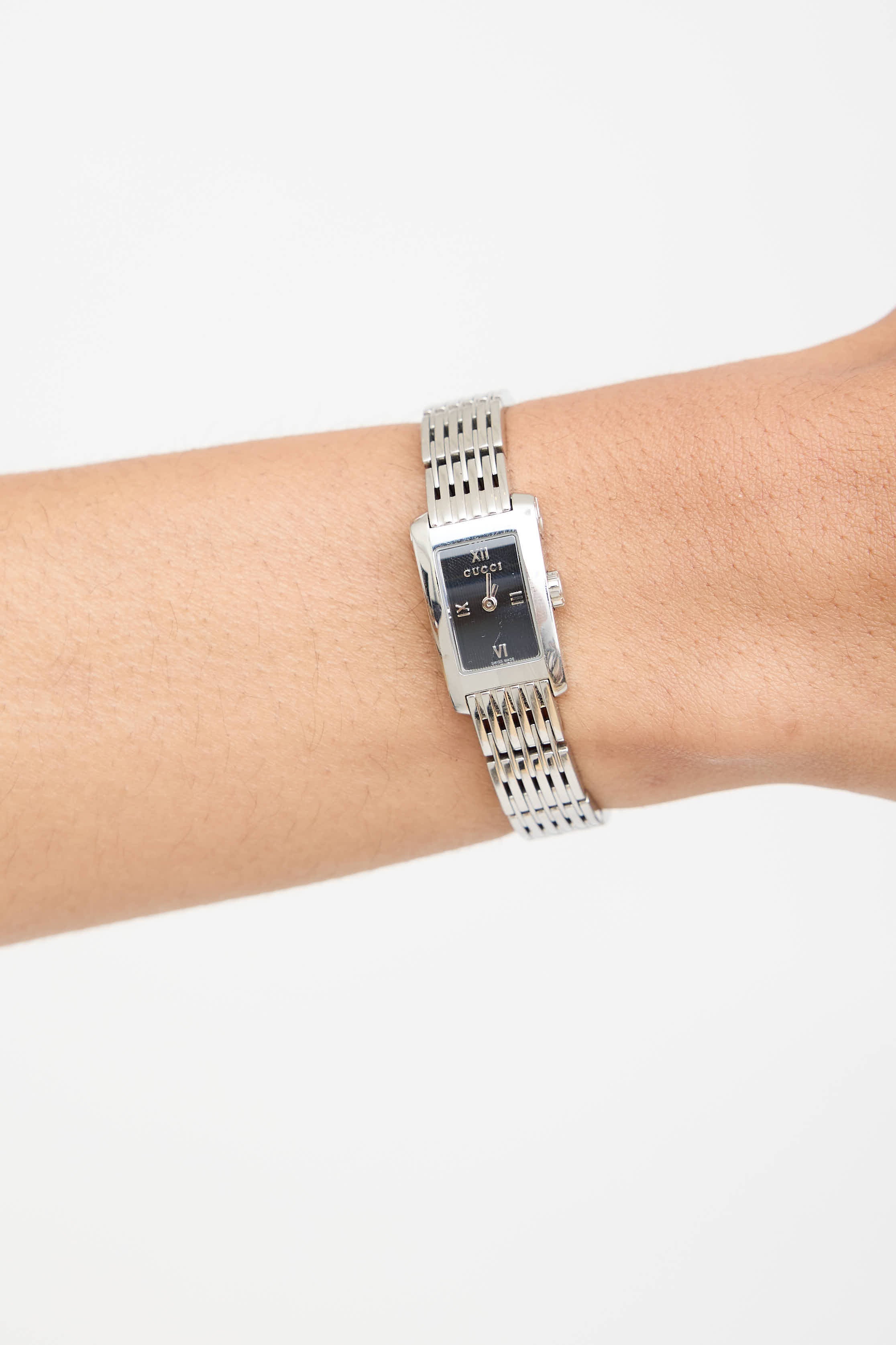 Pre-owned Gucci stainless steel 8600L watch featuring a 15mm case, black face with logo detailing, quartz movement, link band, and deployant clasp closure.