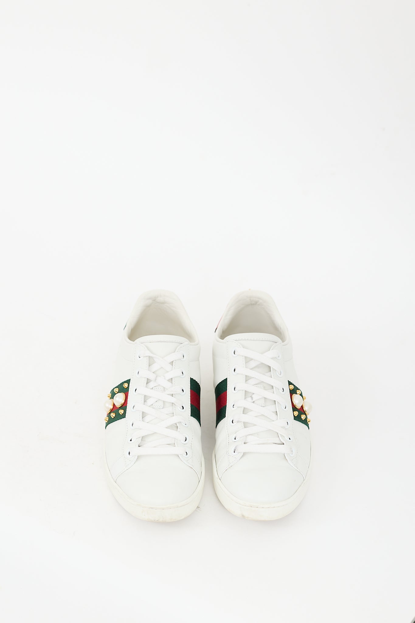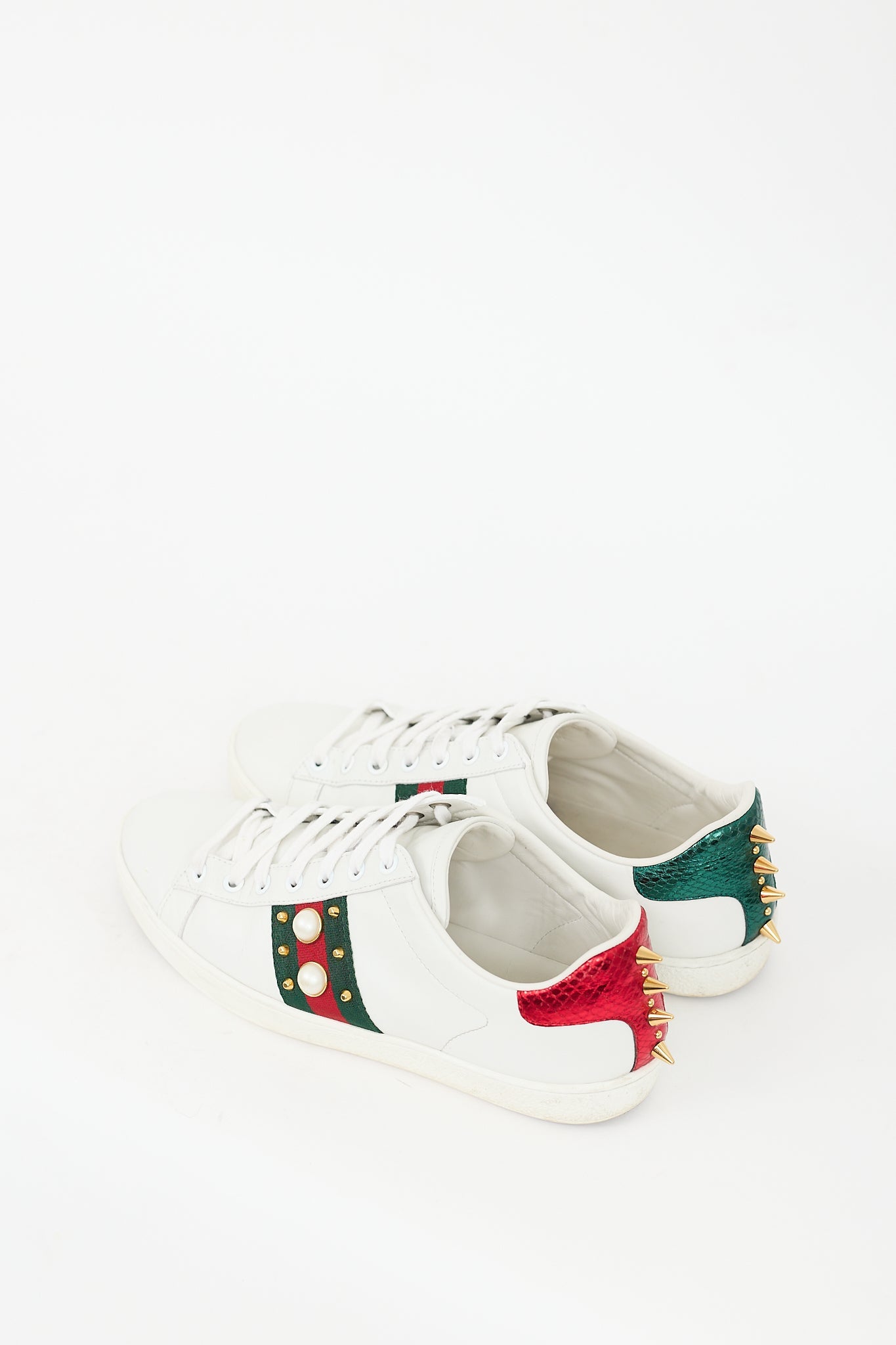 Pre-owned Gucci white Studded Ace sneakers featuring rounded toe, lace up front, signature red and green webbing at sides, gold tone studs and pearl embellishment at side and heel, metallic green right counter with snakeskin effect, and metallic red left counter with snakeskin effect. Comes with original dust bag and box.