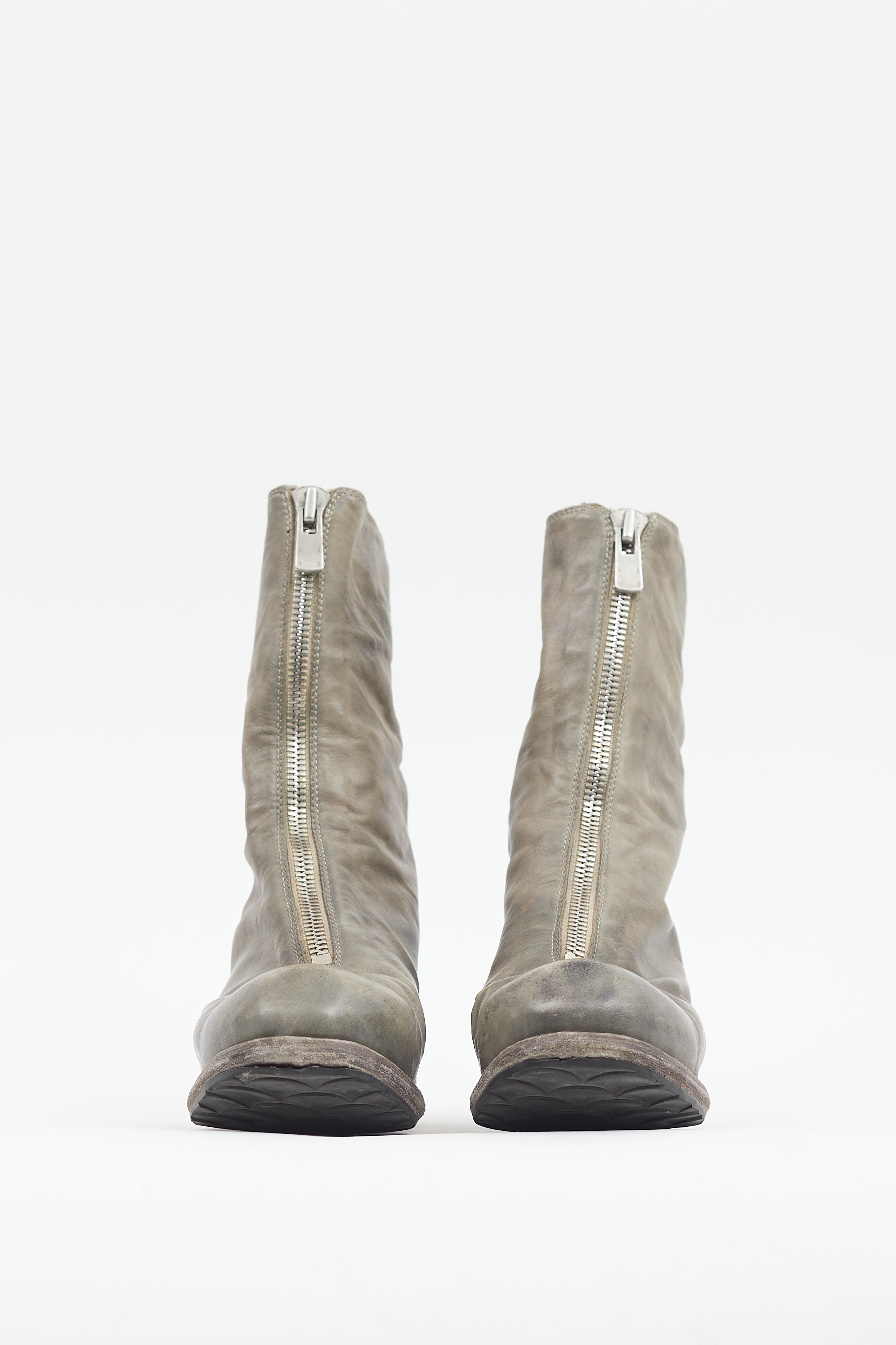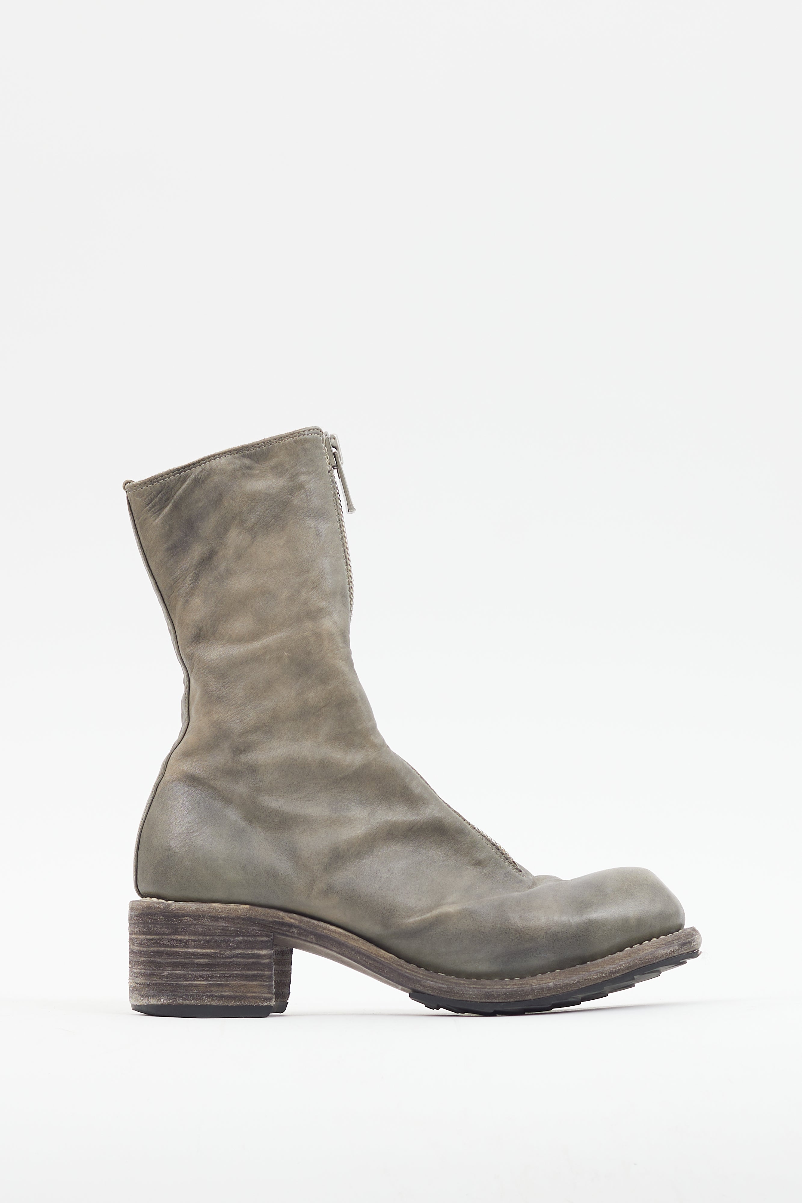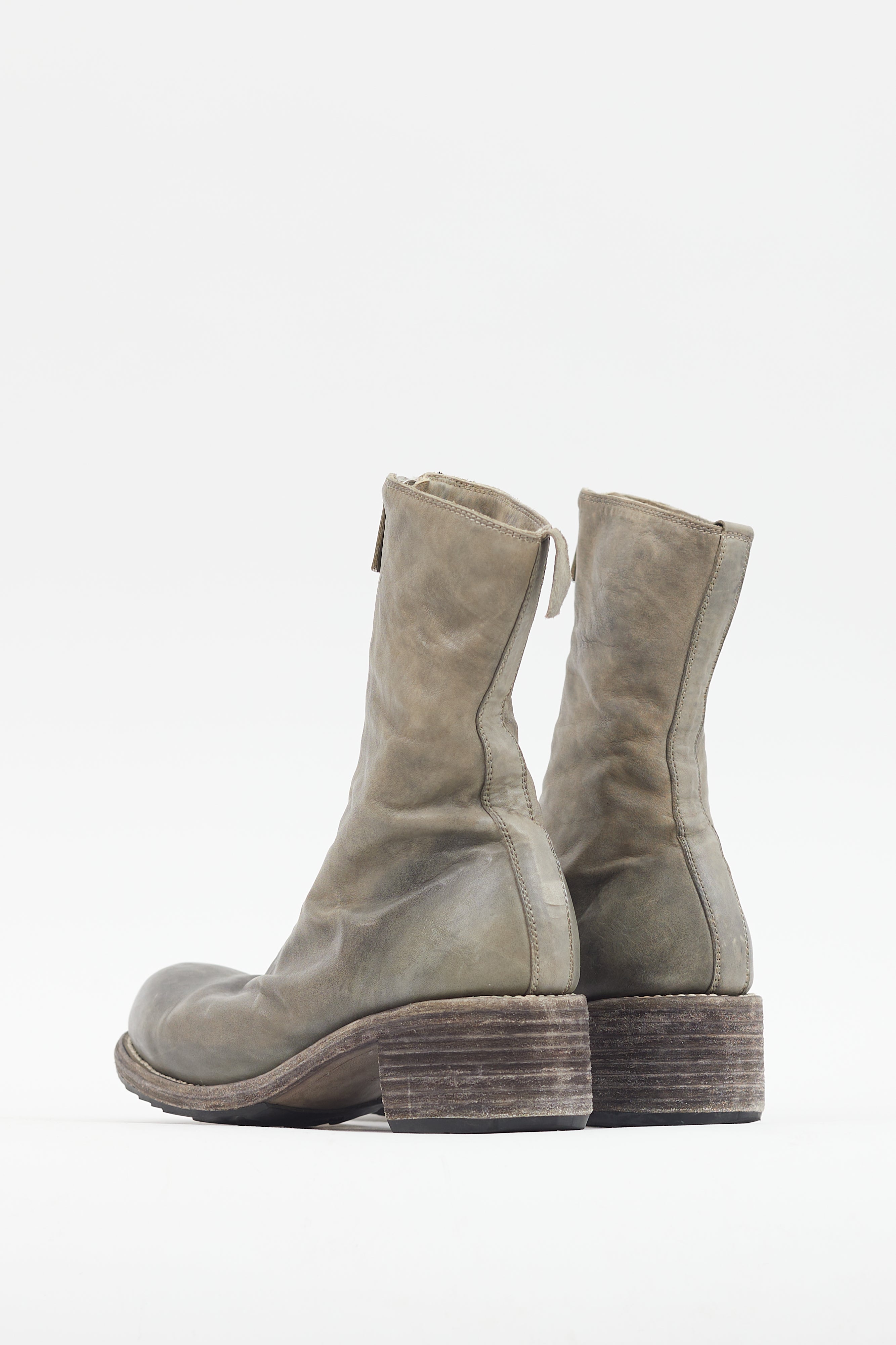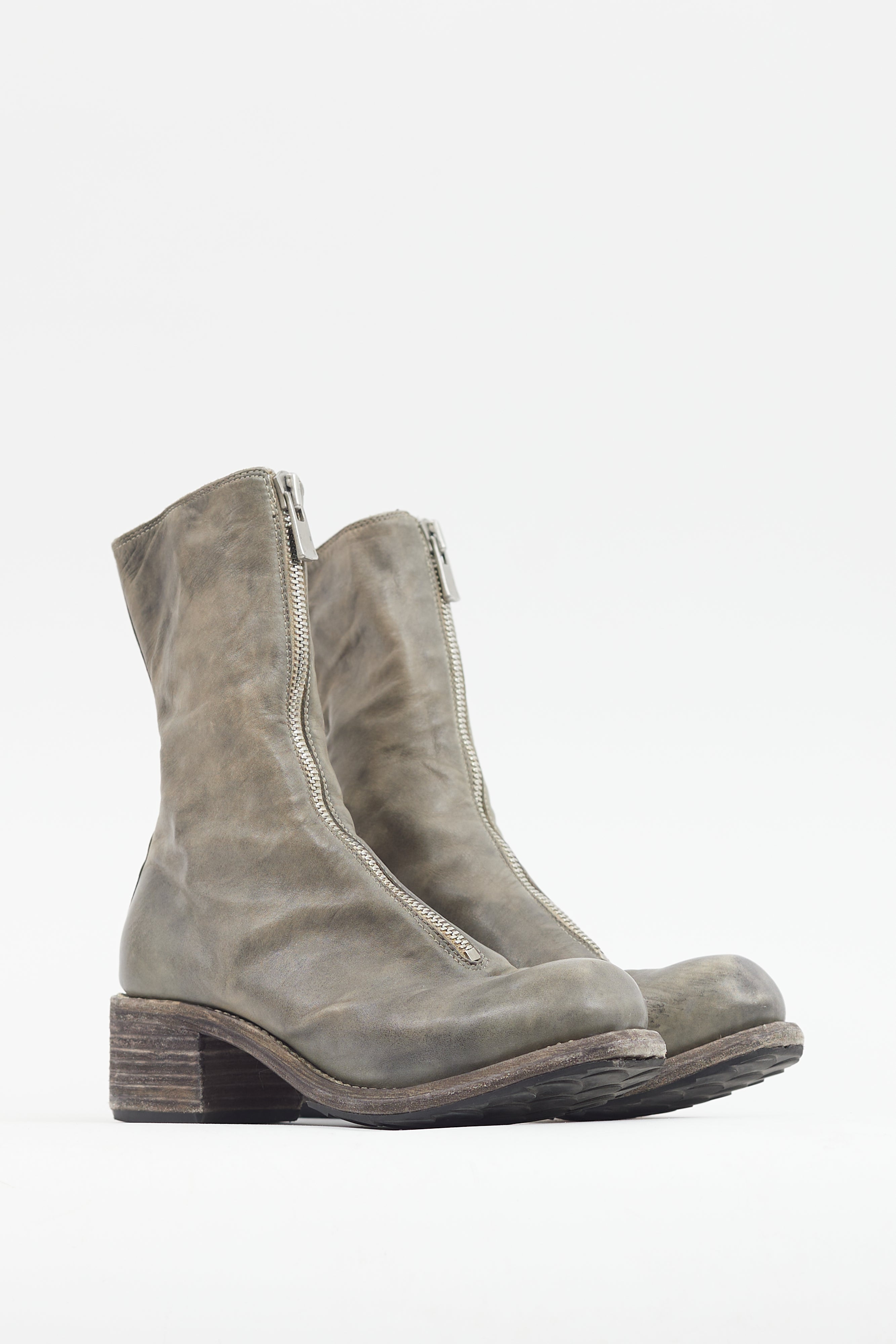 Pre-owned Guidi grey leather PL2 boots featuring a patina throughout, rounded toe with flattened toe box, silver tone front zip closure with logo engraving at pull tab, and tonal stacked heel.