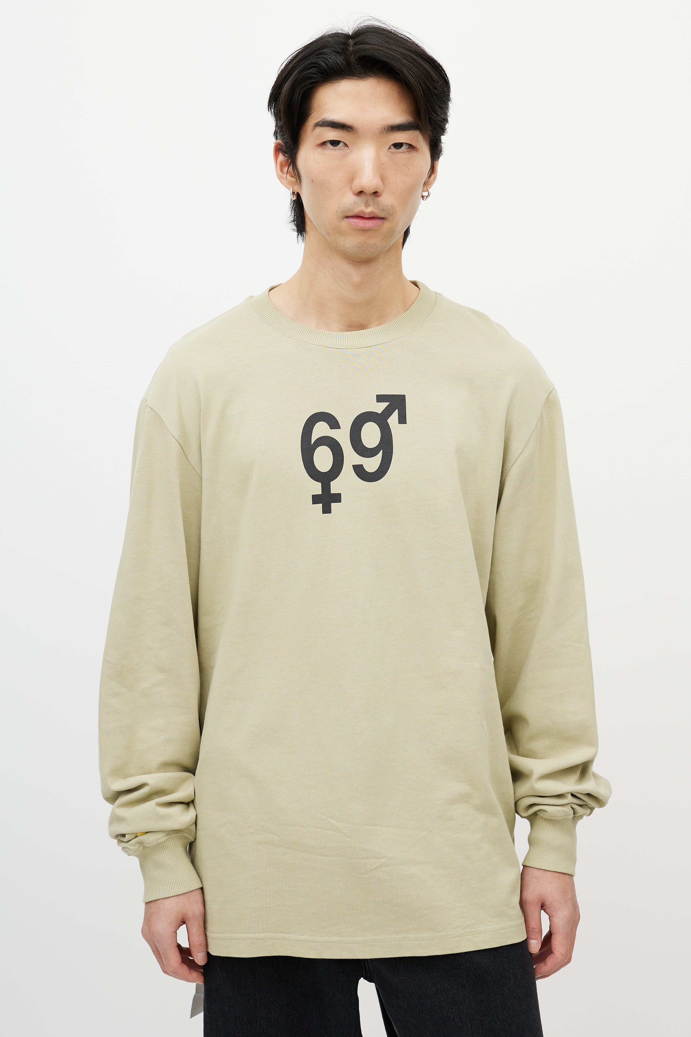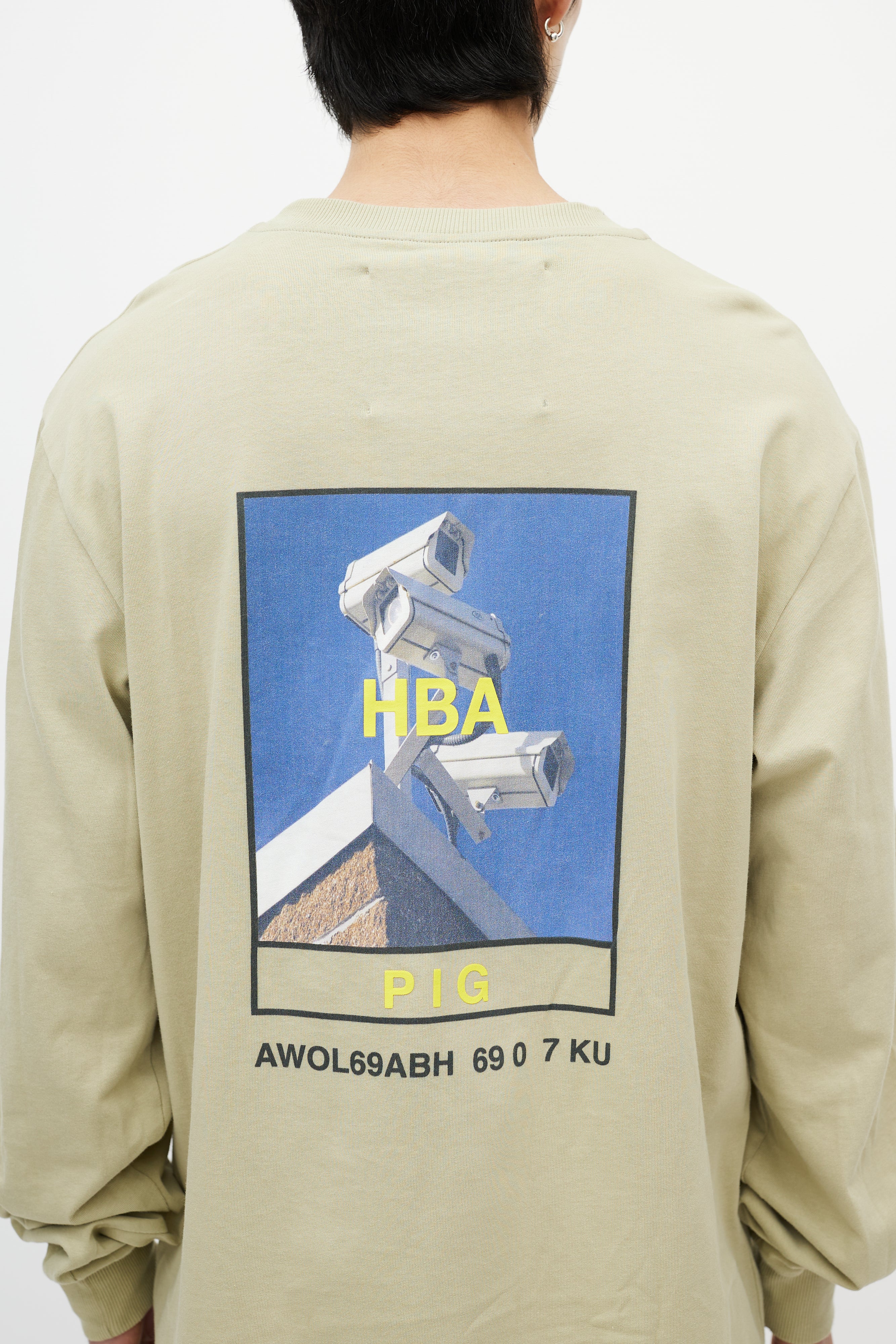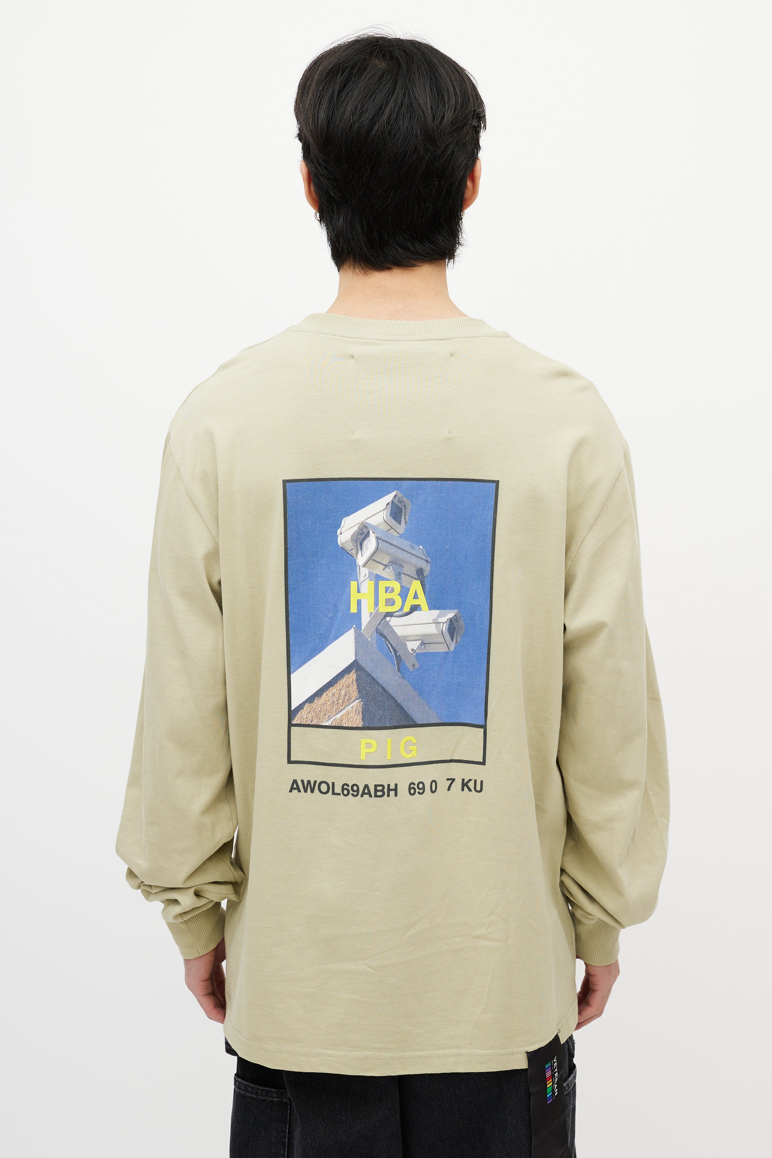 Pre-owned Hood By Air green top featuring a round neckline, multicolour 69 Security Camera print at front and back, long sleeves, and logo tab at side.