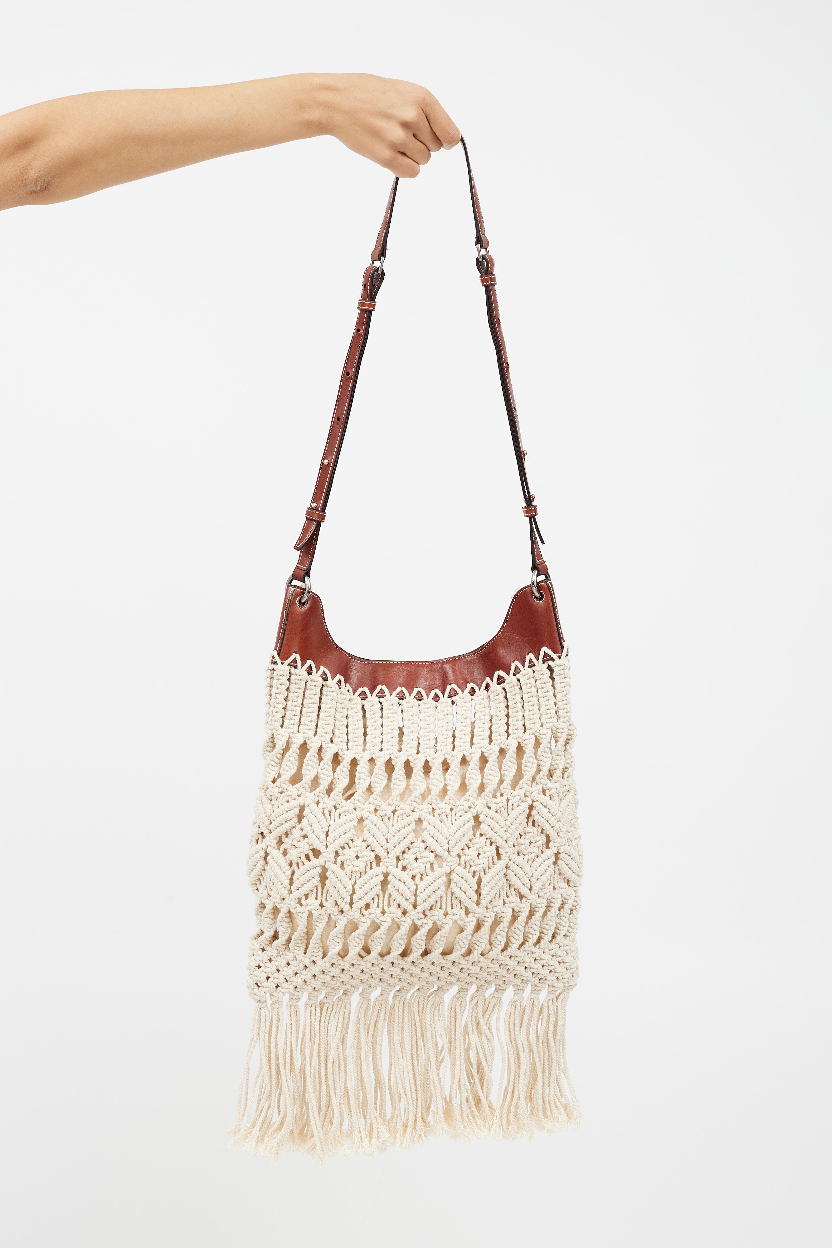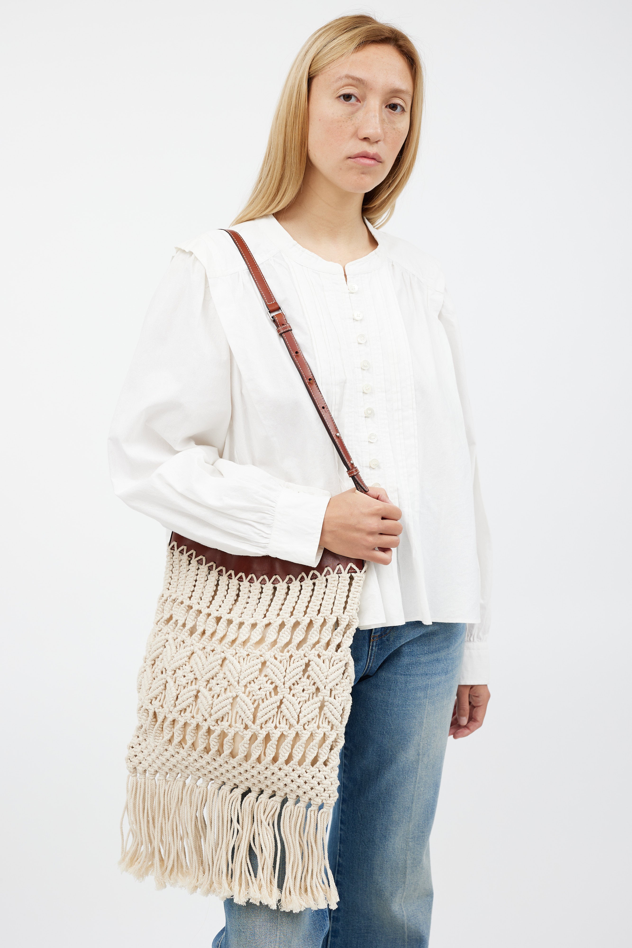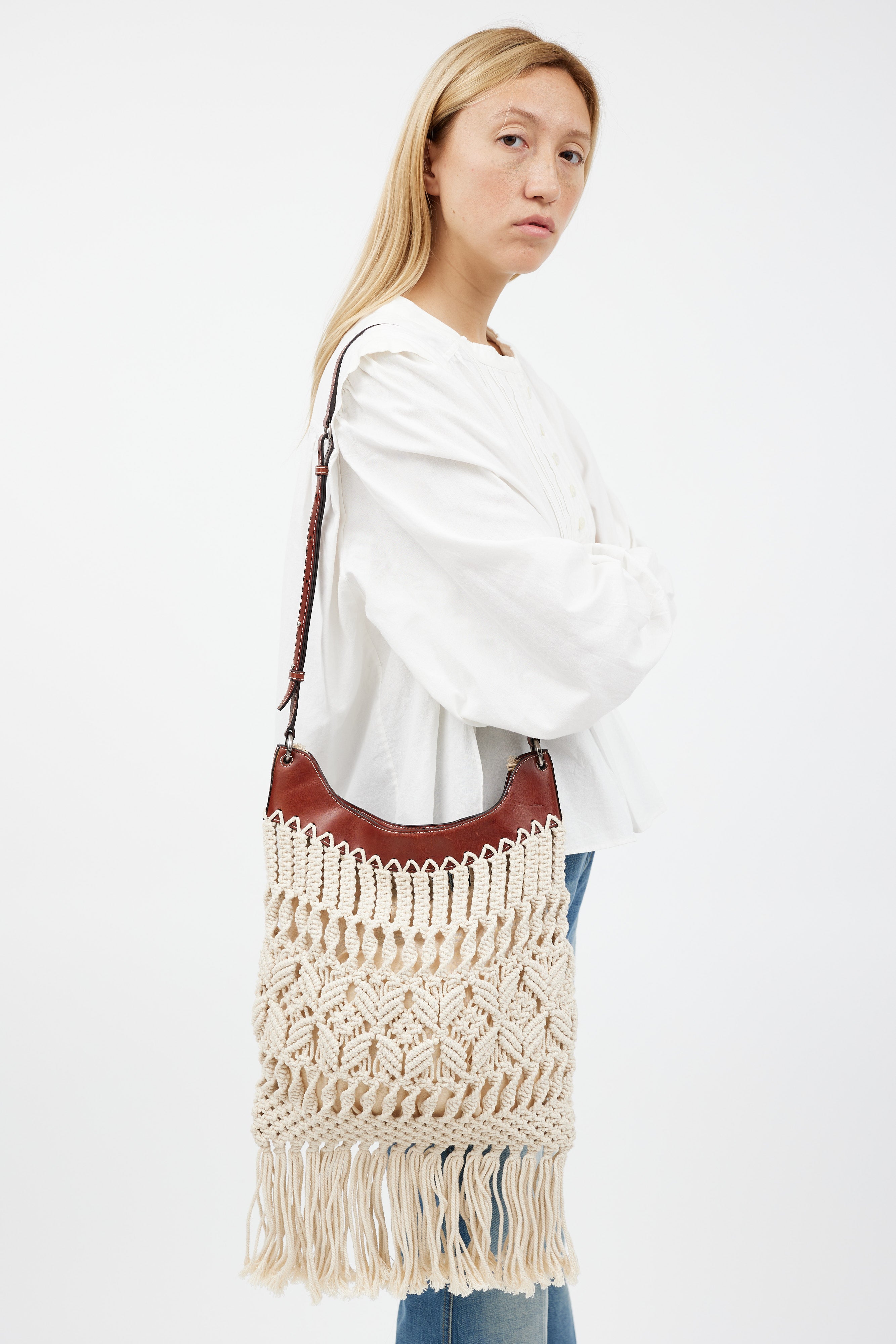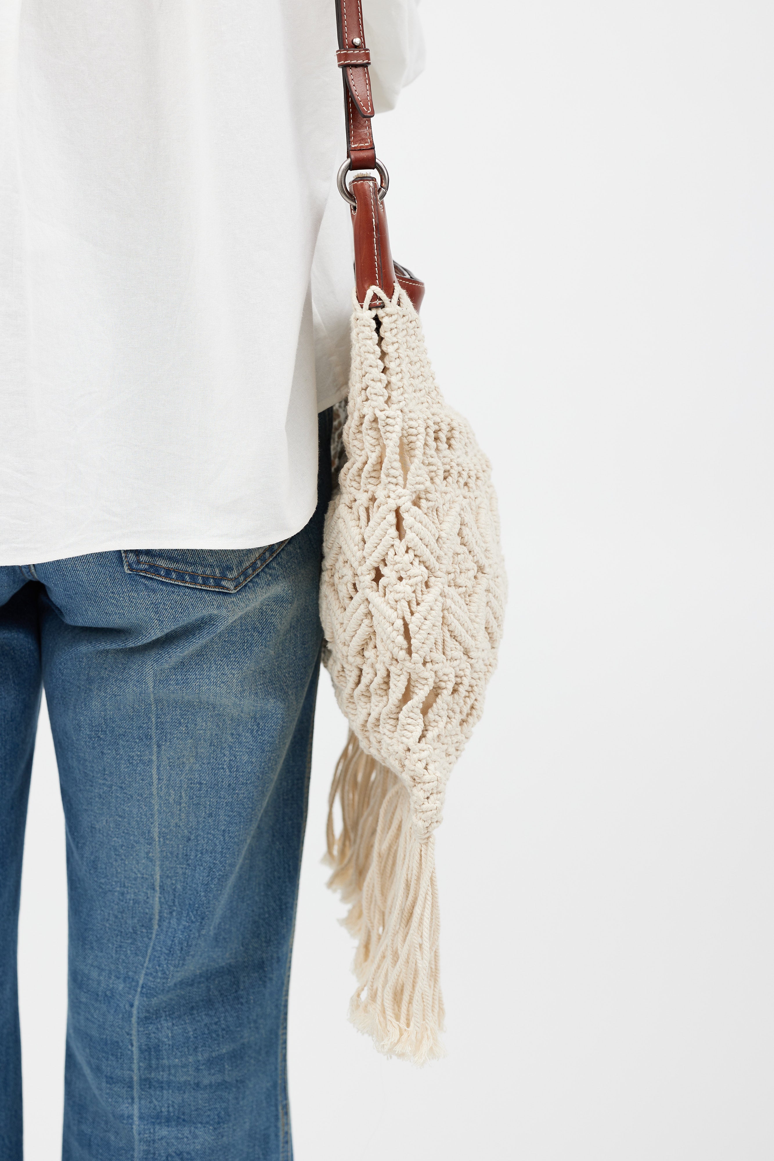 Pre-owned Isabel Marant cream Teomia shoulder bag featuring macrame detailing, one main inner sack compartment, fringe trim, brown leather shoulder strap, and top snap closure. Comes with original dust bag.