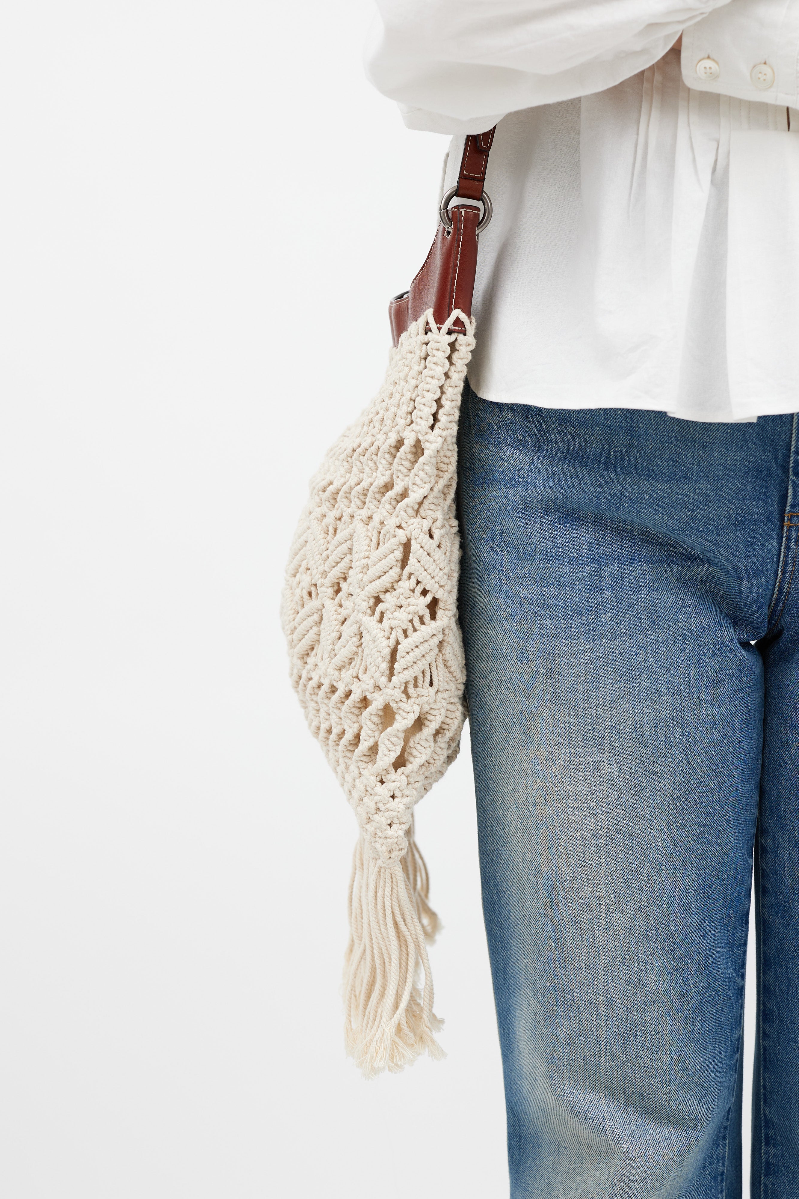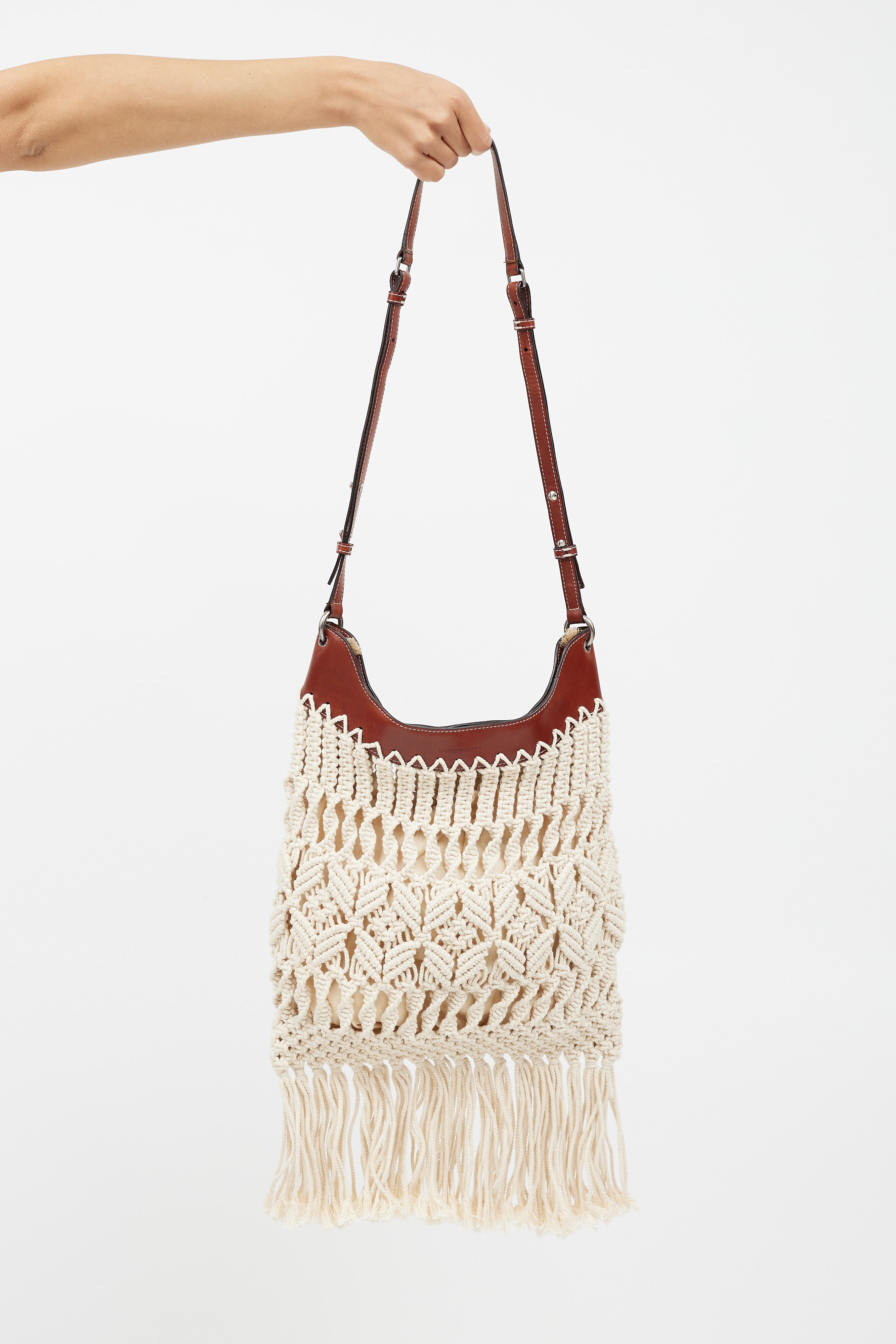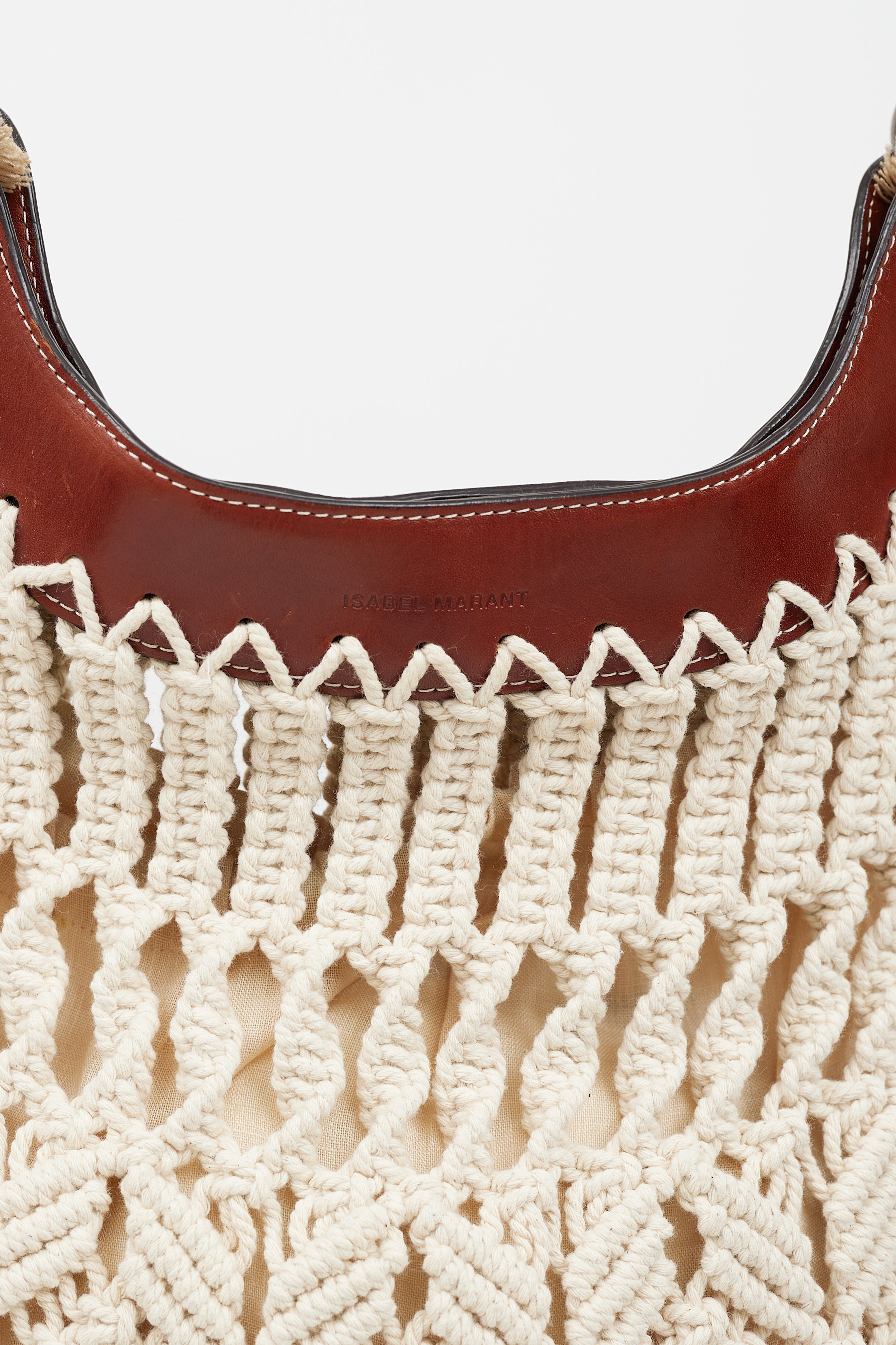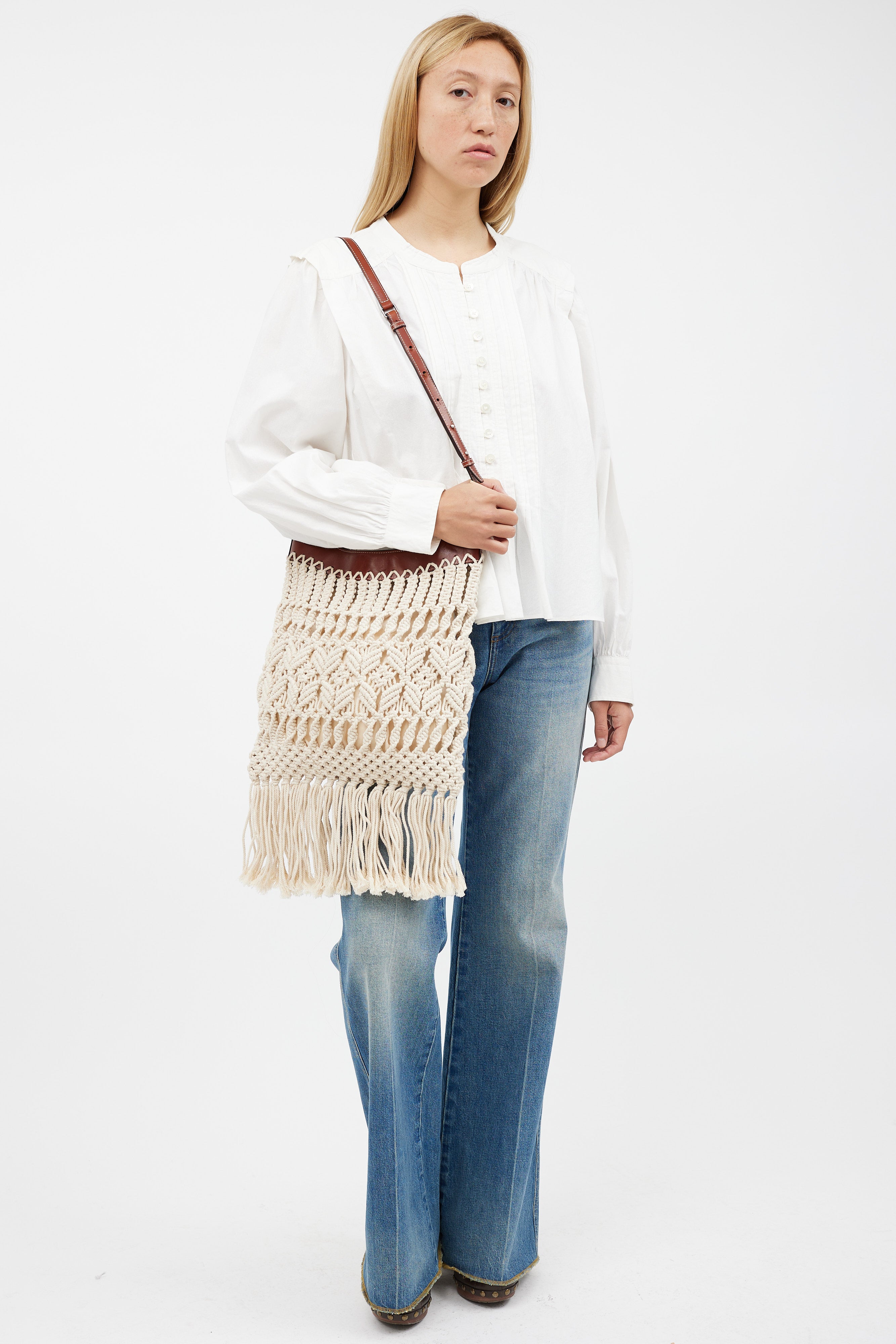Pre-owned Isabel Marant cream Teomia shoulder bag featuring macrame detailing, one main inner sack compartment, fringe trim, brown leather shoulder strap, and top snap closure. Comes with original dust bag.
