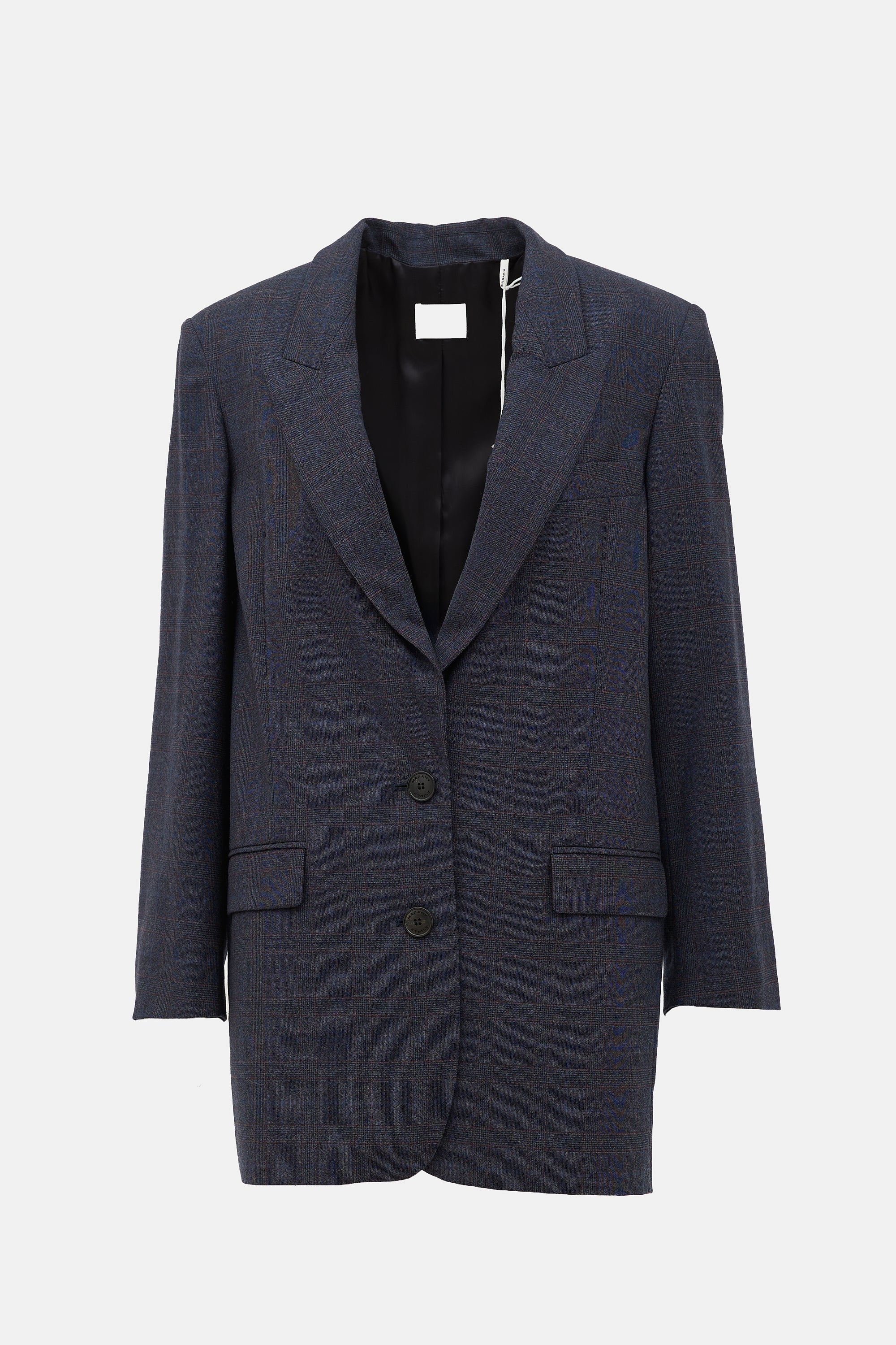 Isabel Marant Étoile navy Precious blazer featuring peak lapel, checked pattern, one chest pocket, two flap pockets, button front, and buttoned cuffs. Lined.