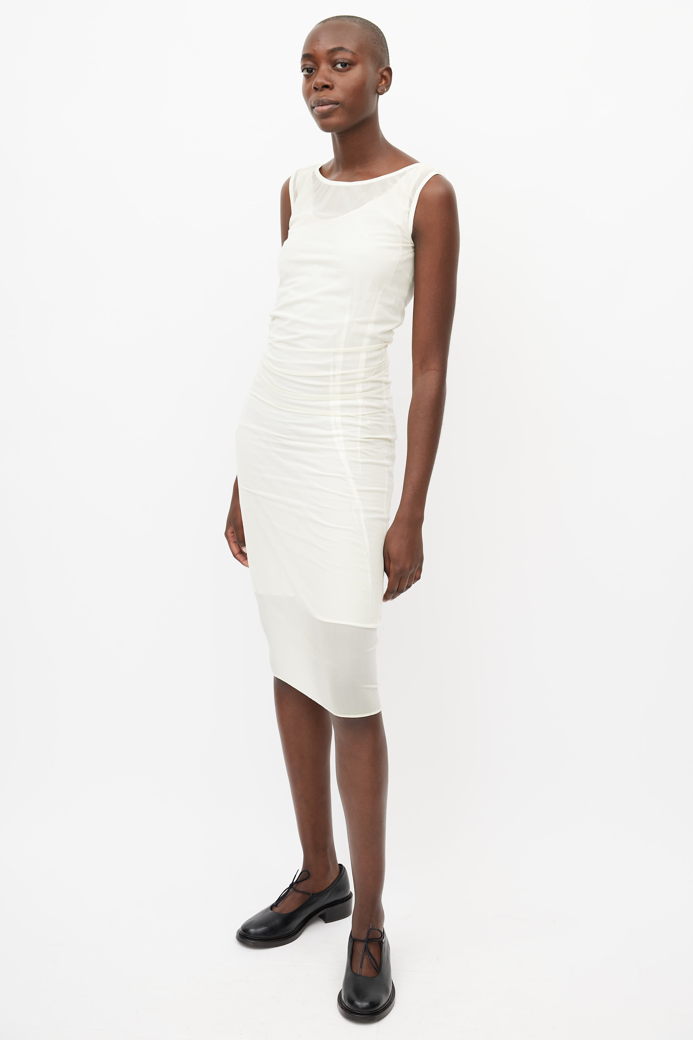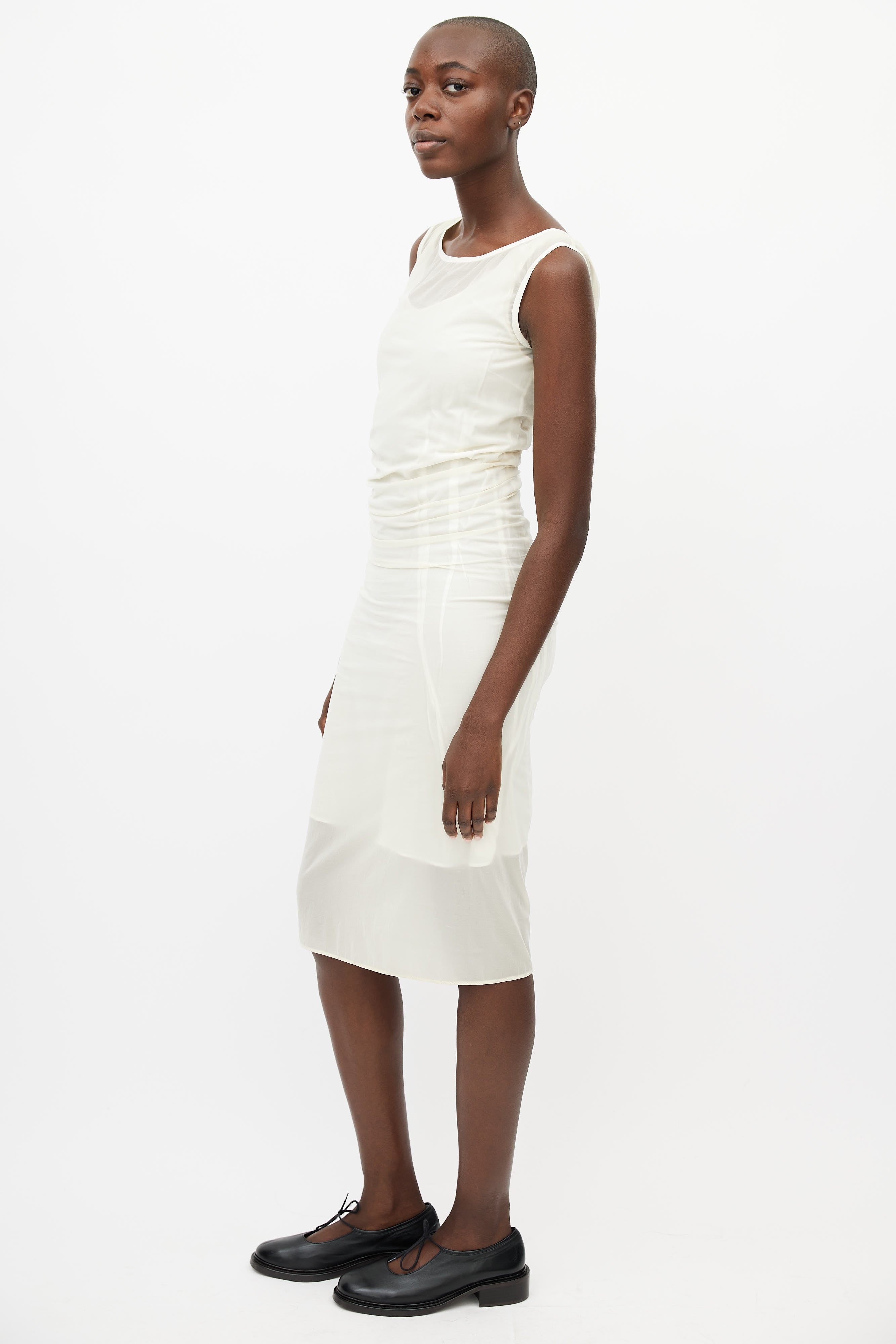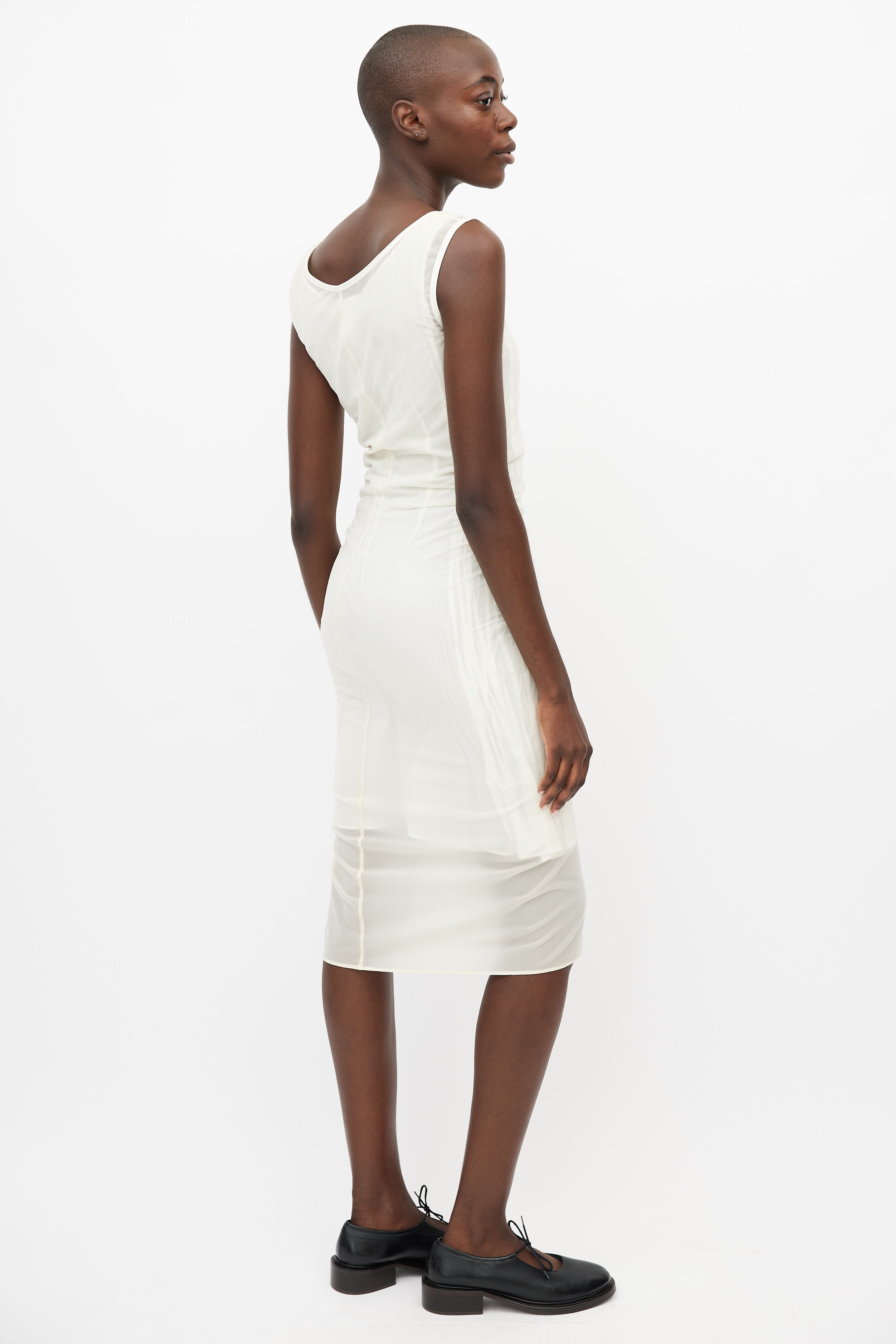 Pre-owned Issey Miyake white dress featuring a scoop neckline, sheer overlay, and attached interior slip.