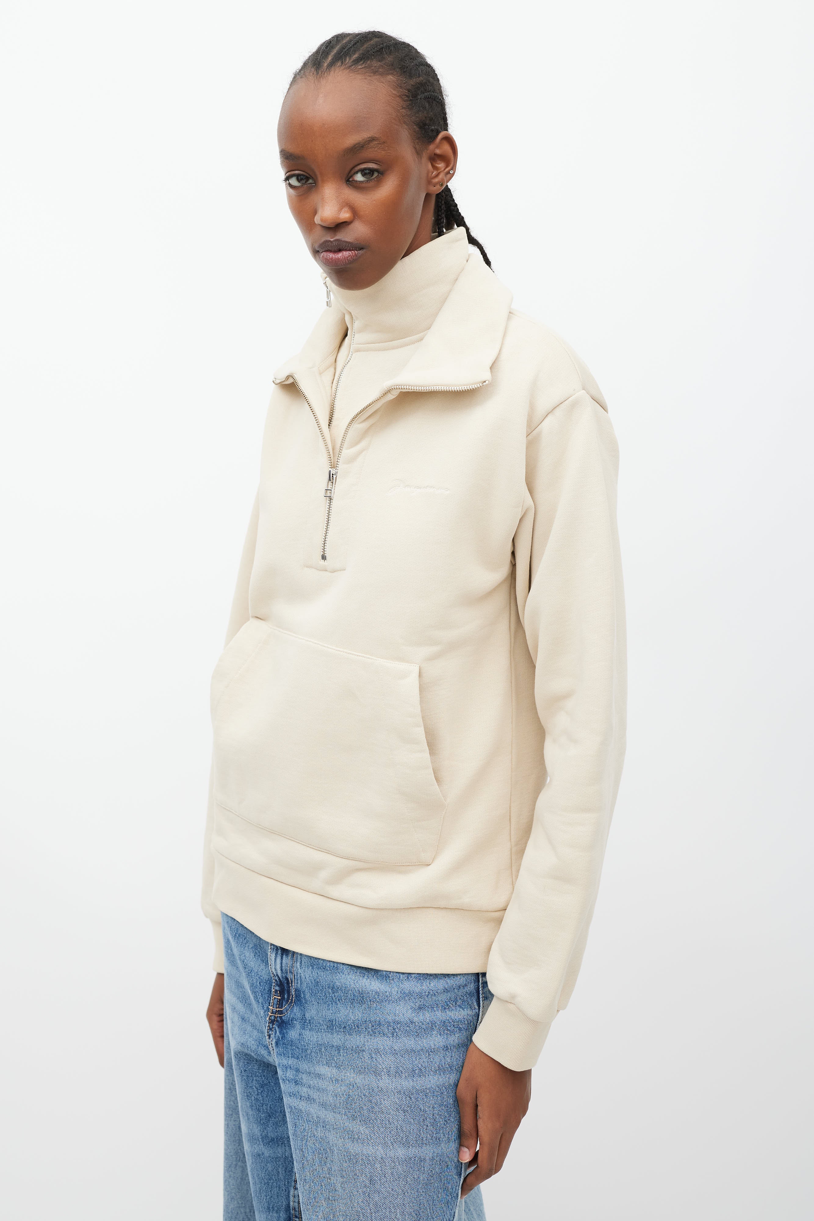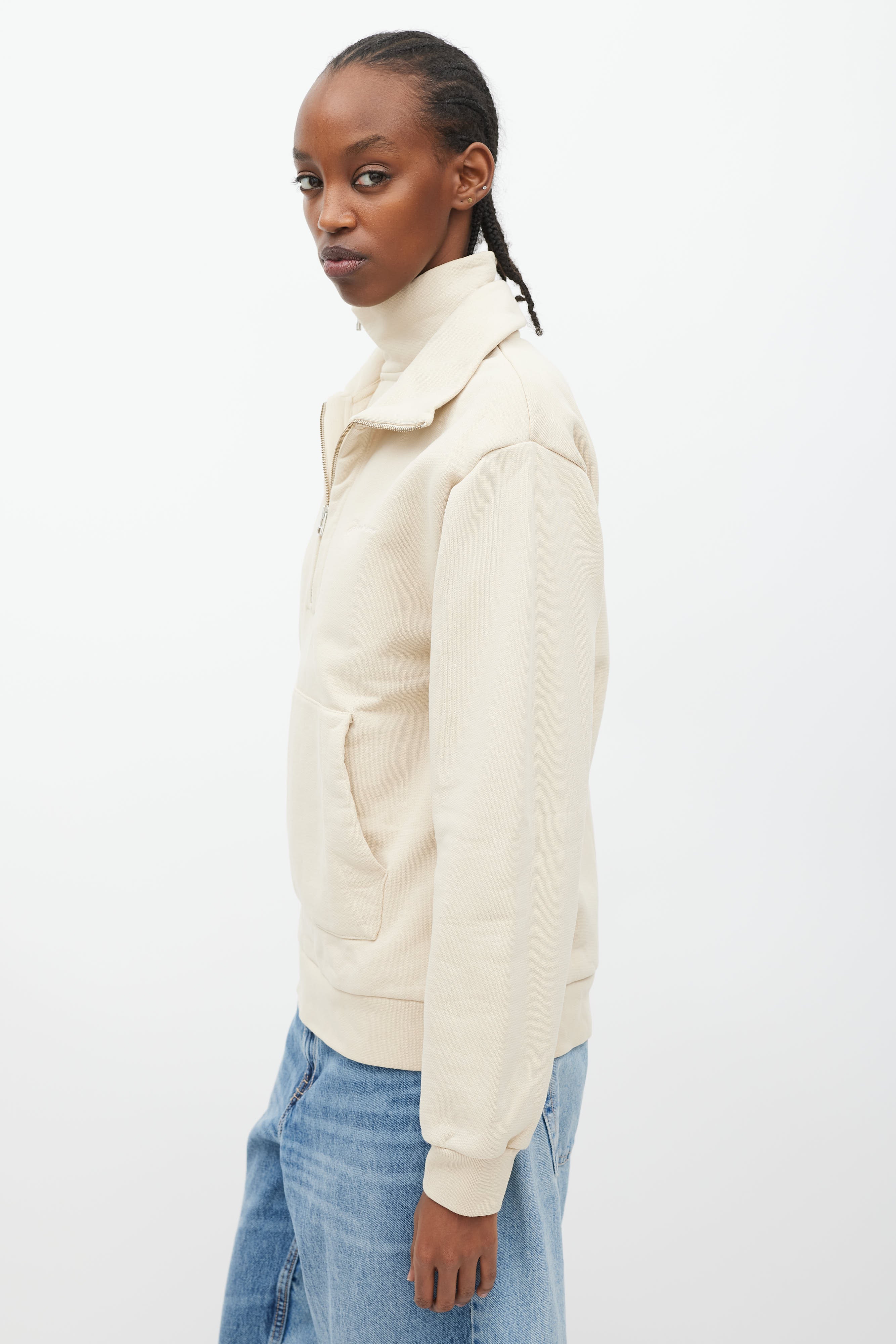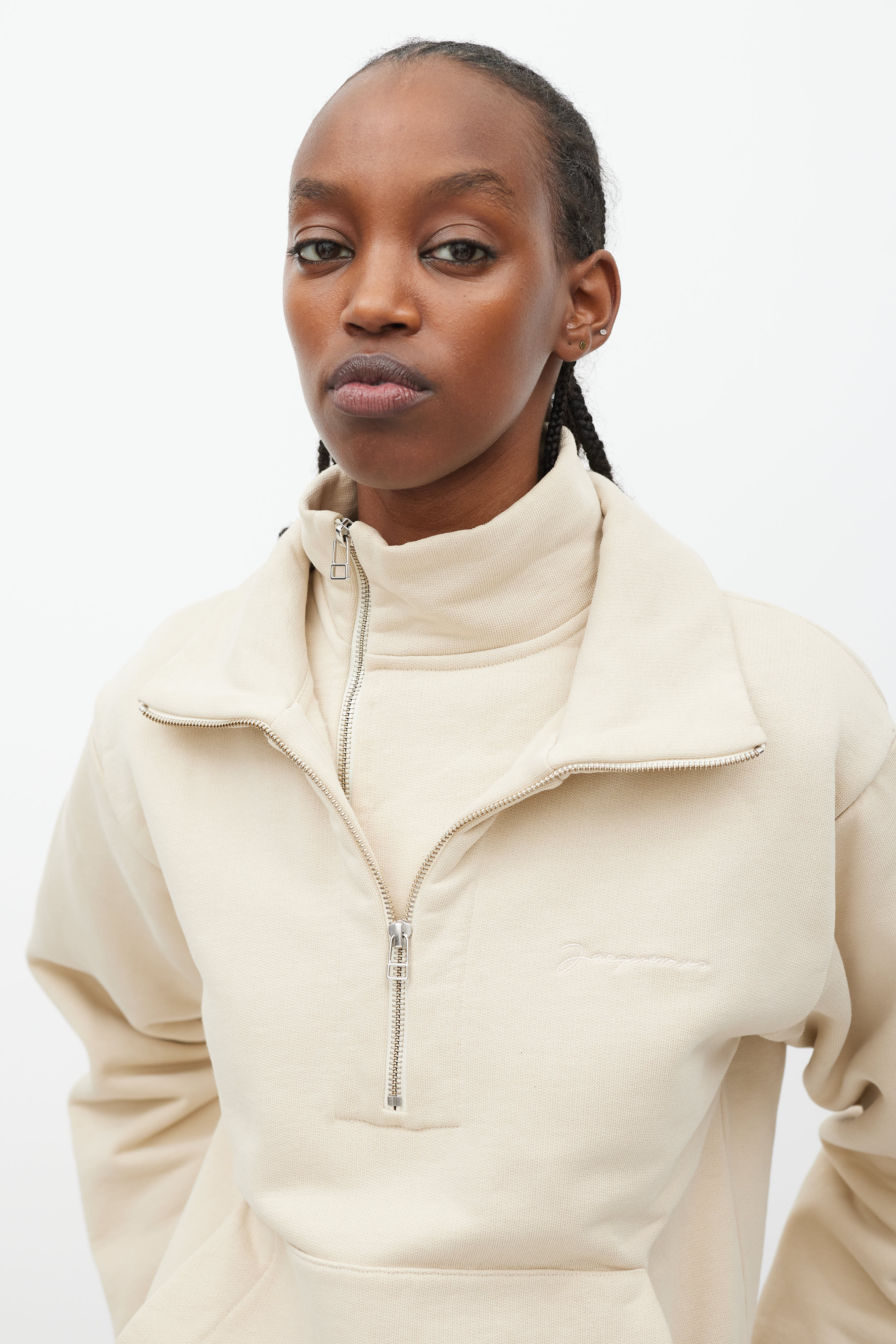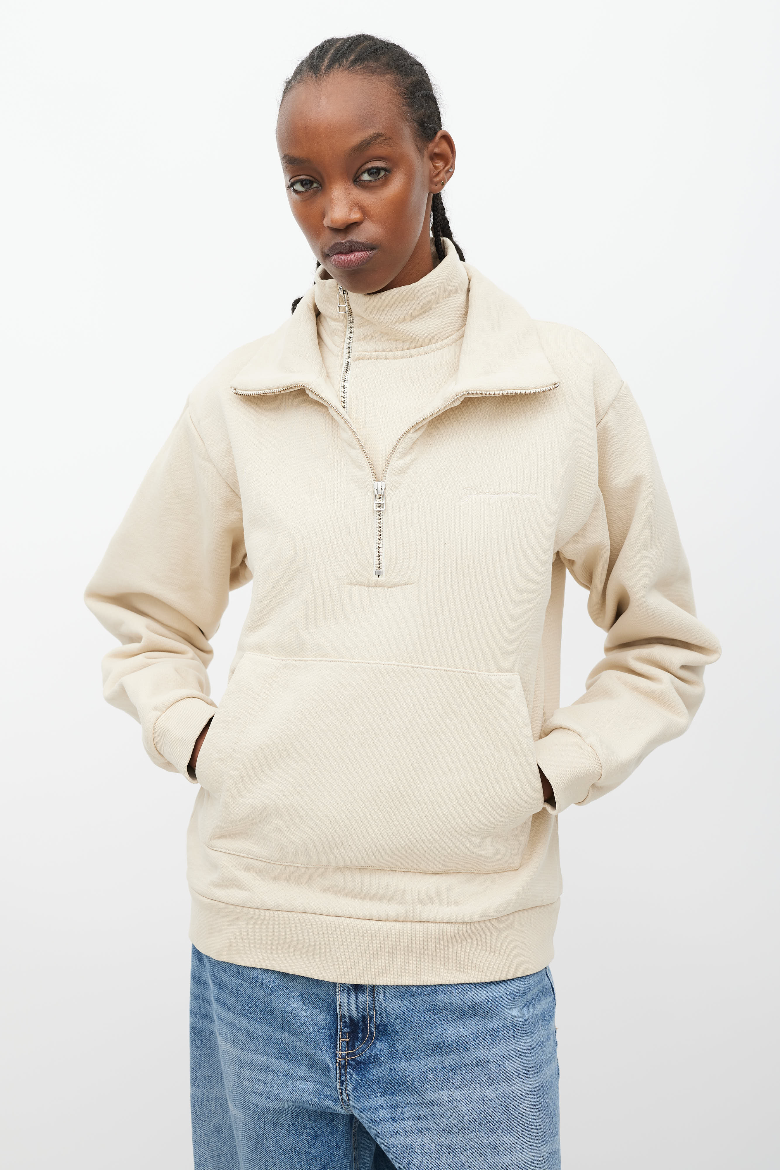 Pre-owned Jacquemus beige sweater featuring layered upper construction with double quarter zip collars, silver tone hardware, embroidered logo at left chest, one kangaroo pocket at front, long sleeves and ribbed trim at hem and sleeve cuffs.