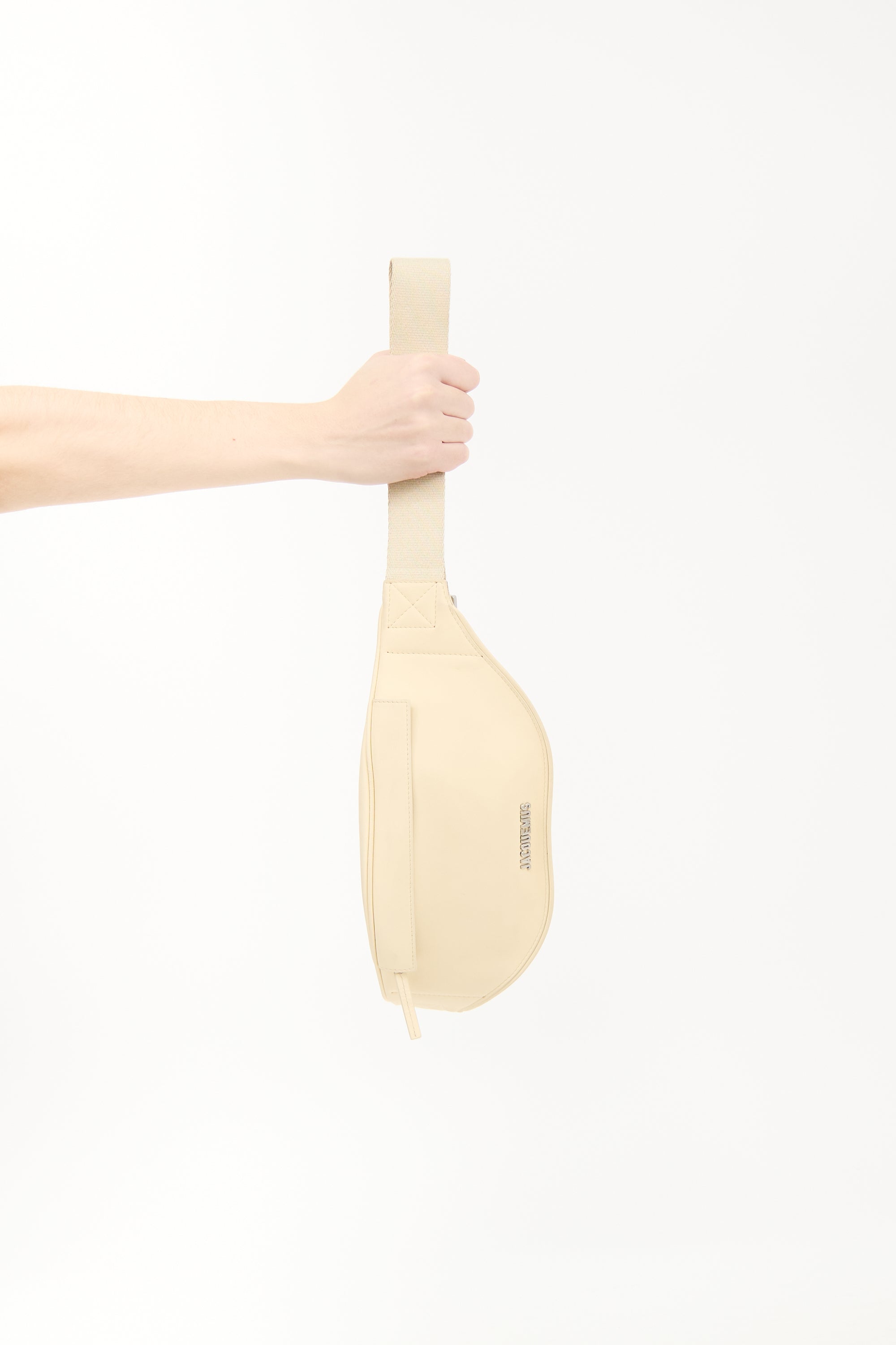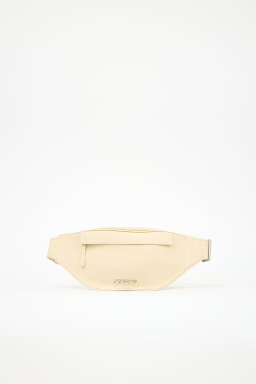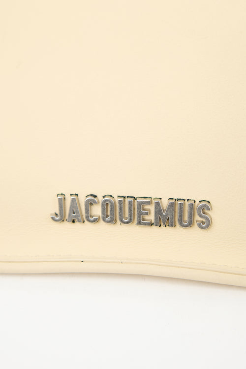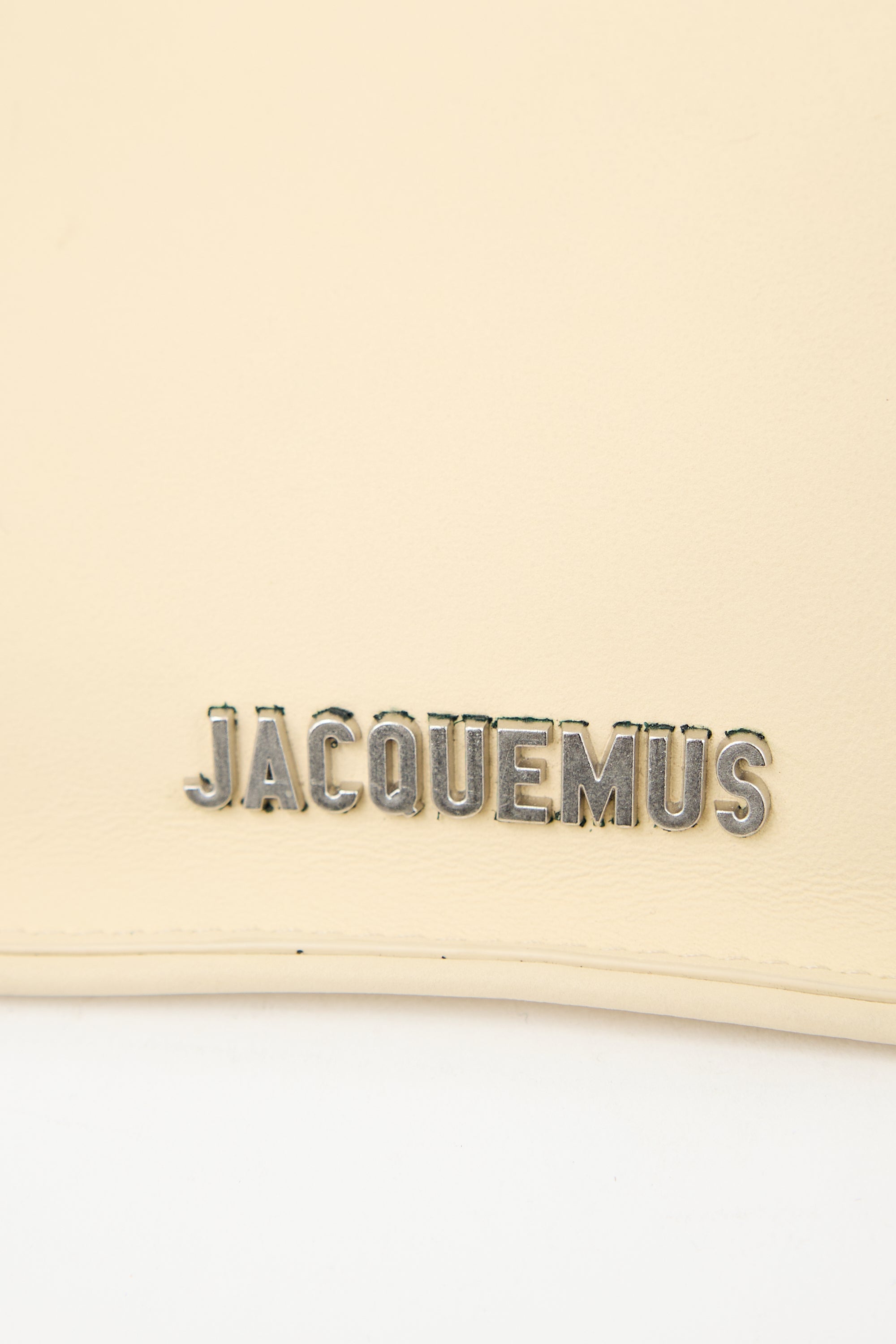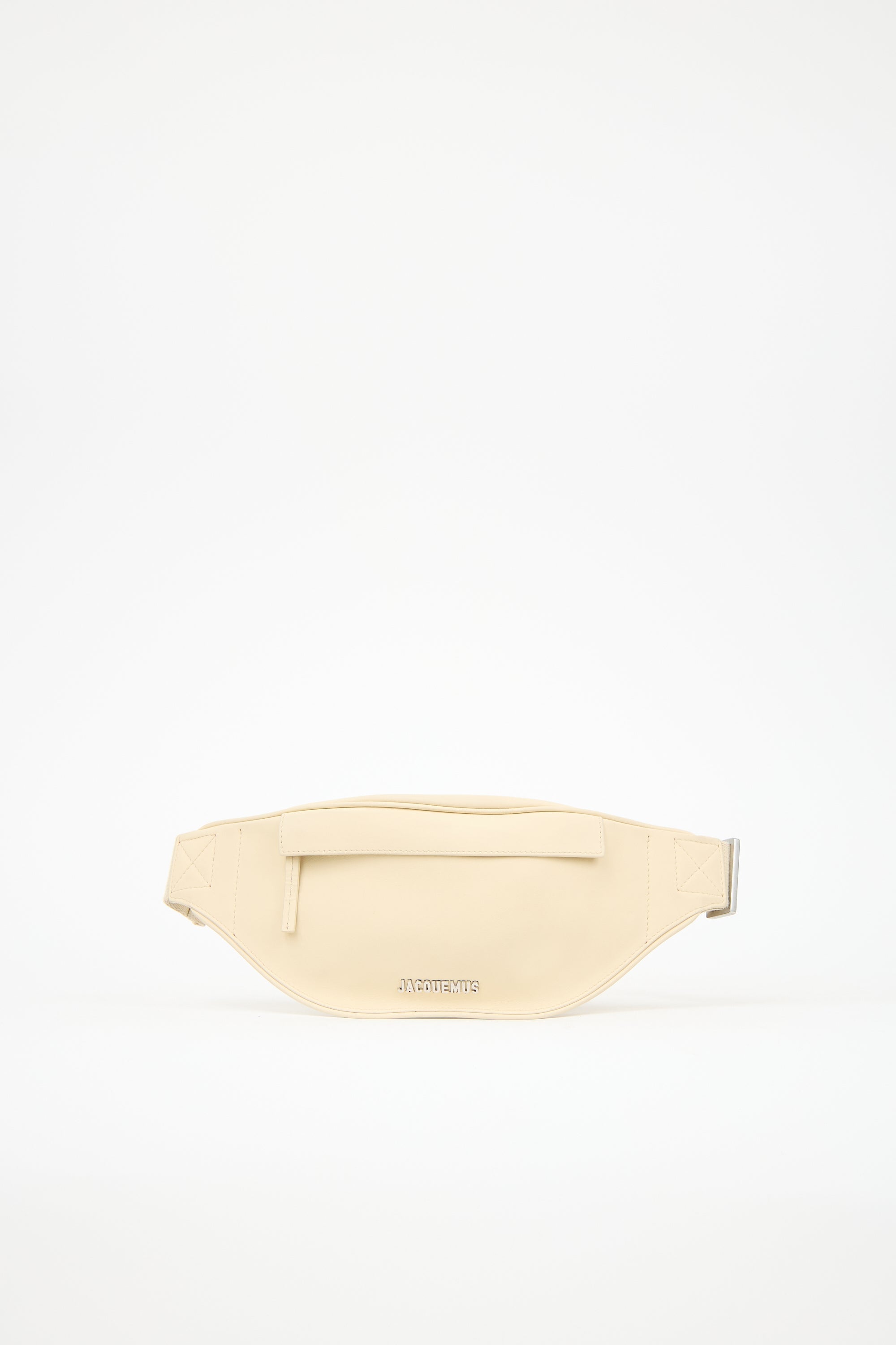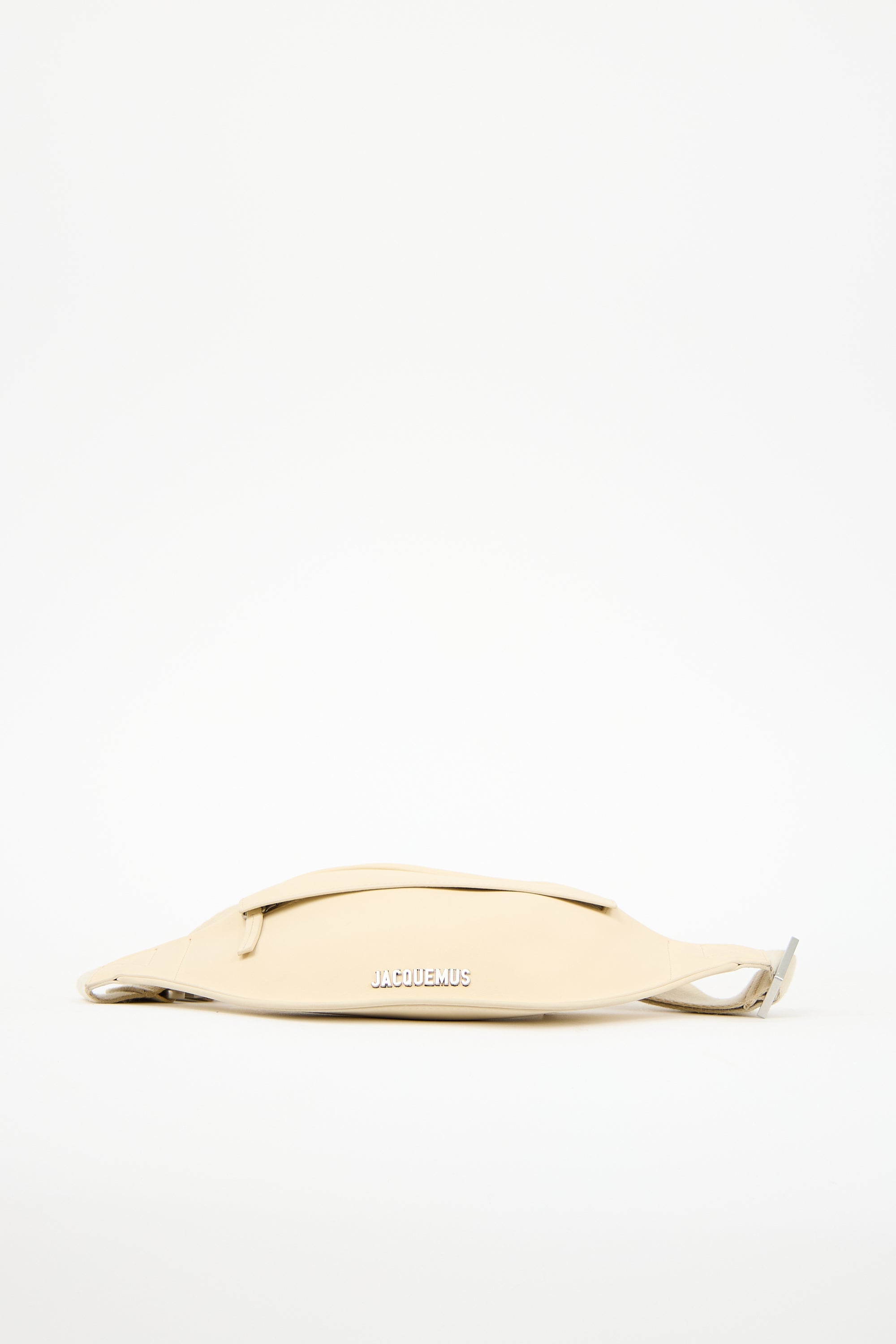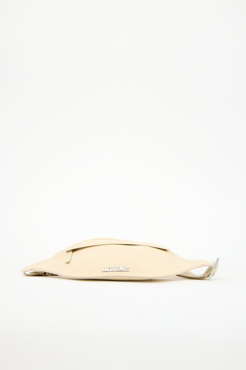 Pre-owned Jacquemus beige leather La Banane Meunier belt bag featuring silver tone hardware, adjustable webbed strap, metal logo hardware at front, one concealed zip main compartment, one zip pocket at back, and one interior card slot. Includes original dust bag.