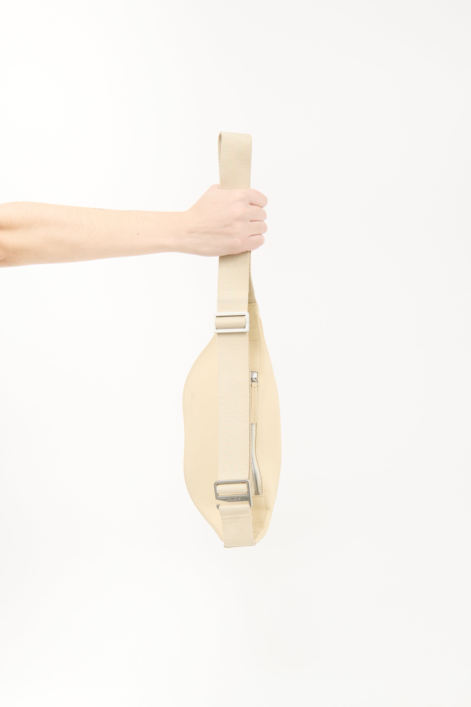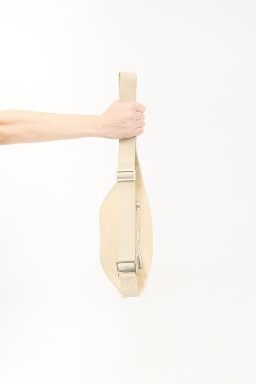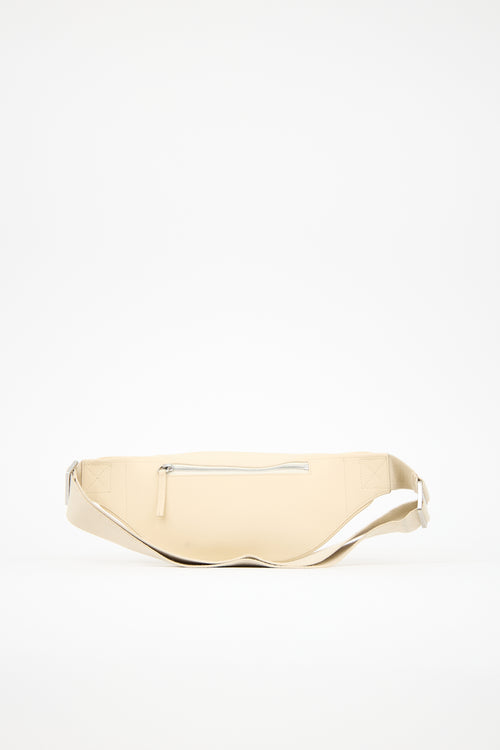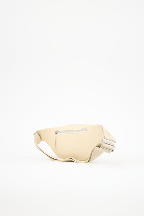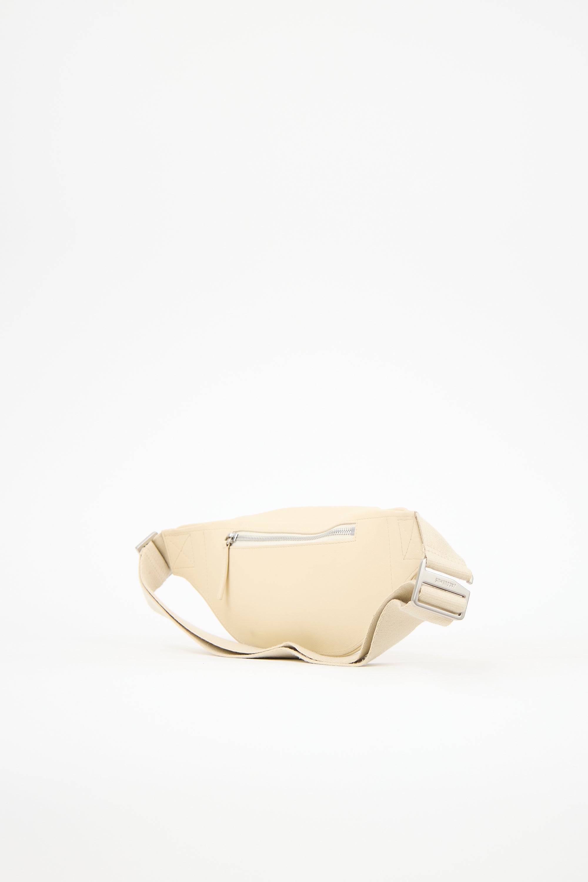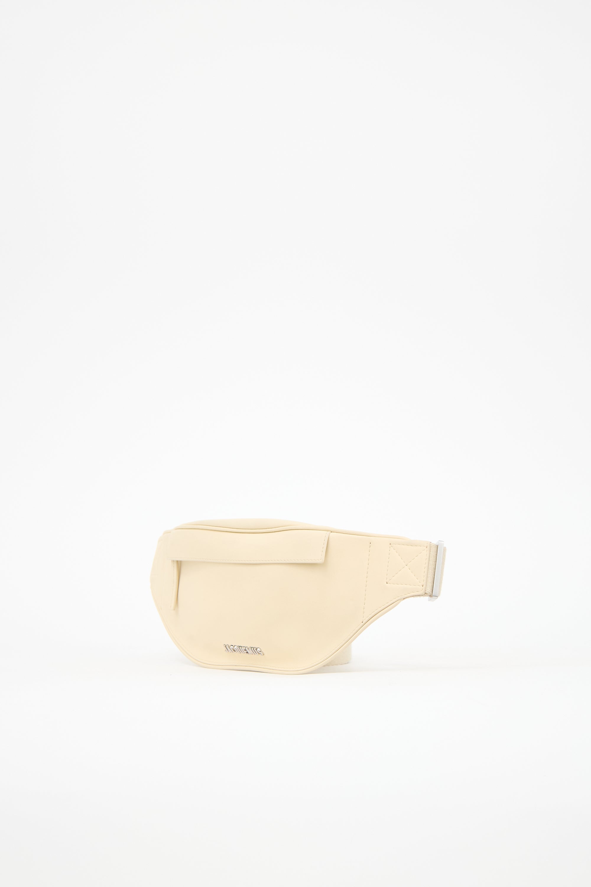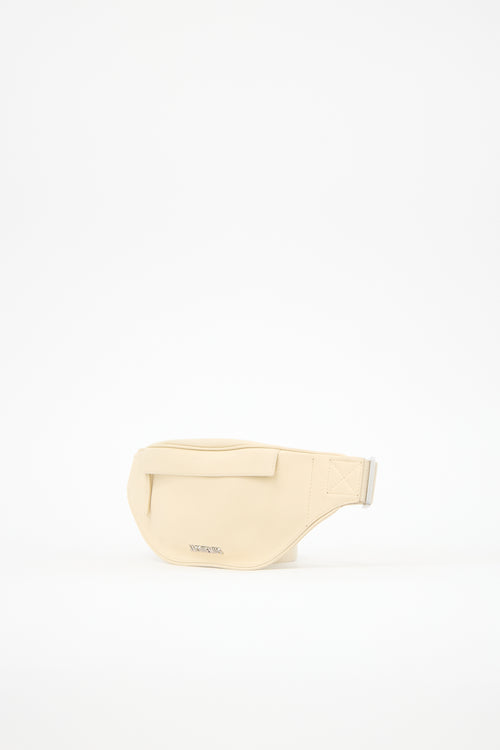 Pre-owned Jacquemus beige leather La Banane Meunier belt bag featuring silver tone hardware, adjustable webbed strap, metal logo hardware at front, one concealed zip main compartment, one zip pocket at back, and one interior card slot. Includes original dust bag.