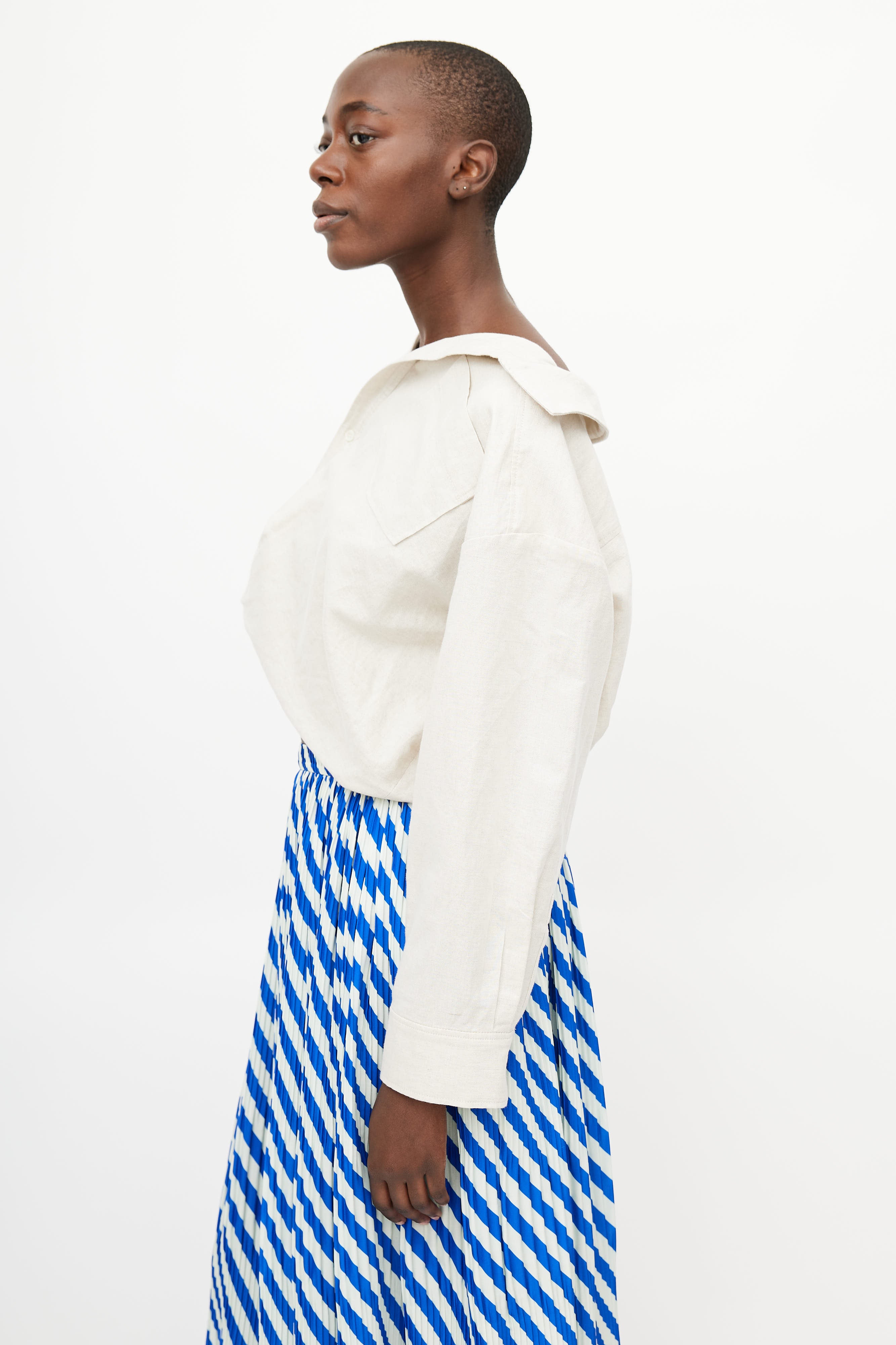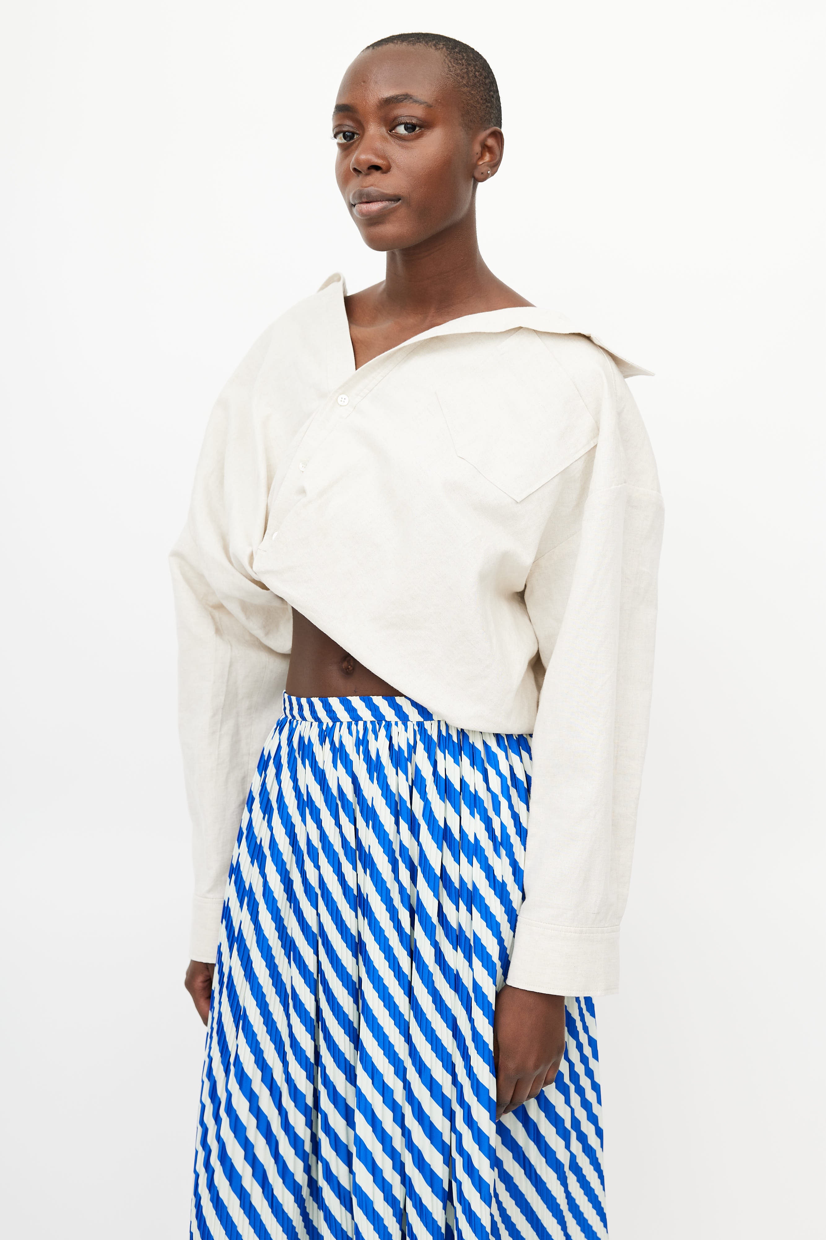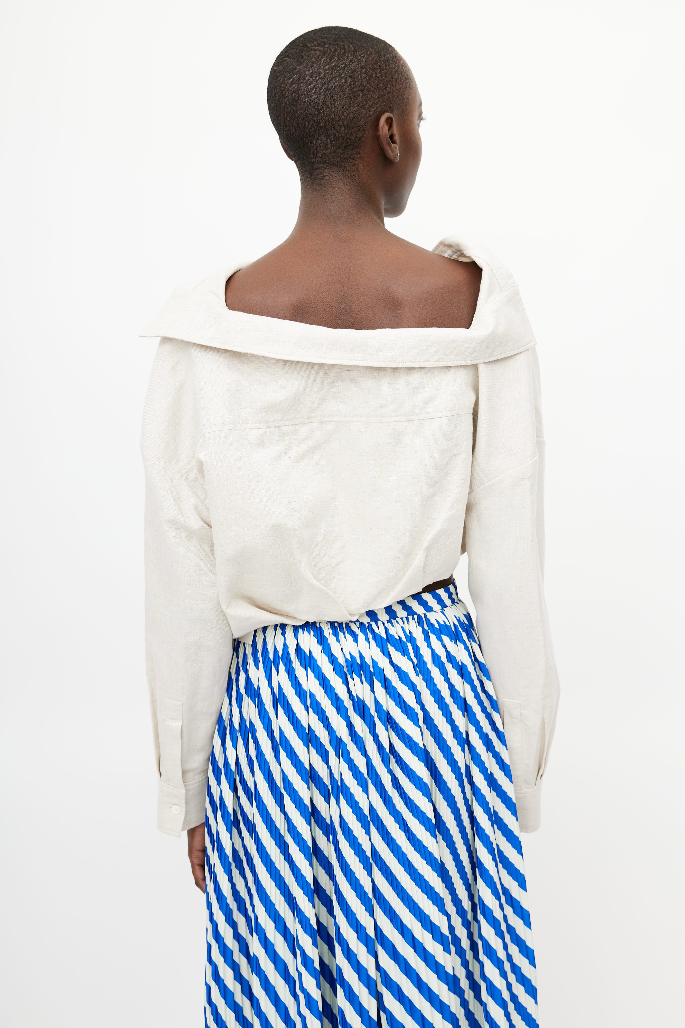 Pre-owned Jacquemus Spring Summer 2022 Le Splash beige cropped linen shirt featuring a pointed collar, one patch pocket at chest, long sleeves with buttoned cuffs, and button up front.