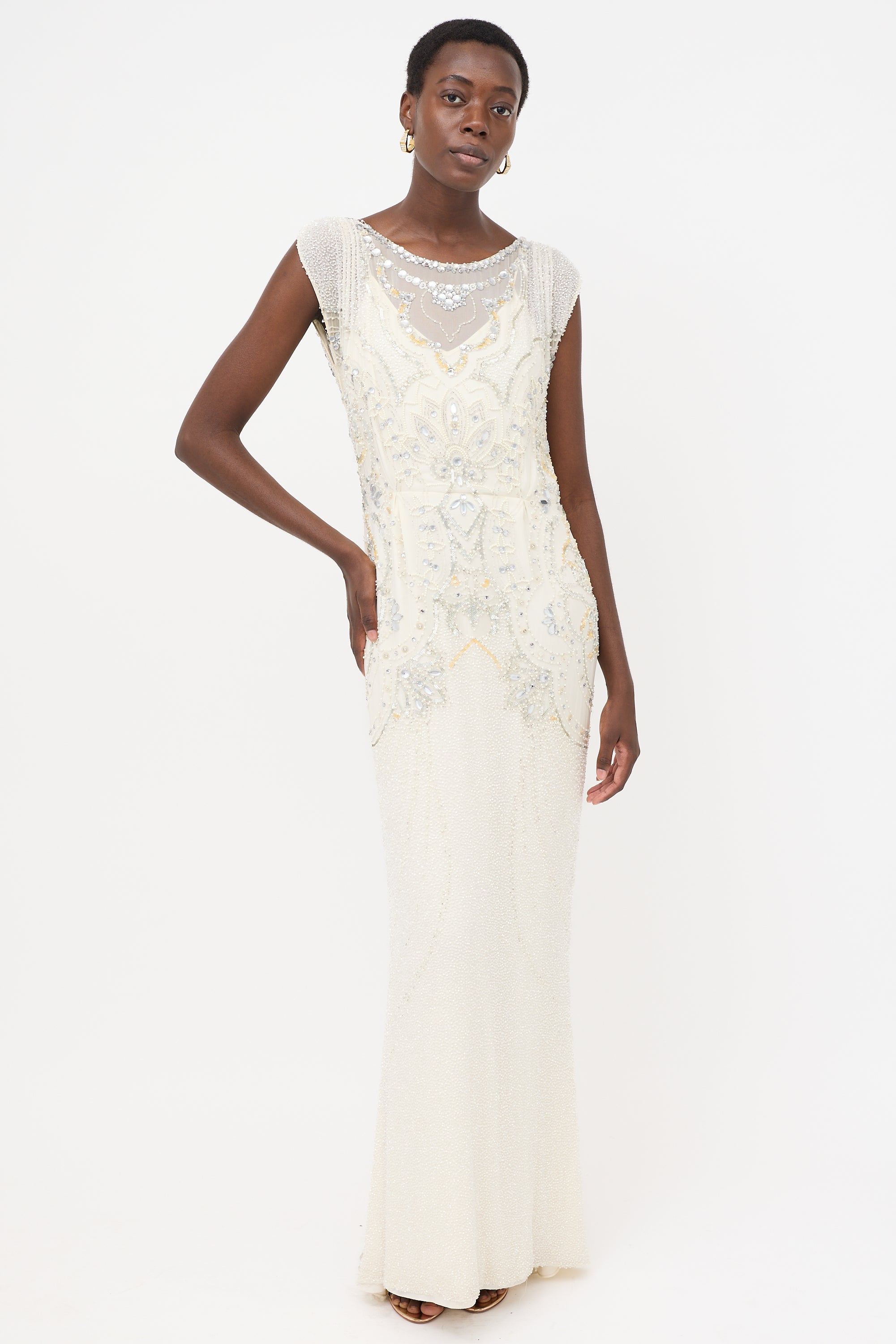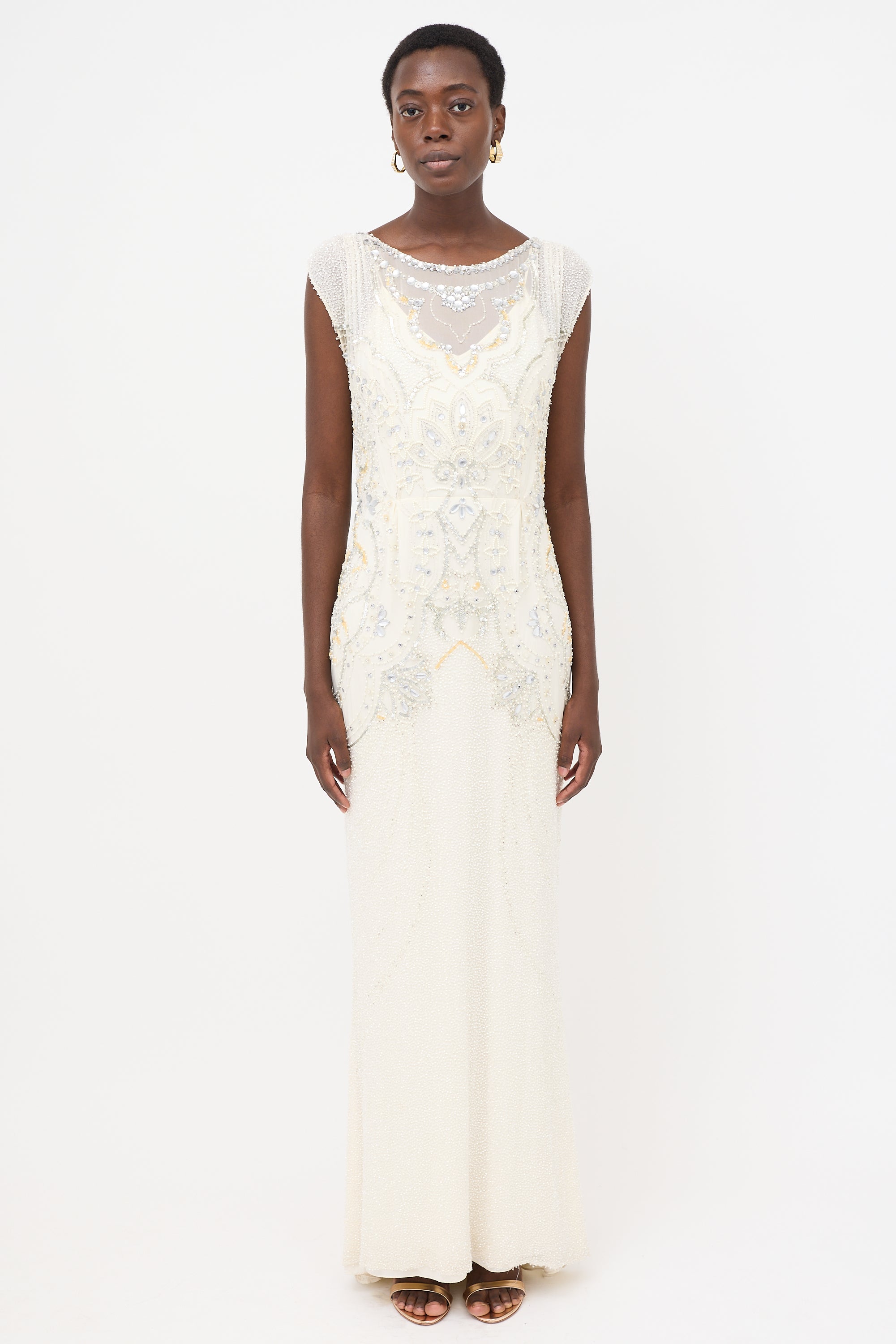 Pre-owned Jenny Packham cream silk dress featuring multicolour bead, faux pearl, and sequin embellishments throughout, round neckline, cutout back, concealed back zip, and gathered centre back hem. Partially lined.