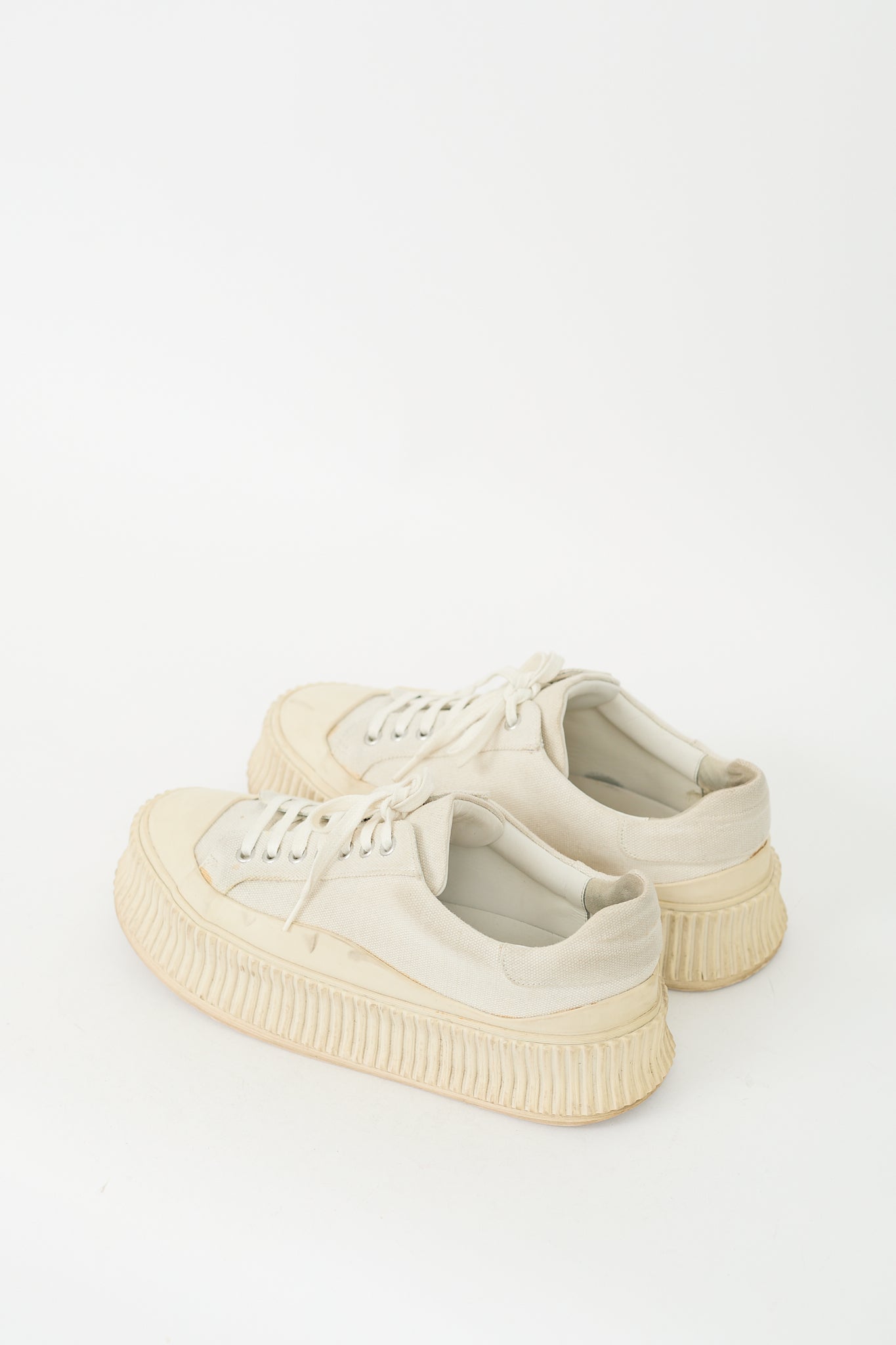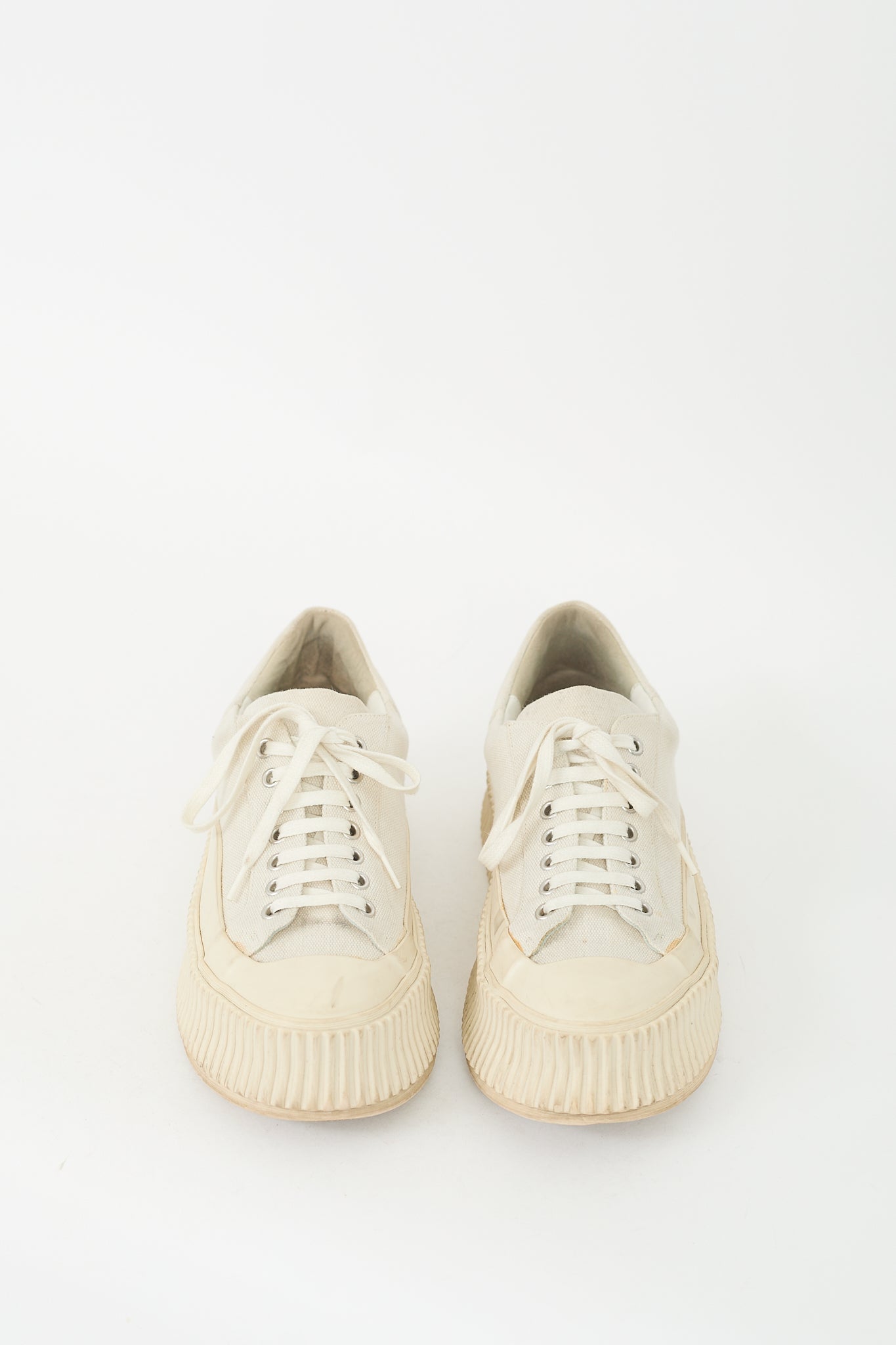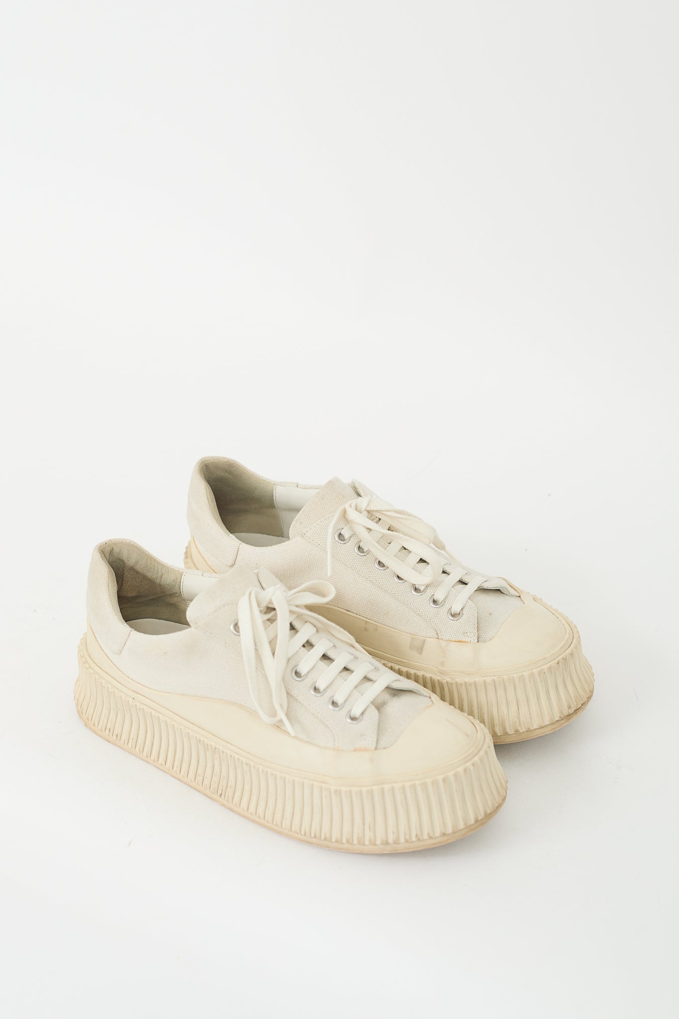 Pre-owned Jil Sander cream canvas sneakers featuring rounded rubber cap toe, canvas upper, lace up front, ribbed rubber platform midsole, and leather insole.