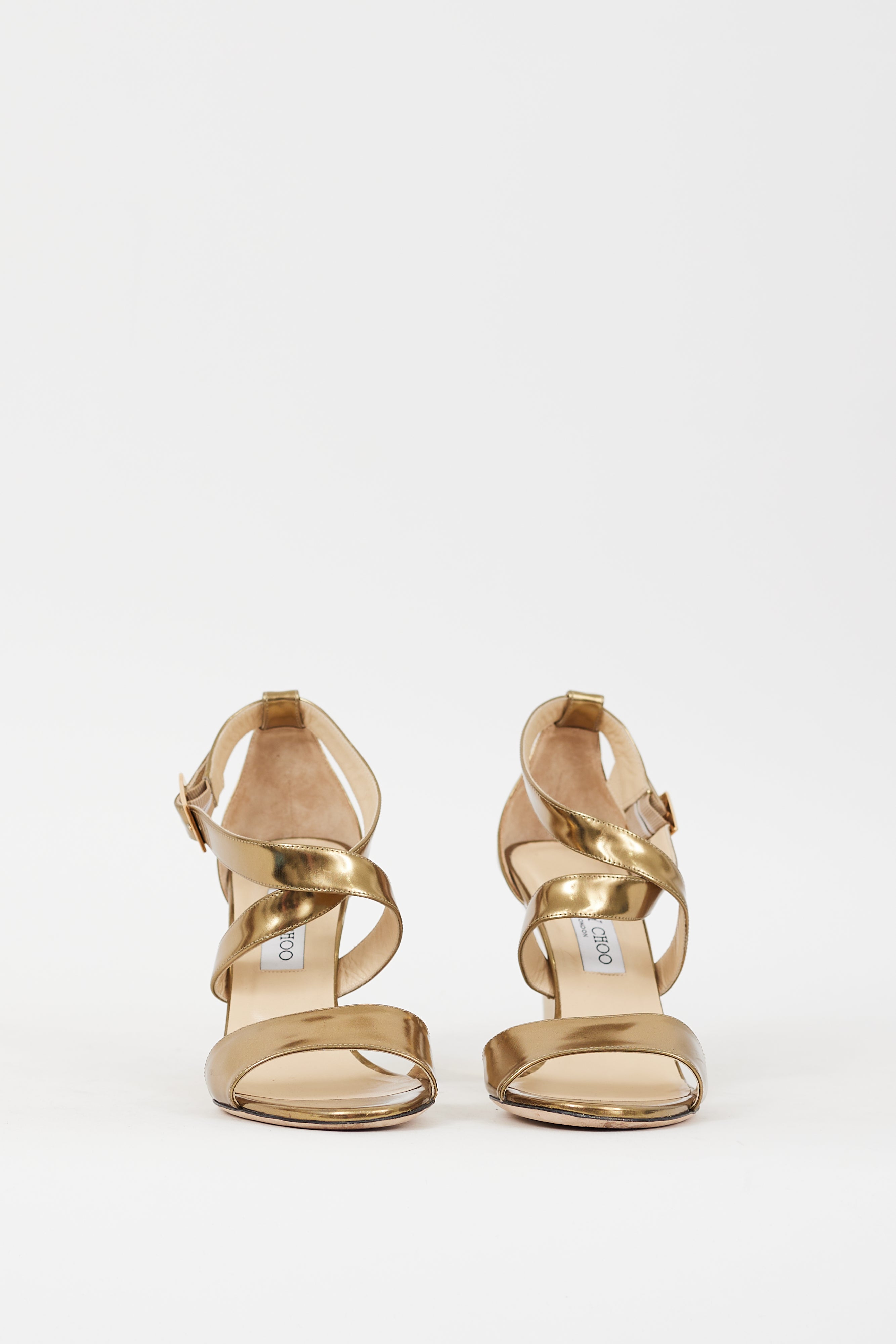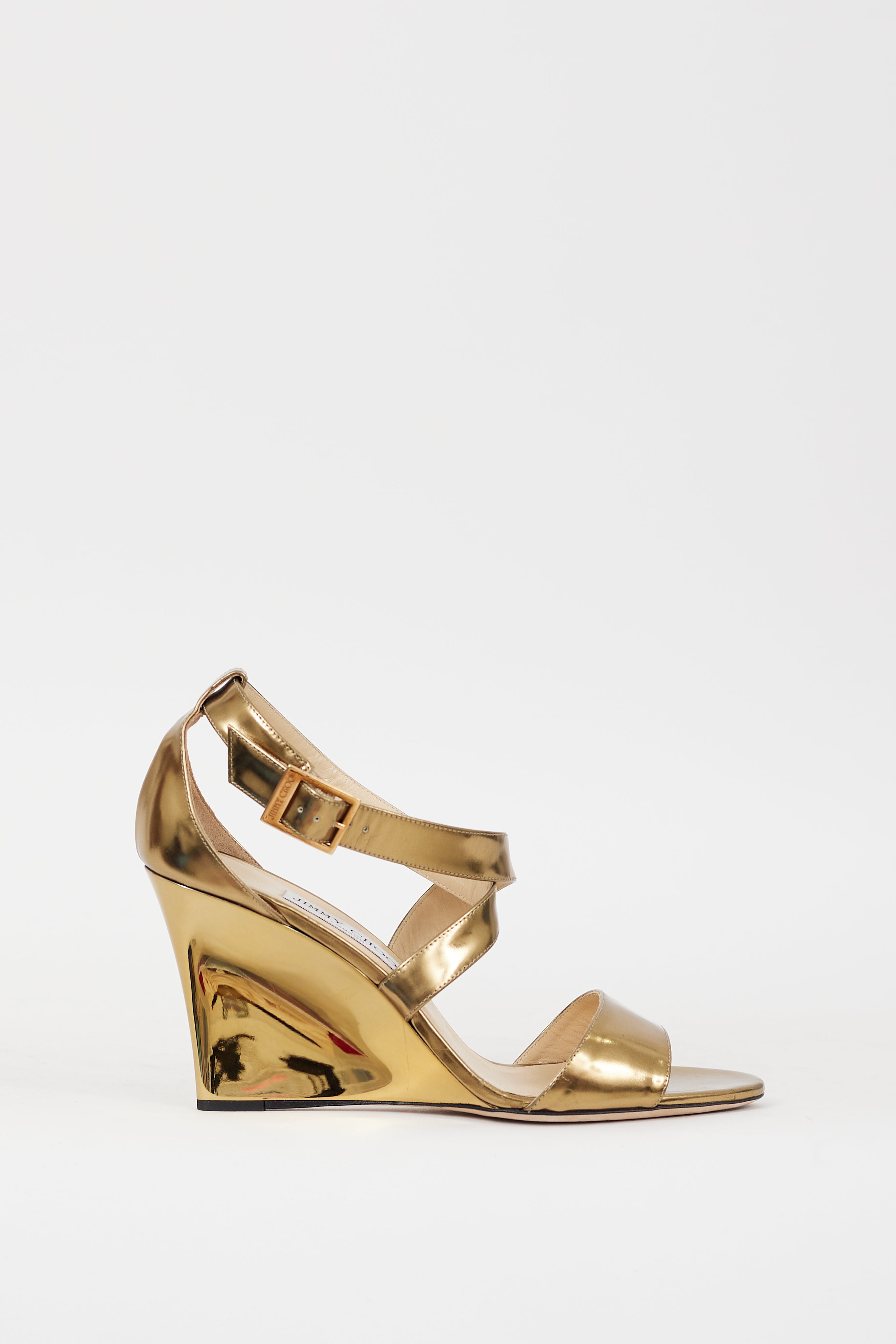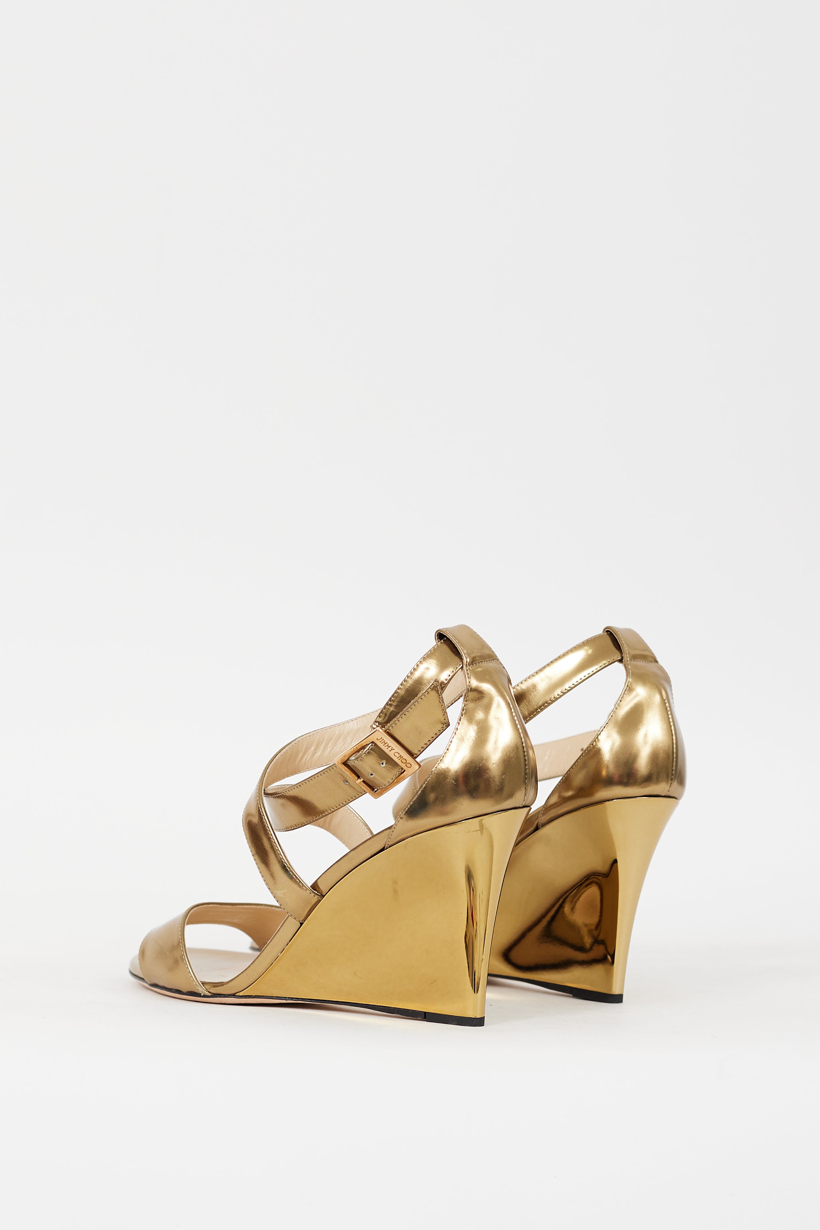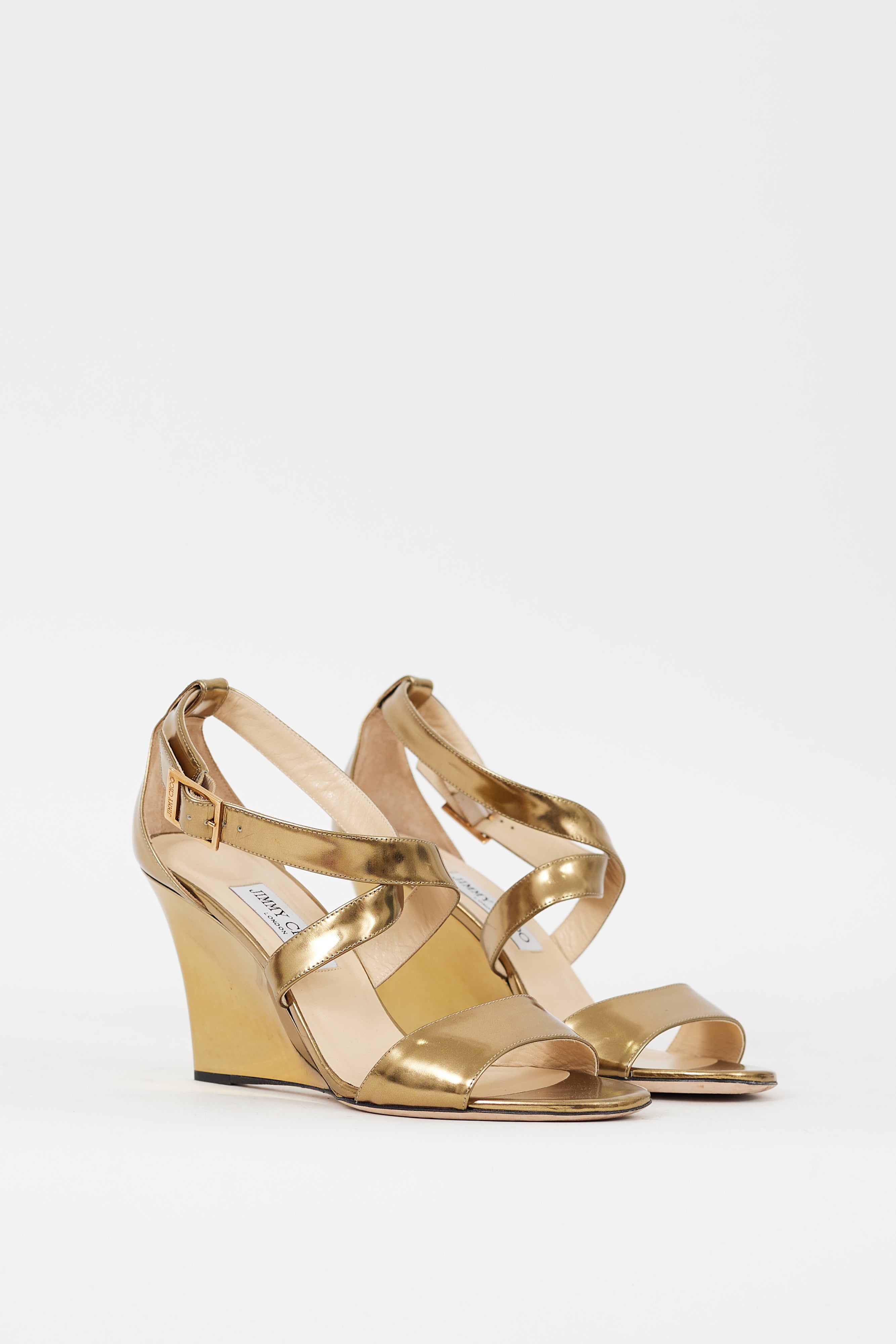 Pre-owned Jimmy Choo gold tone metallic leather Fearne wedges featuring an open round toe, strap across vamp, adjustable criss cross ankle cage, and metal plated wedge heel.