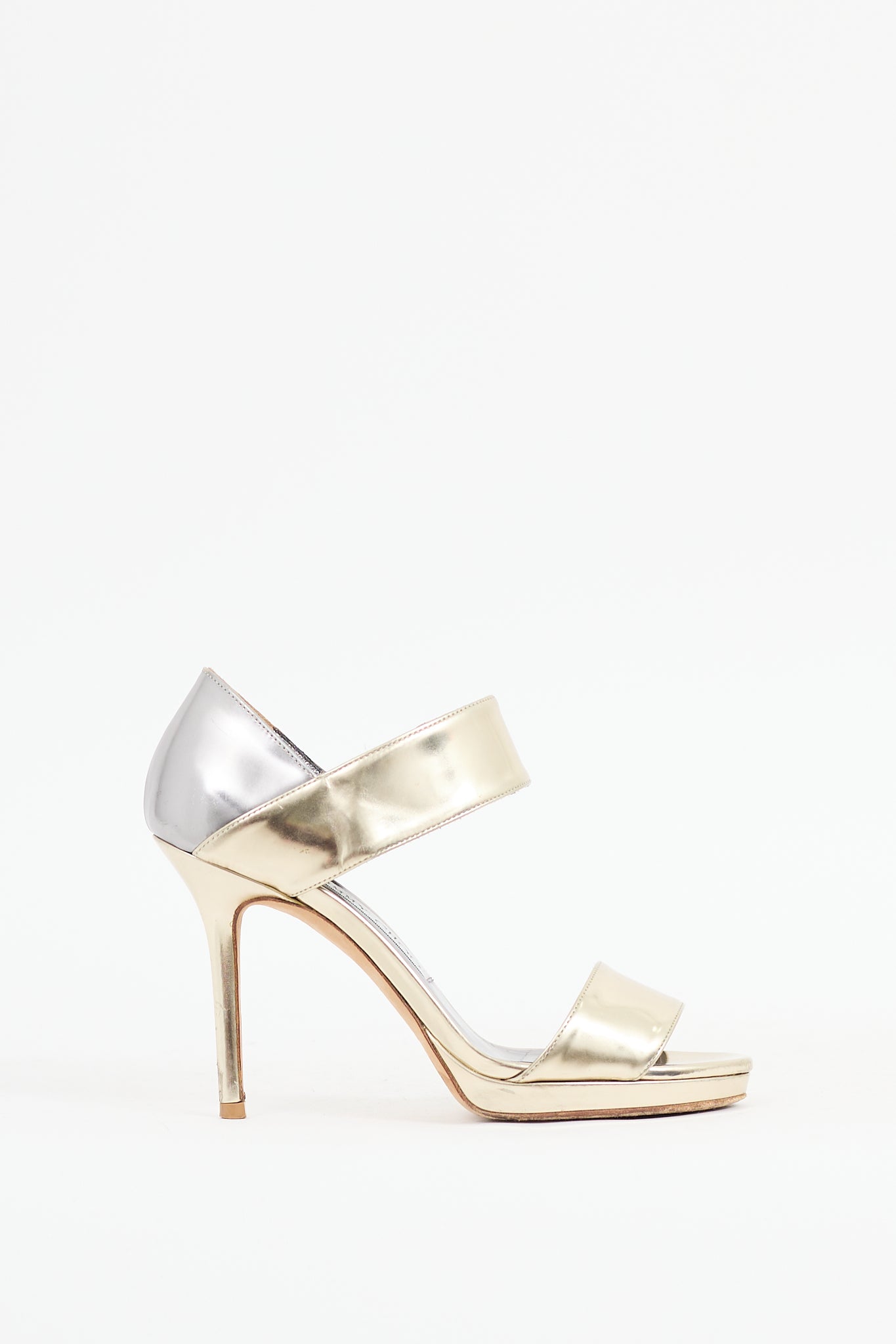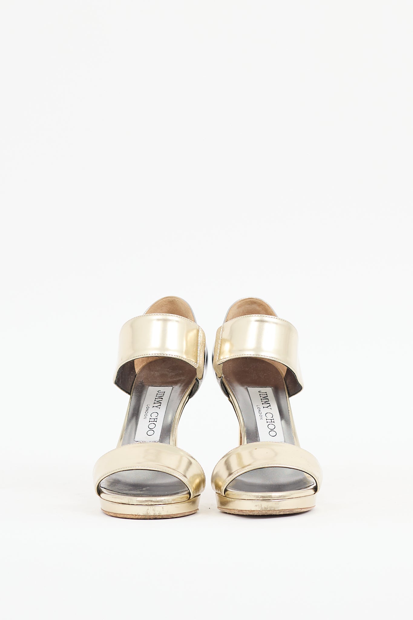 Pre-owned Jimmy Choo gold Alana patent leather sandals featuring an open round toe, strap at vamp, silver heel cap, wrapped stiletto heel, and elasticized strap at ankle. Comes with original dust bag.