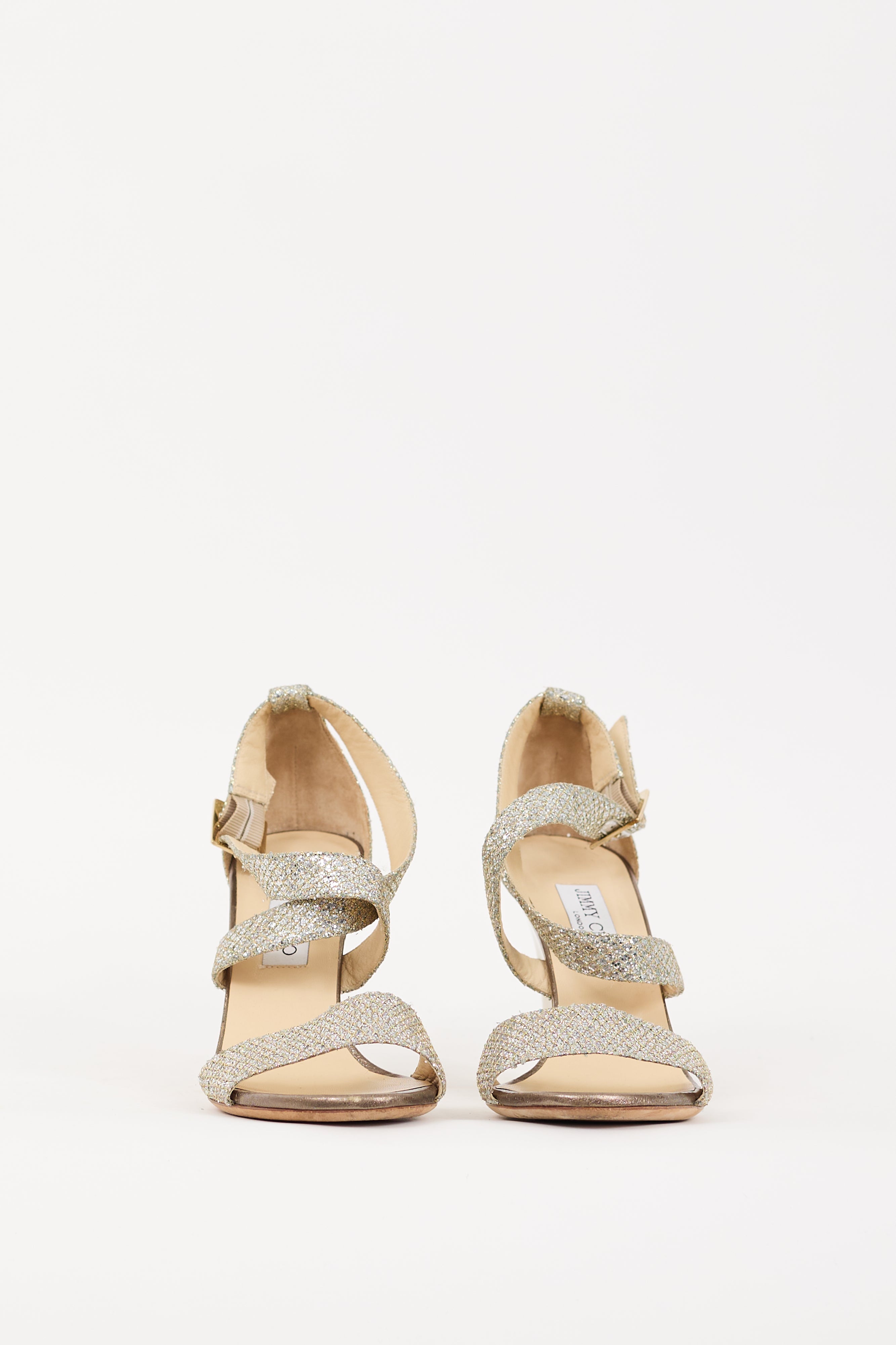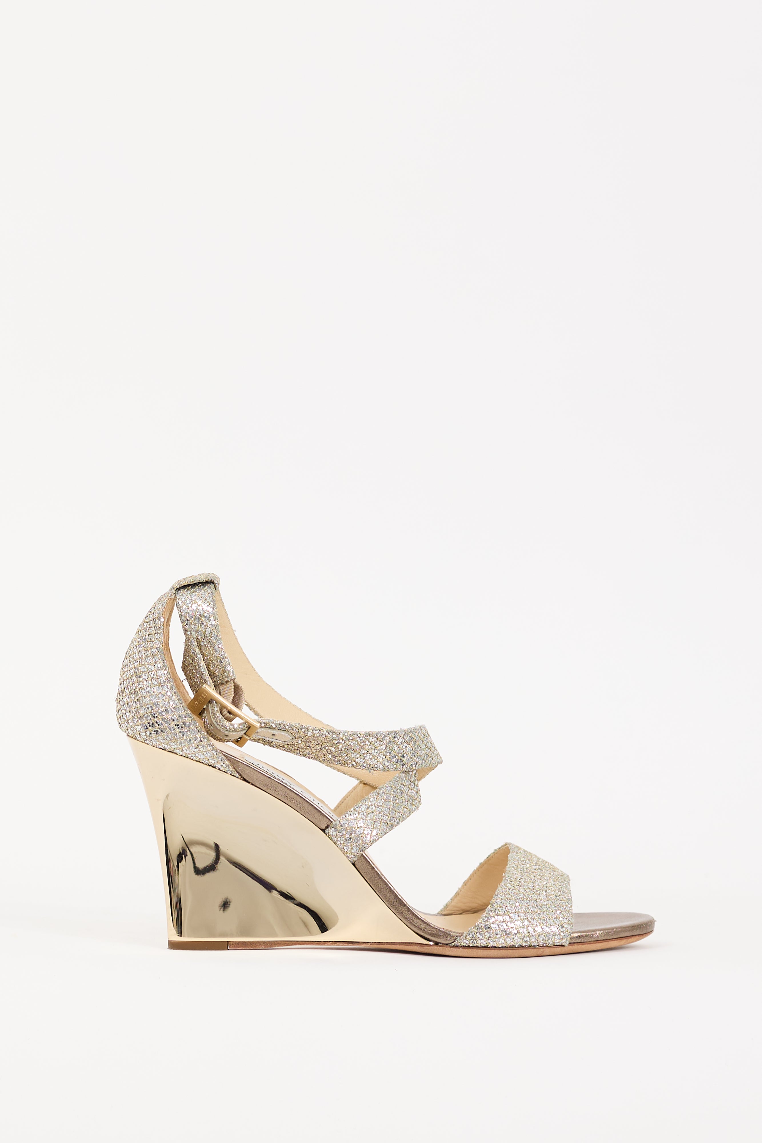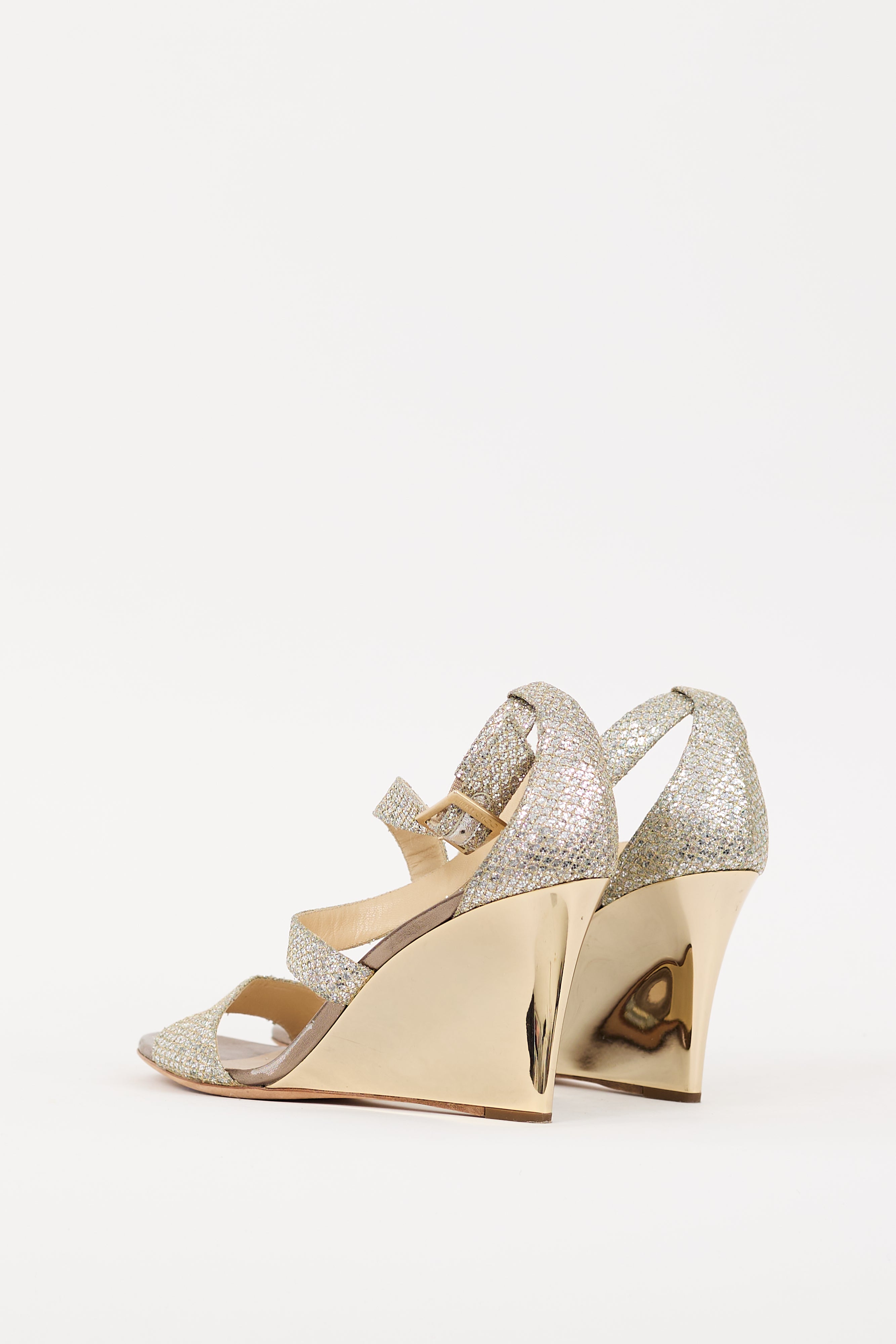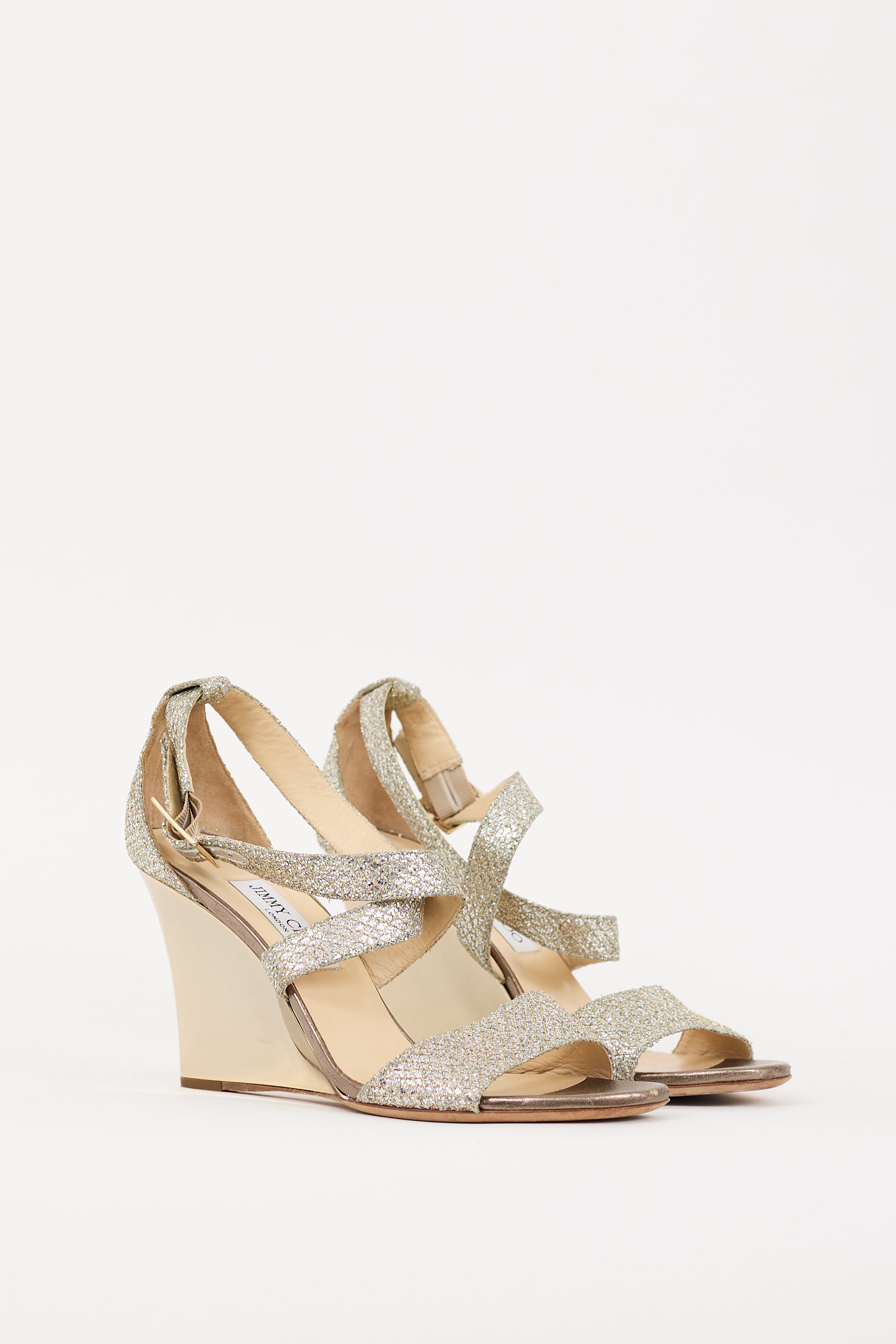 Pre-owned Jimmy Choo silver and gold tone Fearne wedges featuring an open rounded toe, glitter and metallic thread covered upper, strap across vamp, adjustable criss cross ankle cage, and pale gold tone metal plated wedge heel.