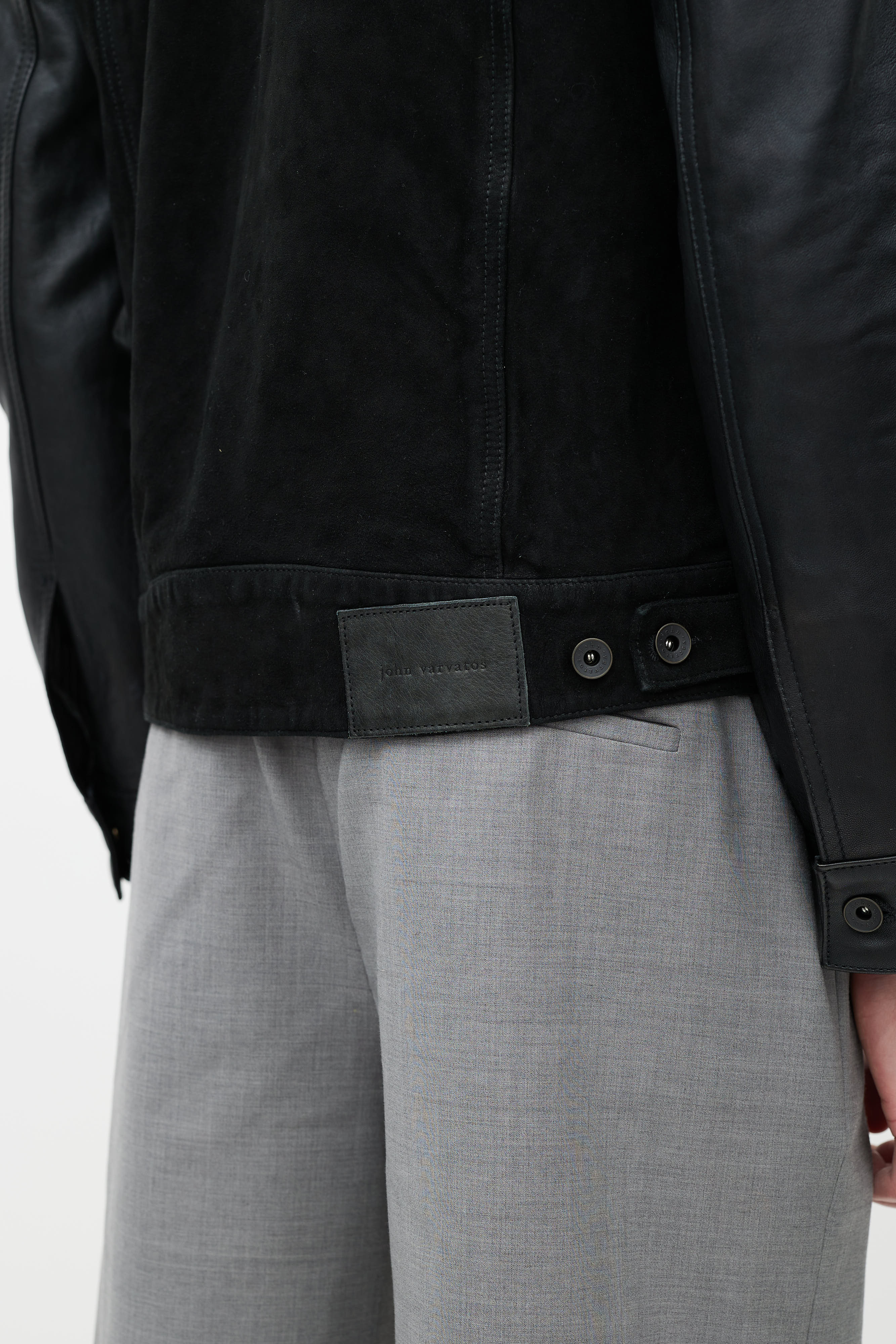 John Varvatos black leather trucker jacket featuring a pointed collar, long sleeves with buttoned cuffs, two slip pockets at hip, two flap pockets at chest, and button up closure. Lined.