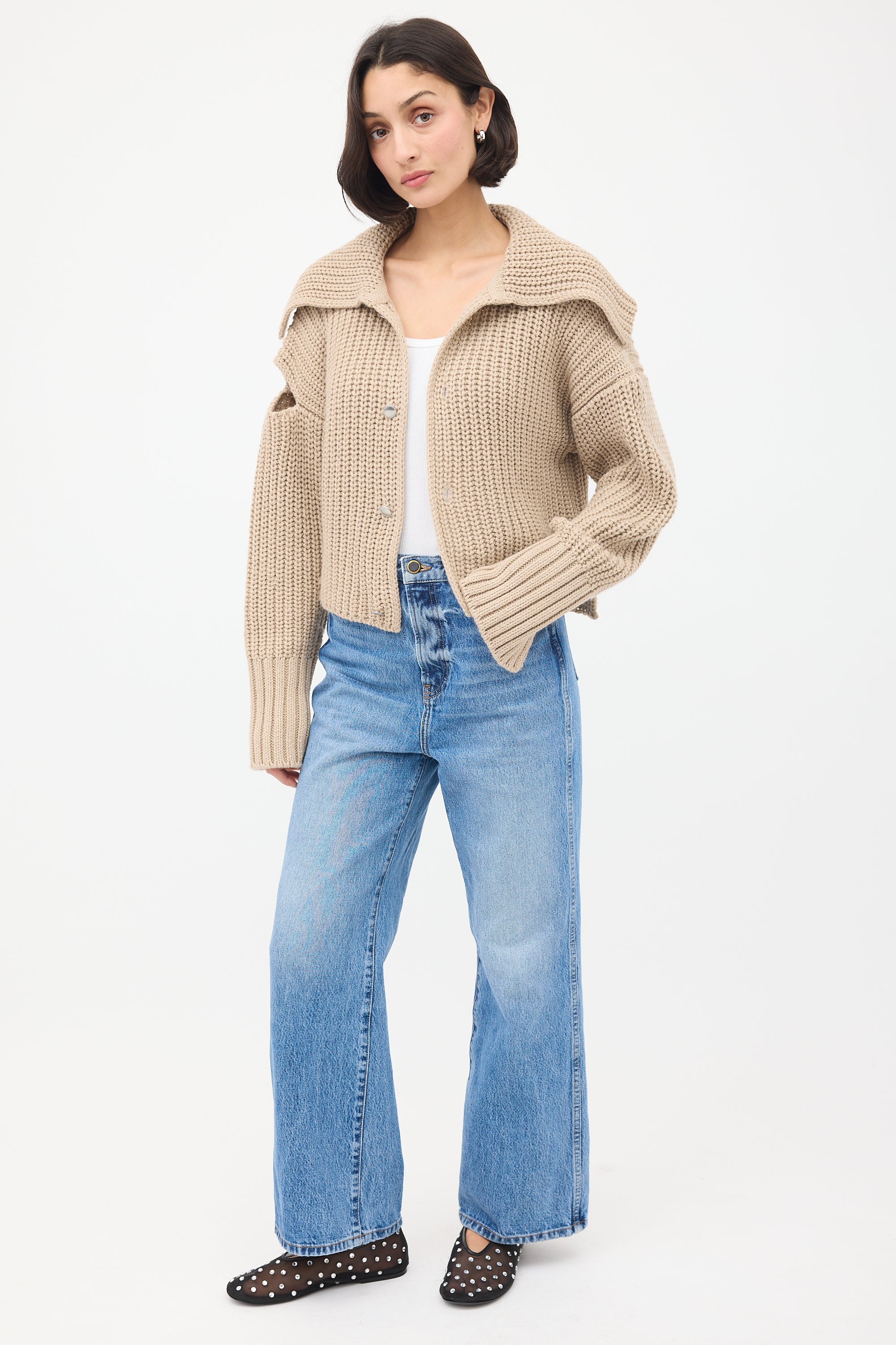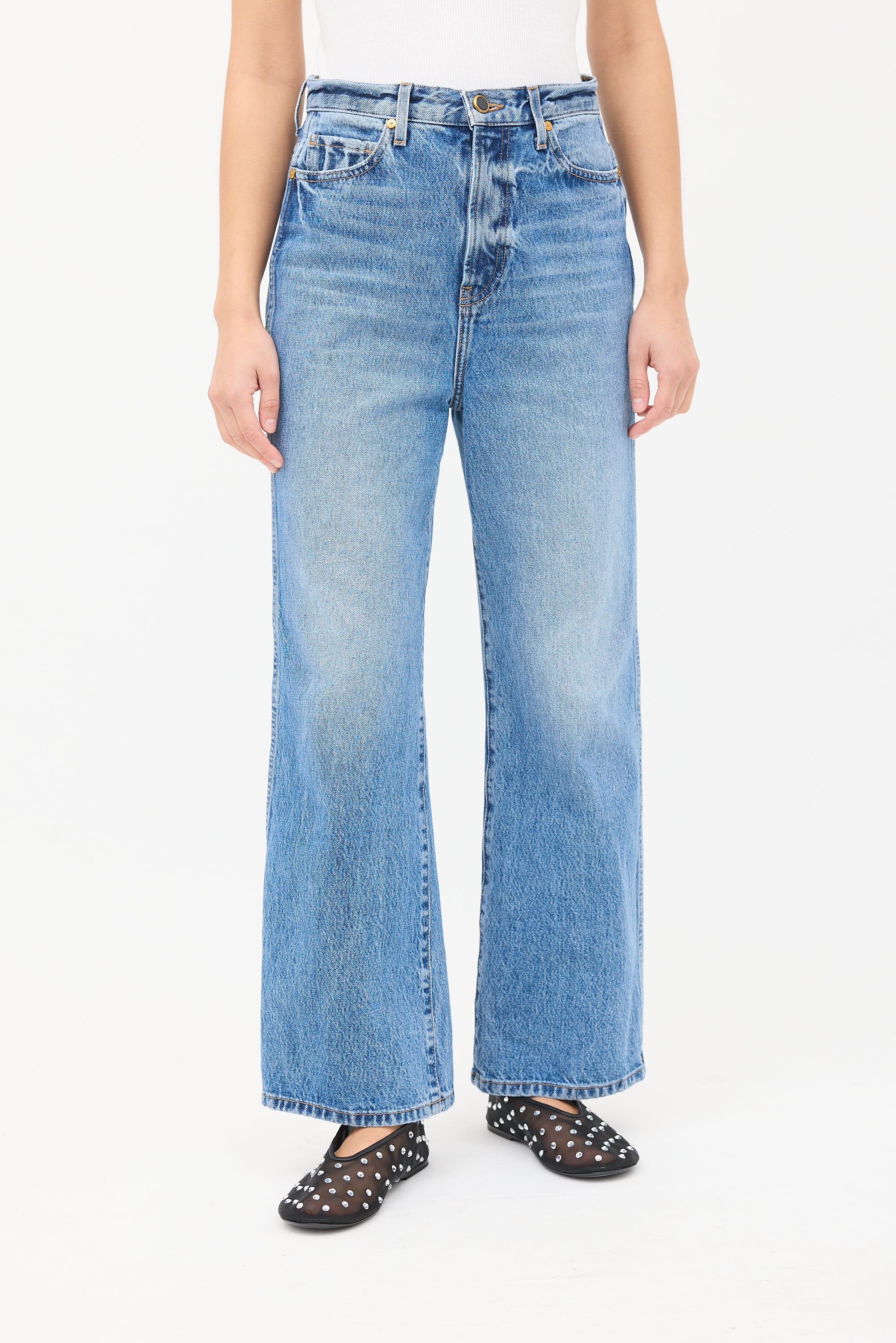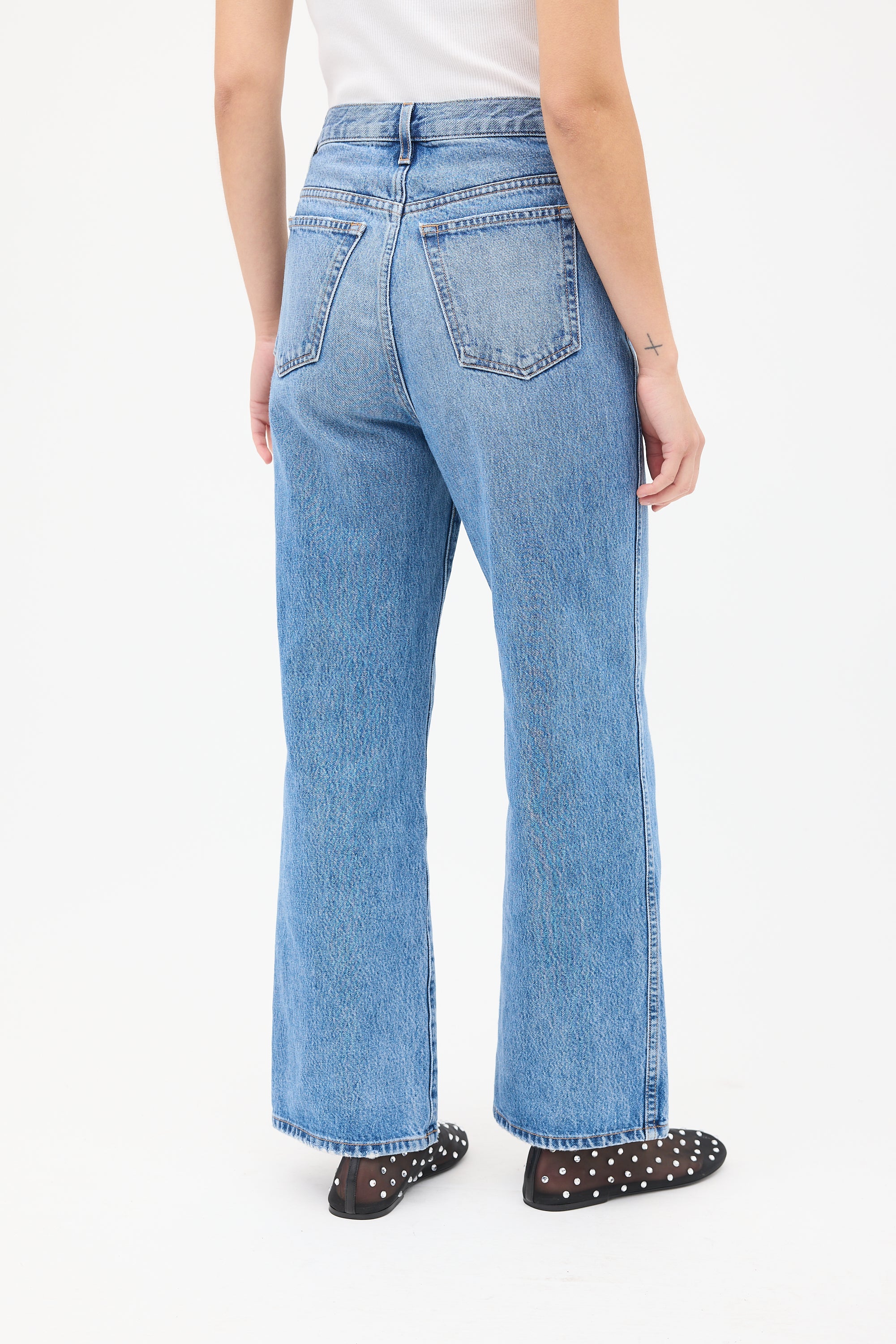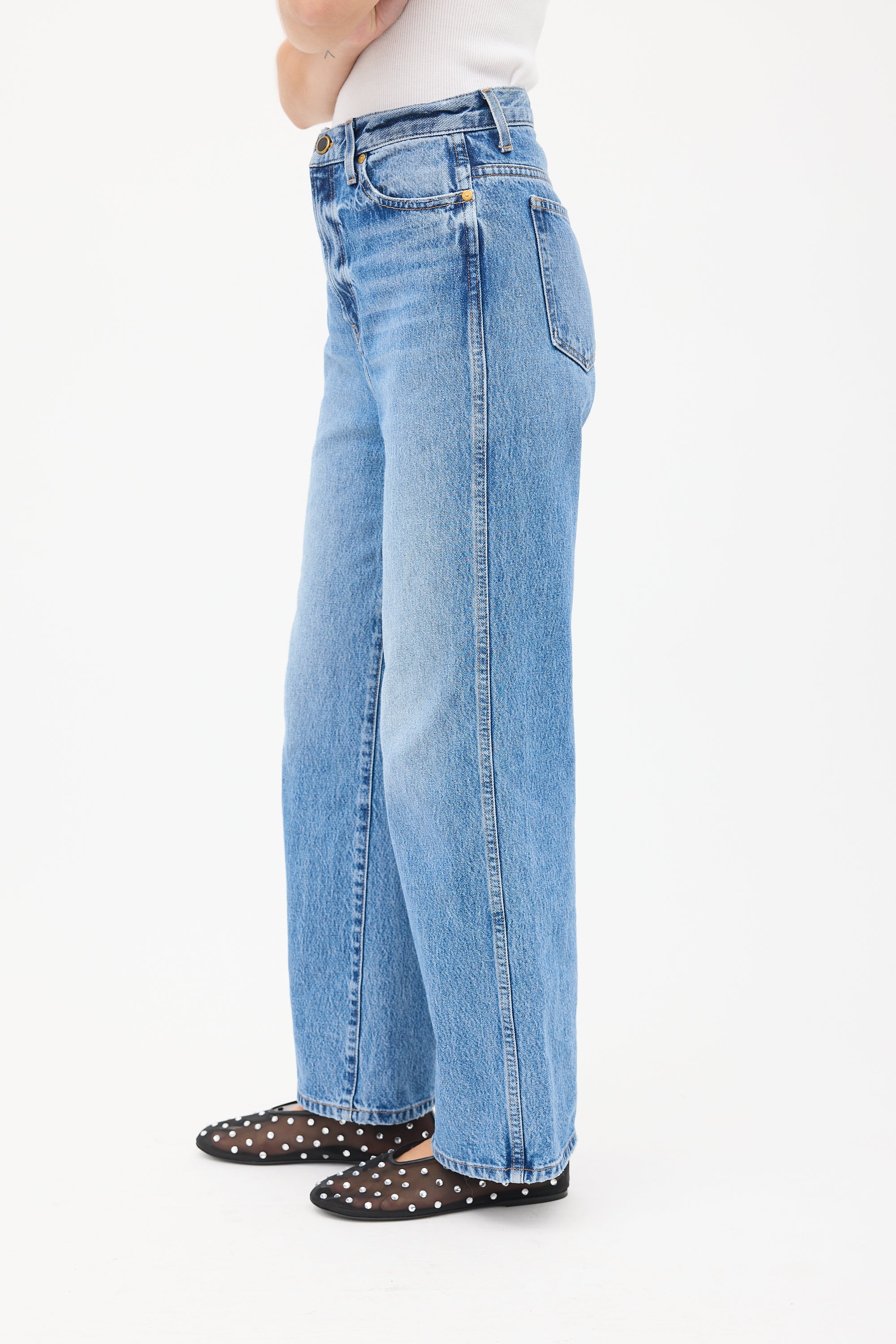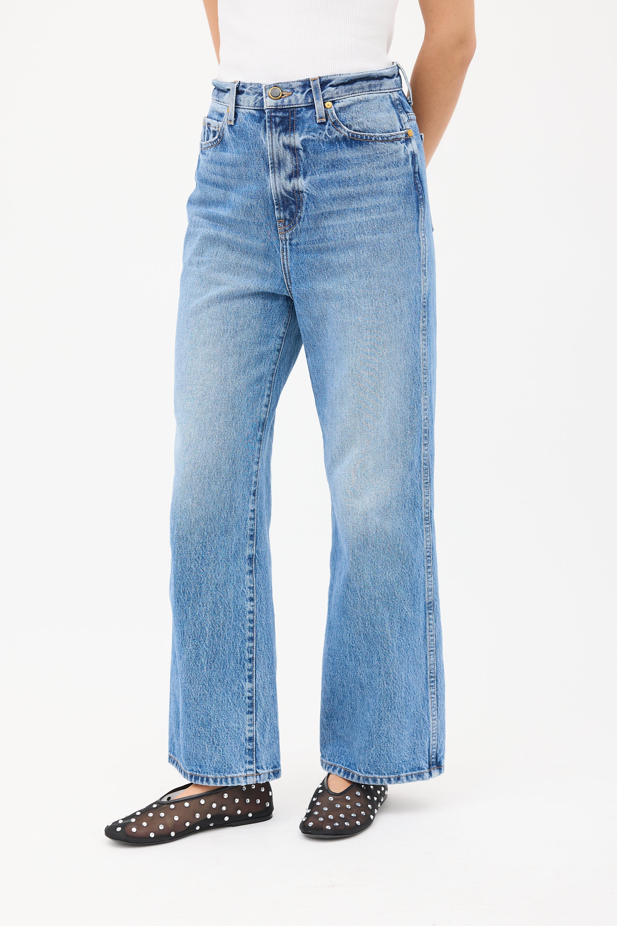 Pre-owned Khaite light wash Jordan jeans featuring a high waist, straight leg, five pocket styling, zip fly, and light intentional distressing throughout.
