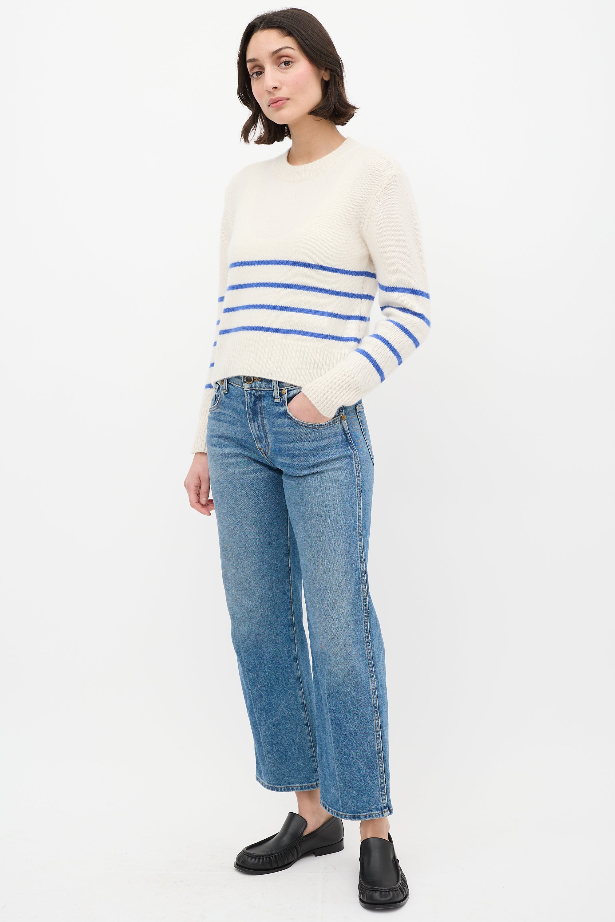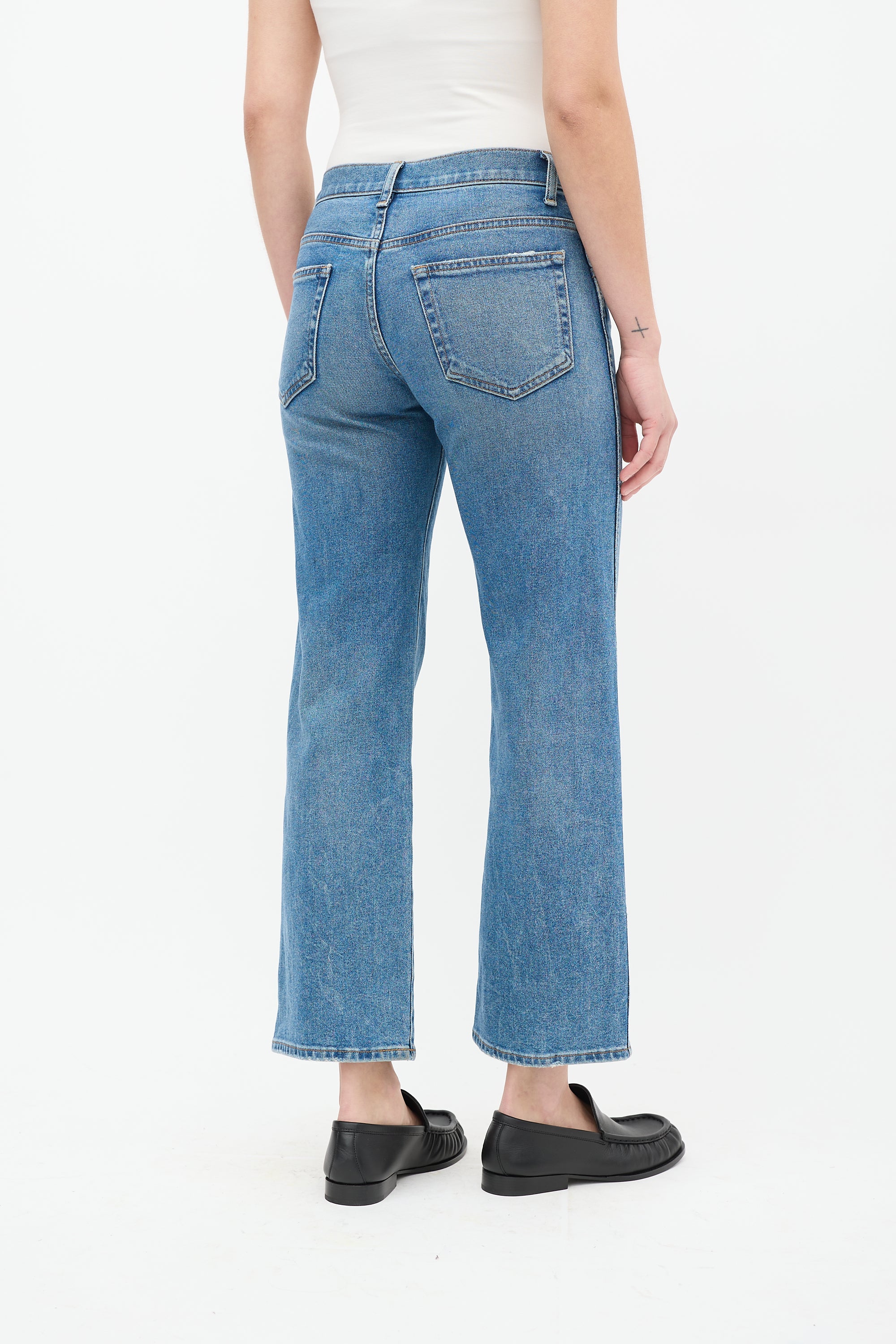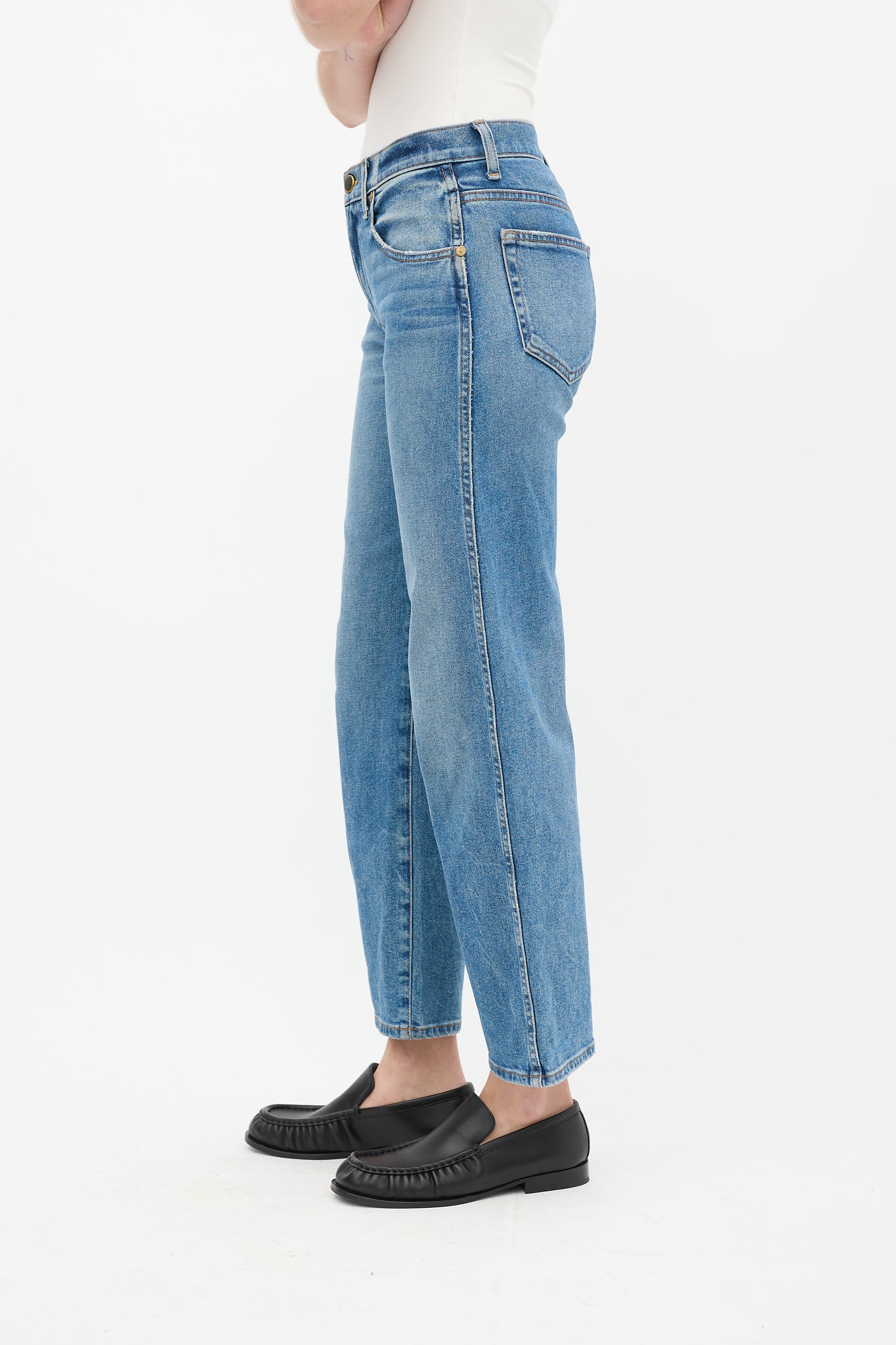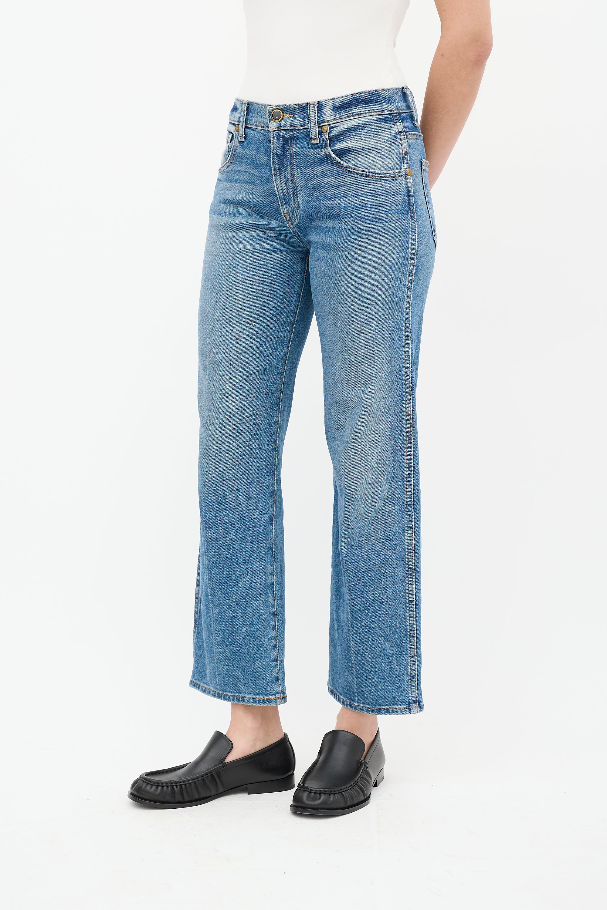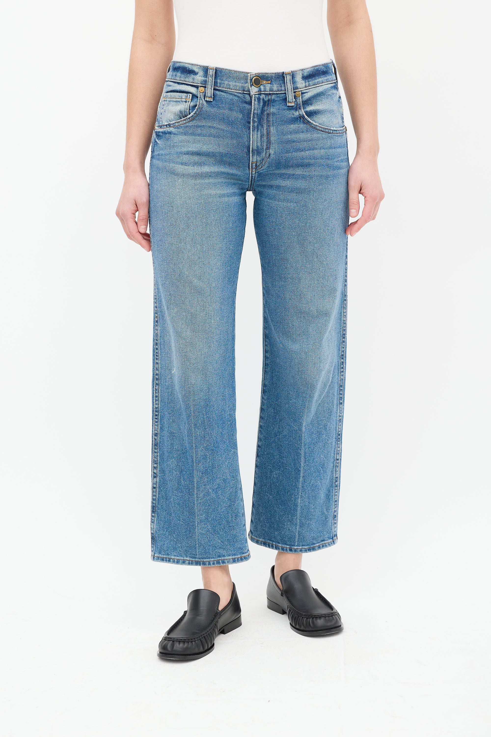 Pre-owned Khaite light wash Wendell jeans featuring belt loops, zip fly, five pocket styling, and straight leg.