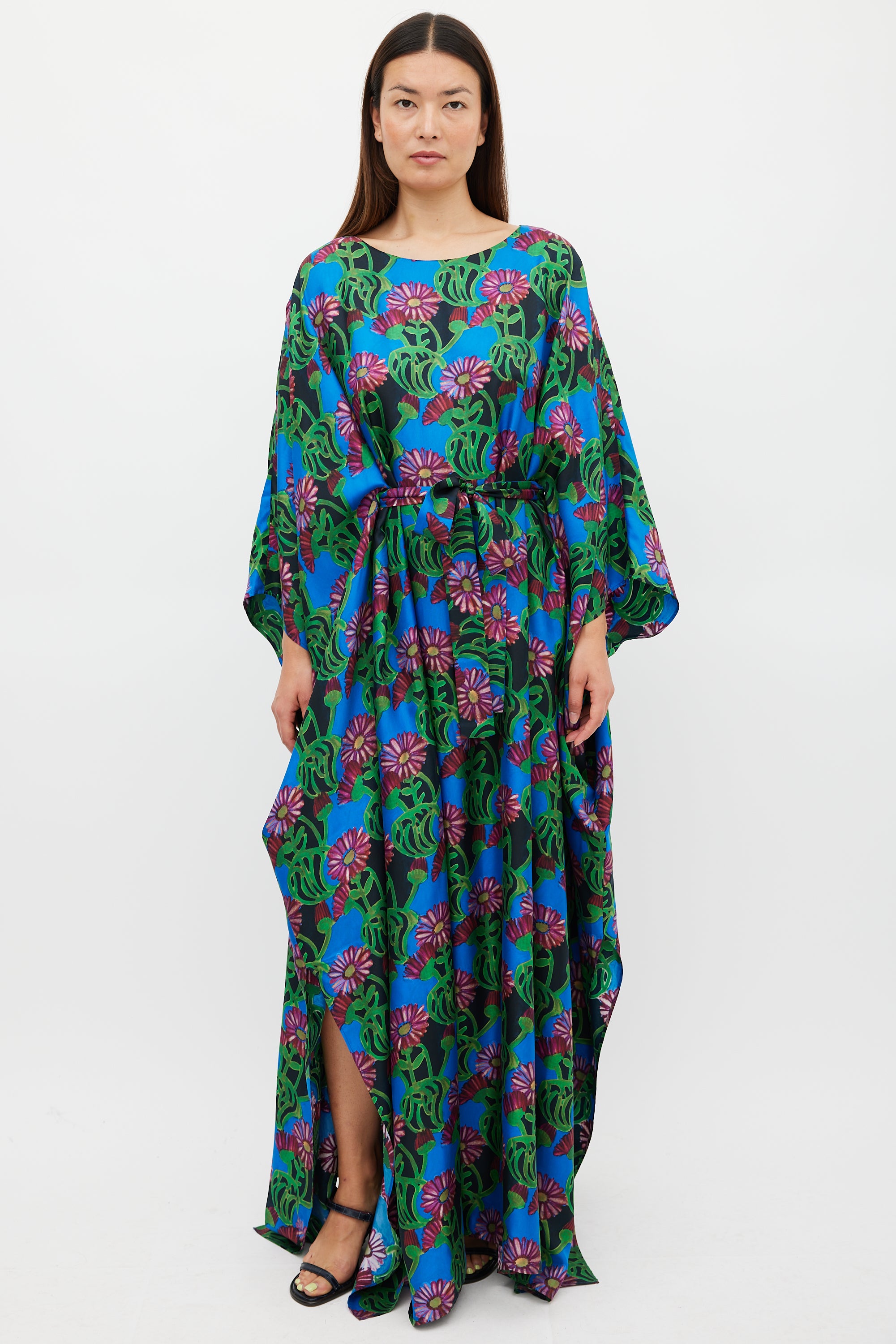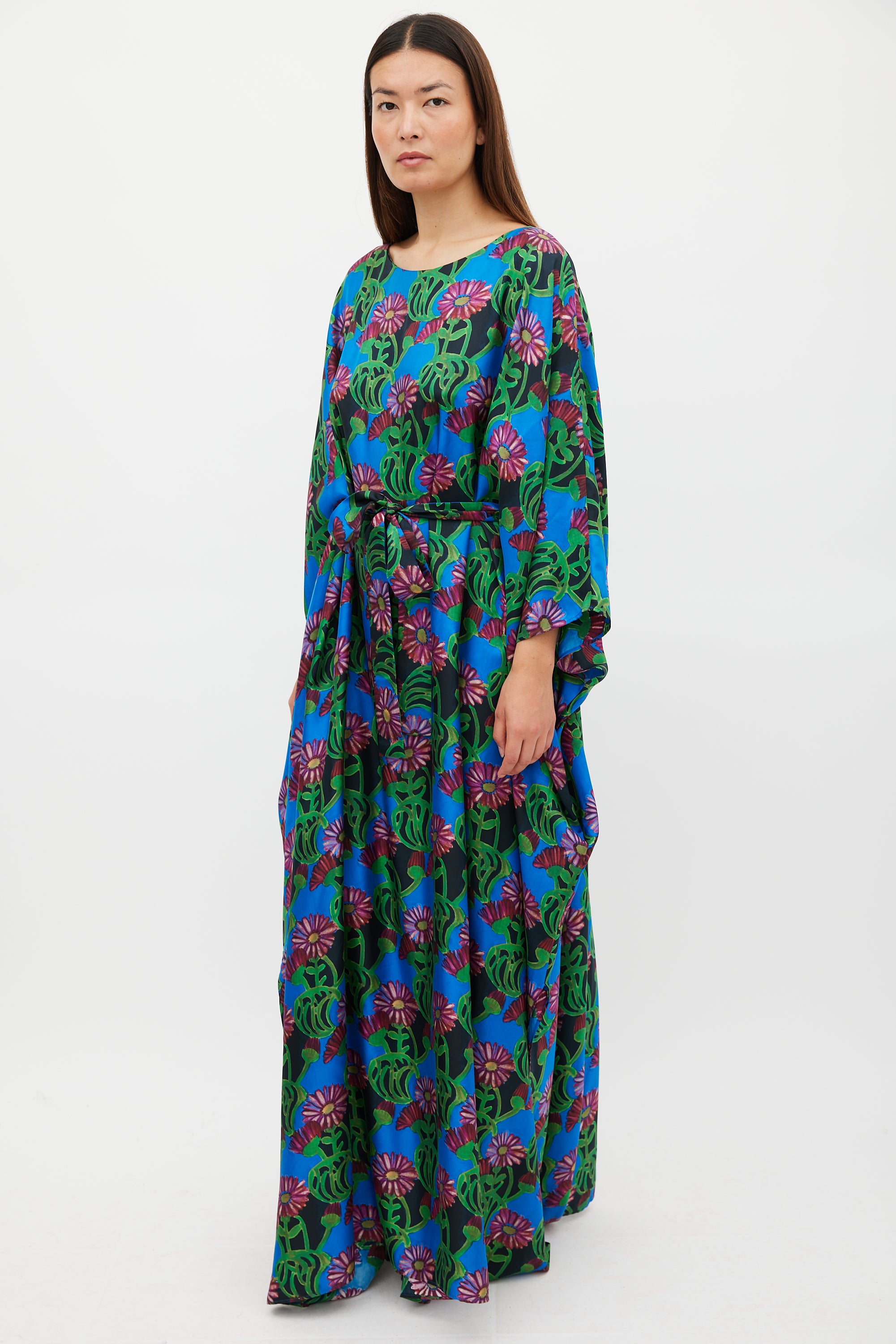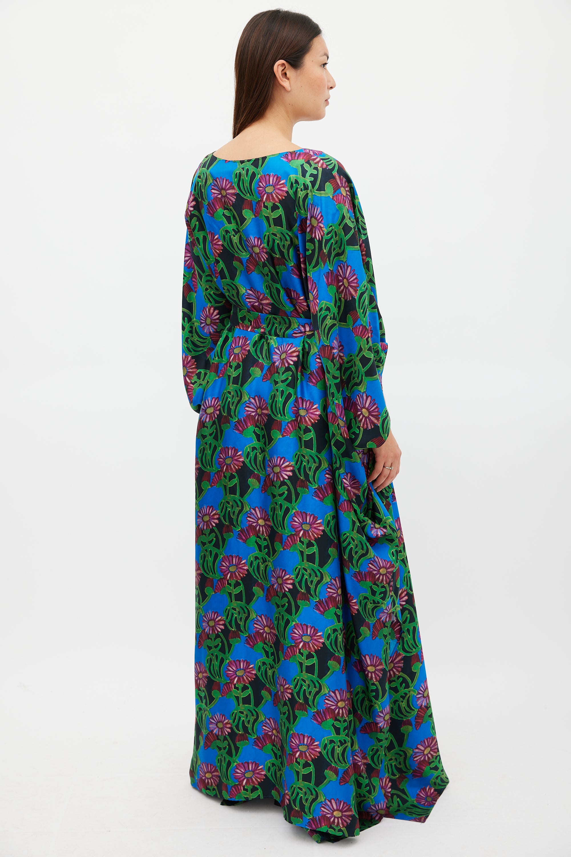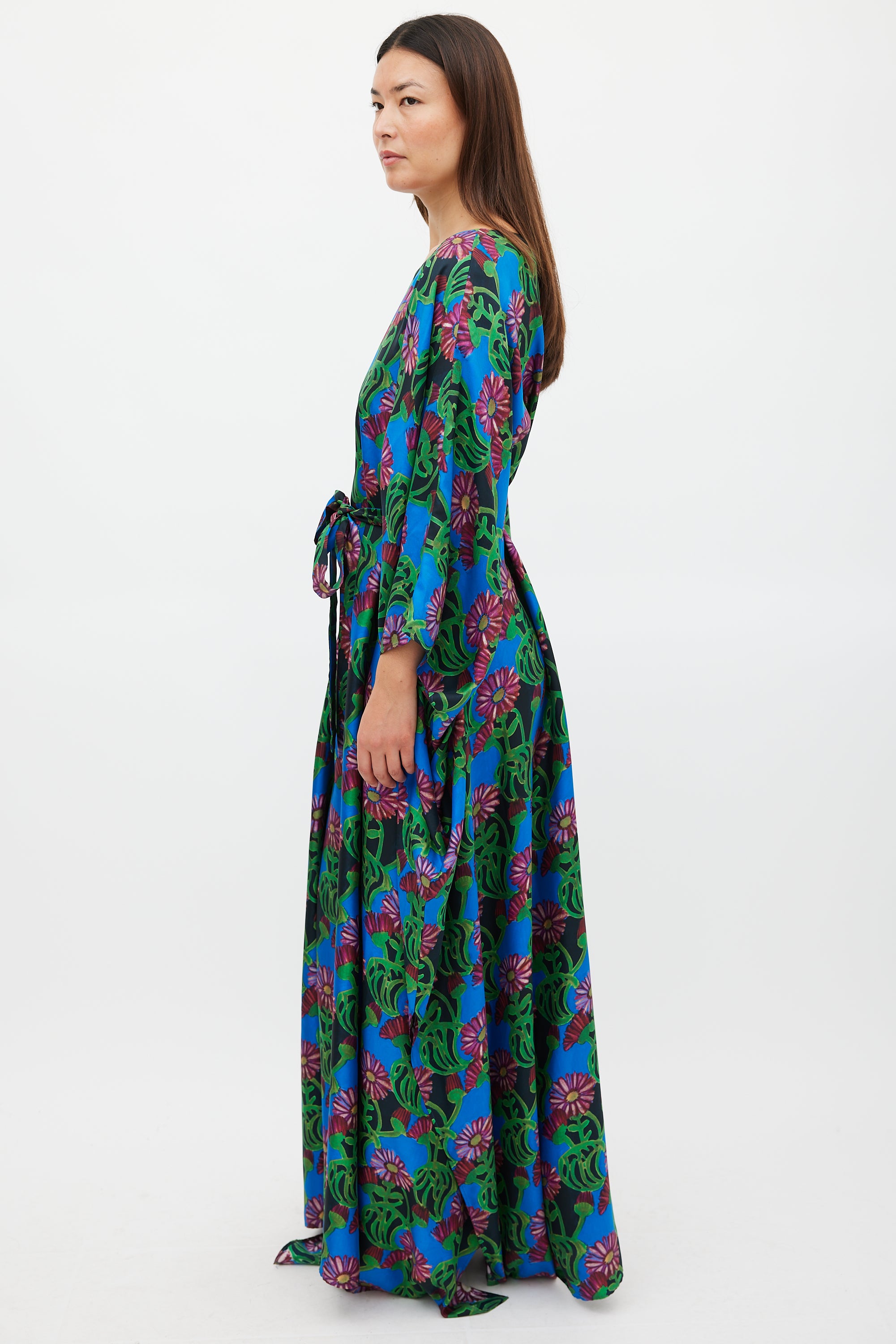 Pre-owned La DoubleJ green and multicolour maxi dress featuring a round neck, floral print throughout, belted waist, and side slits.